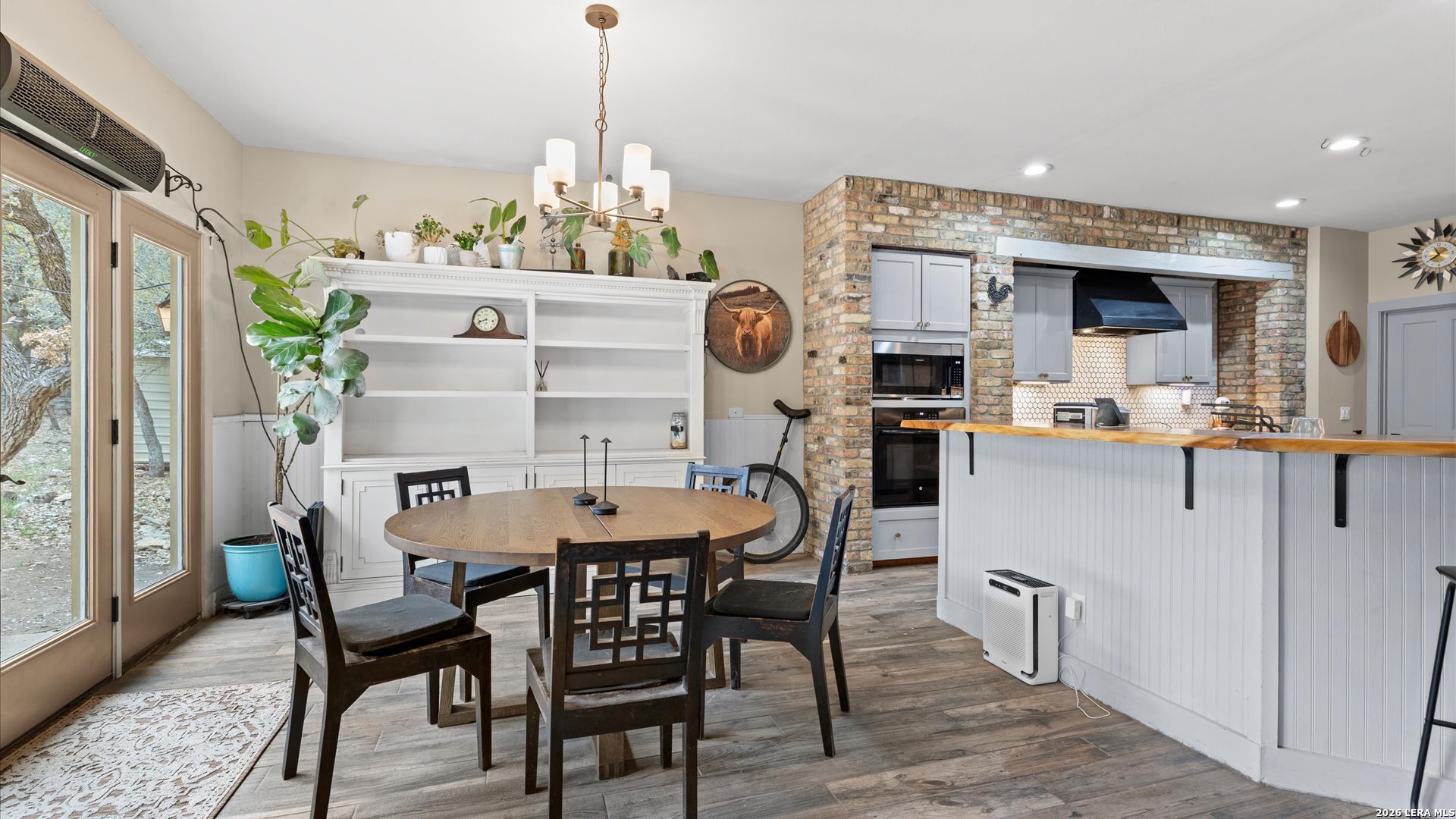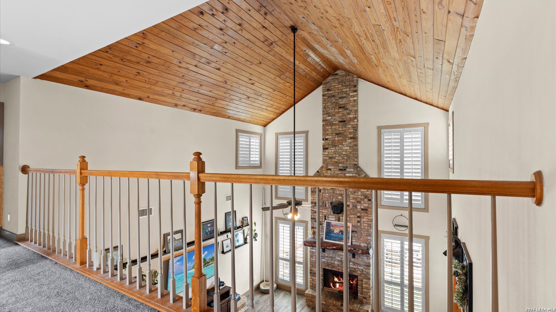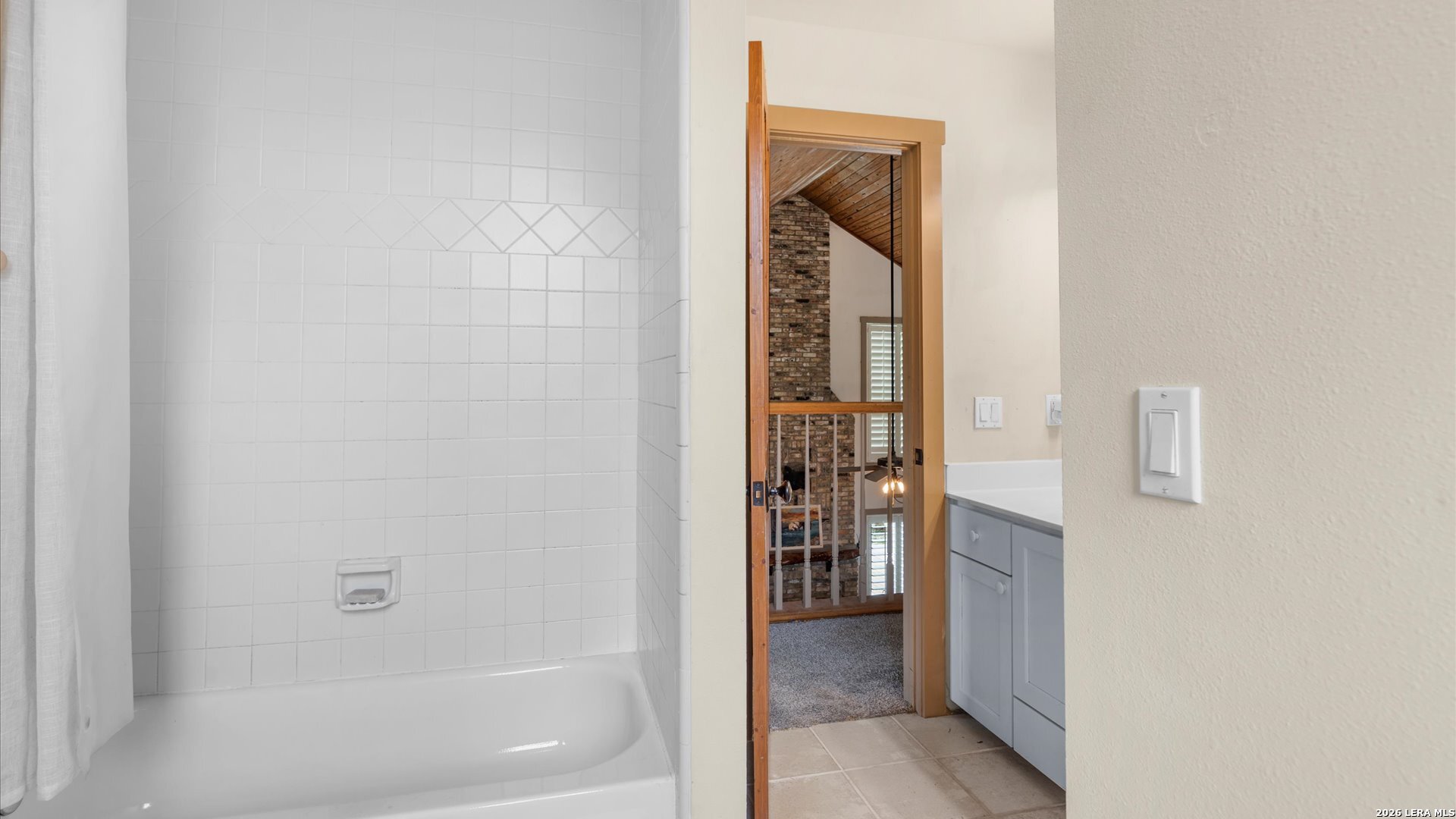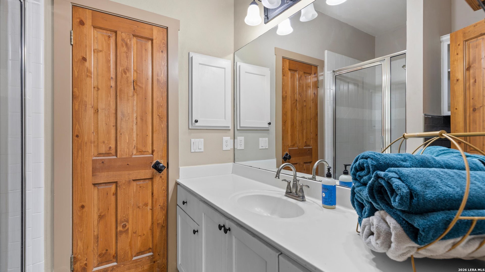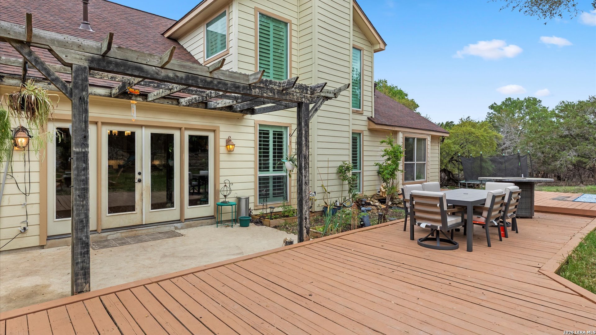 Discover the ultimate Hill Country lifestyle in this stunning four-bedroom, three-bathroom farmhouse nestled on a level, tree-filled lot in the sought-after Cypress Springs on the Guadalupe community. The heart of the home is a breathtaking living area defined by dramatic vaulted ceilings and a towering floor-to-ceiling brick gas fireplace, creating an atmosphere that is both grand and deeply cozy. Culinary enthusiasts will fall in love with the designer kitchen, which showcases soft-toned cabinetry, a unique brick accent wall, gas cooking, a central granite island, and a convenient walk-in pantry. Retreat to the spacious main-level master suite, where you'll find a spa-like bathroom complete with a double vanity, a garden tub, and a separate shower. Modern efficiency meets traditional charm with features like a smart thermostat, central vacuum system, and an oversized attached side-entry two-car garage. The outdoor living space is a true sanctuary for entertaining, featuring an expansive deck with a pergola, a dedicated fire pit area for evening gatherings under the stars, and a fenced backyard perfect for privacy. Residents enjoy exclusive neighborhood access to the Guadalupe River and local parks, all while being zoned for the highly acclaimed Smithson Valley High School. This home offers the perfect balance of rural peace and modern convenience, located just minutes from local shopping and amenities.