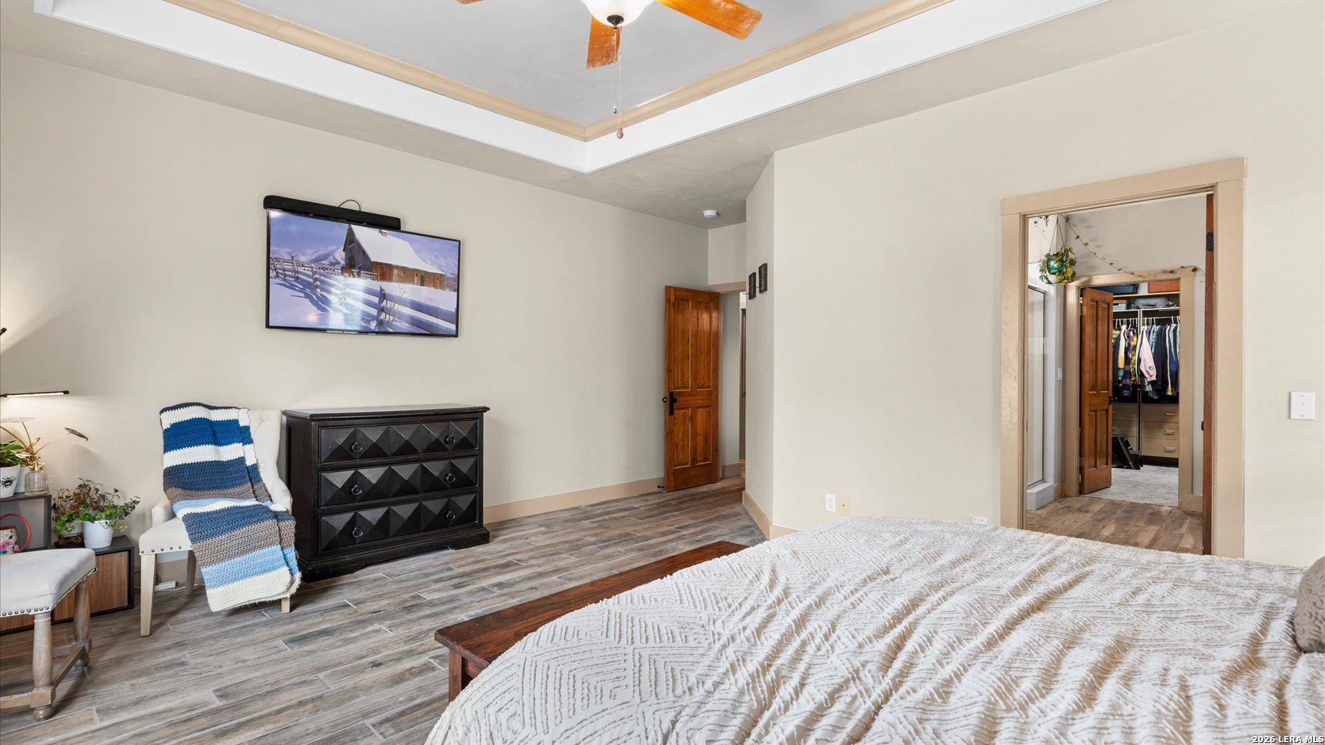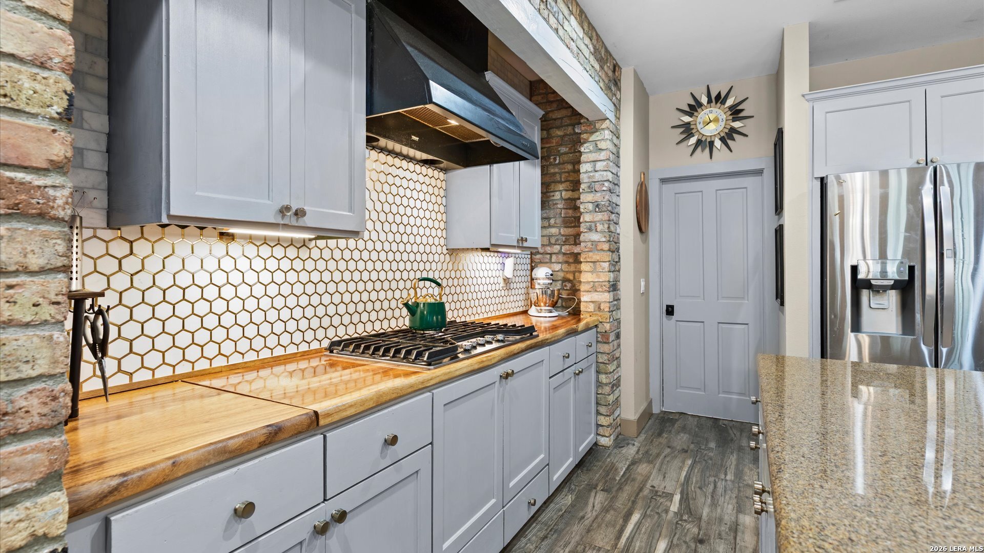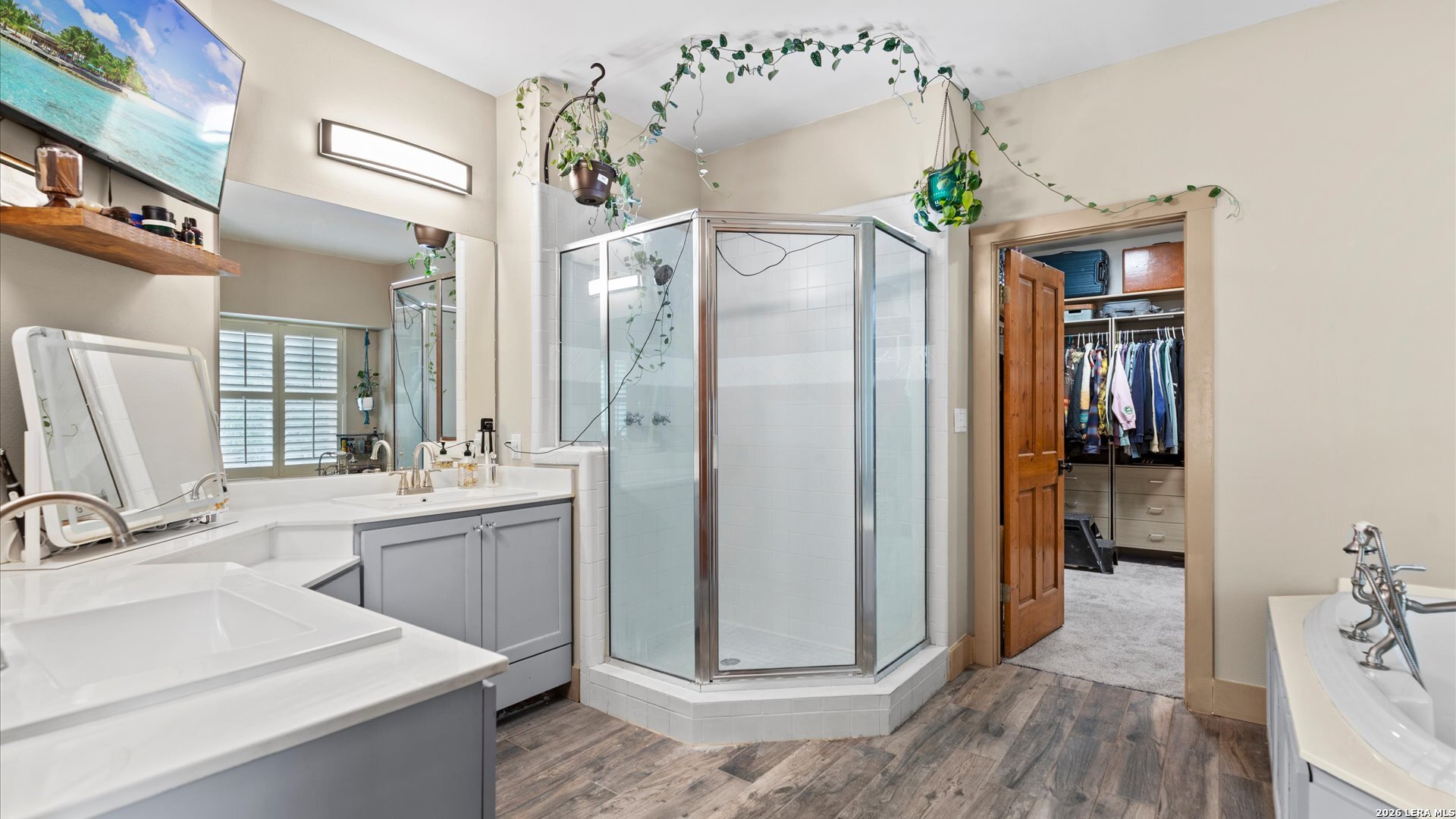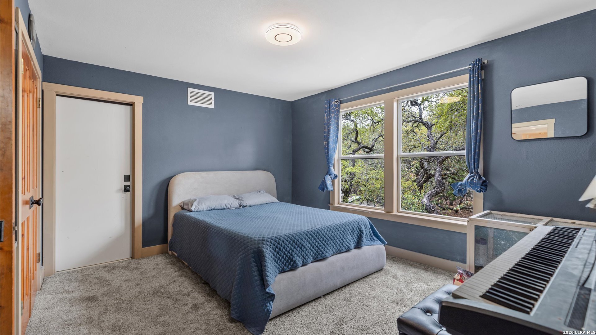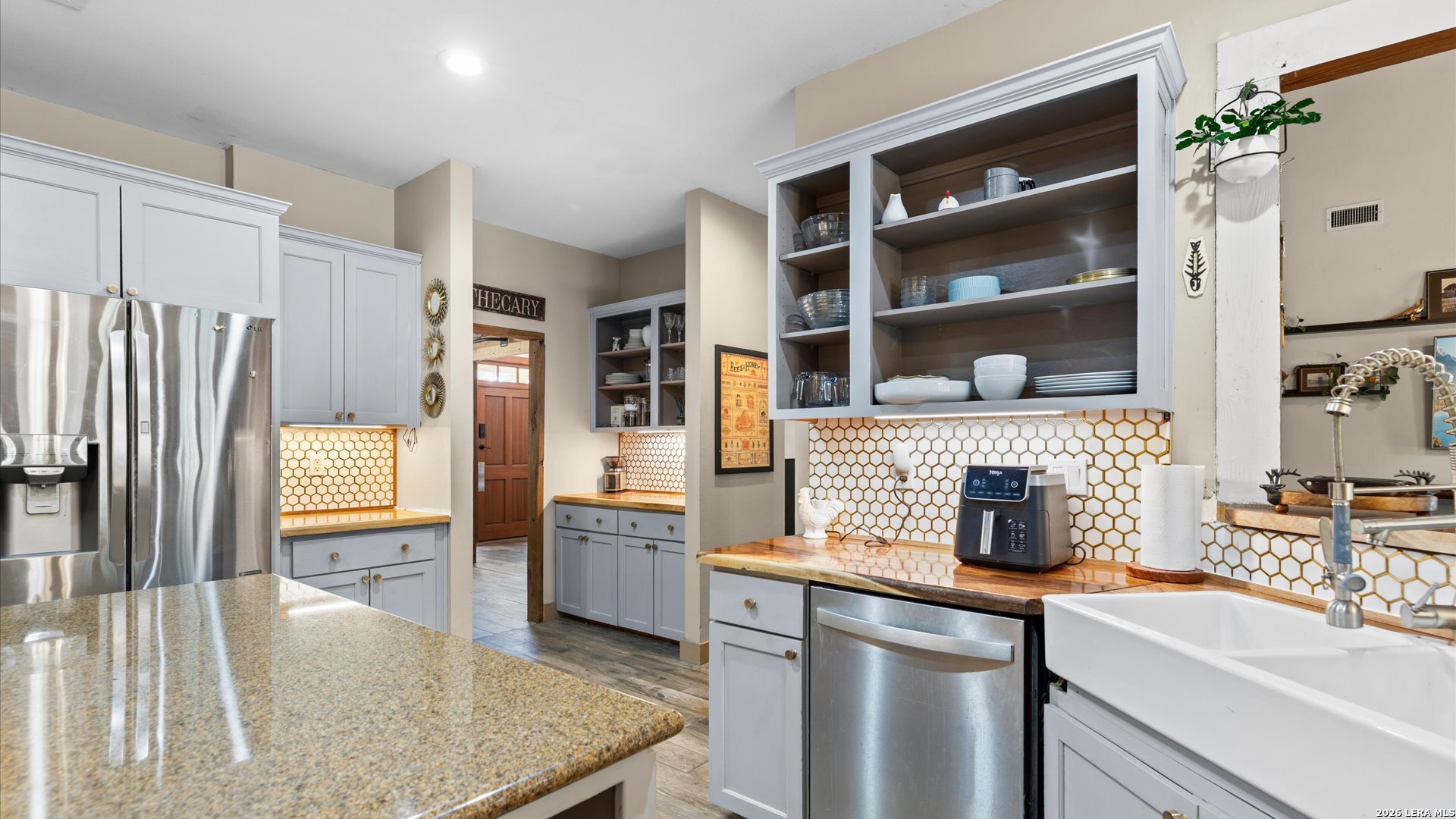 Discover the ultimate Hill Country lifestyle in this stunning four-bedroom, three-bathroom farmhouse nestled on a level, tree-filled lot in the sought-after Cypress Springs on the Guadalupe community. The heart of the home is a breathtaking living area defined by dramatic vaulted ceilings and a towering floor-to-ceiling brick gas fireplace, creating an atmosphere that is both grand and deeply cozy. Culinary enthusiasts will fall in love with the designer kitchen, which showcases soft-toned cabinetry, a unique brick accent wall, gas cooking, a central granite island, and a convenient walk-in pantry. Retreat to the spacious main-level master suite, where you'll find a spa-like bathroom complete with a double vanity, a garden tub, and a separate shower. Modern efficiency meets traditional charm with features like a smart thermostat, central vacuum system, and an oversized attached side-entry two-car garage. The outdoor living space is a true sanctuary for entertaining, featuring an expansive deck with a pergola, a dedicated fire pit area for evening gatherings under the stars, and a fenced backyard perfect for privacy. Residents enjoy exclusive neighborhood access to the Guadalupe River and local parks, all while being zoned for the highly acclaimed Smithson Valley High School. This home offers the perfect balance of rural peace and modern convenience, located just minutes from local shopping and amenities.