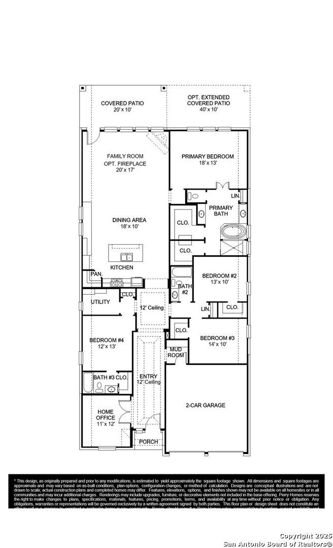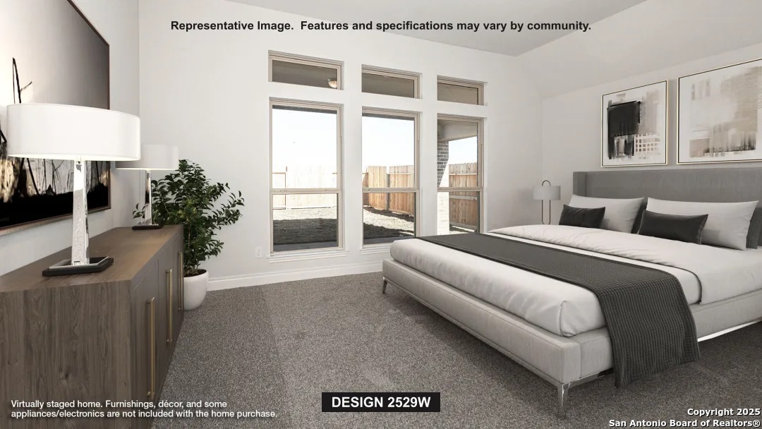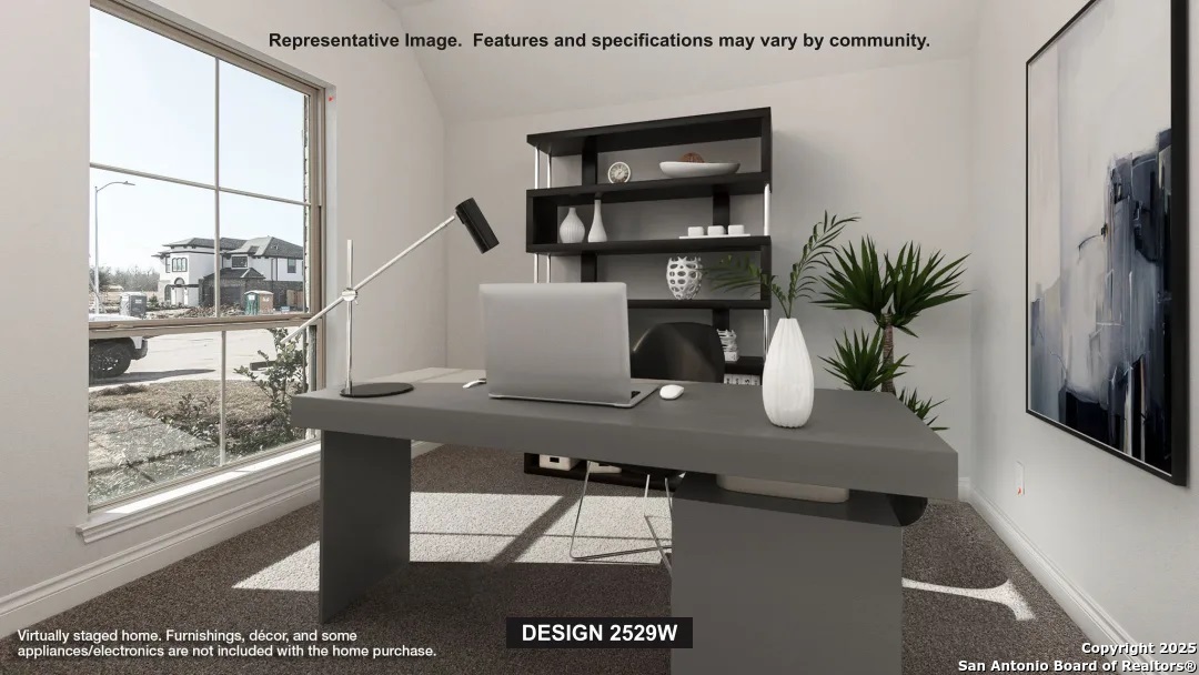 Home office with French doors set at entry with 12-foot coffered ceiling. Open kitchen features generous counter space, 5-burner gas cooktop, corner walk-in pantry and island with built-in seating space. Dining area flows into open family room with wall of windows. Primary suite includes bedroom with wall of windows. Dual vanities, corner garden tub, separate glass-enclosed shower and two walk-in closets in primary bath. A guest suite with private bath adds to this four-bedroom design. Covered backyard patio. Mud room off two-car garage.