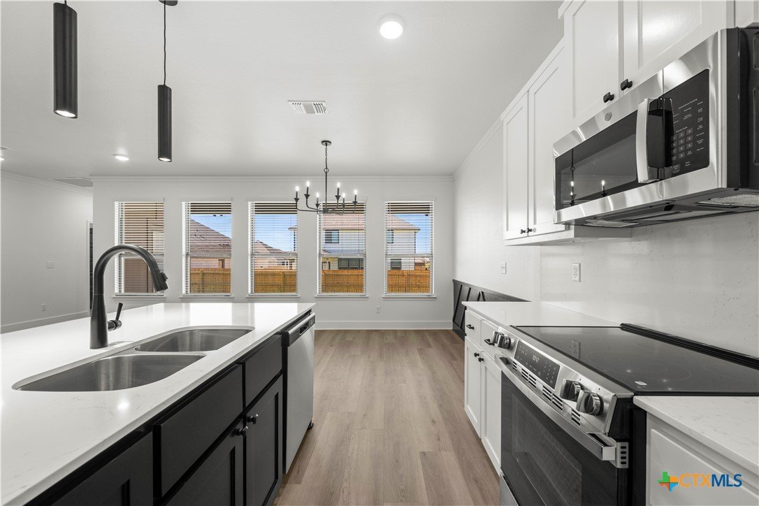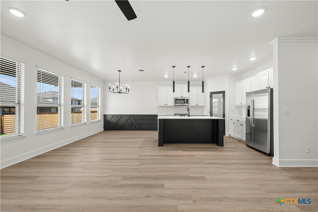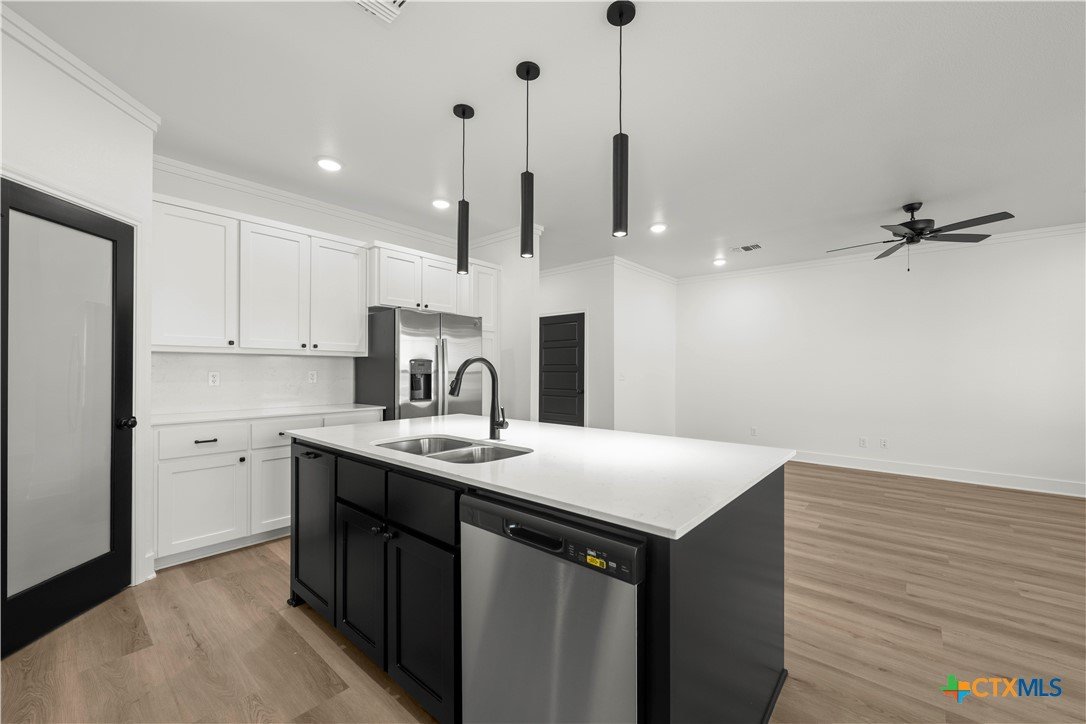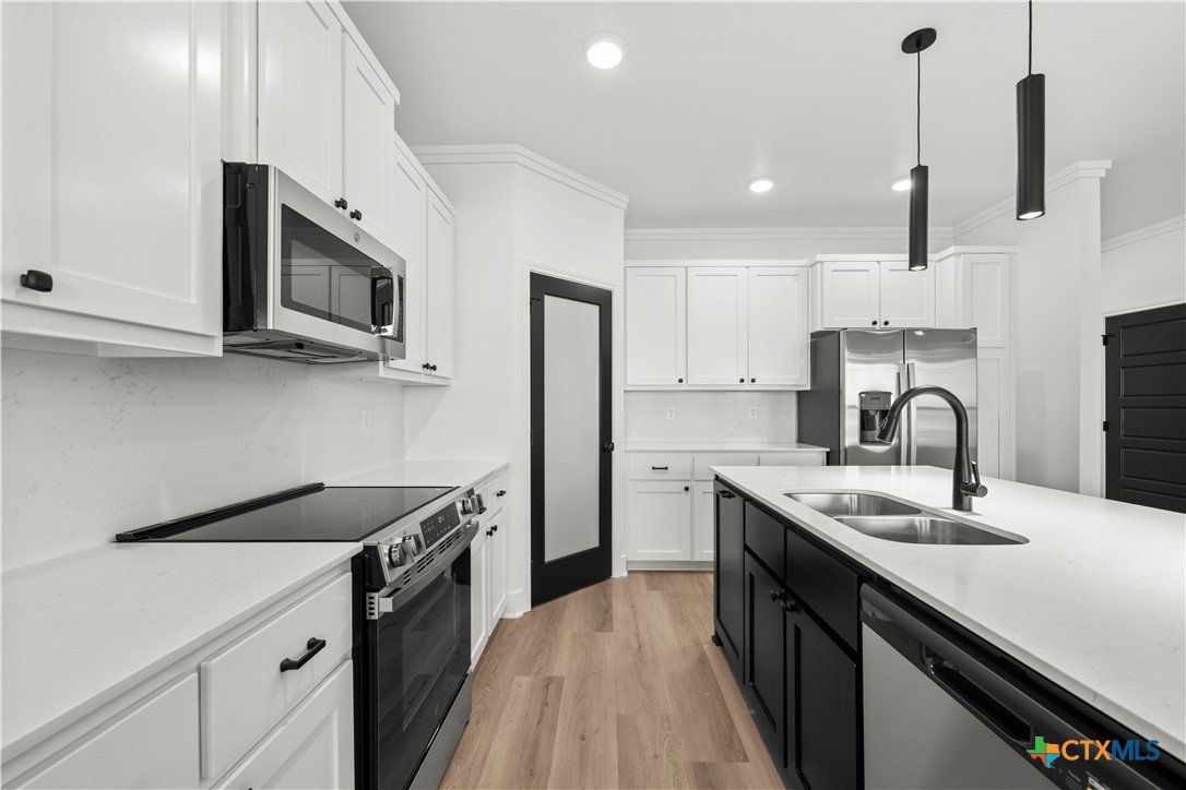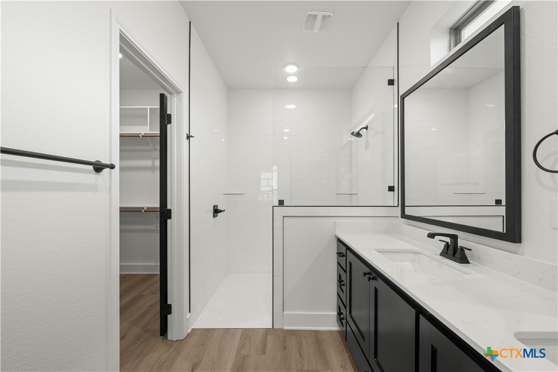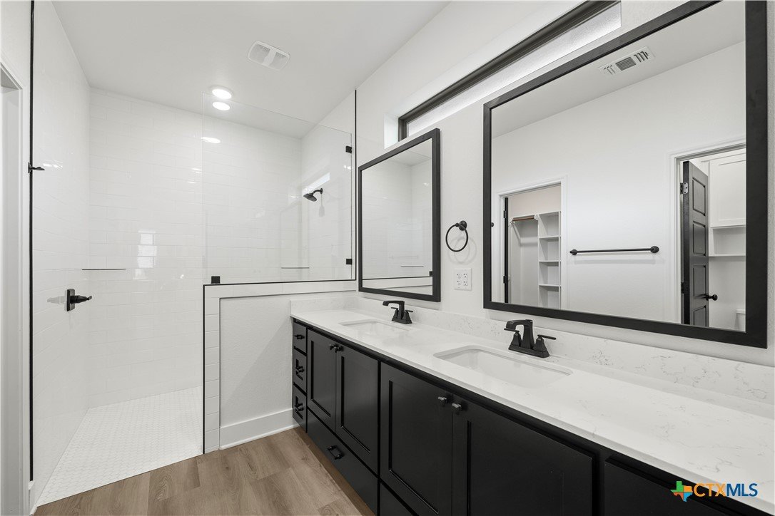 New construction currently under construction featuring a brick and Hardie exterior, 9" ceilings, and upscale finishes throughout. Open-concept design highlights quartz countertops, stainless steel appliances, custom cabinetry, vinyl wood plank flooring, and a statement kitchen island. Private primary suite offers a walk-in closet with upgraded shelving and tiled walk-in shower and custom glass enclosure. Covered patio and energy-efficient features complete this beautifully built home.