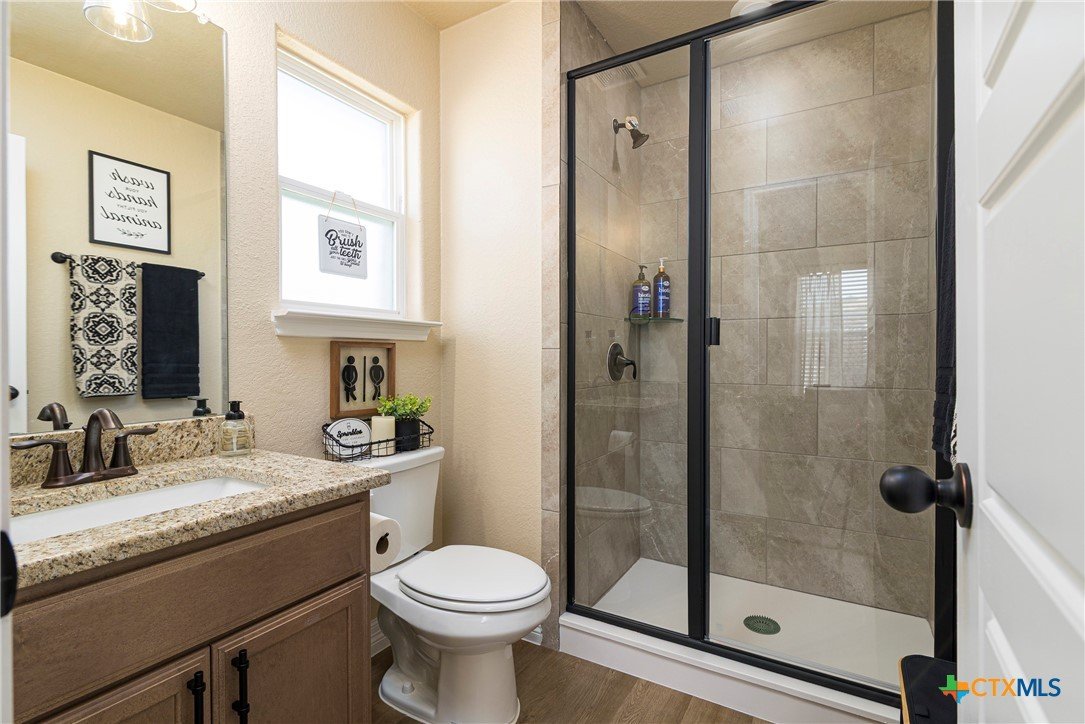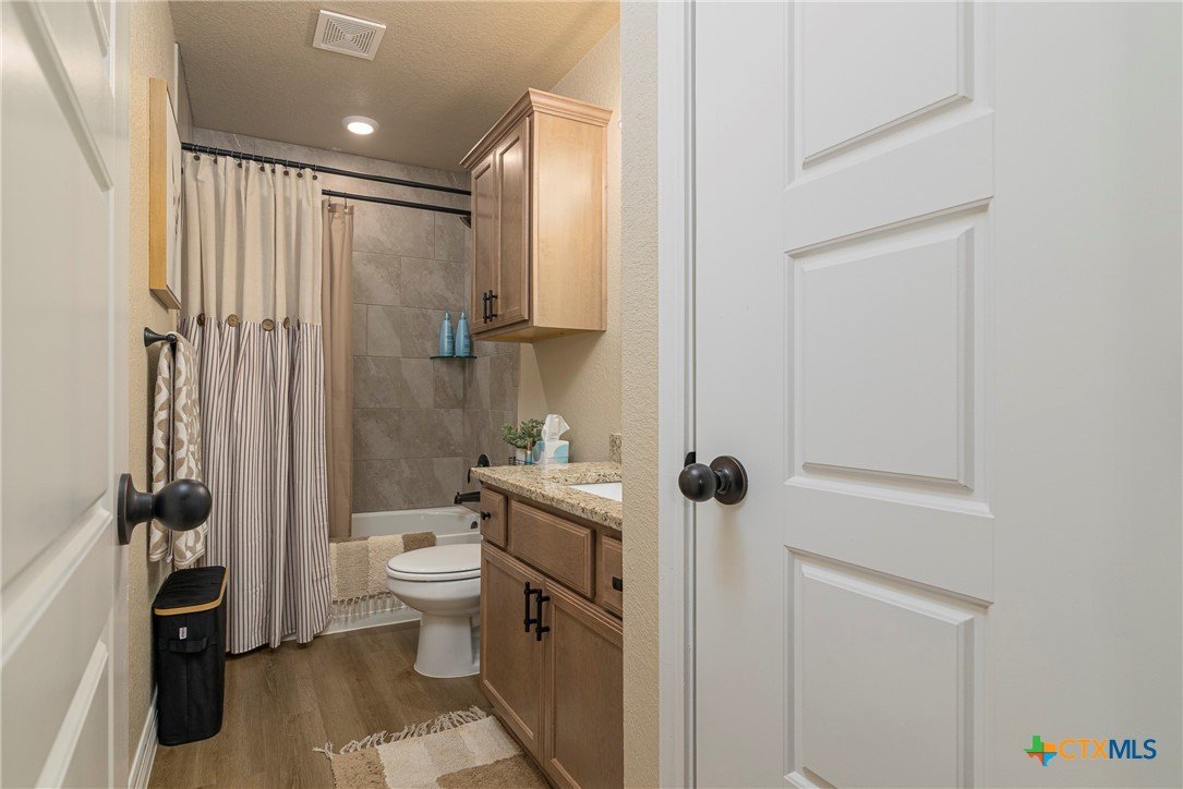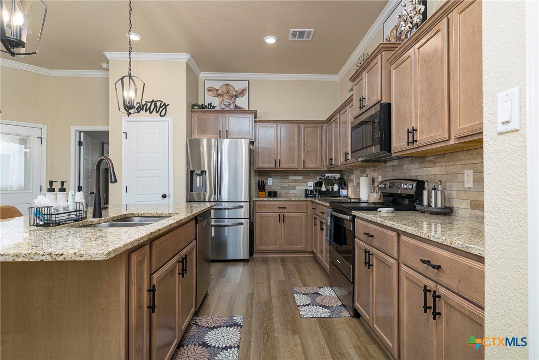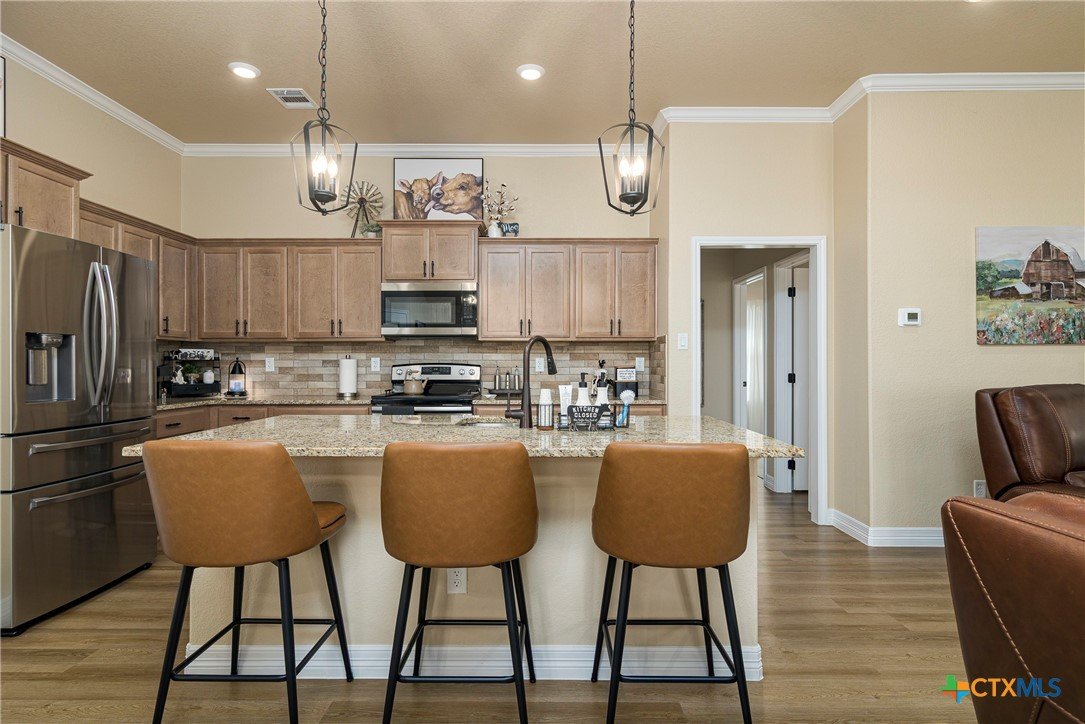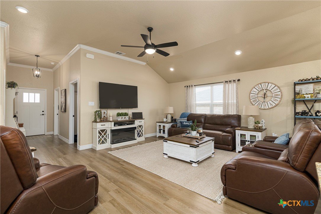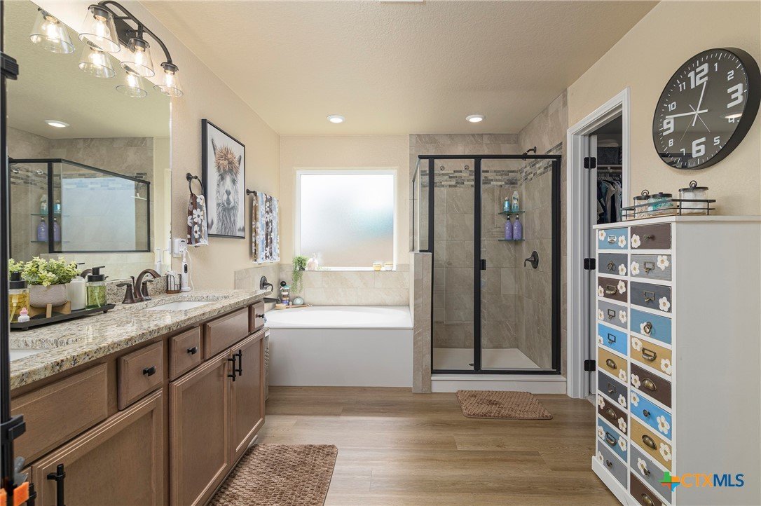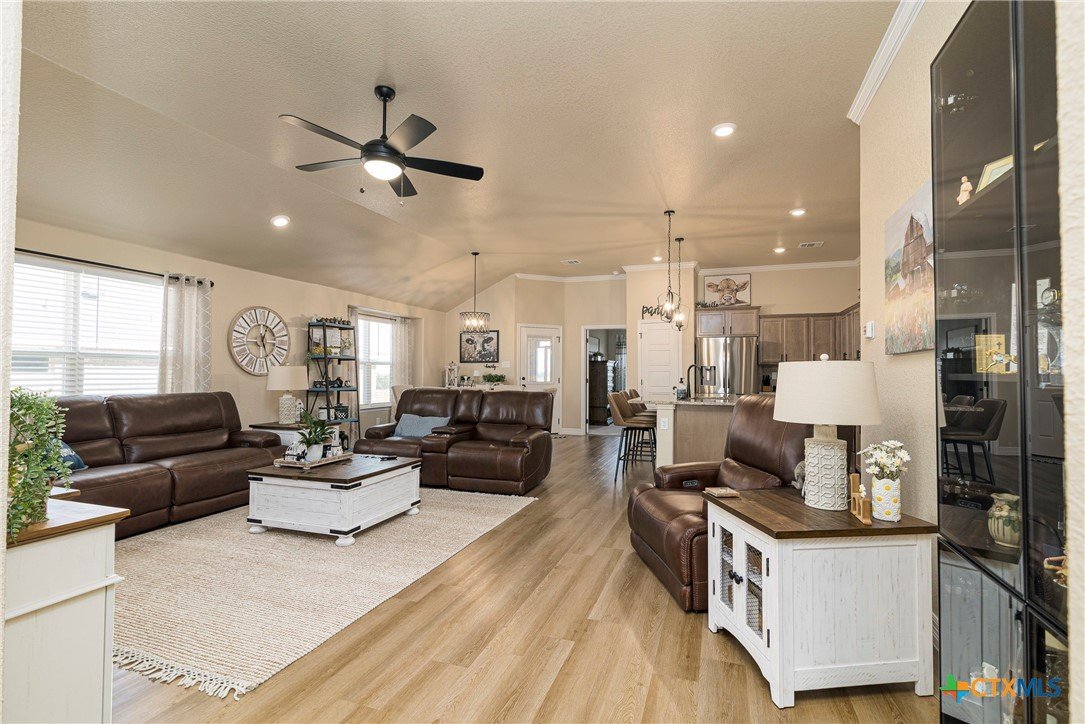 This beautiful 4-bedrooom, 3-bathroom home offers an inviting open floor plan with stylish vinyl plank flooring in the common areas. The spacious kitchen is designed for both function and elegance featuring crown molding, a large island, granite countertops, and sleek recessed lighting throughout. The primary suite is a true retreat with a separate walk-in shower, garden tub, double vanity, and a generous walk-in closet. Ceiling fans in every room provide year-round comfort. Step outside to the screened-in back porch and enjoy the peaceful beauty of the greenbelt behind the home, offering added privacy and scenic hilltop views. Don't miss this incredible opportunity to make this your home! Schedule your showing today!