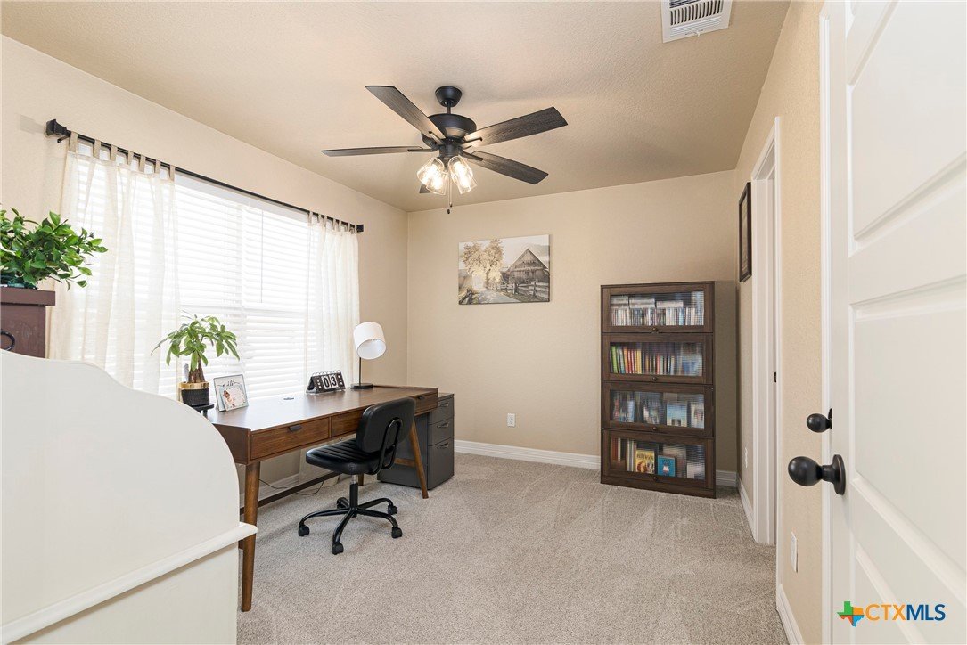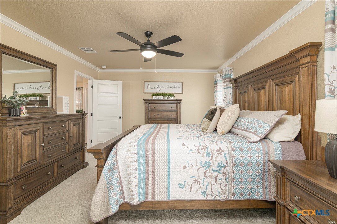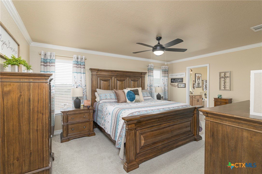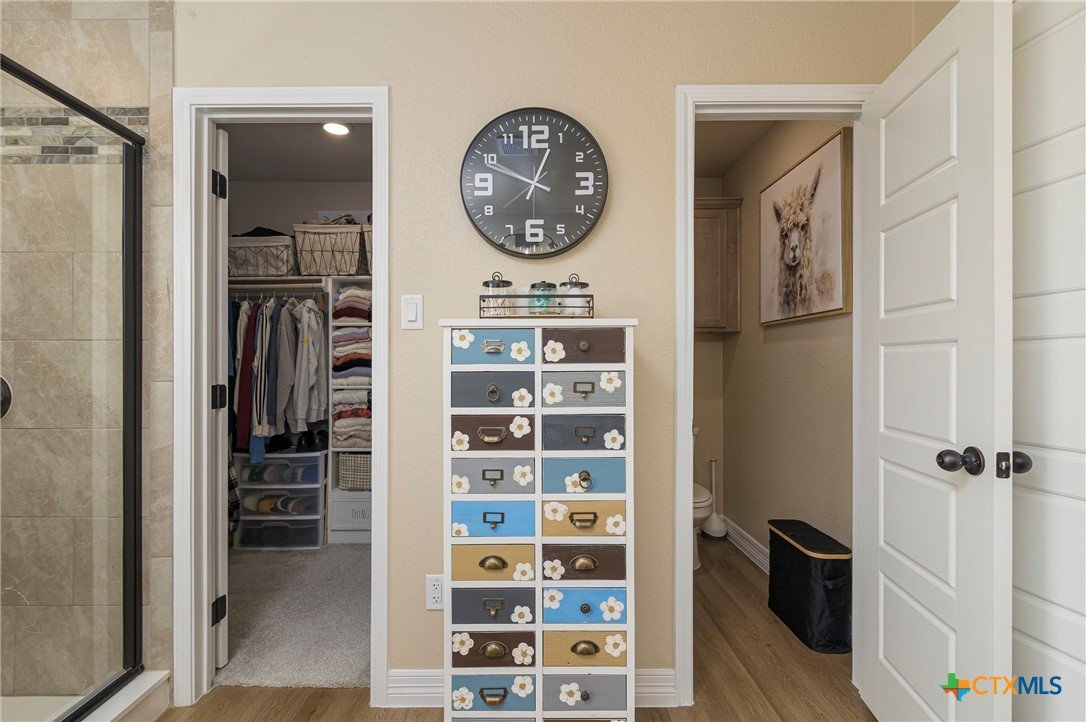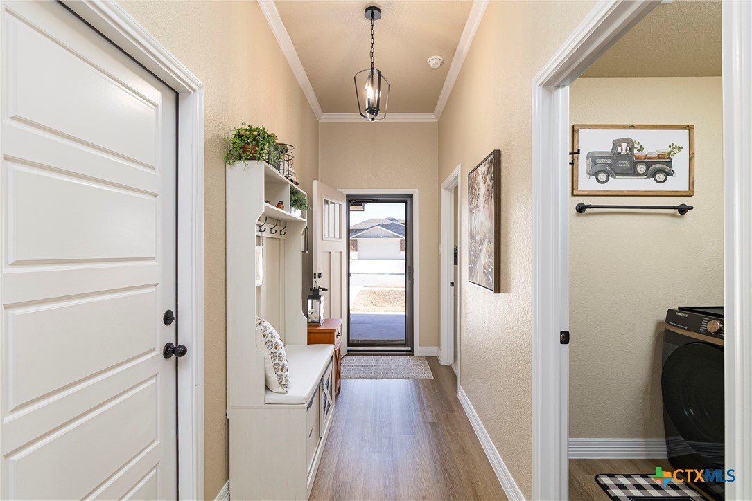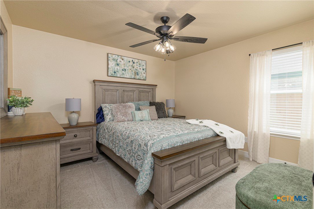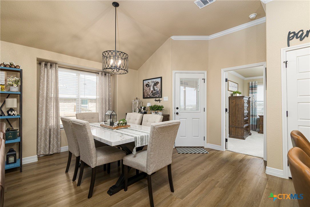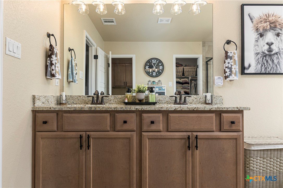 This beautiful 4-bedrooom, 3-bathroom home offers an inviting open floor plan with stylish vinyl plank flooring in the common areas. The spacious kitchen is designed for both function and elegance featuring crown molding, a large island, granite countertops, and sleek recessed lighting throughout. The primary suite is a true retreat with a separate walk-in shower, garden tub, double vanity, and a generous walk-in closet. Ceiling fans in every room provide year-round comfort. Step outside to the screened-in back porch and enjoy the peaceful beauty of the greenbelt behind the home, offering added privacy and scenic hilltop views. Don't miss this incredible opportunity to make this your home! Schedule your showing today!