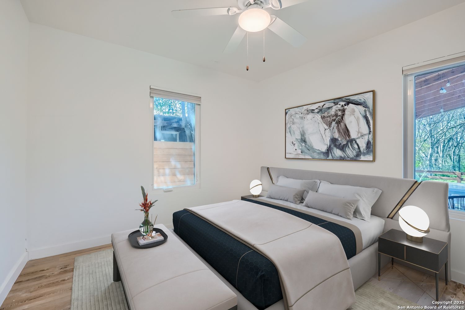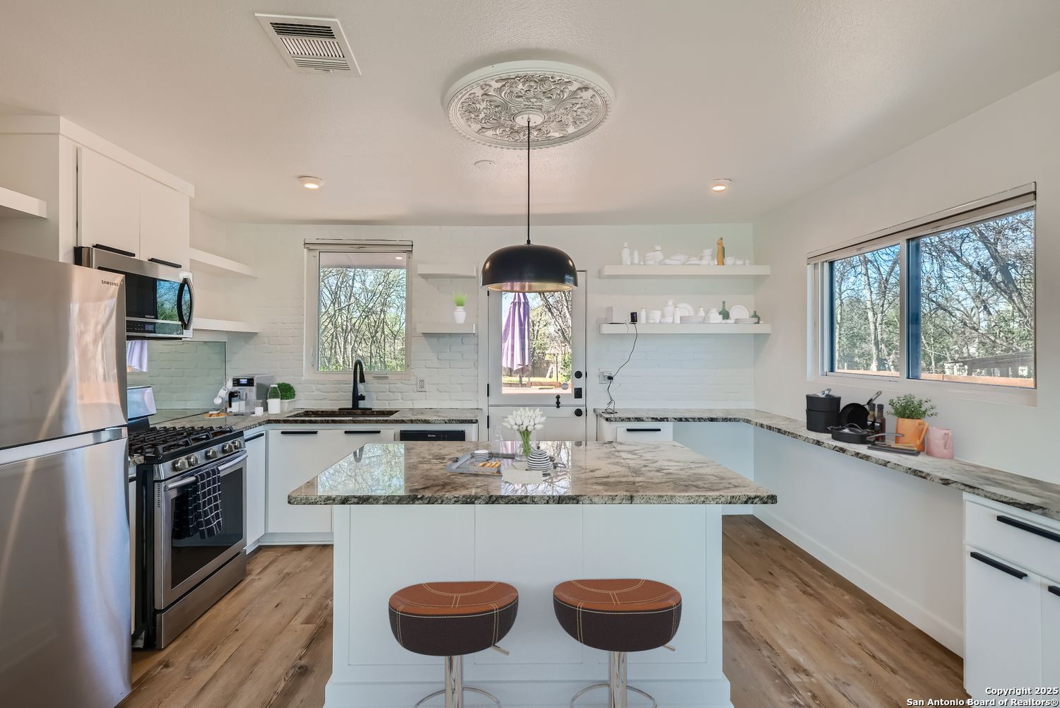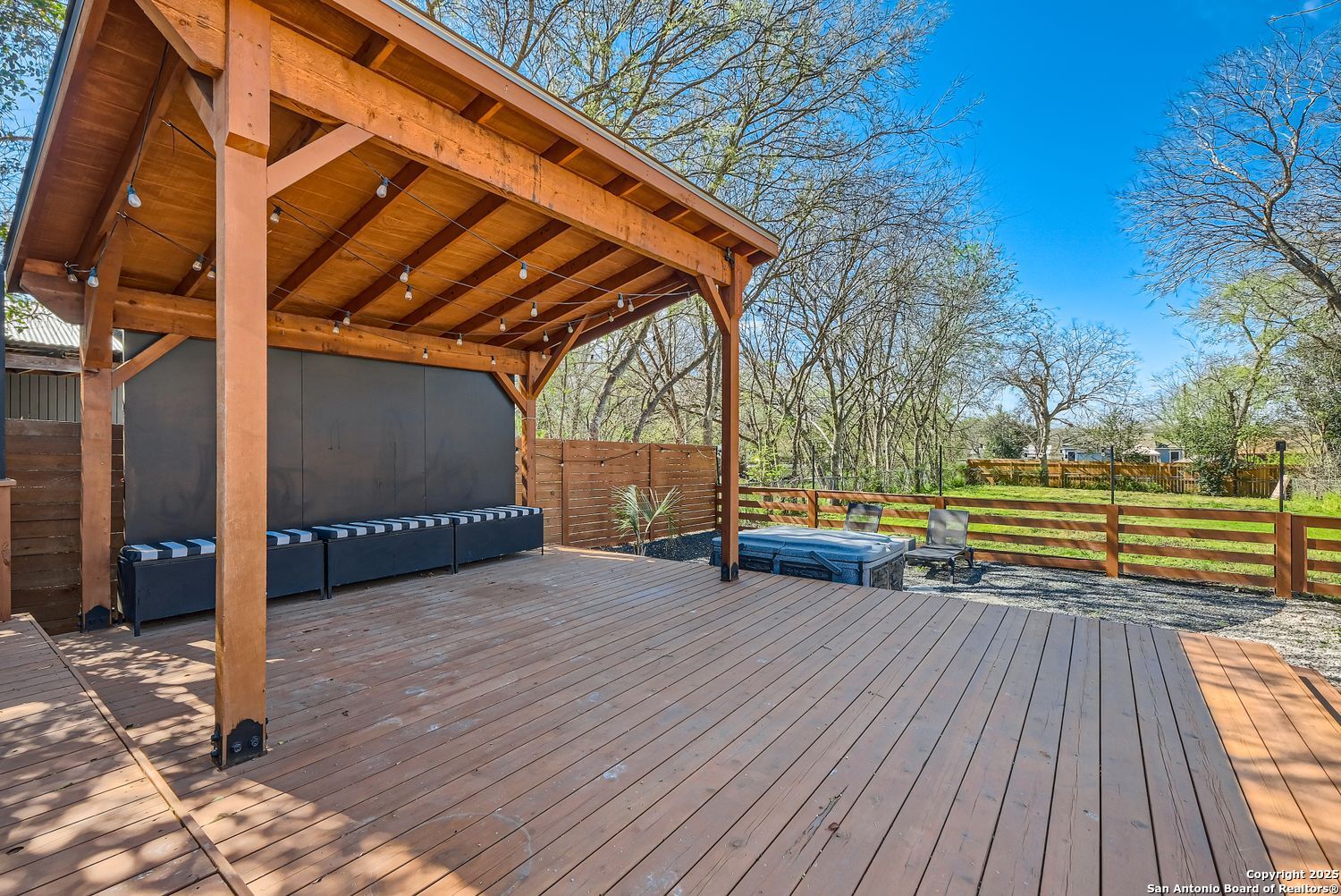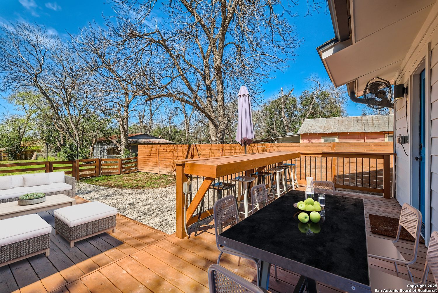 Beautifully updated from top to bottom, this modern-farmhouse cottage offers style, comfort, and thoughtful upgrades in a prime New Braunfels location. The exterior features all-new Hardie siding, energy-efficient Andersen windows, and a cheerful blue door that sets the tone for the inviting interior. Inside, you'll find a bright open layout with brand-new subflooring and durable wood-look flooring throughout. The kitchen boasts granite countertops, stainless-steel appliances, open shelving, and a custom Dutch door leading to the backyard. Enjoy outdoor living at its best on the expansive deck with a covered pergola, bar seating, and room to gather under the trees. The reinforced concrete silo foundation has been leveled for peace of mind, and the fully fenced yard offers privacy and space to relax. Conveniently located near downtown New Braunfels, Landa Park, and the Comal River-this home blends modern design with Hill Country charm.
