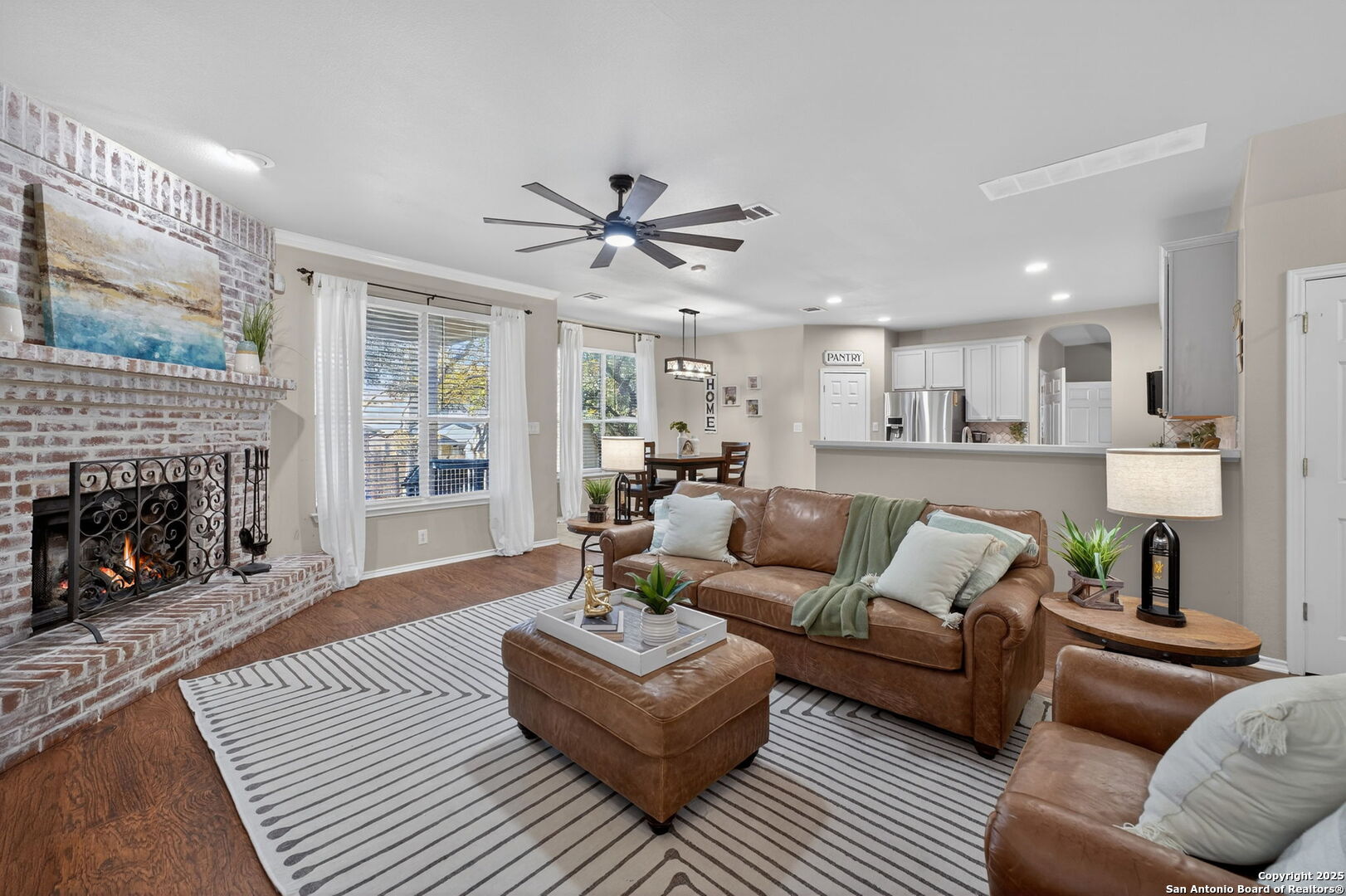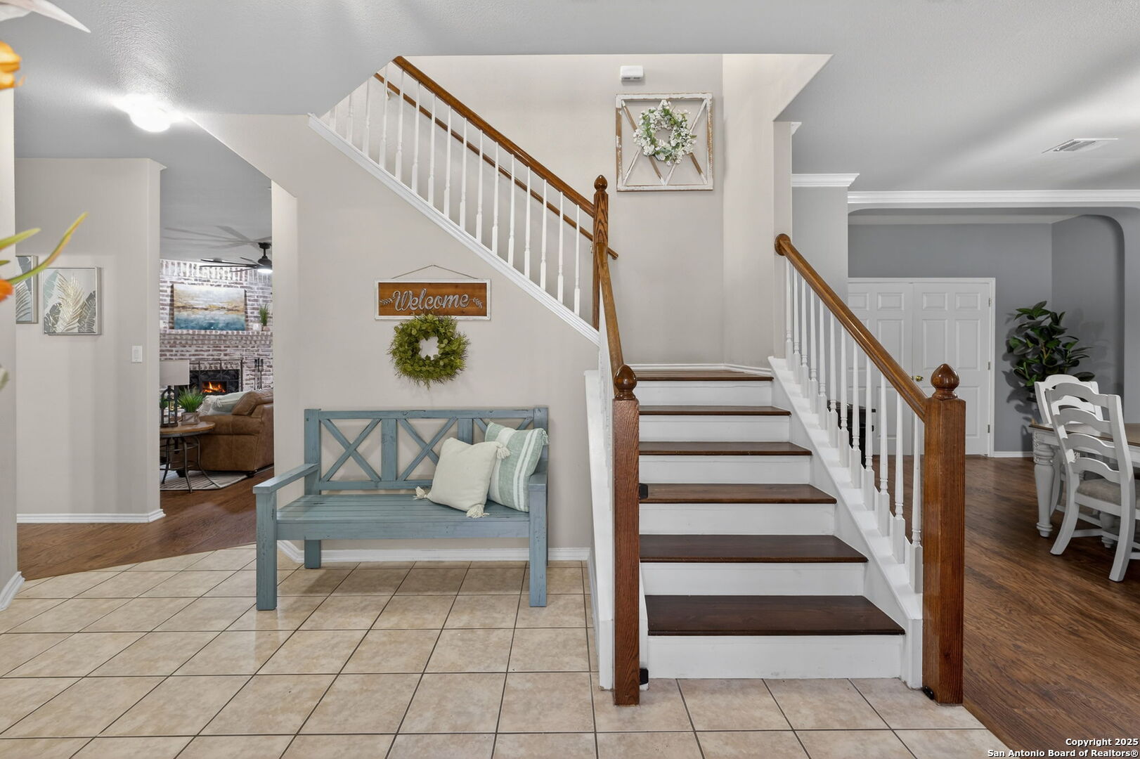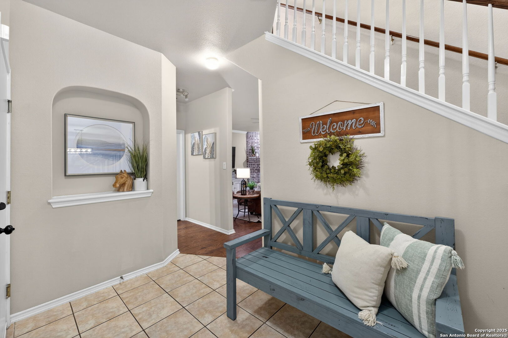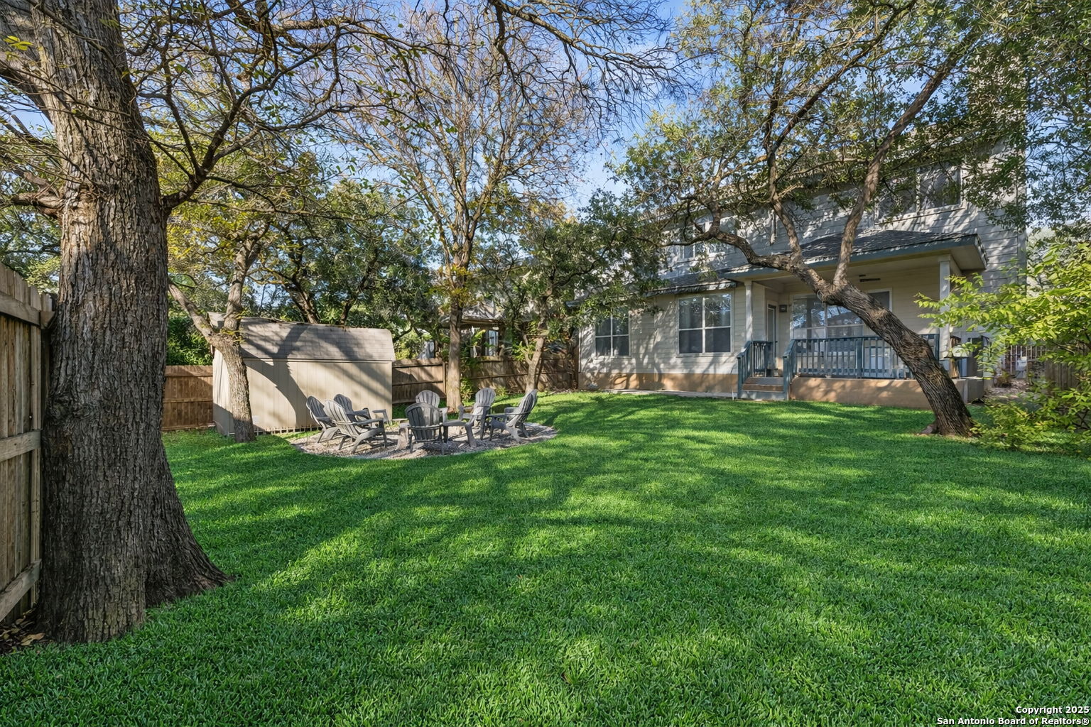Welcome to Steubing Ranch, where comfort, style, and convenience come together in this beautifully updated 3-bedroom, 2.5-bathroom home! From the moment you arrive, you'll appreciate that this property is truly move-in ready, complete with all appliances included-refrigerator, washer, dryer, dishwasher, microwave, and stove. Inside, the home showcases numerous upgrades, including fresh interior paint, updated lighting, a modern kitchen backsplash, painted cabinets in both the kitchen and bathrooms, and no carpet throughout! Durable laminate and tile flooring enhance both style and functionality. The inviting living room features a cozy German smear fireplace and flows seamlessly into the open breakfast nook and living area, creating an ideal space for everyday living and entertaining. A formal dining space offers the perfect setting for large family meals and gatherings. Upstairs, all bedrooms are thoughtfully positioned, including the spacious primary suite. The primary bathroom offers a spa-like retreat with dual vanities, a large garden tub, and a walk-in shower. A dedicated office space provides the perfect environment for remote work, studying, or a quiet retreat, while the large game room offers a versatile second living area. Step outside to an expansive backyard designed for relaxation and entertainment. Enjoy the covered patio, ideal for outdoor dining and lounging, along with a large storage shed and an inviting fire pit-perfect for gatherings year-round. The home's location is equally impressive. Just blocks from the neighborhood park and pool, and with easy access to Highway 1604, Highway 281, and I-35, commuting is effortless. Shopping, dining, and entertainment options are all conveniently nearby. This home truly offers it all-space, upgrades, outdoor living, and a prime location. Schedule your showing today and experience everything this exceptional Steubing Ranch home has to offer.