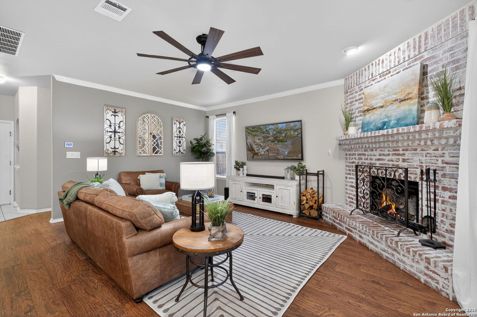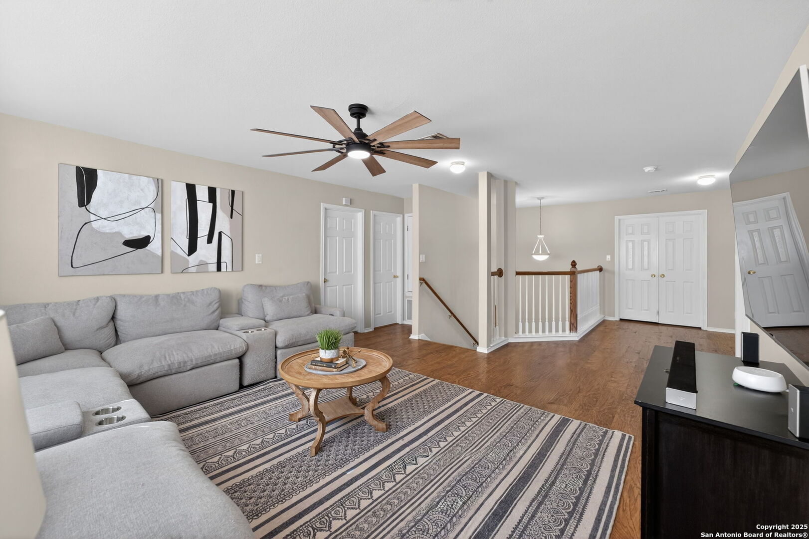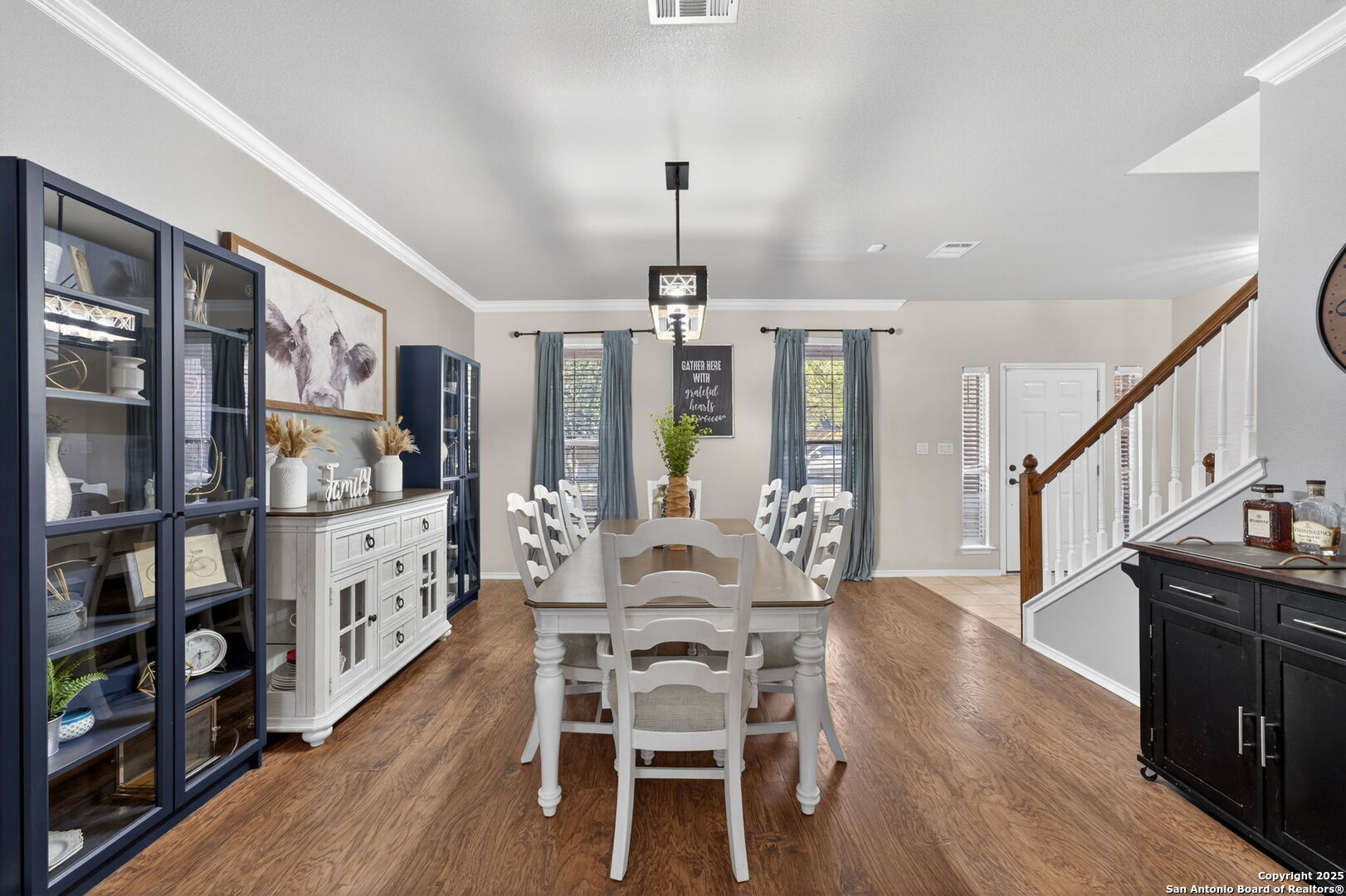 Welcome to Steubing Ranch, where comfort, style, and convenience come together in this beautifully updated 3-bedroom, 2.5-bathroom home! From the moment you arrive, you'll appreciate that this property is truly move-in ready, complete with all appliances included-refrigerator, washer, dryer, dishwasher, microwave, and stove. Inside, the home showcases numerous upgrades, including fresh interior paint, updated lighting, a modern kitchen backsplash, painted cabinets in both the kitchen and bathrooms, and no carpet throughout! Durable laminate and tile flooring enhance both style and functionality. The inviting living room features a cozy German smear fireplace and flows seamlessly into the open breakfast nook and living area, creating an ideal space for everyday living and entertaining. A formal dining space offers the perfect setting for large family meals and gatherings. Upstairs, all bedrooms are thoughtfully positioned, including the spacious primary suite. The primary bathroom offers a spa-like retreat with dual vanities, a large garden tub, and a walk-in shower. A dedicated office space provides the perfect environment for remote work, studying, or a quiet retreat, while the large game room offers a versatile second living area. Step outside to an expansive backyard designed for relaxation and entertainment. Enjoy the covered patio, ideal for outdoor dining and lounging, along with a large storage shed and an inviting fire pit-perfect for gatherings year-round. The home's location is equally impressive. Just blocks from the neighborhood park and pool, and with easy access to Highway 1604, Highway 281, and I-35, commuting is effortless. Shopping, dining, and entertainment options are all conveniently nearby. This home truly offers it all-space, upgrades, outdoor living, and a prime location. Schedule your showing today and experience everything this exceptional Steubing Ranch home has to offer.