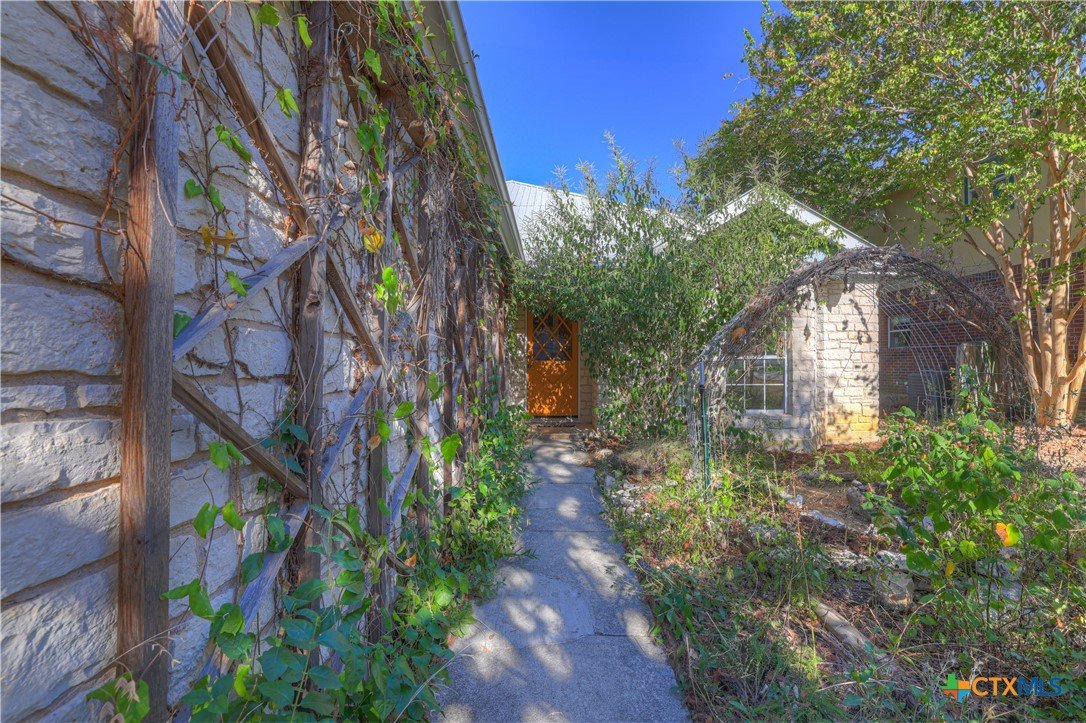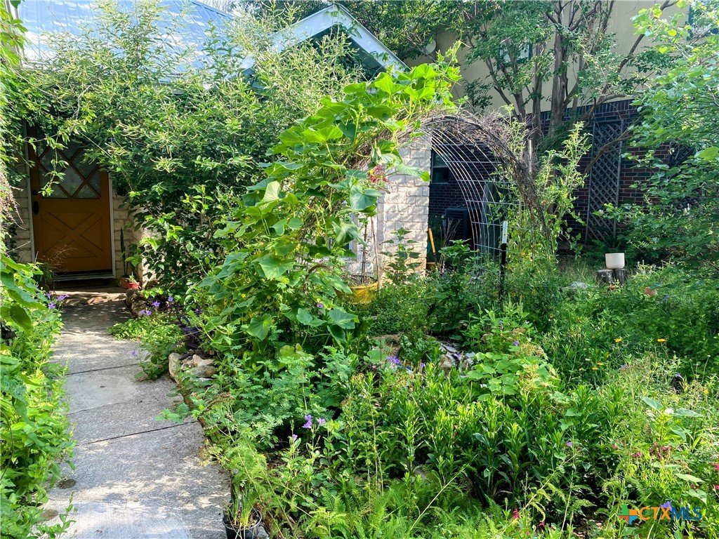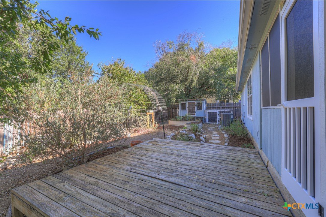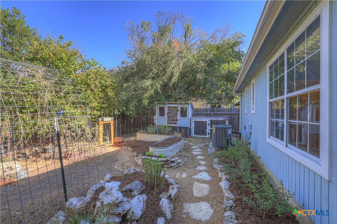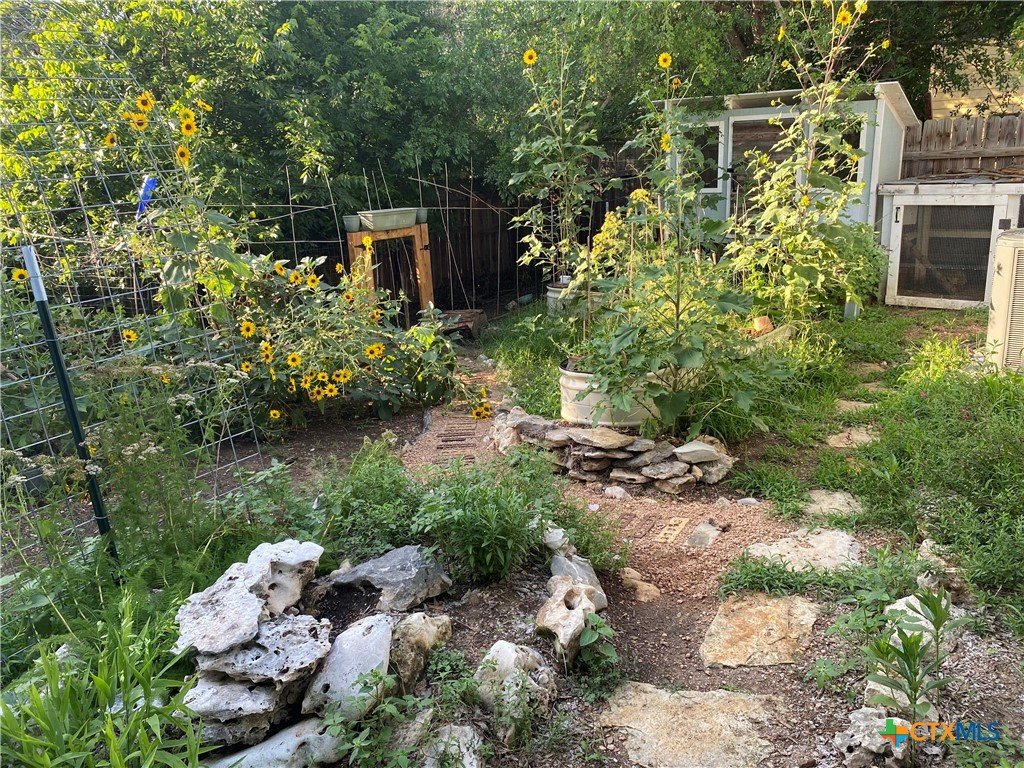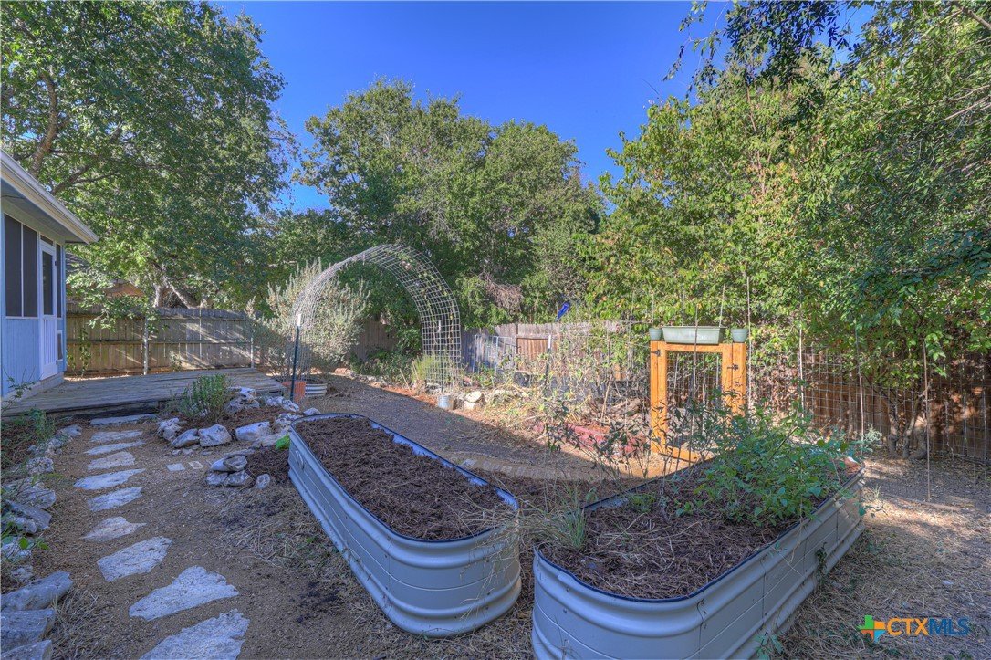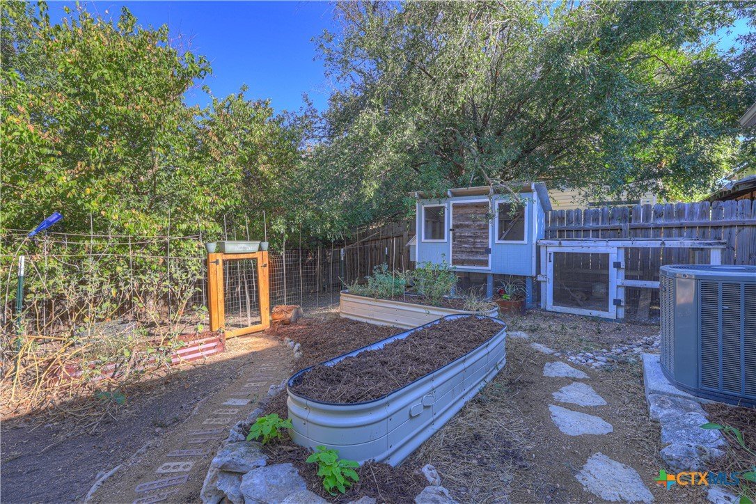This charming single-family home is nestled in the desirable Oak Knoll neighborhood, close to downtown San Marcos, Crockett Elementary, and The Texas State bus route. The property features beautifully designed front and back gardens with native and adaptive landscaping that will burst into color come spring. Two raised garden beds in the backyard and a raised kitchen garden with a trellis in the front are ready for fall planting. A chicken coop with external nesting boxes makes gathering fresh eggs part of the morning routine. Inside, the home is filled with natural light from abundant windows. The spacious living room features a raised ceiling and a wood-burning fireplace that gives the space an easy, comfortable feel. Custom matching cabinetry adds charm and continuity throughout the home, and the kitchen offers great storage and a clever pantry design, connecting seamlessly to the dining space. The screened-in patio is accessible from both the living room and primary bedroom and is perfect for relaxing or entertaining almost year round. The primary suite is privately situated off the living area, while the secondary bedrooms are down their own hallway off the front entry. Additional highlights include large walk-in closets, excellent storage, a metal roof, gutters, and a French drain system. This is a home that has been thoughtfully cared for and is ready for its next chapter.