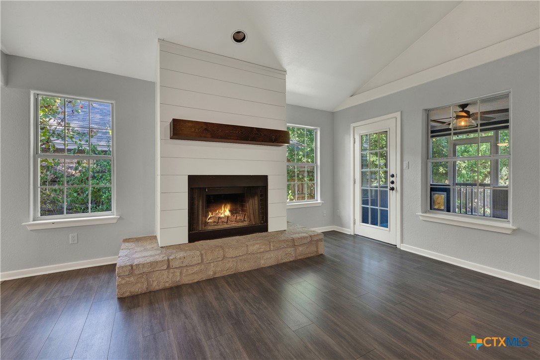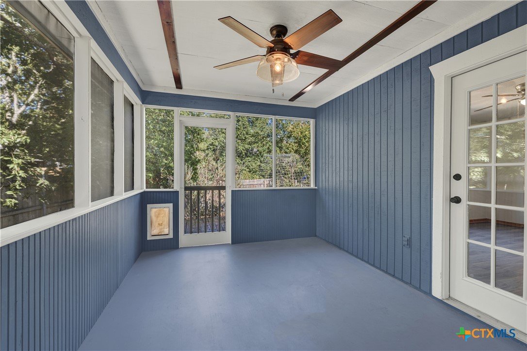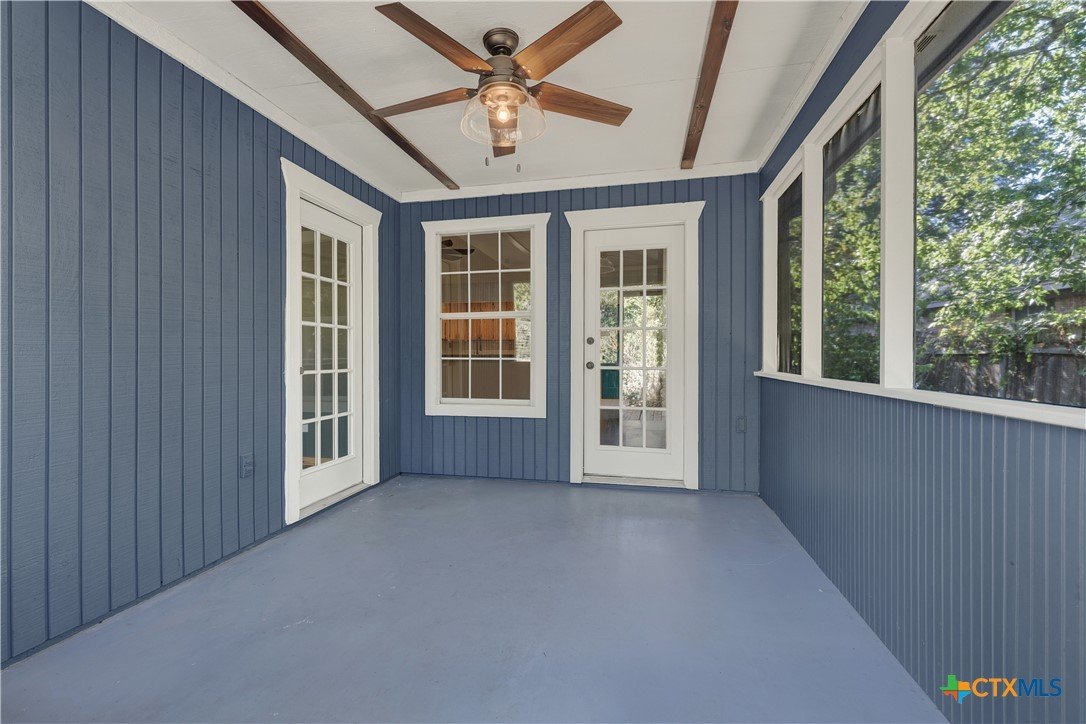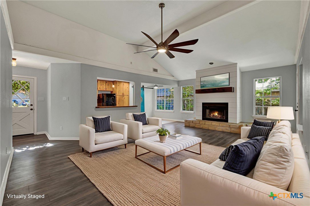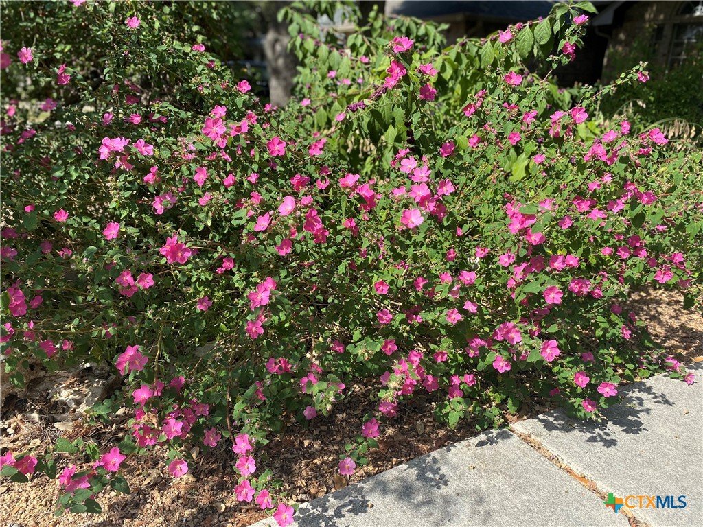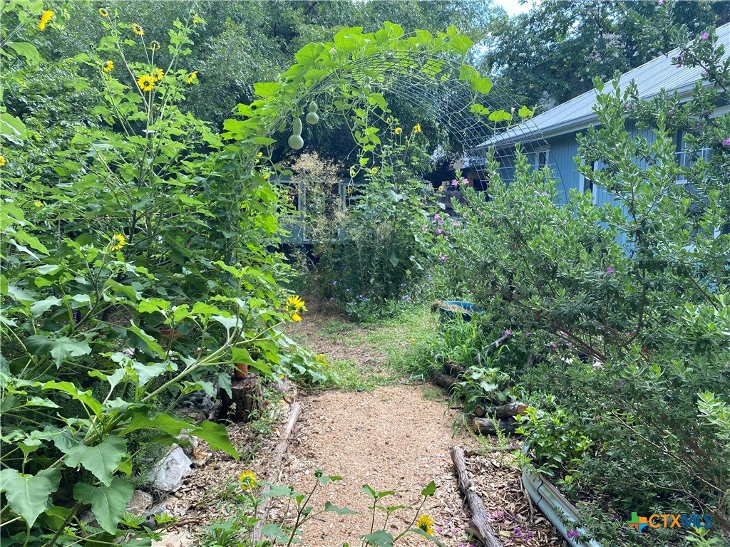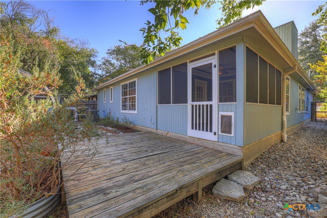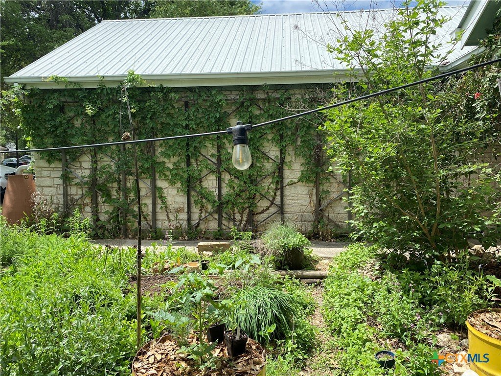 This charming single-family home is nestled in the desirable Oak Knoll neighborhood, close to downtown San Marcos, Crockett Elementary, and The Texas State bus route. The property features beautifully designed front and back gardens with native and adaptive landscaping that will burst into color come spring. Two raised garden beds in the backyard and a raised kitchen garden with a trellis in the front are ready for fall planting. A chicken coop with external nesting boxes makes gathering fresh eggs part of the morning routine. Inside, the home is filled with natural light from abundant windows. The spacious living room features a raised ceiling and a wood-burning fireplace that gives the space an easy, comfortable feel. Custom matching cabinetry adds charm and continuity throughout the home, and the kitchen offers great storage and a clever pantry design, connecting seamlessly to the dining space. The screened-in patio is accessible from both the living room and primary bedroom and is perfect for relaxing or entertaining almost year round. The primary suite is privately situated off the living area, while the secondary bedrooms are down their own hallway off the front entry. Additional highlights include large walk-in closets, excellent storage, a metal roof, gutters, and a French drain system. This is a home that has been thoughtfully cared for and is ready for its next chapter.