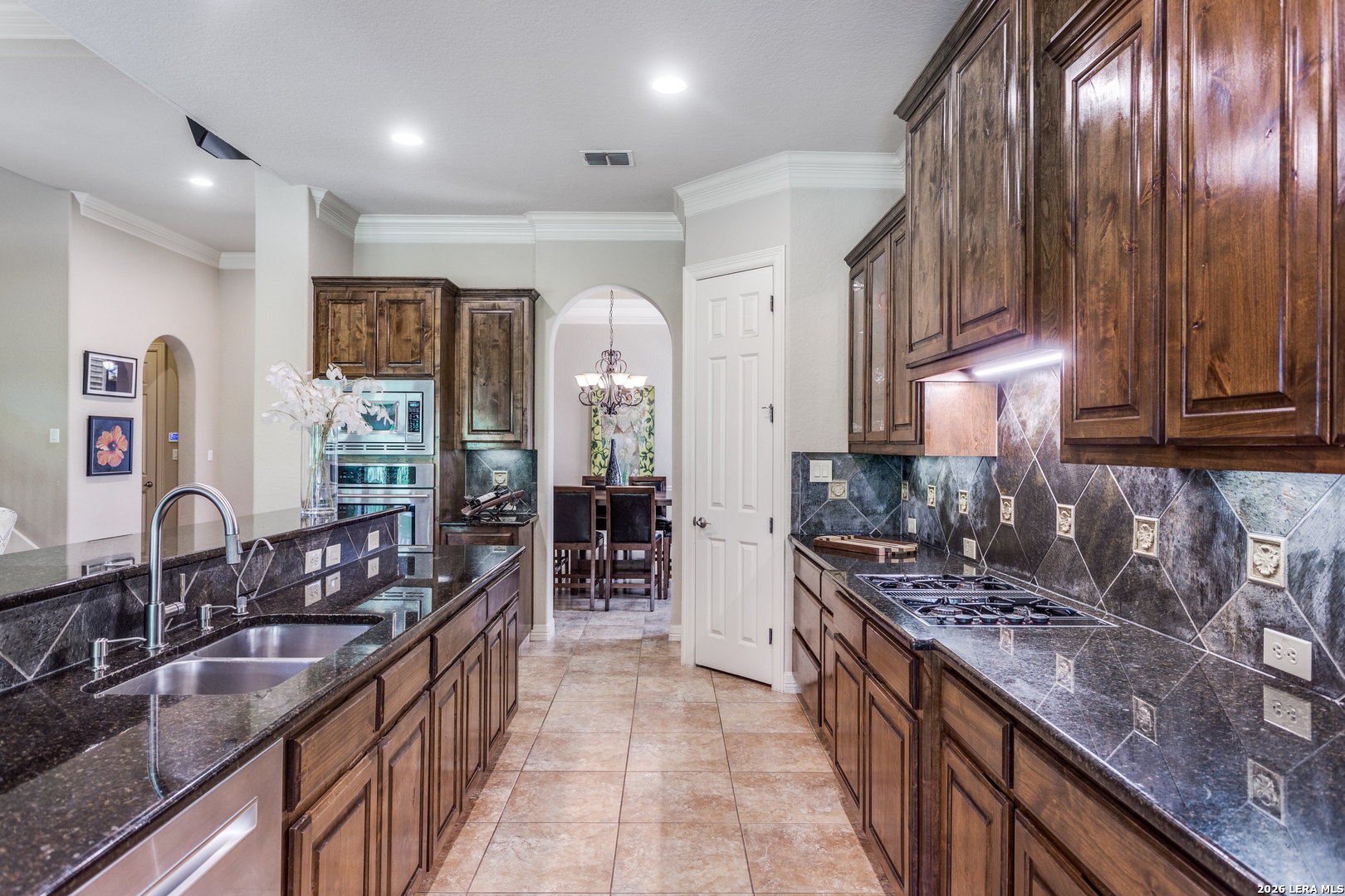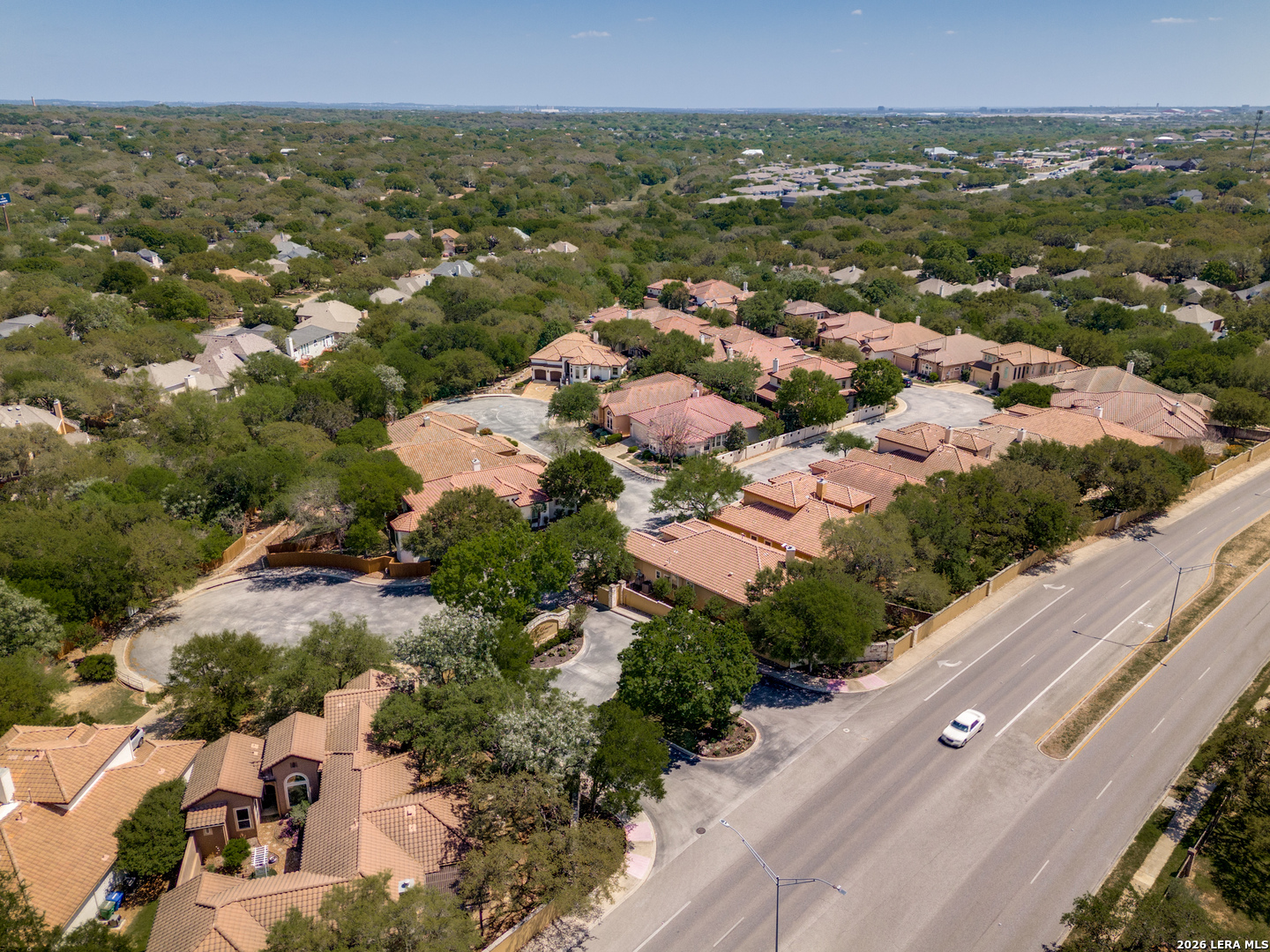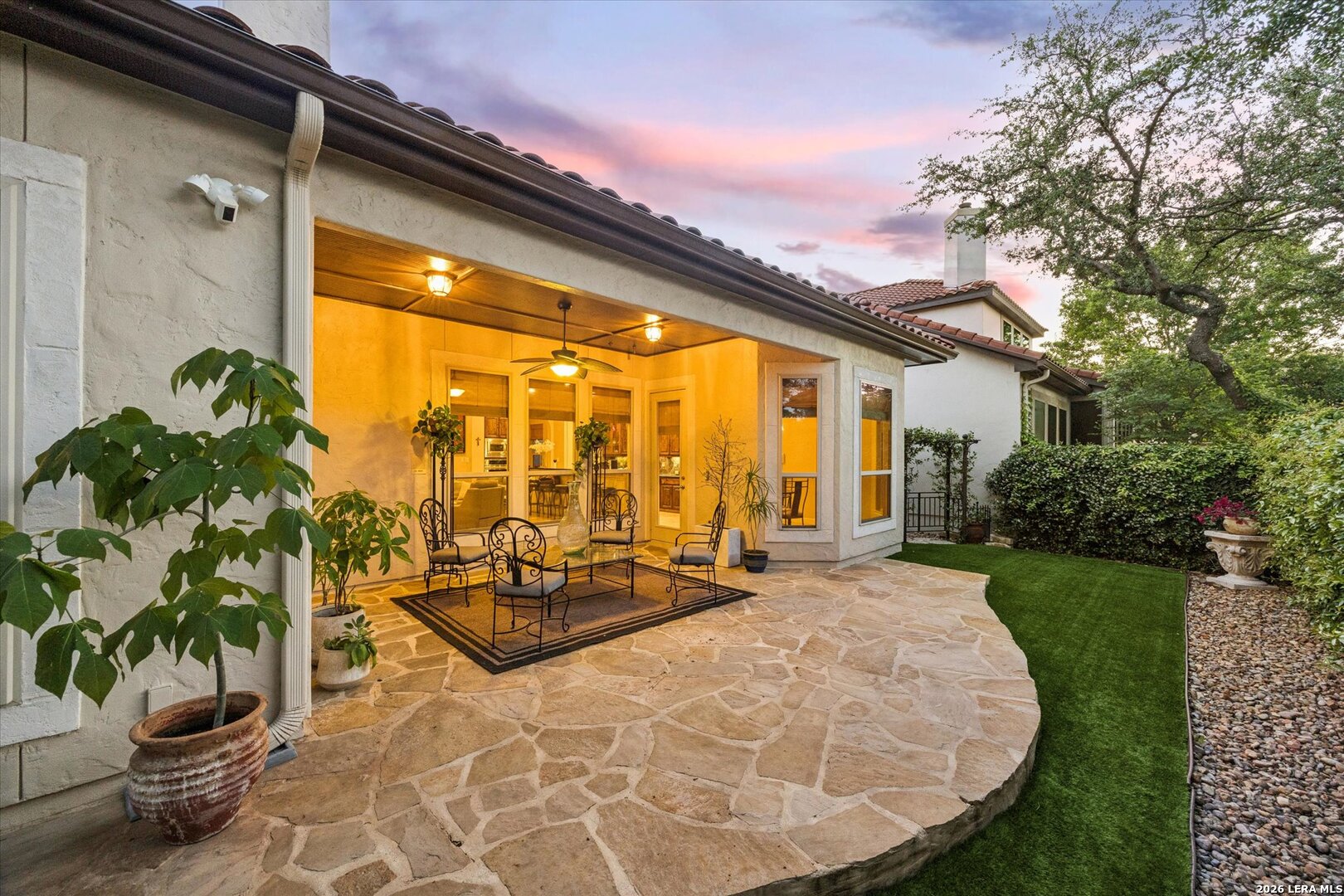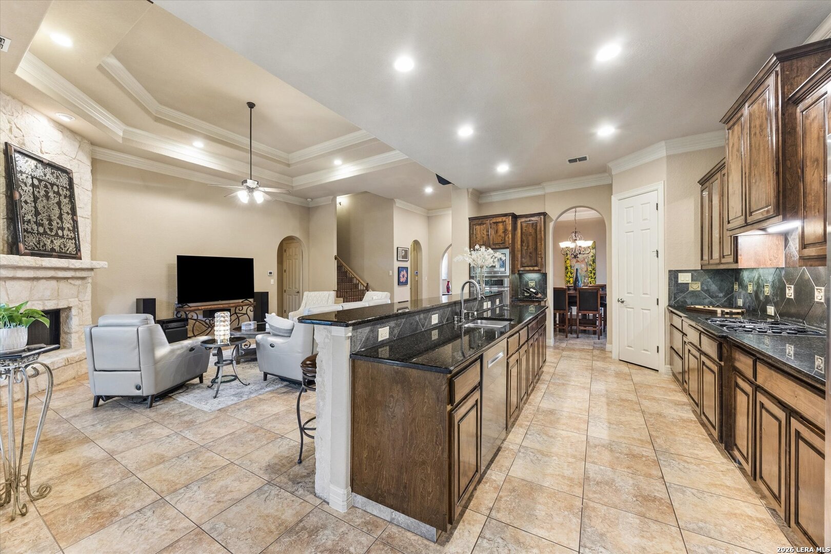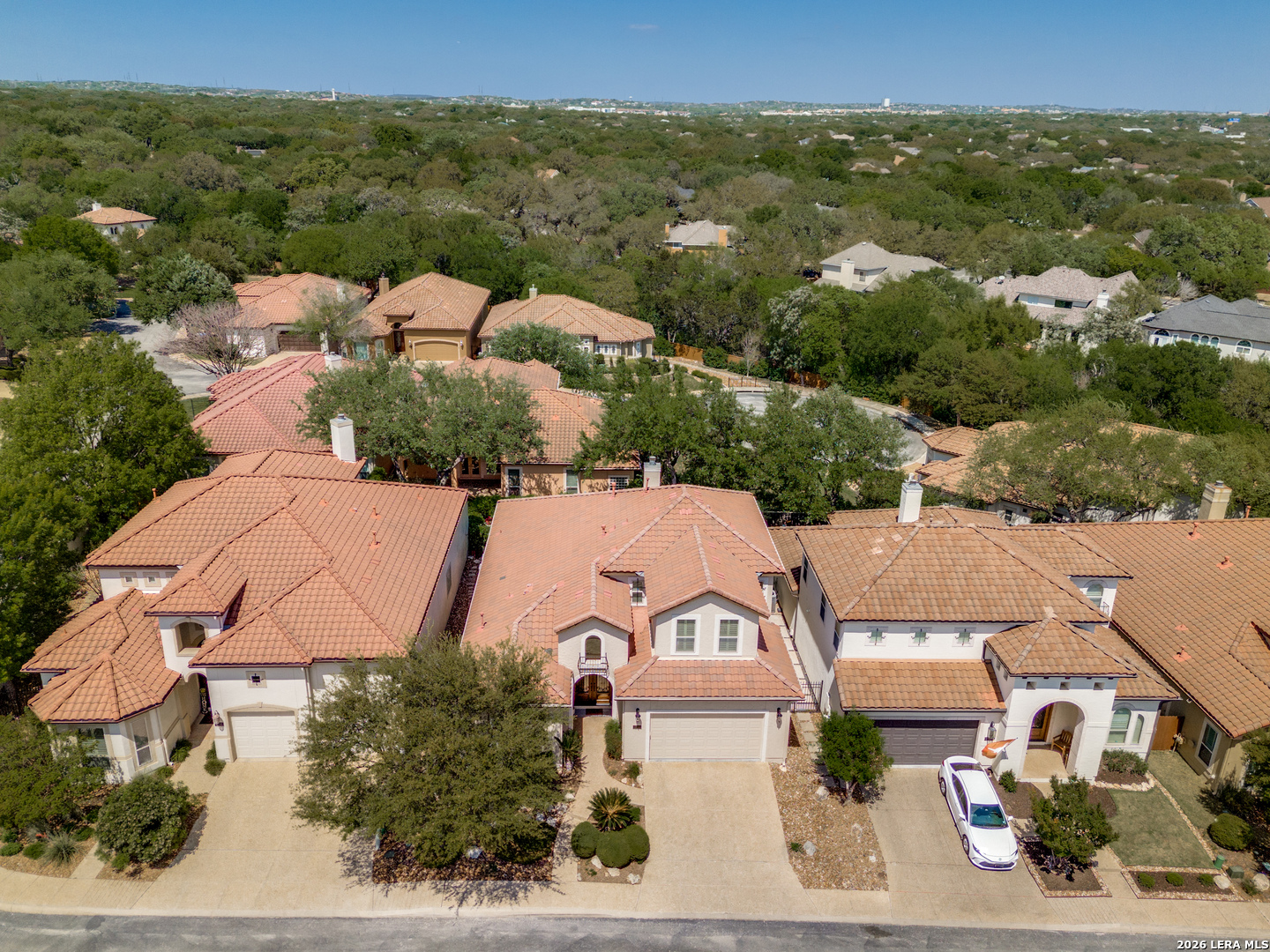 McNair Custom Home in The Reserve at Deerfield - one of San Antonio's most exclusive gated enclaves. Just 32 homes, each unique, inside Loop 1604. Lock-and-leave living, beautifully executed. McNair Custom Homes is one of San Antonio's most respected custom builders - and this home reflects that standard throughout. Mediterranean architecture commands from the curb: fresh stucco (2025), tile roof, decorative Juliette balcony, and dramatic arched portico with iron-and-glass entry doors. Inside, soaring tray ceilings, layered crown molding, sweeping archways, decorative columns, and wrought iron railings flow through an open, beautifully connected 2,822 sqft plan. The great room anchors around a grand stone fireplace and opens to a chef's kitchen: knotty alder soft-close cabinetry, dark granite, large island with bar seating, built-in oven, gas cooktop, and walk-in pantry. Formal dining through a graceful archway. Sunny breakfast nook. First-floor primary suite (14x22) is a private retreat - engineered hardwood, tray ceiling, spa bath with frameless glass shower, soaking tub, dual granite vanities, and custom walk-in closet. Second bedroom and full bath also on main level. Upstairs: loft/sitting room, generous bonus room (14x15), and two bedrooms - ideal as secondary living, flex space, or private guest wing. Outside: covered flagstone patio, gas grill hookup, premium turf. Easy, beautiful, zero-waste. One owner. Meticulously maintained. Dual-zone HVAC, dual-zone water heaters, whole-house softener, reverse osmosis, double-pane windows, finished garage floor, oversized 2-car garage (21x23), owned security system, in-wall pest control. HOA $1,638/yr. Zoned to NEISD. Under 15 min to airport, medical center, and premier shopping. Under 20 to downtown and the River Walk.