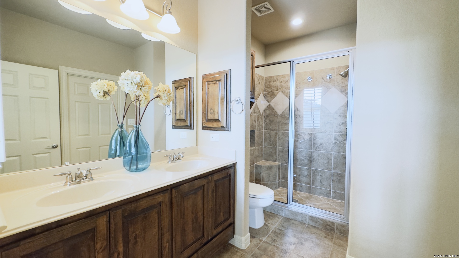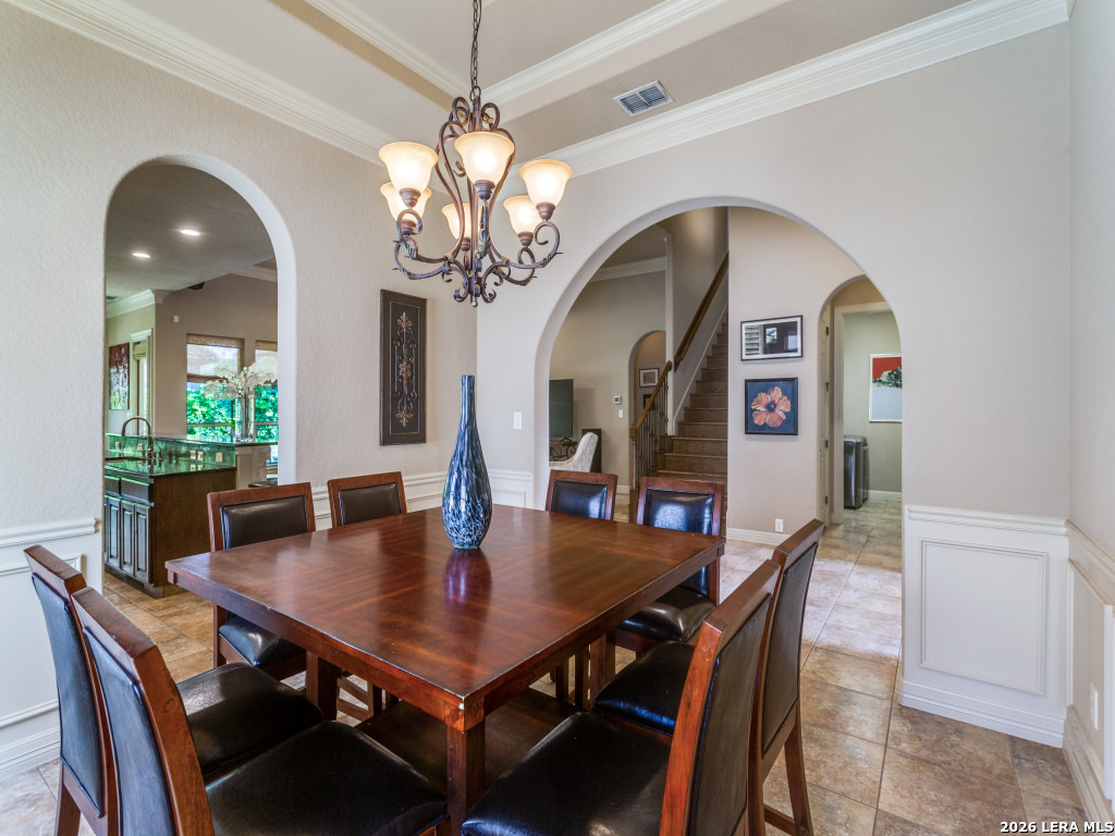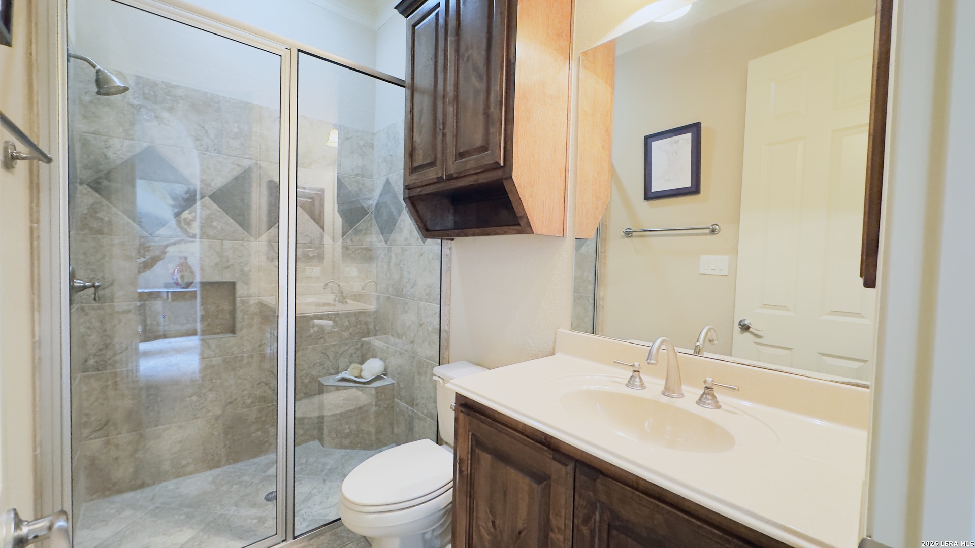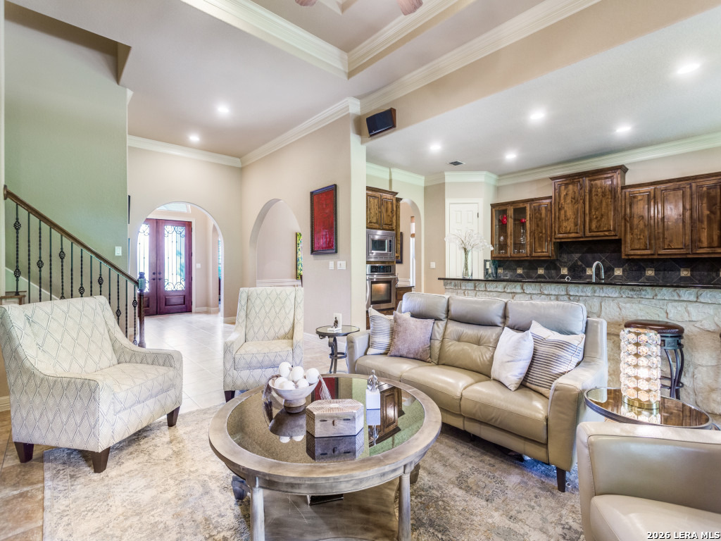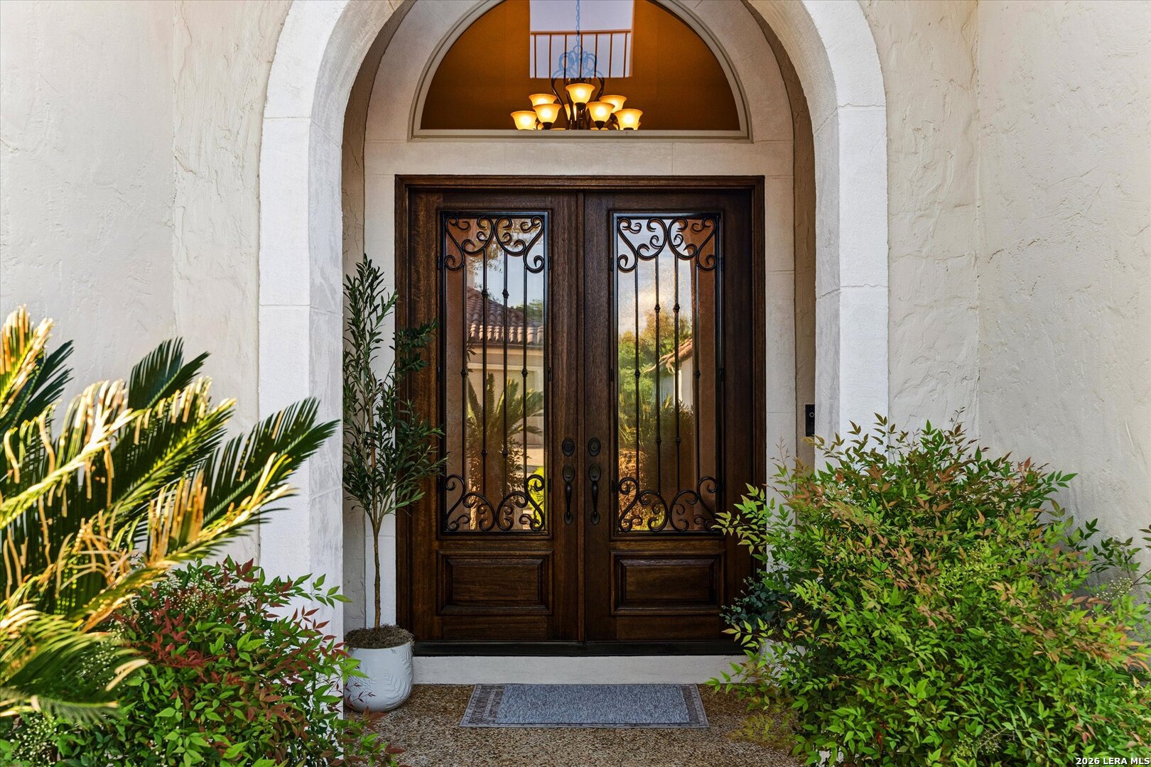 McNair Custom Home in The Reserve at Deerfield - one of San Antonio's most exclusive gated enclaves. Just 32 homes, each unique, inside Loop 1604. Lock-and-leave living, beautifully executed. McNair Custom Homes is one of San Antonio's most respected custom builders - and this home reflects that standard throughout. Mediterranean architecture commands from the curb: fresh stucco (2025), tile roof, decorative Juliette balcony, and dramatic arched portico with iron-and-glass entry doors. Inside, soaring tray ceilings, layered crown molding, sweeping archways, decorative columns, and wrought iron railings flow through an open, beautifully connected 2,822 sqft plan. The great room anchors around a grand stone fireplace and opens to a chef's kitchen: knotty alder soft-close cabinetry, dark granite, large island with bar seating, built-in oven, gas cooktop, and walk-in pantry. Formal dining through a graceful archway. Sunny breakfast nook. First-floor primary suite (14x22) is a private retreat - engineered hardwood, tray ceiling, spa bath with frameless glass shower, soaking tub, dual granite vanities, and custom walk-in closet. Second bedroom and full bath also on main level. Upstairs: loft/sitting room, generous bonus room (14x15), and two bedrooms - ideal as secondary living, flex space, or private guest wing. Outside: covered flagstone patio, gas grill hookup, premium turf. Easy, beautiful, zero-waste. One owner. Meticulously maintained. Dual-zone HVAC, dual-zone water heaters, whole-house softener, reverse osmosis, double-pane windows, finished garage floor, oversized 2-car garage (21x23), owned security system, in-wall pest control. HOA $1,638/yr. Zoned to NEISD. Under 15 min to airport, medical center, and premier shopping. Under 20 to downtown and the River Walk.