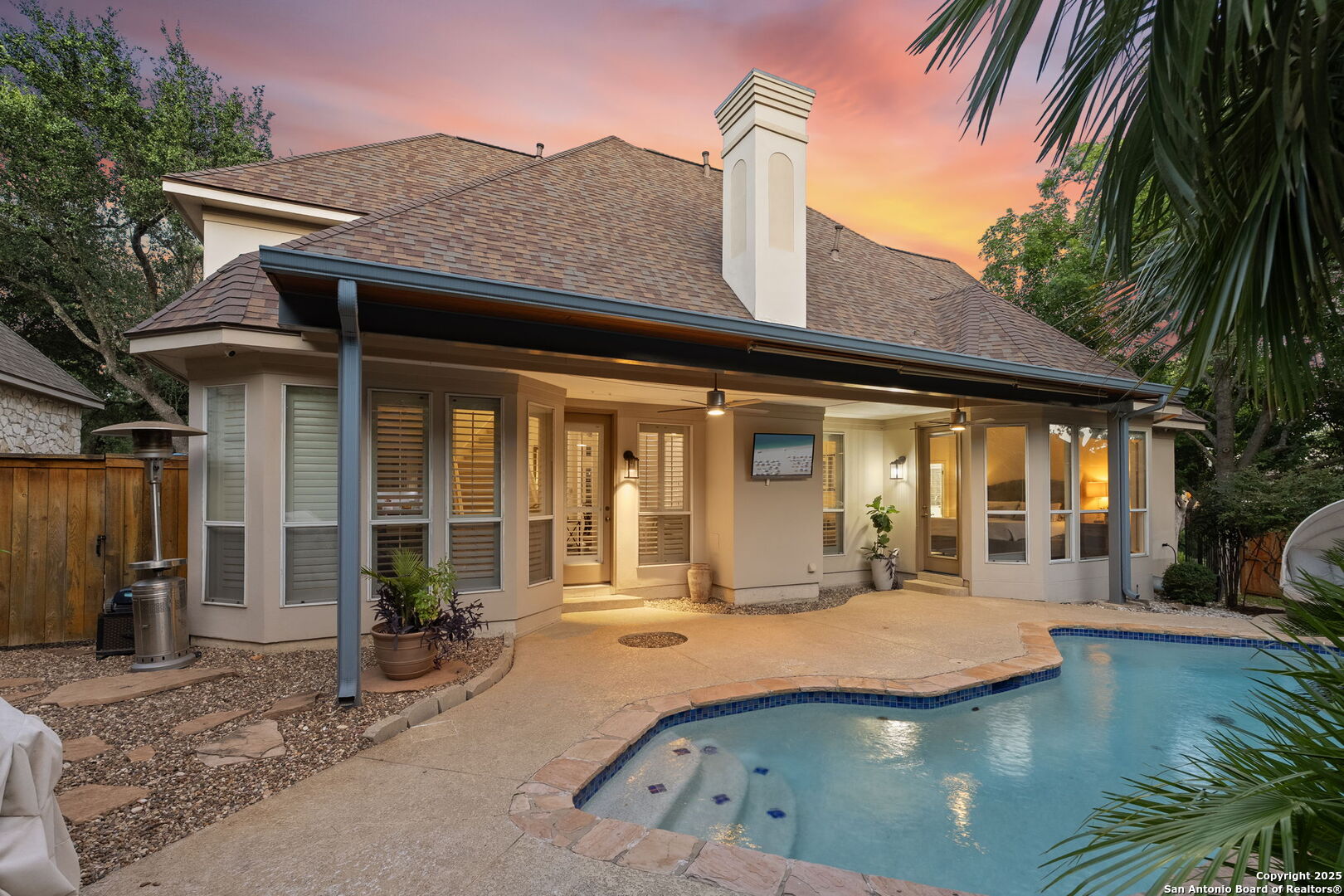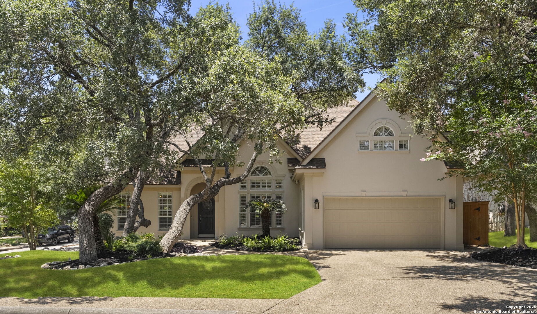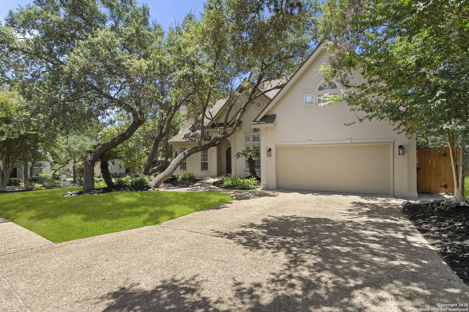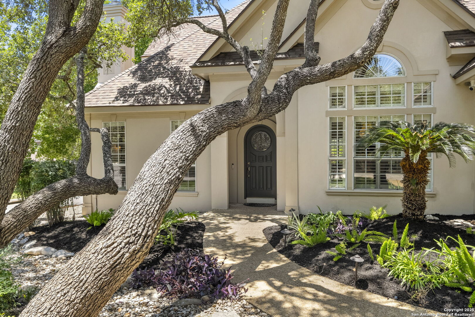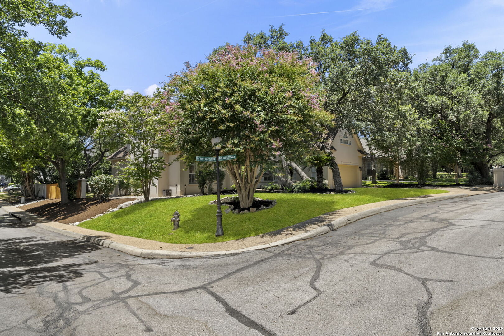 Welcome to this beautifully maintained 4-bedroom, 3.5-bathroom home situated on a spacious corner lot in the guard-gated community of The Fountains at Deerfield. This two-story residence offers a functional and flexible floor plan, with the primary suite conveniently located on the main level. Inside, you'll find warm wood flooring, tall ceilings, classic columns, and two eye-catching fireplaces that add charm and character. Plantation shutters and large windows fill the home with natural light, while the kitchen features marble countertops, ample cabinetry, and a layout designed for both comfort and entertaining. Upstairs includes 3 additional bedrooms, 2 bathrooms, and plenty of storage throughout. One of the bedrooms is currently being used as an office/sitting room. Step into the backyard and enjoy a private outdoor retreat complete with a sparkling pool, mature palm tree, and generous patio space. Ideally located just off Loop 1604, this home offers quick access to nearby shopping, dining, and grocery options-including H-E-B, Target, Whole Foods, Trader Joe's, and more. A rare opportunity to own in a sought-after neighborhood with both style and convenience. Updates include: Roof 2020; HVACs 2020; Pool Reno 2022; Carpet 2025; Insulated Garage Door 2024.