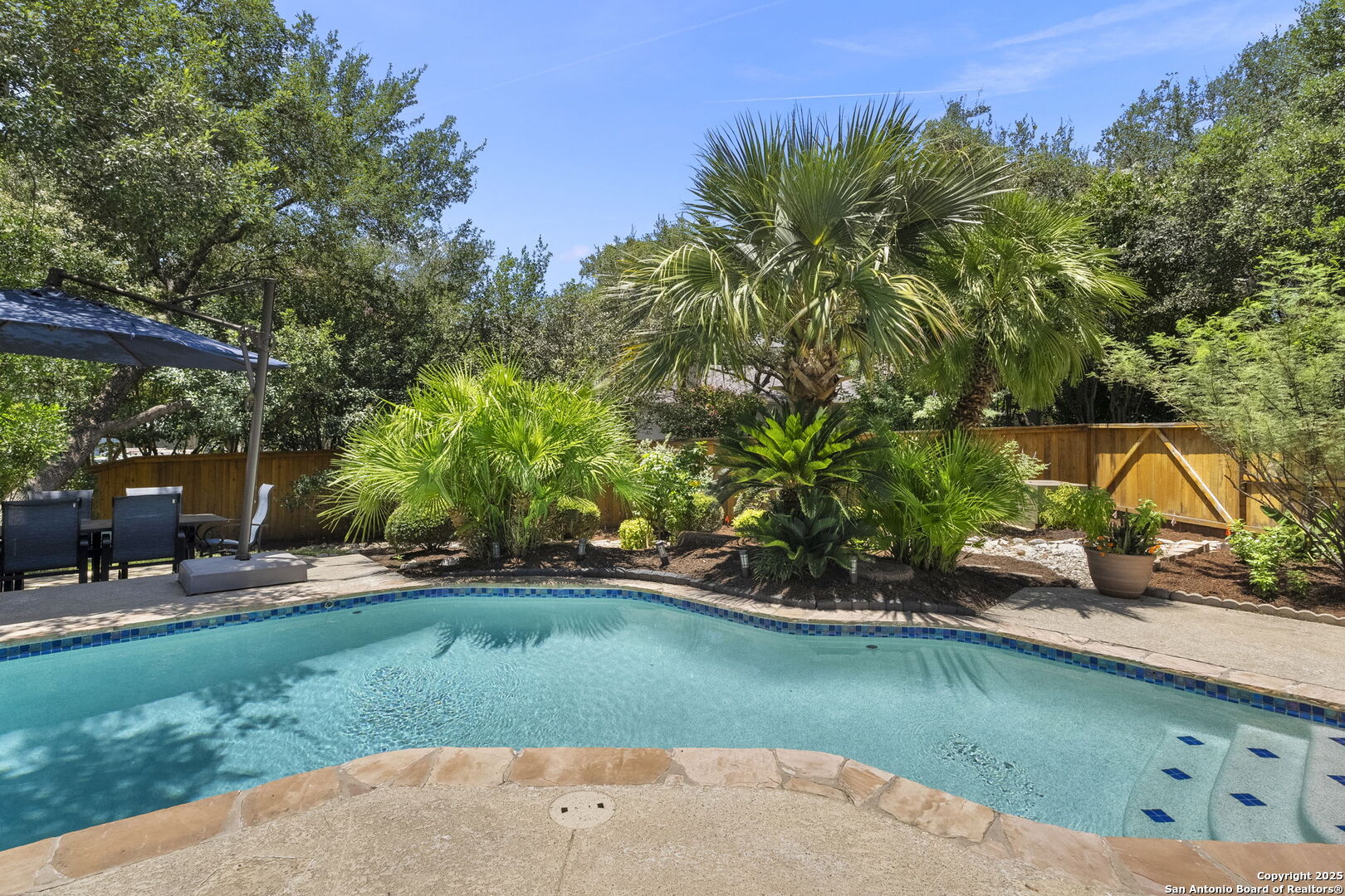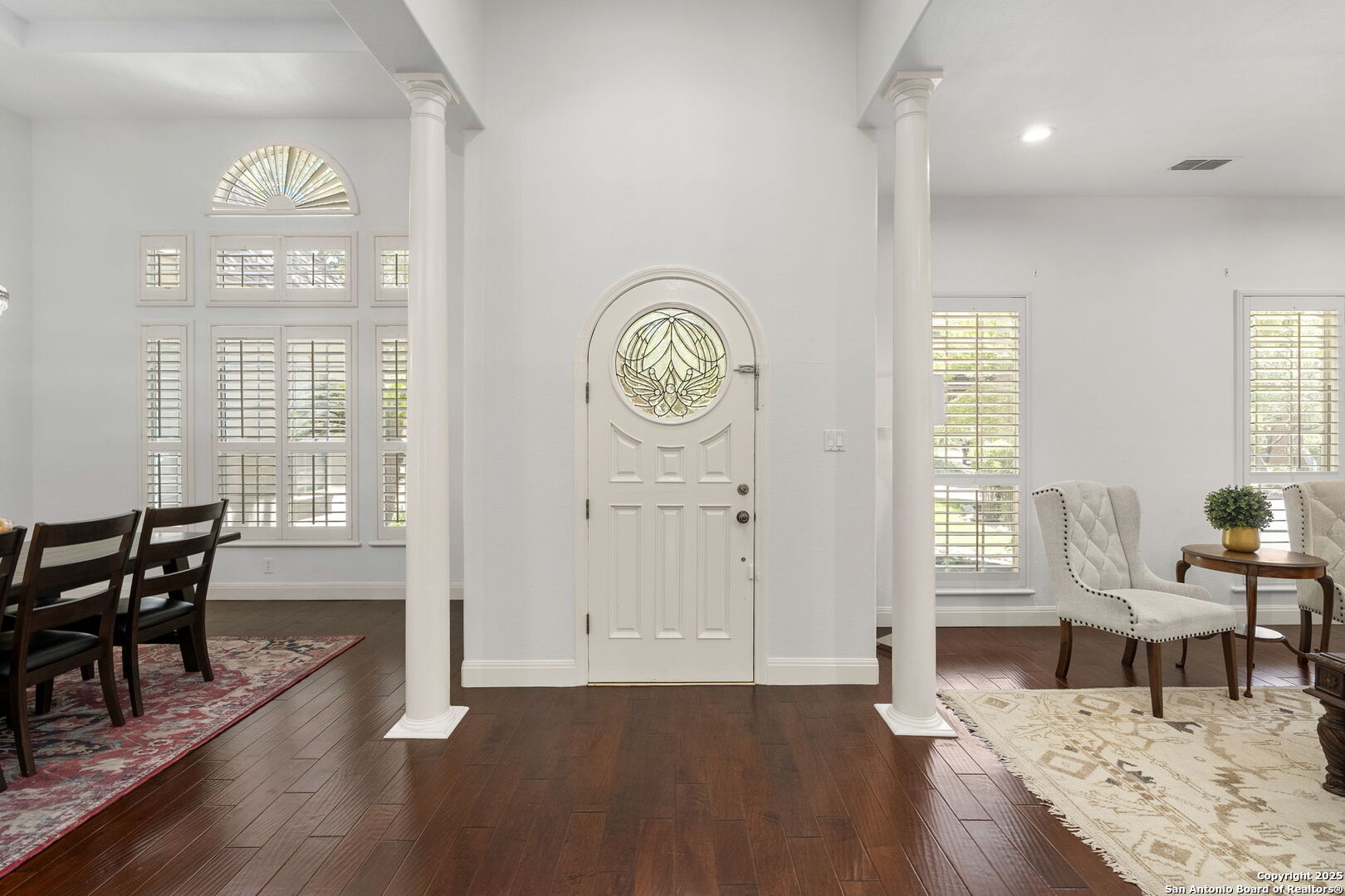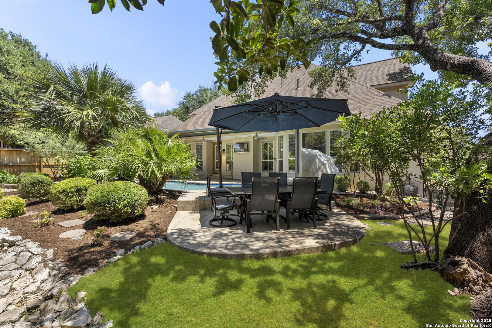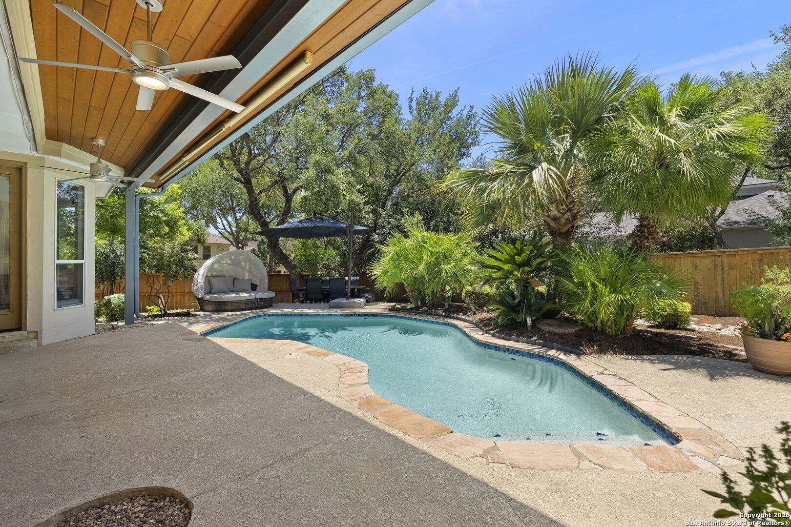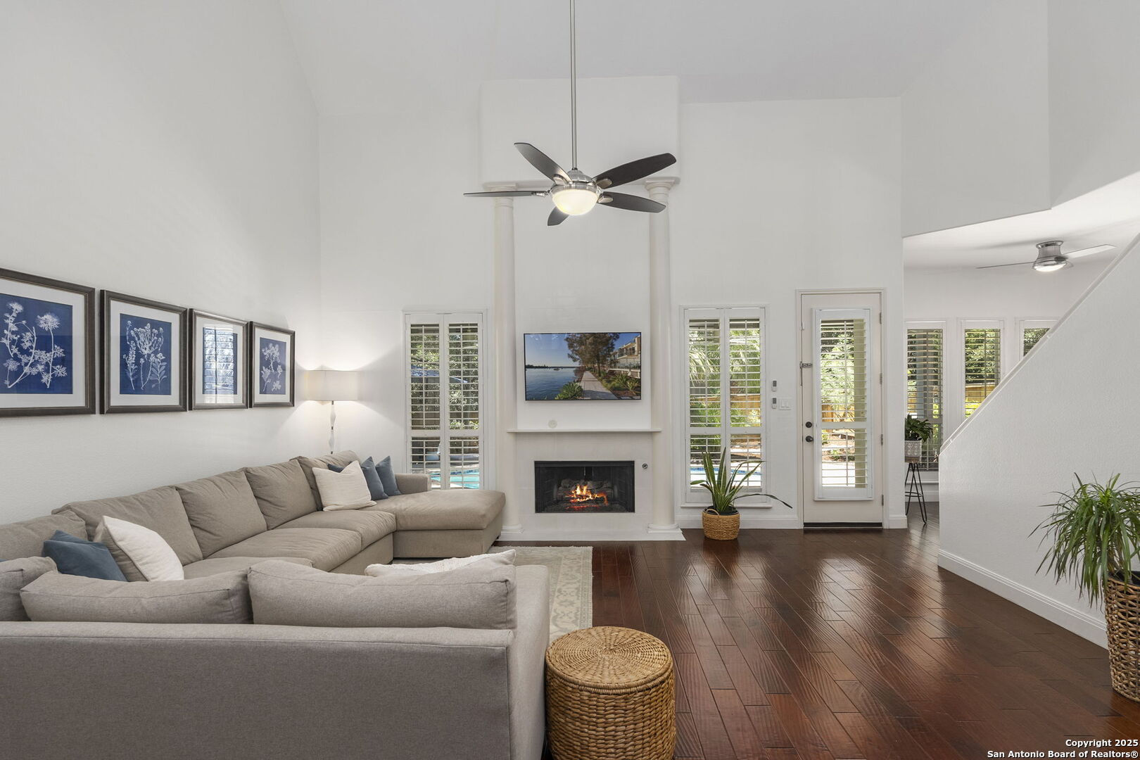 Welcome to this beautifully maintained 4-bedroom, 3.5-bathroom home situated on a spacious corner lot in the guard-gated community of The Fountains at Deerfield. This two-story residence offers a functional and flexible floor plan, with the primary suite conveniently located on the main level. Inside, you'll find warm wood flooring, tall ceilings, classic columns, and two eye-catching fireplaces that add charm and character. Plantation shutters and large windows fill the home with natural light, while the kitchen features marble countertops, ample cabinetry, and a layout designed for both comfort and entertaining. Upstairs includes 3 additional bedrooms, 2 bathrooms, and plenty of storage throughout. One of the bedrooms is currently being used as an office/sitting room. Step into the backyard and enjoy a private outdoor retreat complete with a sparkling pool, mature palm tree, and generous patio space. Ideally located just off Loop 1604, this home offers quick access to nearby shopping, dining, and grocery options-including H-E-B, Target, Whole Foods, Trader Joe's, and more. A rare opportunity to own in a sought-after neighborhood with both style and convenience. Updates include: Roof 2020; HVACs 2020; Pool Reno 2022; Carpet 2025; Insulated Garage Door 2024.