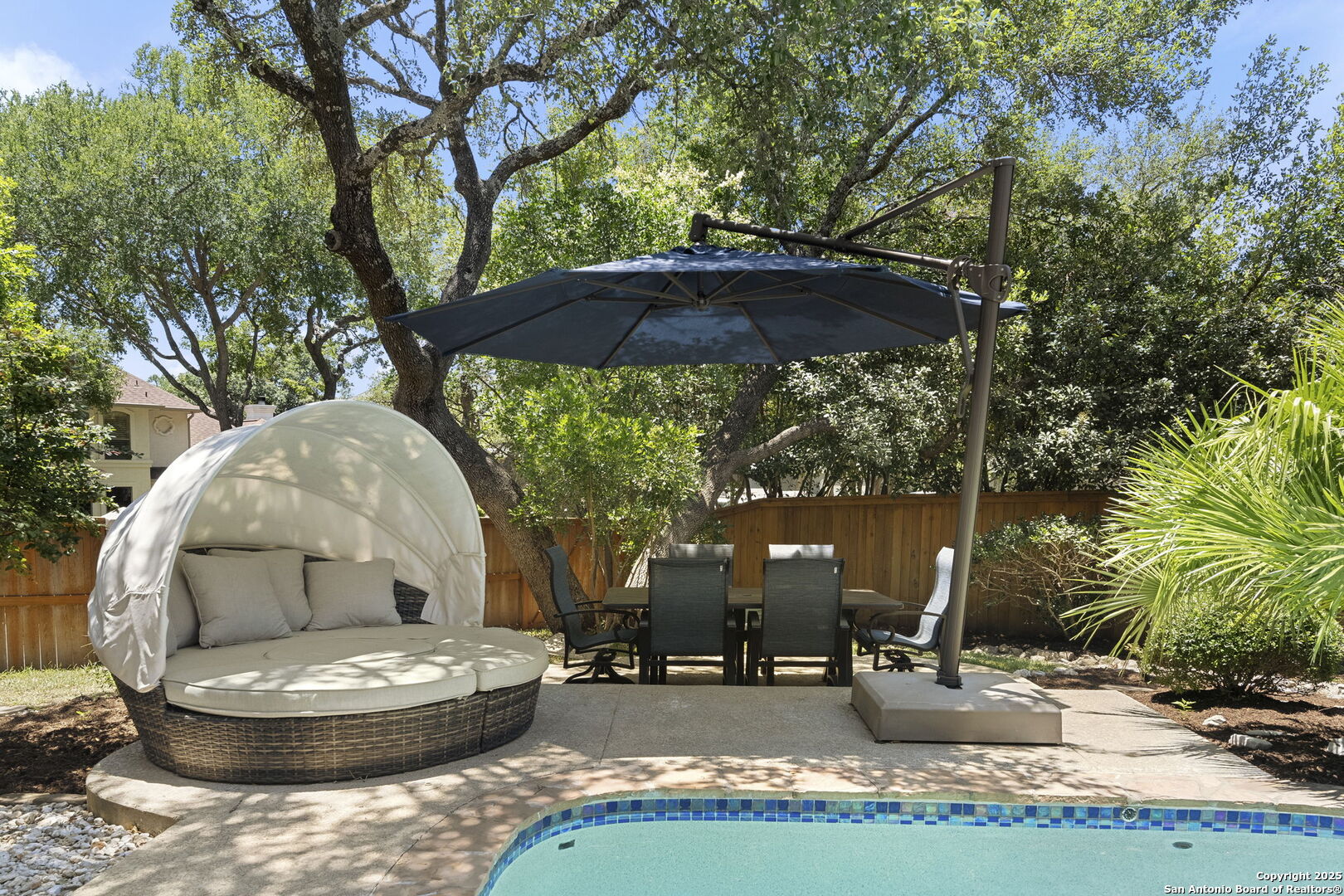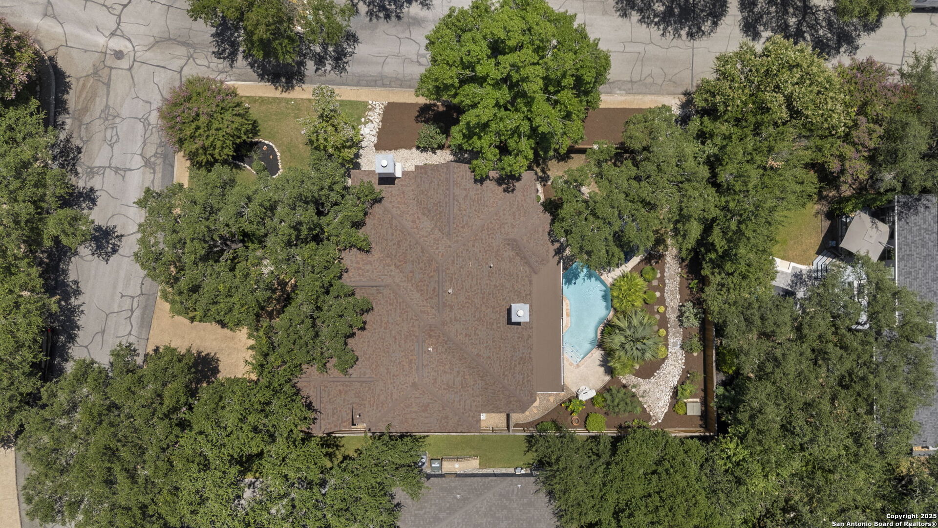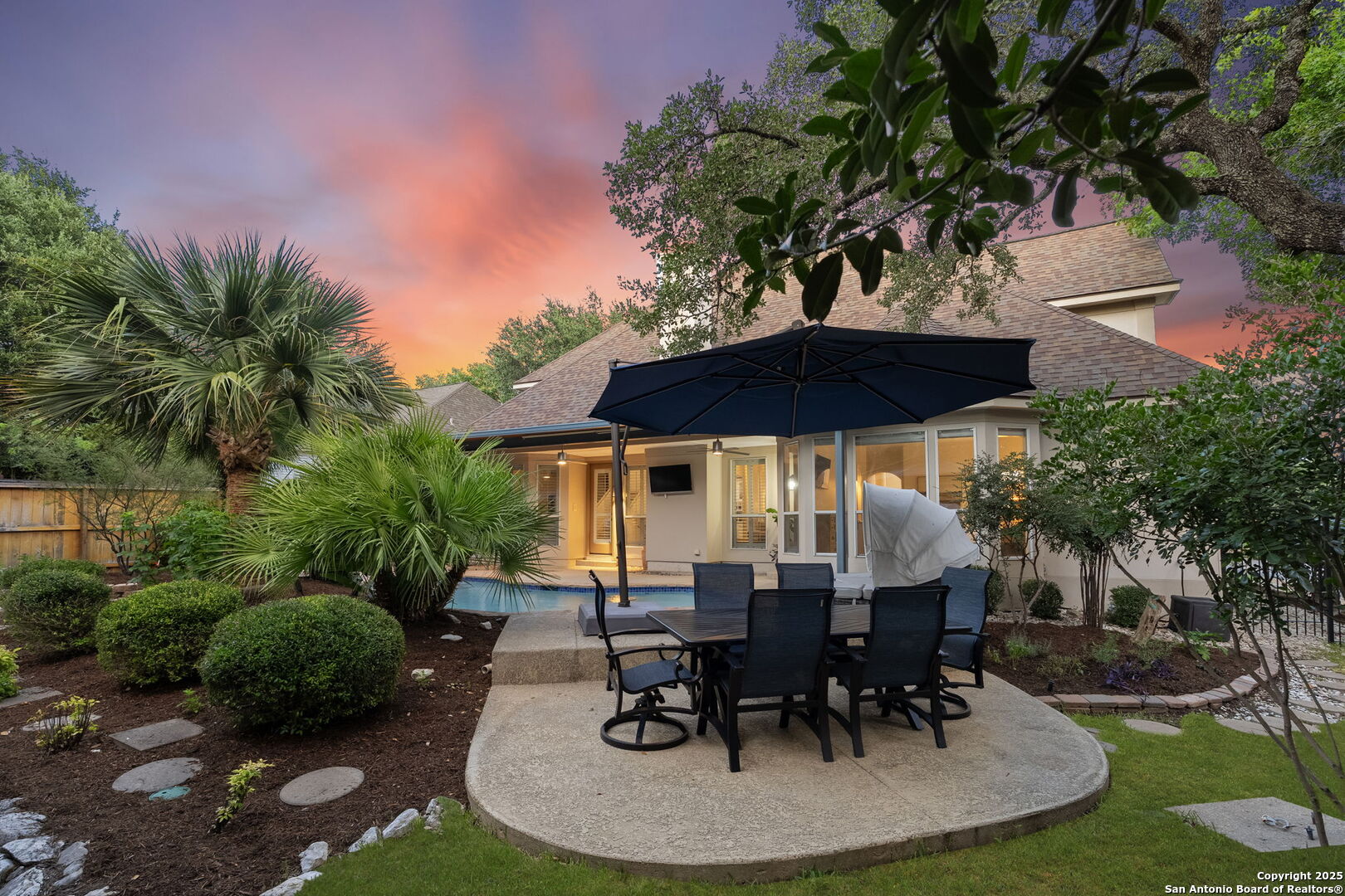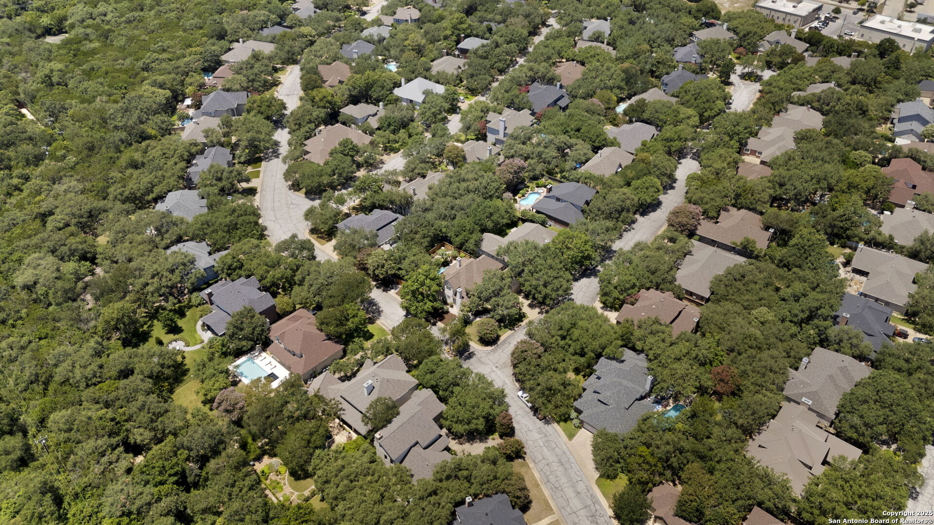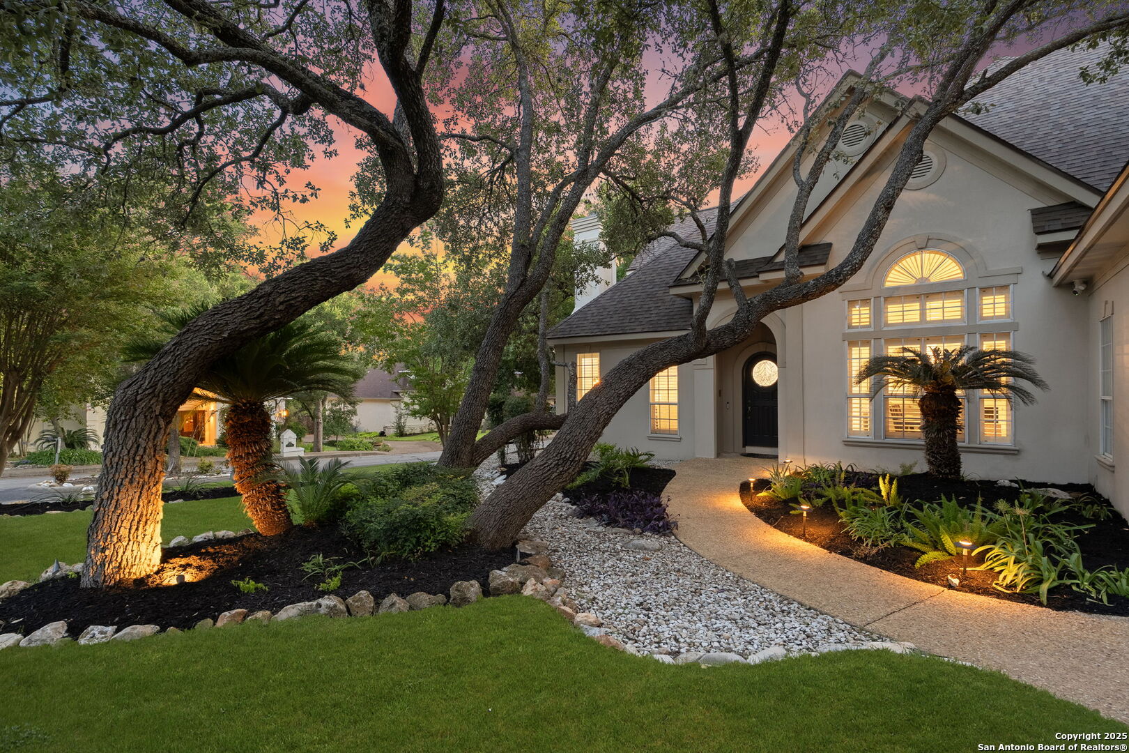 Welcome to this beautifully maintained 4-bedroom, 3.5-bathroom home situated on a spacious corner lot in the guard-gated community of The Fountains at Deerfield. This two-story residence offers a functional and flexible floor plan, with the primary suite conveniently located on the main level. Inside, you'll find warm wood flooring, tall ceilings, classic columns, and two eye-catching fireplaces that add charm and character. Plantation shutters and large windows fill the home with natural light, while the kitchen features marble countertops, ample cabinetry, and a layout designed for both comfort and entertaining. Upstairs includes 3 additional bedrooms, 2 bathrooms, and plenty of storage throughout. One of the bedrooms is currently being used as an office/sitting room. Step into the backyard and enjoy a private outdoor retreat complete with a sparkling pool, mature palm tree, and generous patio space. Ideally located just off Loop 1604, this home offers quick access to nearby shopping, dining, and grocery options-including H-E-B, Target, Whole Foods, Trader Joe's, and more. A rare opportunity to own in a sought-after neighborhood with both style and convenience. Updates include: Roof 2020; HVACs 2020; Pool Reno 2022; Carpet 2025; Insulated Garage Door 2024.