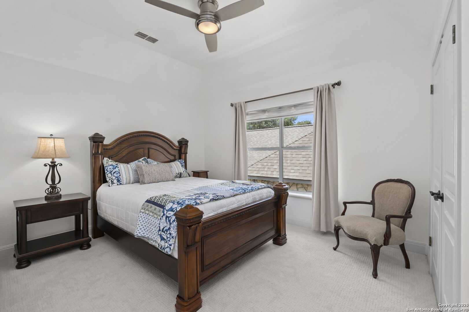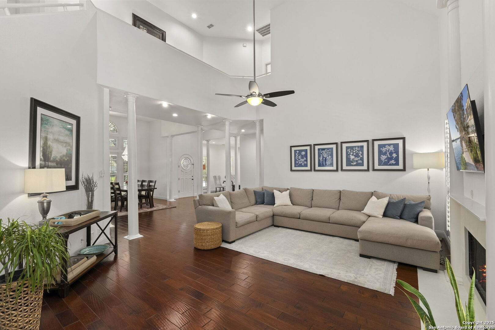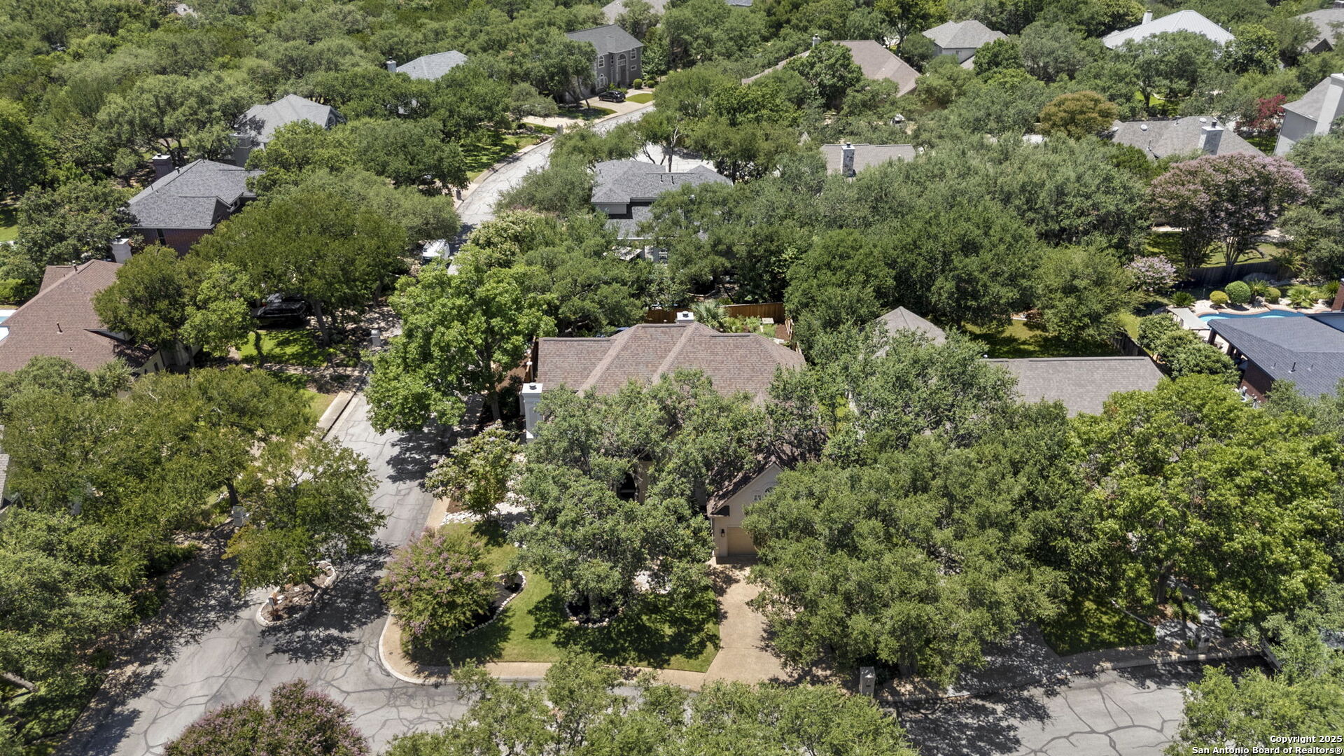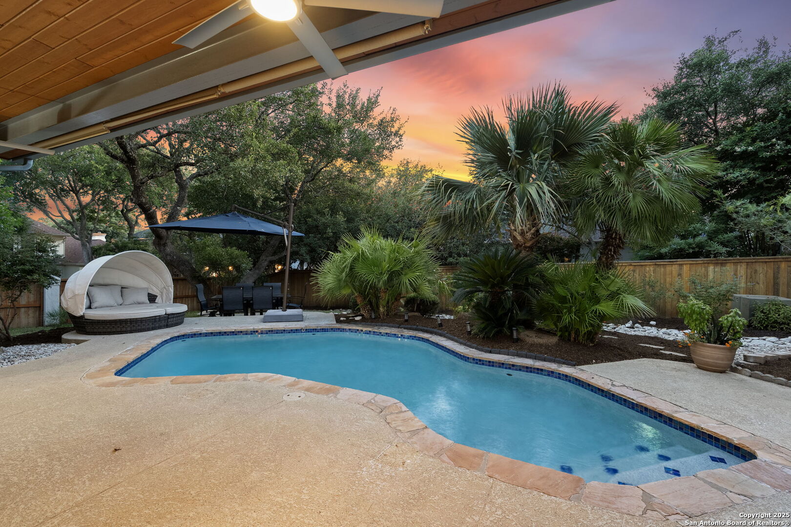 Welcome to this beautifully maintained 4-bedroom, 3.5-bathroom home situated on a spacious corner lot in the guard-gated community of The Fountains at Deerfield. This two-story residence offers a functional and flexible floor plan, with the primary suite conveniently located on the main level. Inside, you'll find warm wood flooring, tall ceilings, classic columns, and two eye-catching fireplaces that add charm and character. Plantation shutters and large windows fill the home with natural light, while the kitchen features marble countertops, ample cabinetry, and a layout designed for both comfort and entertaining. Upstairs includes 3 additional bedrooms, 2 bathrooms, and plenty of storage throughout. One of the bedrooms is currently being used as an office/sitting room. Step into the backyard and enjoy a private outdoor retreat complete with a sparkling pool, mature palm tree, and generous patio space. Ideally located just off Loop 1604, this home offers quick access to nearby shopping, dining, and grocery options-including H-E-B, Target, Whole Foods, Trader Joe's, and more. A rare opportunity to own in a sought-after neighborhood with both style and convenience. Updates include: Roof 2020; HVACs 2020; Pool Reno 2022; Carpet 2025; Insulated Garage Door 2024.