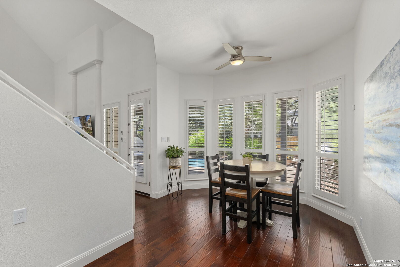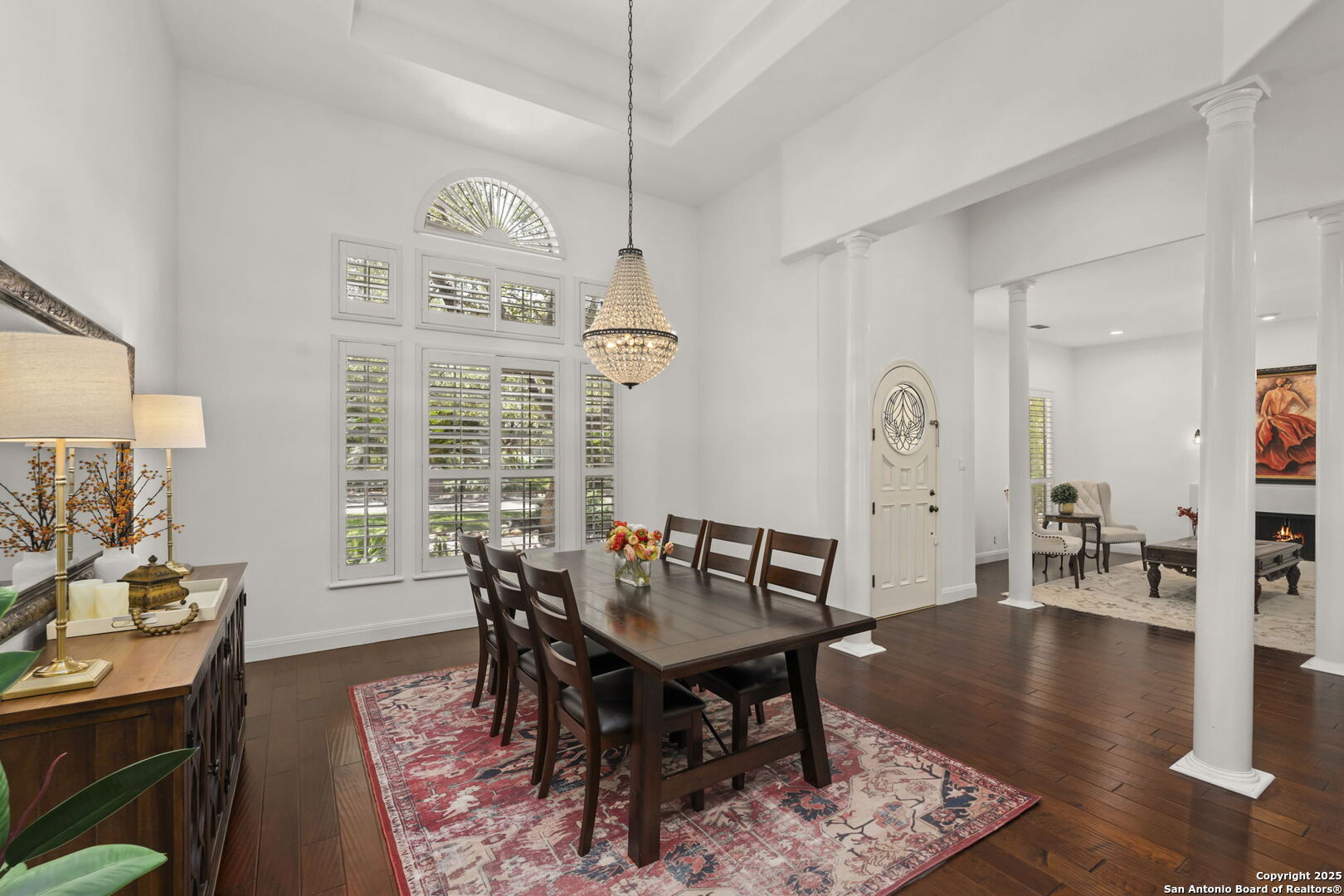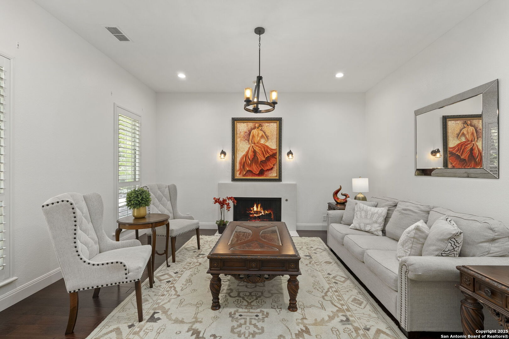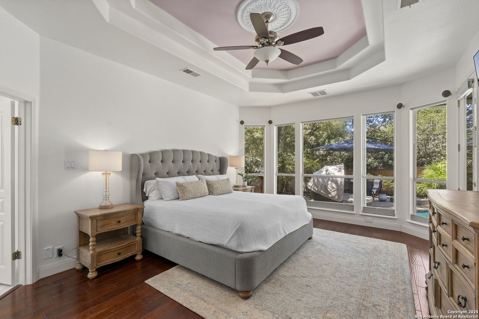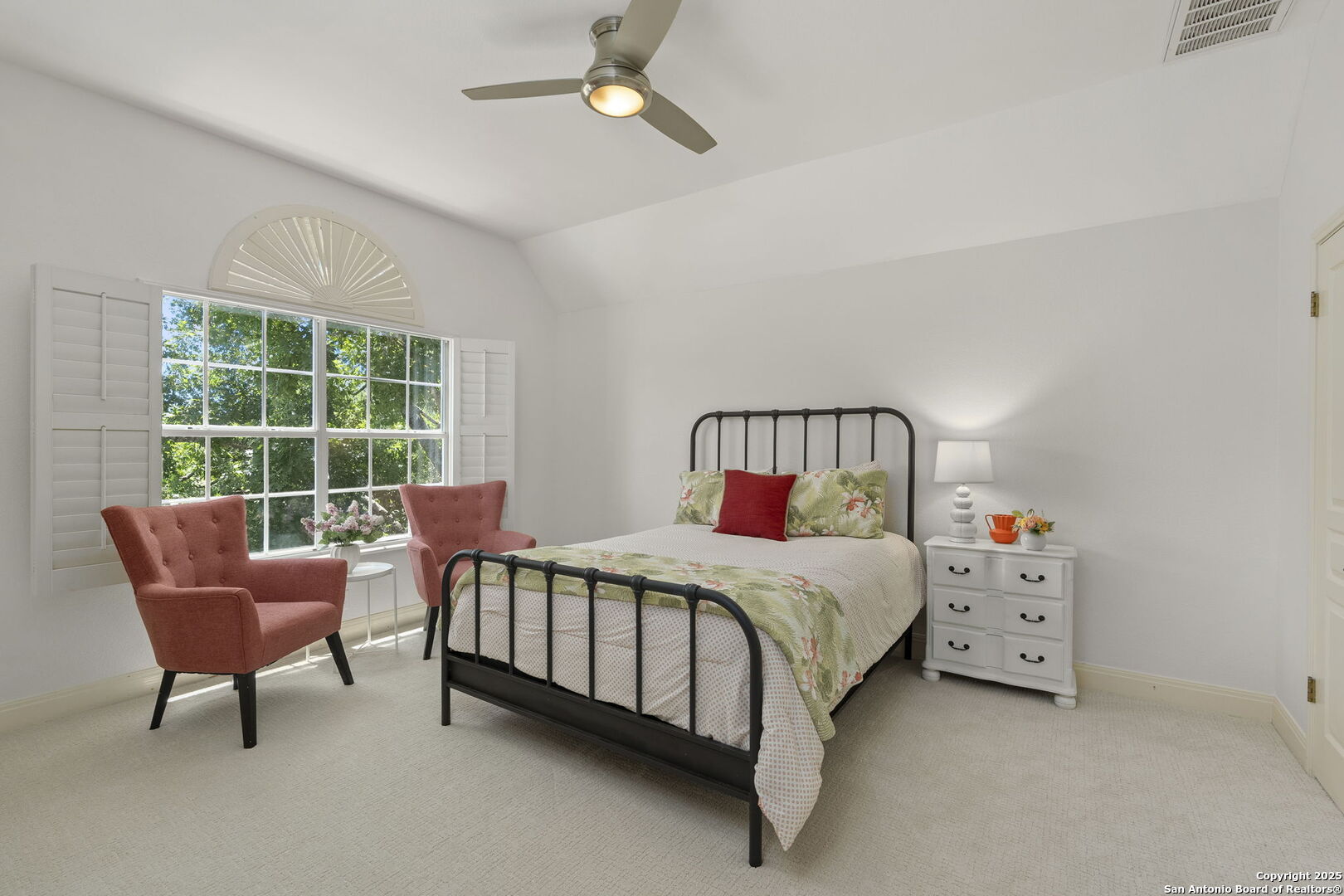 Welcome to this beautifully maintained 4-bedroom, 3.5-bathroom home situated on a spacious corner lot in the guard-gated community of The Fountains at Deerfield. This two-story residence offers a functional and flexible floor plan, with the primary suite conveniently located on the main level. Inside, you'll find warm wood flooring, tall ceilings, classic columns, and two eye-catching fireplaces that add charm and character. Plantation shutters and large windows fill the home with natural light, while the kitchen features marble countertops, ample cabinetry, and a layout designed for both comfort and entertaining. Upstairs includes 3 additional bedrooms, 2 bathrooms, and plenty of storage throughout. One of the bedrooms is currently being used as an office/sitting room. Step into the backyard and enjoy a private outdoor retreat complete with a sparkling pool, mature palm tree, and generous patio space. Ideally located just off Loop 1604, this home offers quick access to nearby shopping, dining, and grocery options-including H-E-B, Target, Whole Foods, Trader Joe's, and more. A rare opportunity to own in a sought-after neighborhood with both style and convenience. Updates include: Roof 2020; HVACs 2020; Pool Reno 2022; Carpet 2025; Insulated Garage Door 2024.