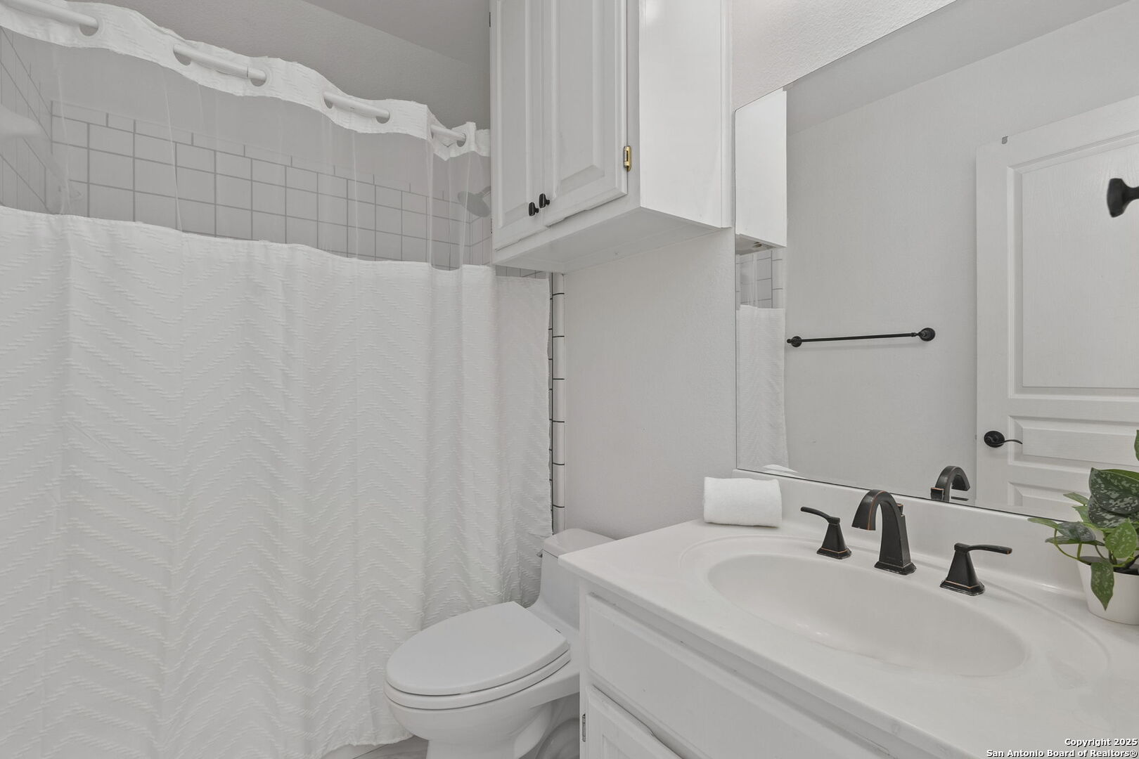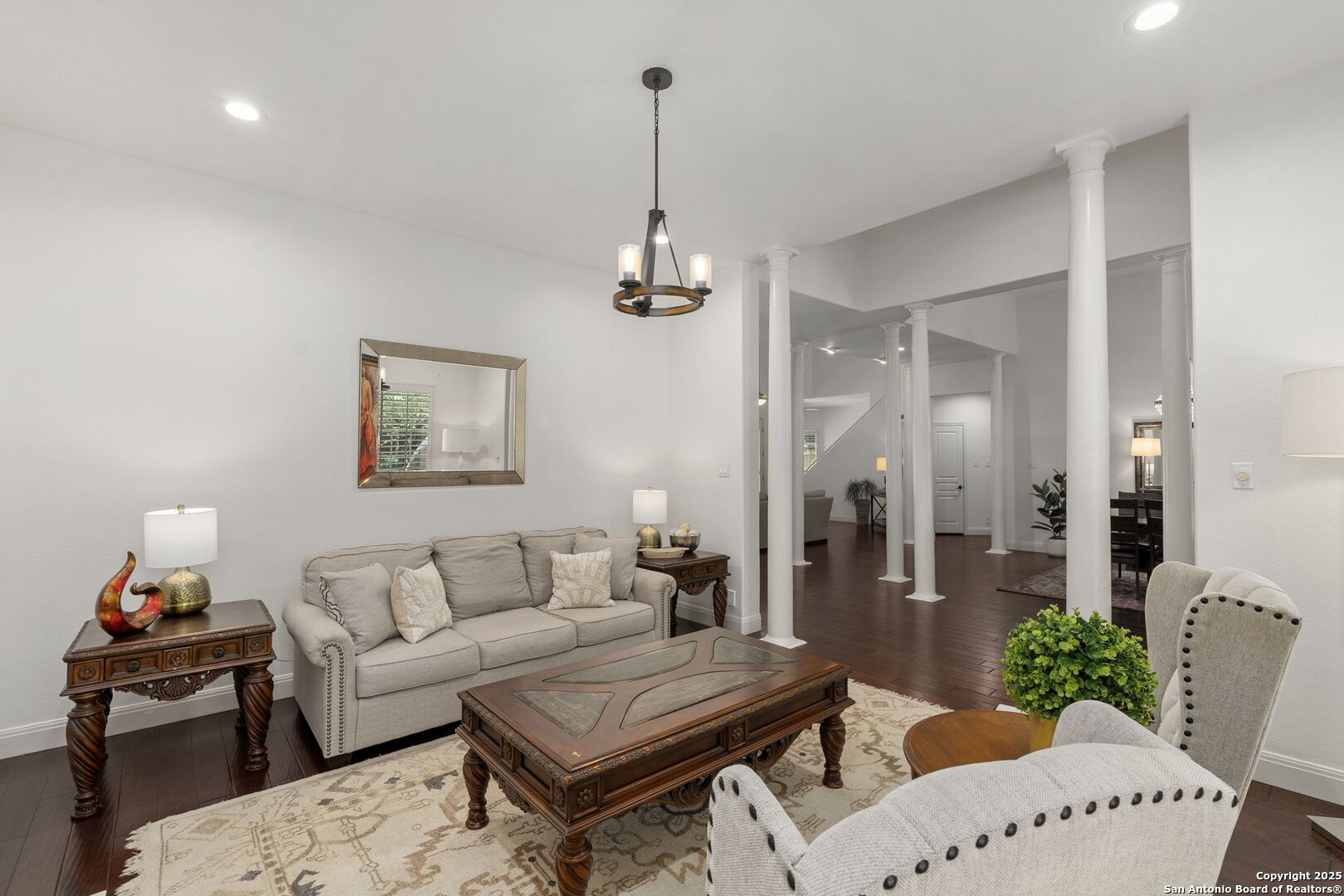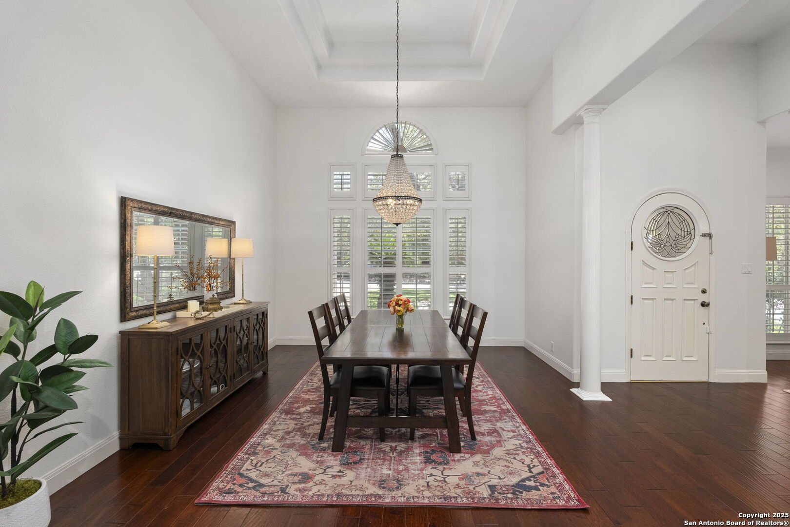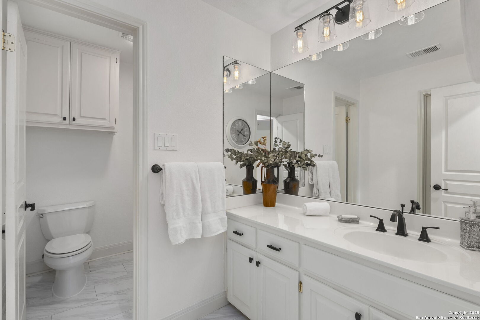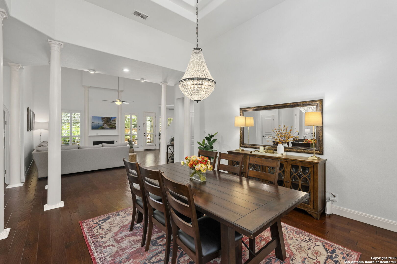 Welcome to this beautifully maintained 4-bedroom, 3.5-bathroom home situated on a spacious corner lot in the guard-gated community of The Fountains at Deerfield. This two-story residence offers a functional and flexible floor plan, with the primary suite conveniently located on the main level. Inside, you'll find warm wood flooring, tall ceilings, classic columns, and two eye-catching fireplaces that add charm and character. Plantation shutters and large windows fill the home with natural light, while the kitchen features marble countertops, ample cabinetry, and a layout designed for both comfort and entertaining. Upstairs includes 3 additional bedrooms, 2 bathrooms, and plenty of storage throughout. One of the bedrooms is currently being used as an office/sitting room. Step into the backyard and enjoy a private outdoor retreat complete with a sparkling pool, mature palm tree, and generous patio space. Ideally located just off Loop 1604, this home offers quick access to nearby shopping, dining, and grocery options-including H-E-B, Target, Whole Foods, Trader Joe's, and more. A rare opportunity to own in a sought-after neighborhood with both style and convenience. Updates include: Roof 2020; HVACs 2020; Pool Reno 2022; Carpet 2025; Insulated Garage Door 2024.