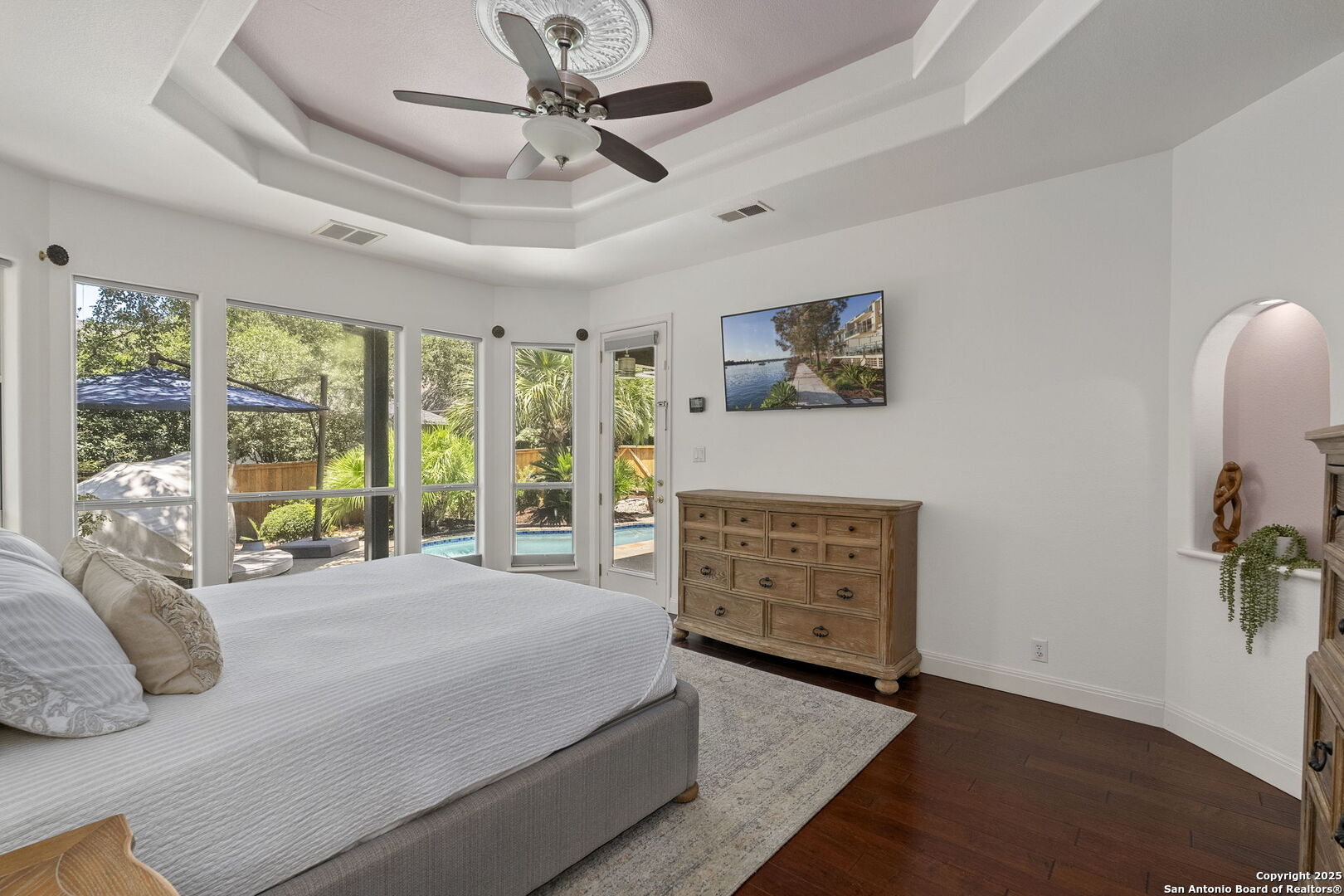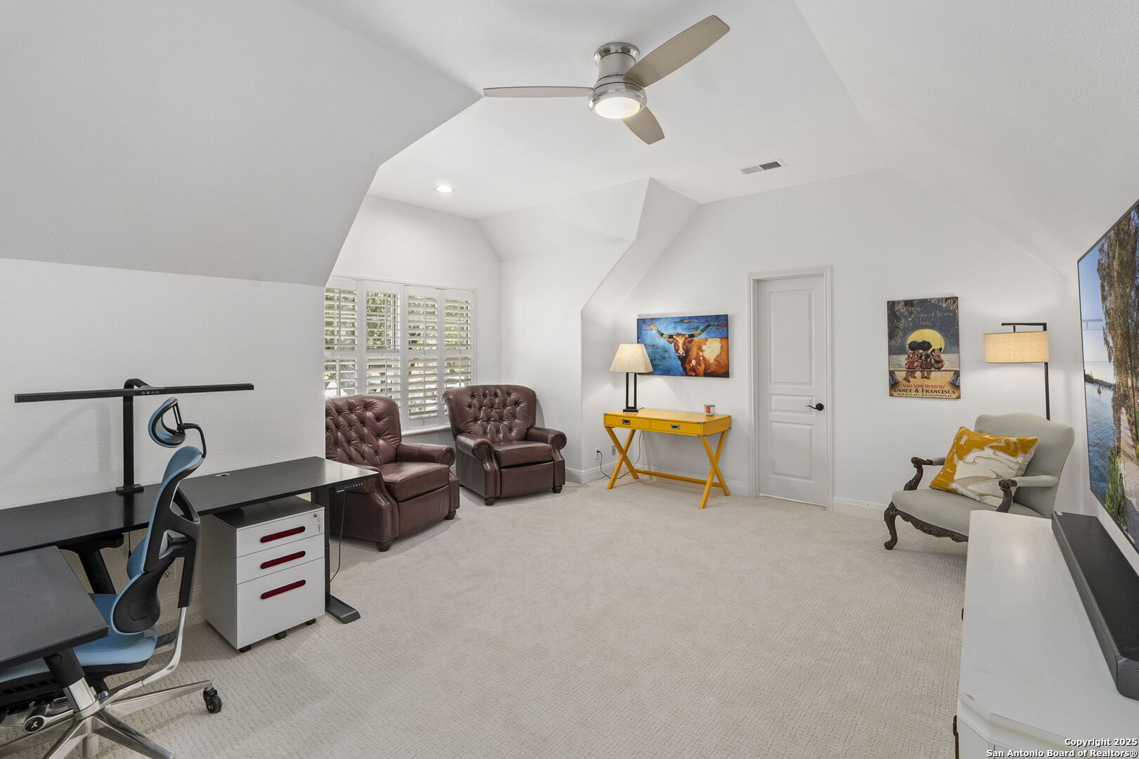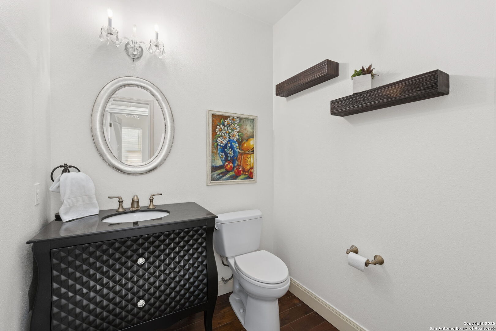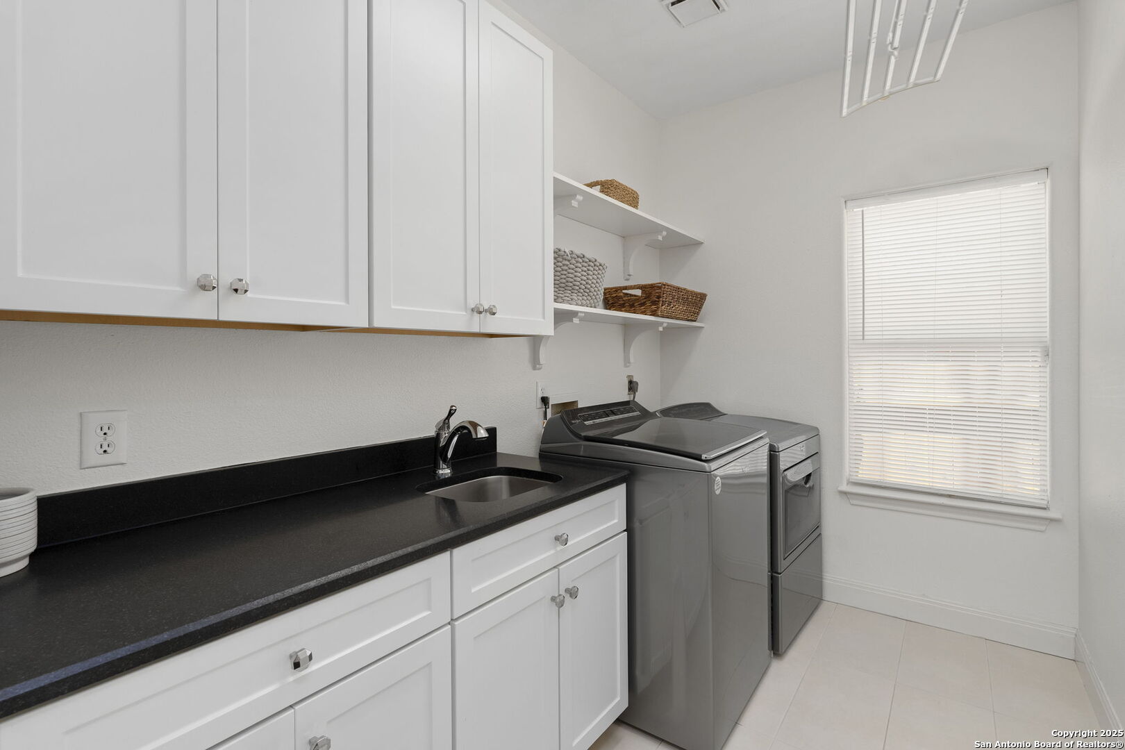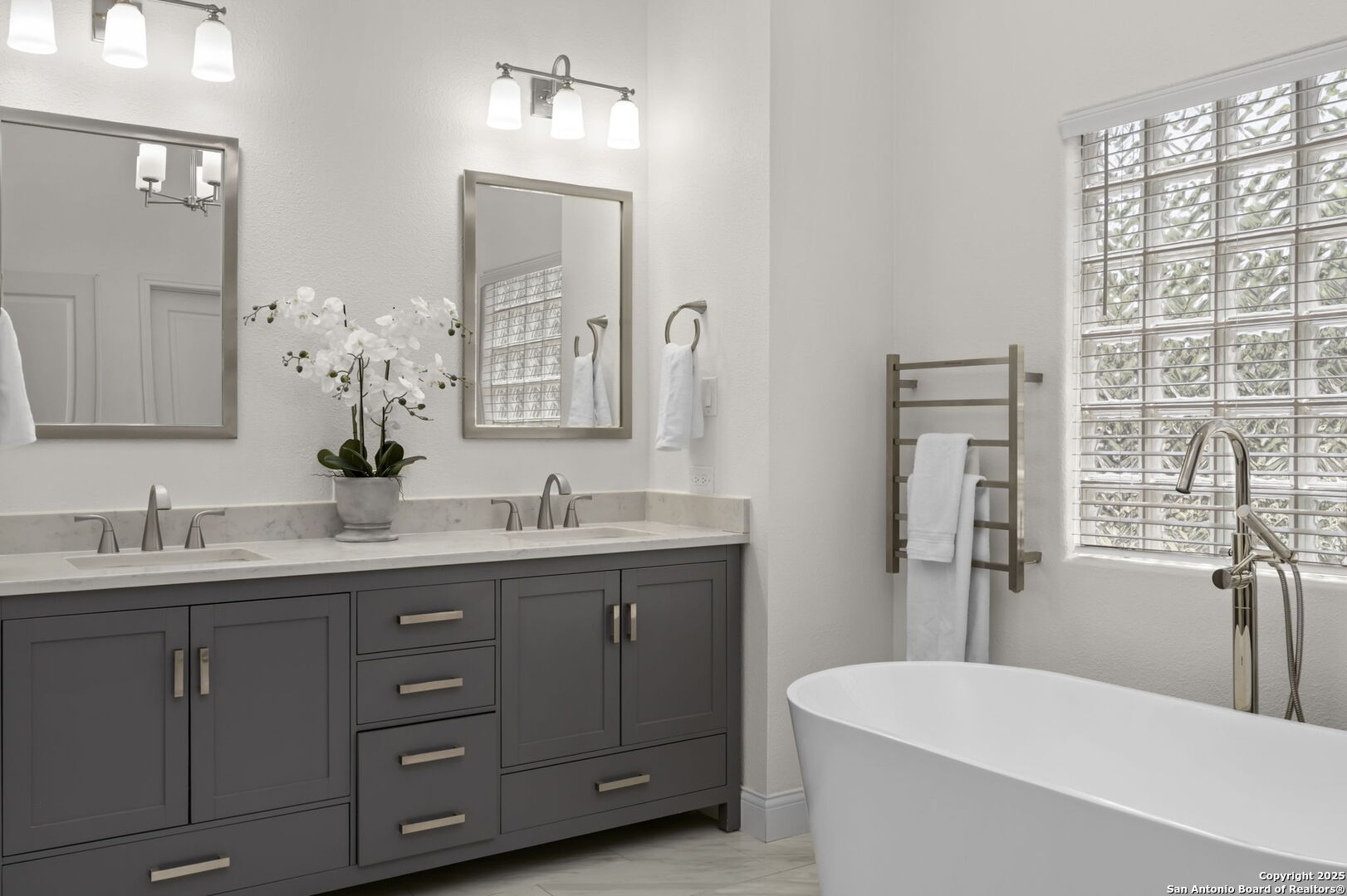 Welcome to this beautifully maintained 4-bedroom, 3.5-bathroom home situated on a spacious corner lot in the guard-gated community of The Fountains at Deerfield. This two-story residence offers a functional and flexible floor plan, with the primary suite conveniently located on the main level. Inside, you'll find warm wood flooring, tall ceilings, classic columns, and two eye-catching fireplaces that add charm and character. Plantation shutters and large windows fill the home with natural light, while the kitchen features marble countertops, ample cabinetry, and a layout designed for both comfort and entertaining. Upstairs includes 3 additional bedrooms, 2 bathrooms, and plenty of storage throughout. One of the bedrooms is currently being used as an office/sitting room. Step into the backyard and enjoy a private outdoor retreat complete with a sparkling pool, mature palm tree, and generous patio space. Ideally located just off Loop 1604, this home offers quick access to nearby shopping, dining, and grocery options-including H-E-B, Target, Whole Foods, Trader Joe's, and more. A rare opportunity to own in a sought-after neighborhood with both style and convenience. Updates include: Roof 2020; HVACs 2020; Pool Reno 2022; Carpet 2025; Insulated Garage Door 2024.