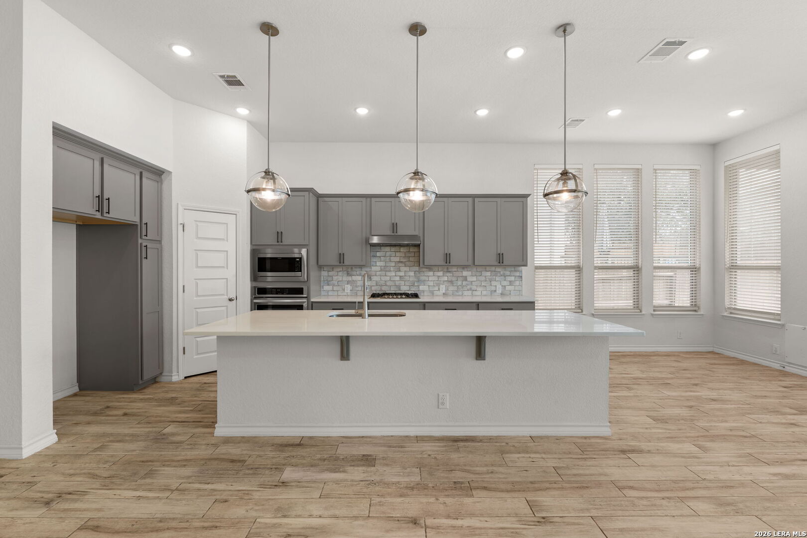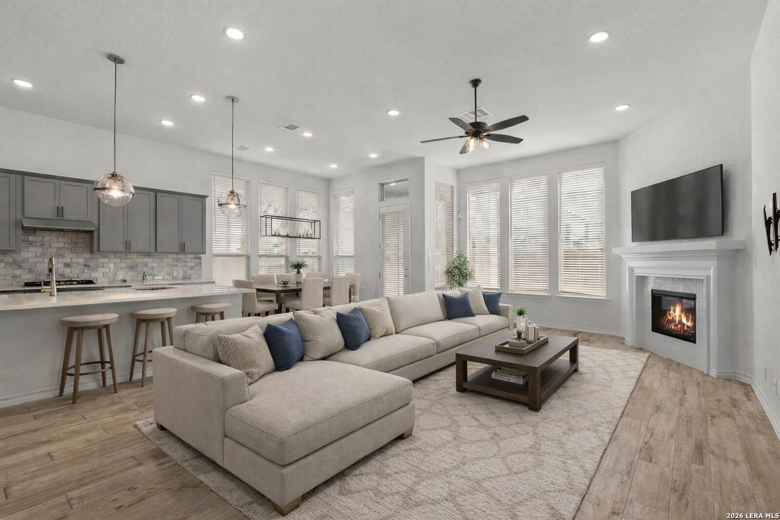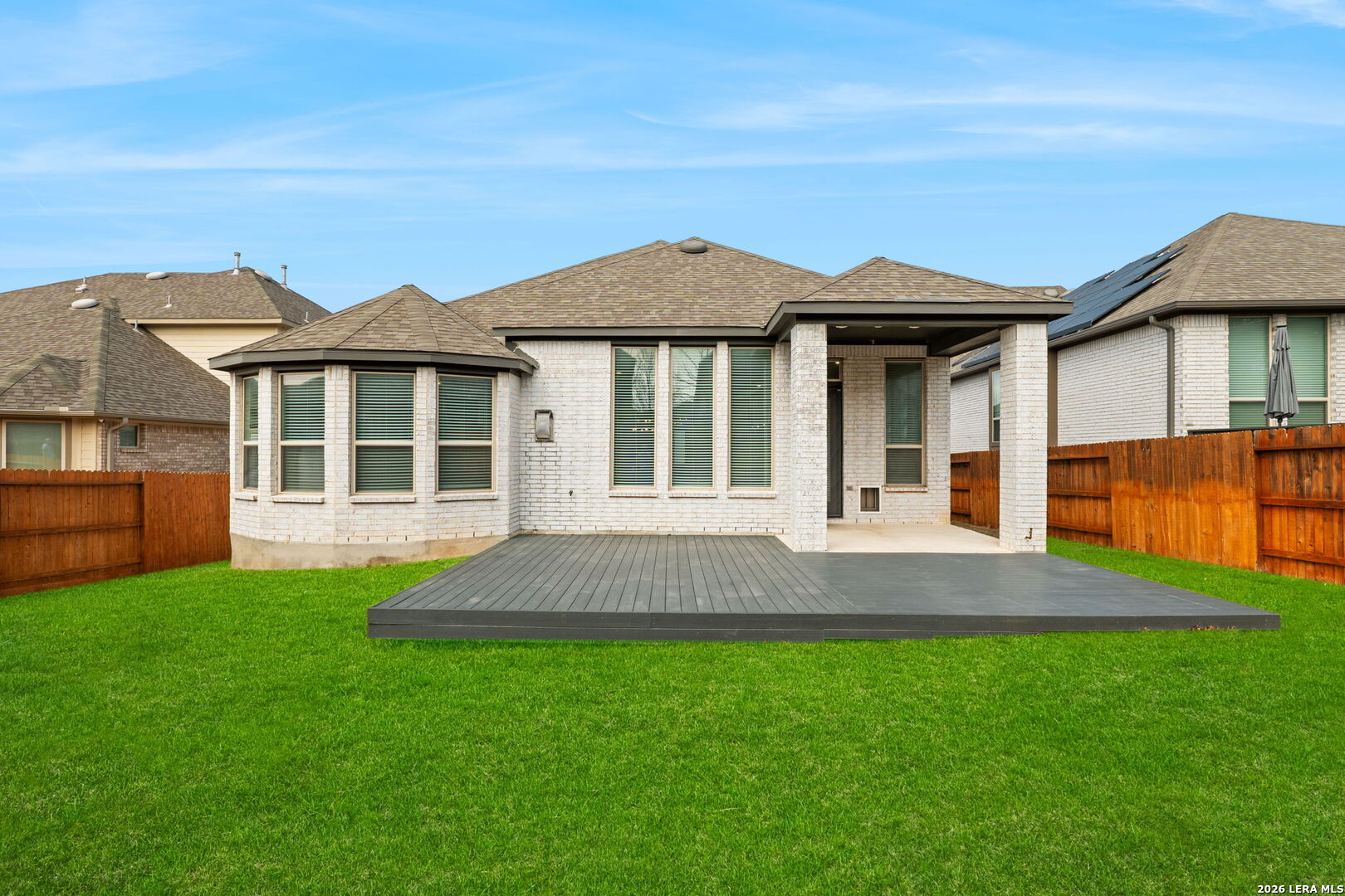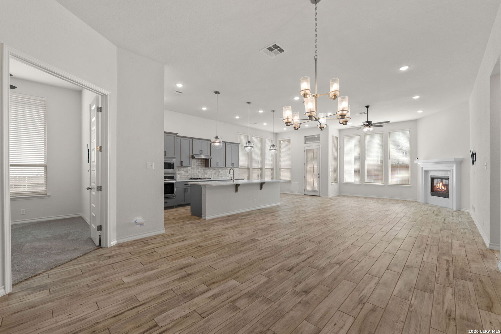 Beautifully maintained single story home offering an elegant blend of comfort and style. Thoughtfully designed with high ceilings, tile wood style flooring, arched entryways, and an open floor plan enhanced by recessed lighting throughout. A stunning chandelier at the entrance sets a refined tone from the moment you step inside. The kitchen is a true centerpiece, featuring a large kitchen island with breakfast bar, quartz countertops, stainless steel built in oven and microwave, gas cooktop, and a striking stone tile backsplash that adds timeless appeal. The living area flows seamlessly and includes a gas log fireplace, creating a warm and inviting atmosphere. This home offers four bedrooms, with two of the additional bedrooms having their own bathroom! Plus a flex room ideal for a home office, creative space, or additional living area. The primary suite showcases graceful bay windows and a spacious bath with garden tub, separate shower, double vanity, and an oversized walk in closet. Outdoor living is equally impressive with a covered patio and extended deck, perfect for relaxing or entertaining. Notable upgrades include a water softener, security cameras that convey, rain gutters, epoxied garage with storage racks, tankless water heater, RO system, brand new carpet and a Trane XR A C unit with a whole house air purifier. Conveniently located in San Antonio within the award winning Northside Independent School District and zoned to William J Brennan High School. Harmony School of Science is within walking distance and just opened up a middle/highschool. They currently have 2 schools with grades PK-9th. Enjoy a short commute to Northwest Vista College, SeaWorld San Antonio, and Lackland Air Force Base with easy access to Loop 1604.