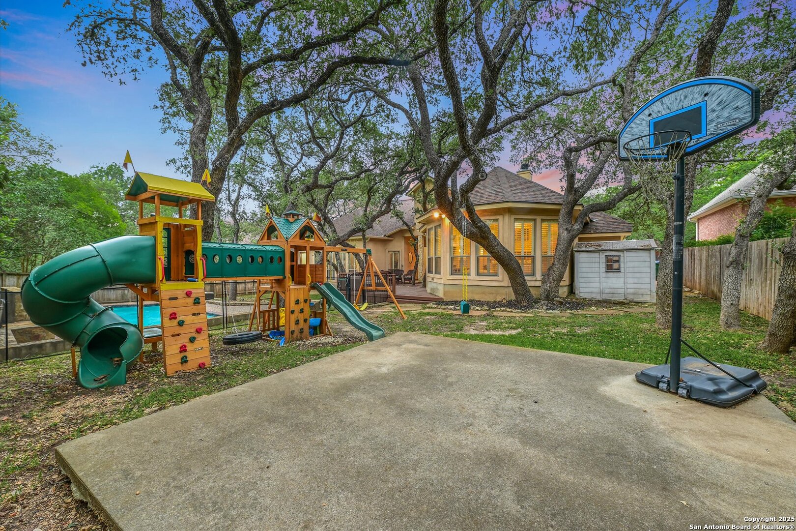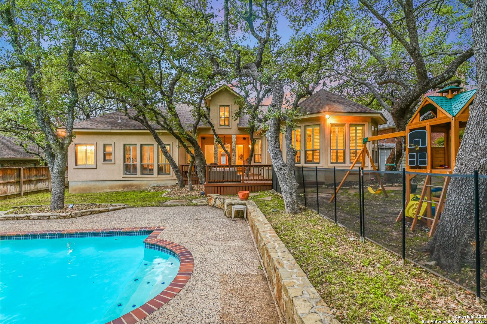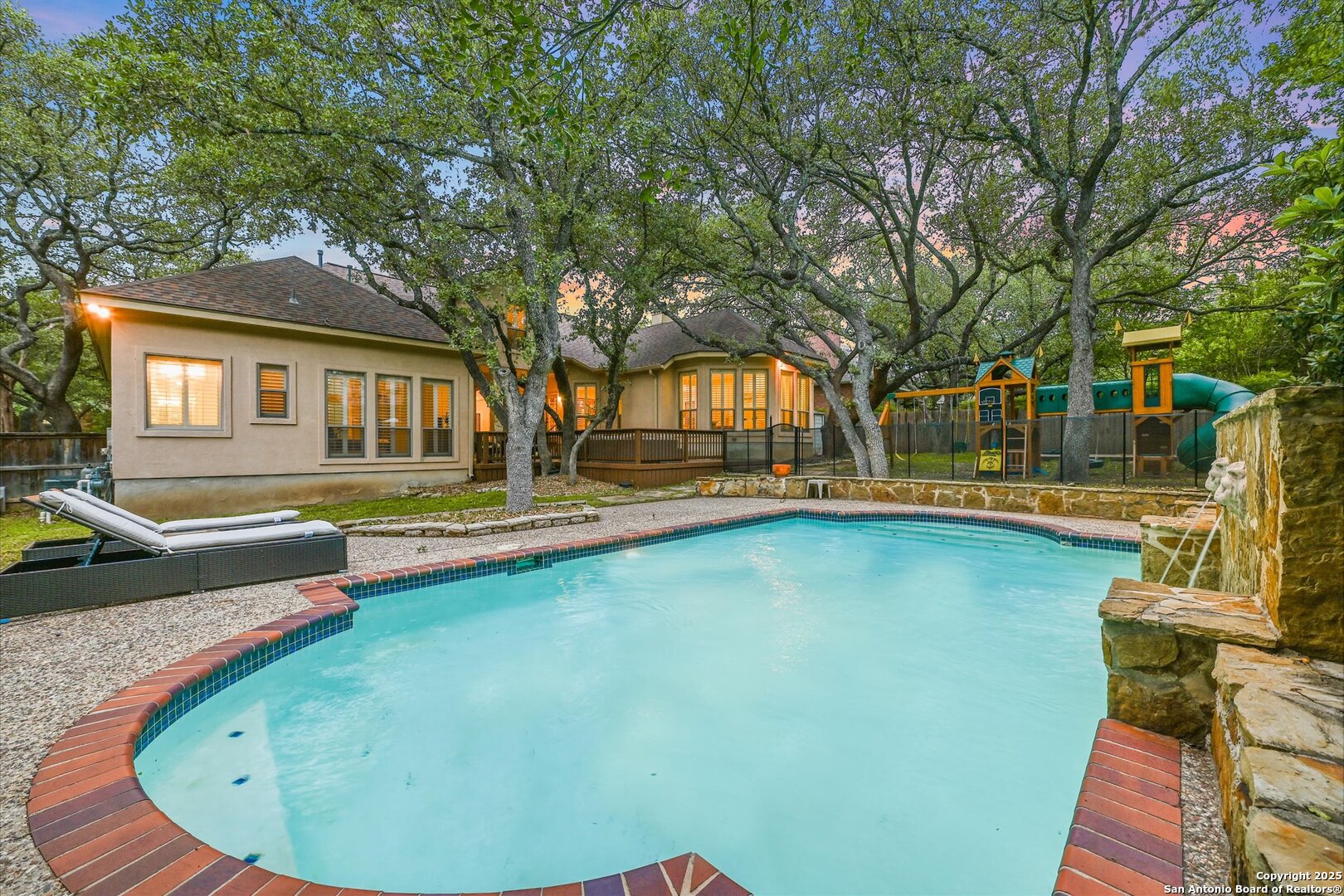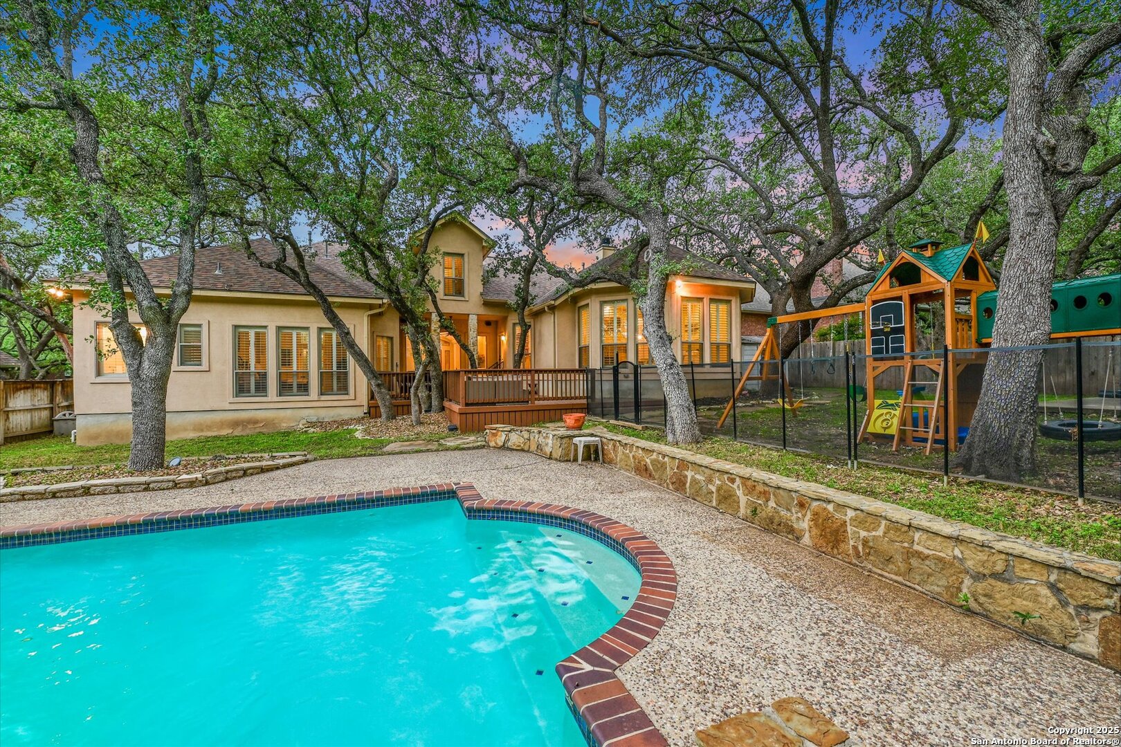 Welcome to 17326 Fountain Bluff, a beautifully maintained home in the gated community of The Fountains of Deerfield. Ideally located near excellent schools, shopping, and dining, this property combines everyday comfort with thoughtful upgrades and standout amenities. This mostly one-story layout offers four bedrooms and two and a half baths, with a spacious upstairs game room and private office-perfect for work, play, or extra living space. The home features an updated primary bathroom, designed with style and functionality in mind. Step outside and enjoy an expansive backyard built for relaxation and fun, featuring a playground with a playscape, plenty of green space, and a beautiful pool-ideal for gatherings or quiet afternoons at home. Gas lanterns add a charming and classic touch to the exterior, creating warm curb appeal in the evenings. This is a rare opportunity to own a move-in ready home in one of North Central San Antonio's most sought-after gated communities