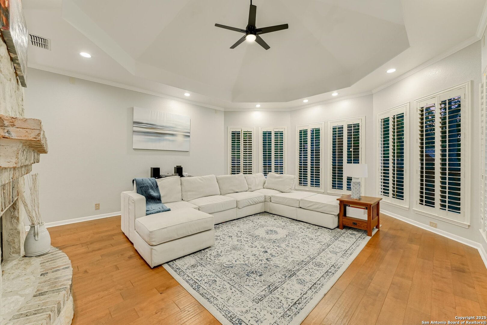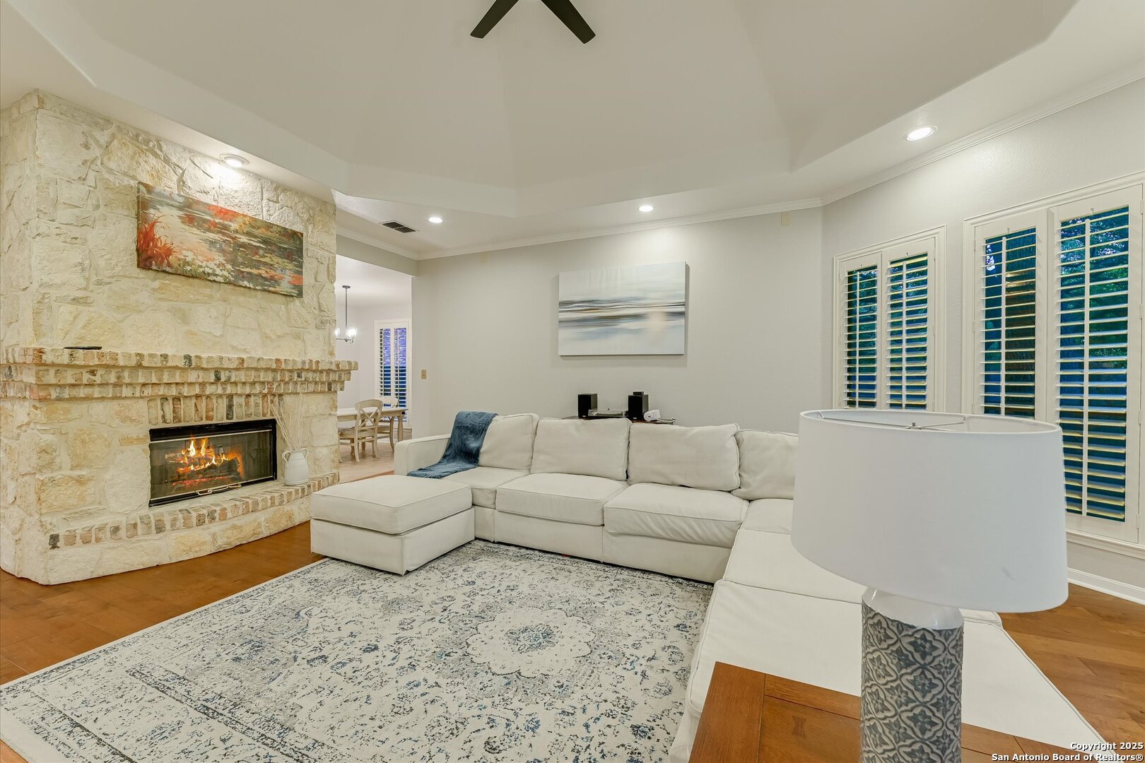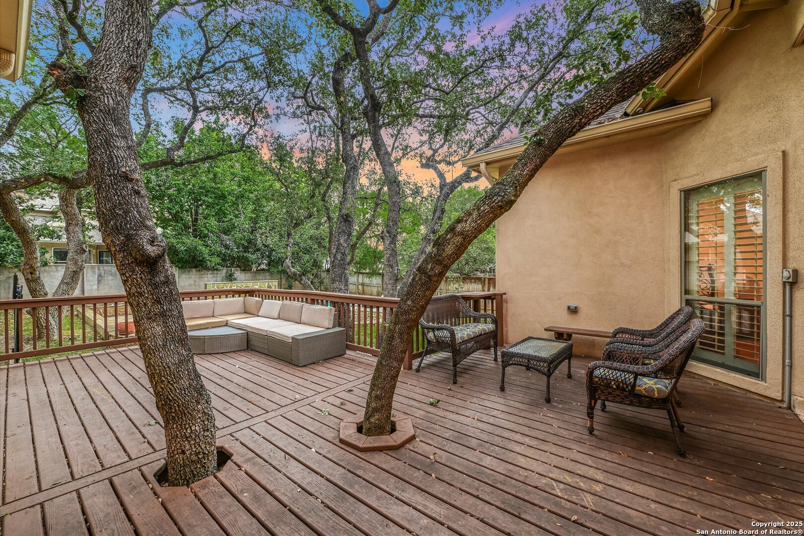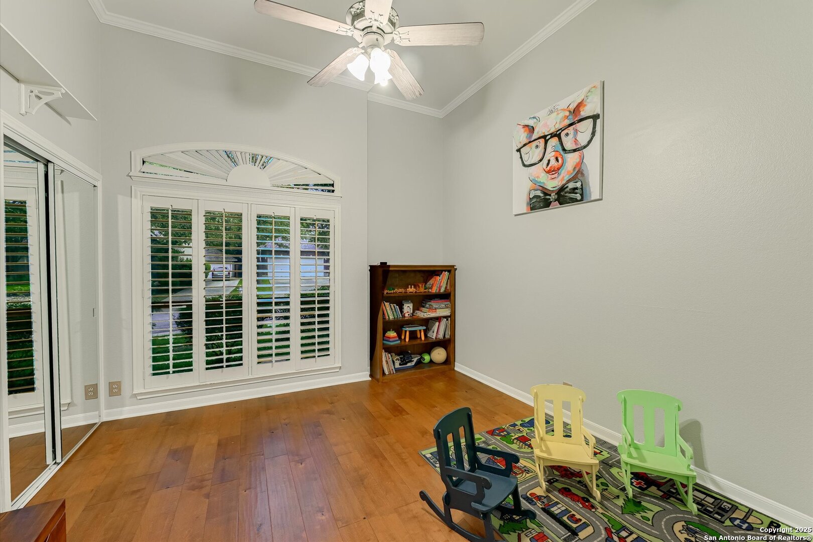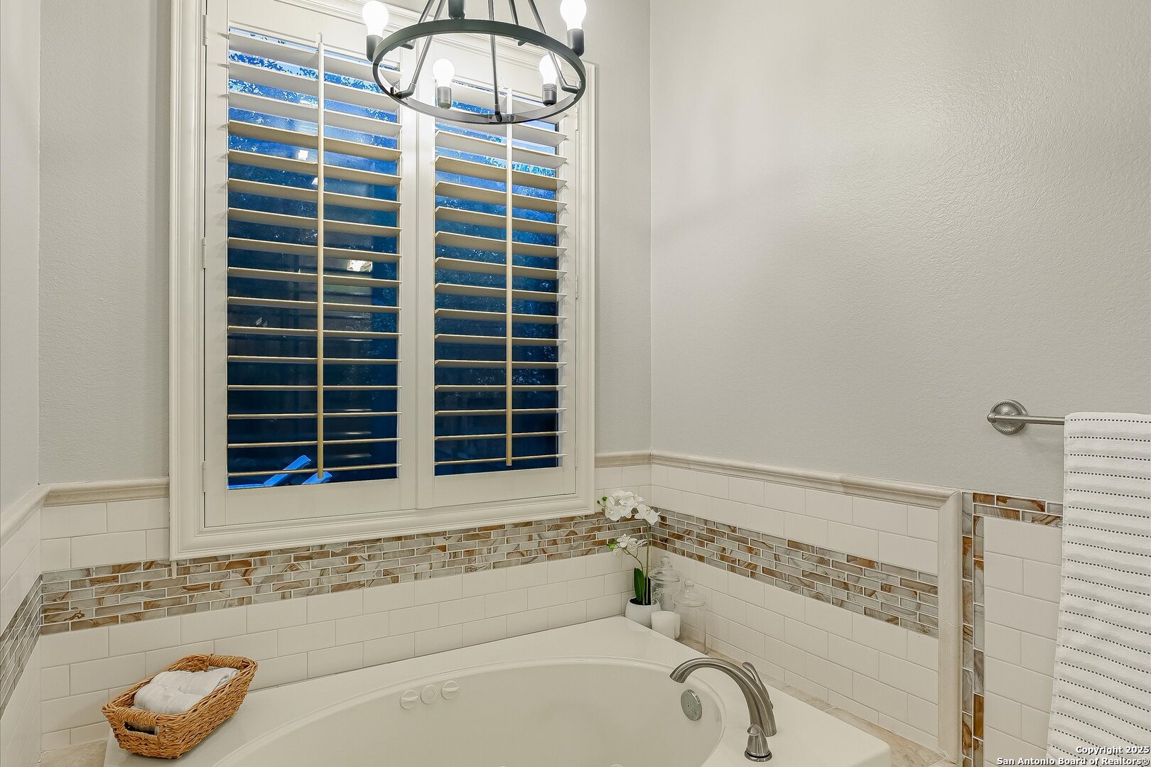 Welcome to 17326 Fountain Bluff, a beautifully maintained home in the gated community of The Fountains of Deerfield. Ideally located near excellent schools, shopping, and dining, this property combines everyday comfort with thoughtful upgrades and standout amenities. This mostly one-story layout offers four bedrooms and two and a half baths, with a spacious upstairs game room and private office-perfect for work, play, or extra living space. The home features an updated primary bathroom, designed with style and functionality in mind. Step outside and enjoy an expansive backyard built for relaxation and fun, featuring a playground with a playscape, plenty of green space, and a beautiful pool-ideal for gatherings or quiet afternoons at home. Gas lanterns add a charming and classic touch to the exterior, creating warm curb appeal in the evenings. This is a rare opportunity to own a move-in ready home in one of North Central San Antonio's most sought-after gated communities