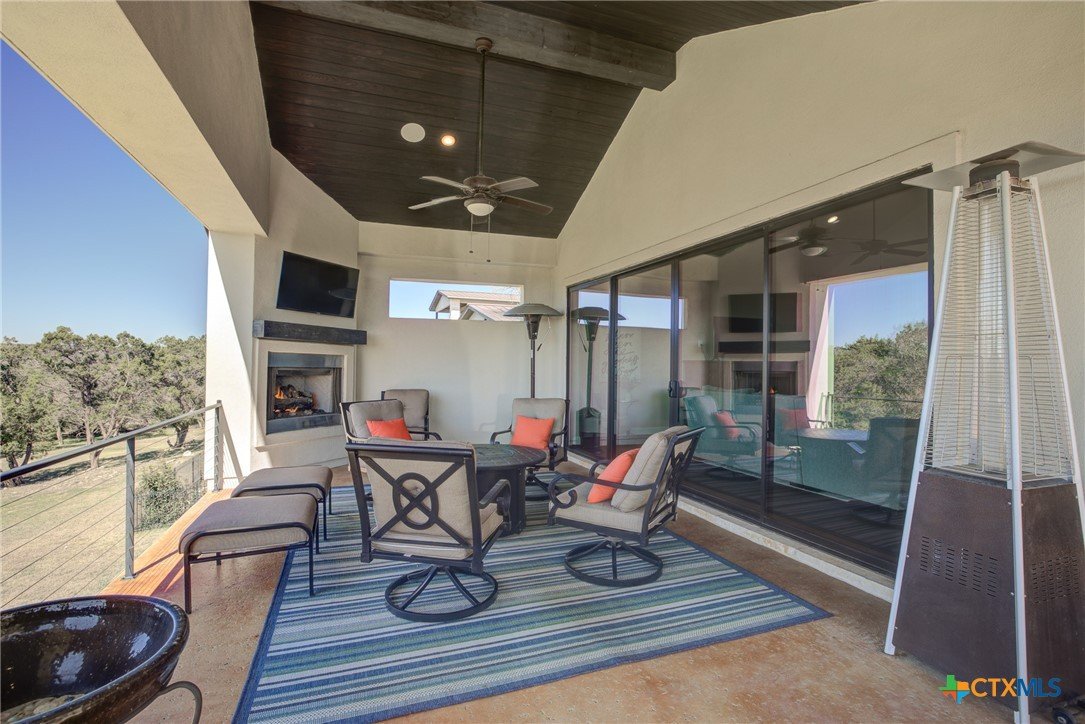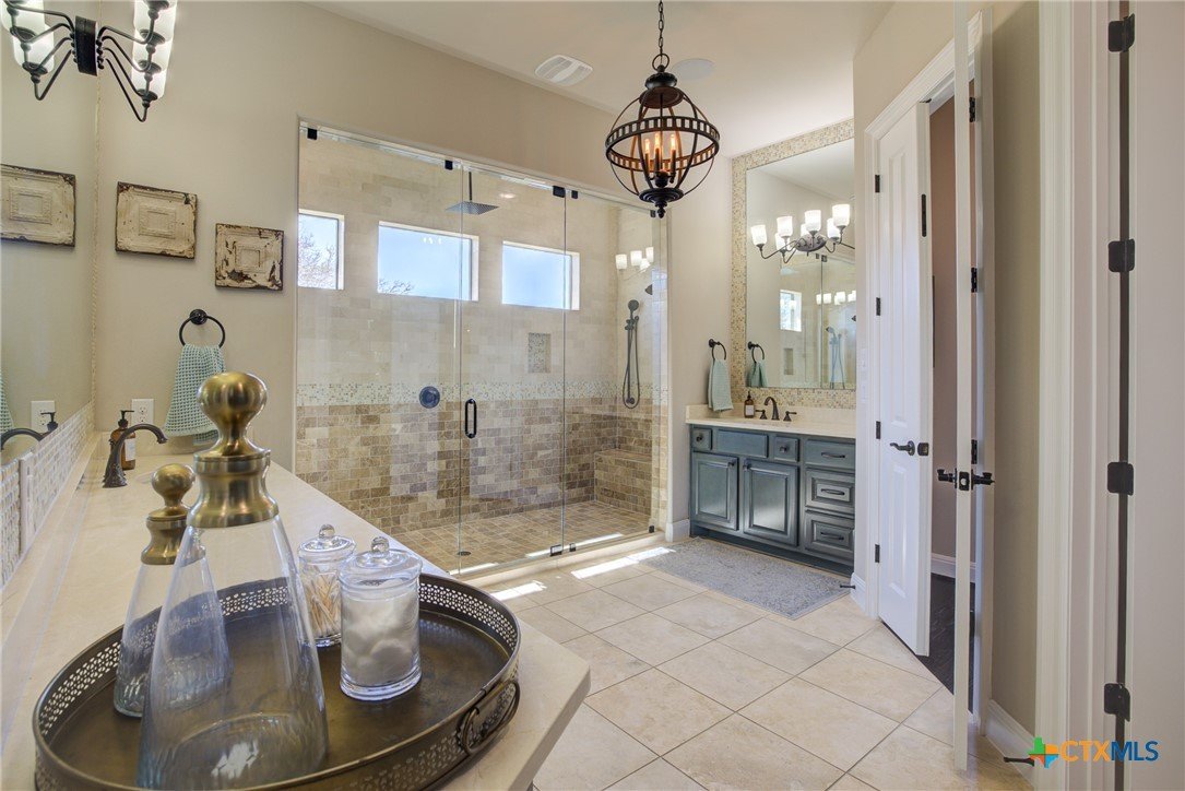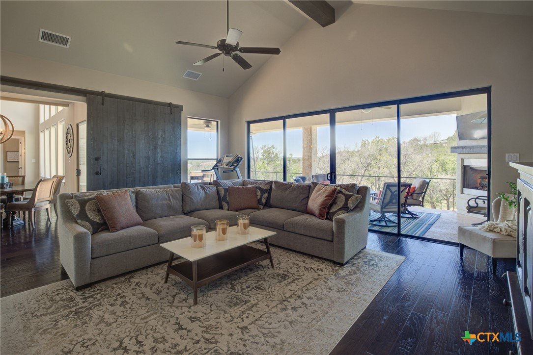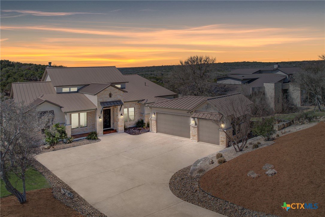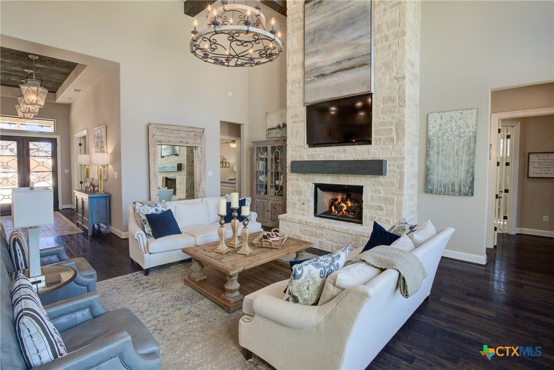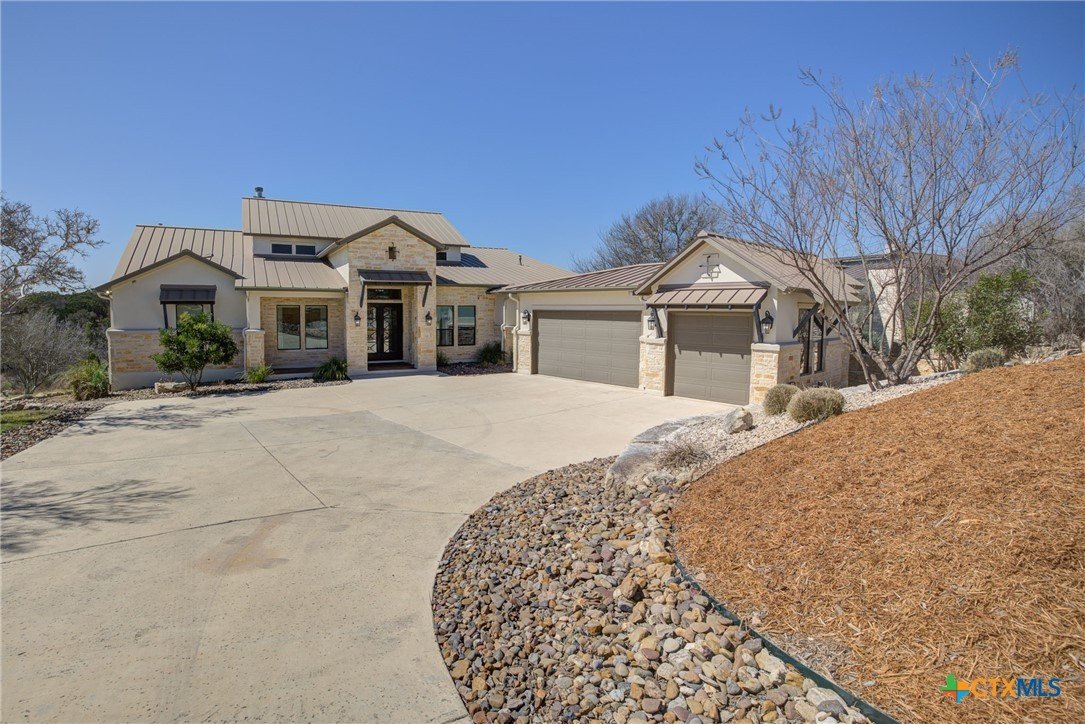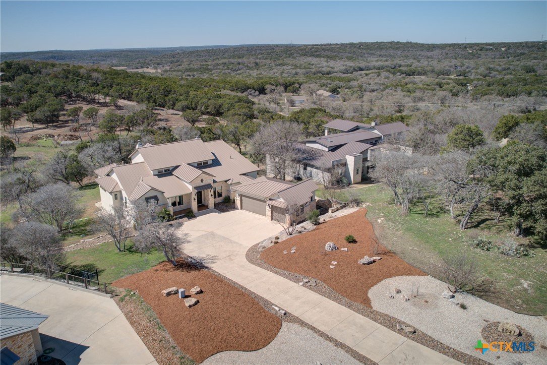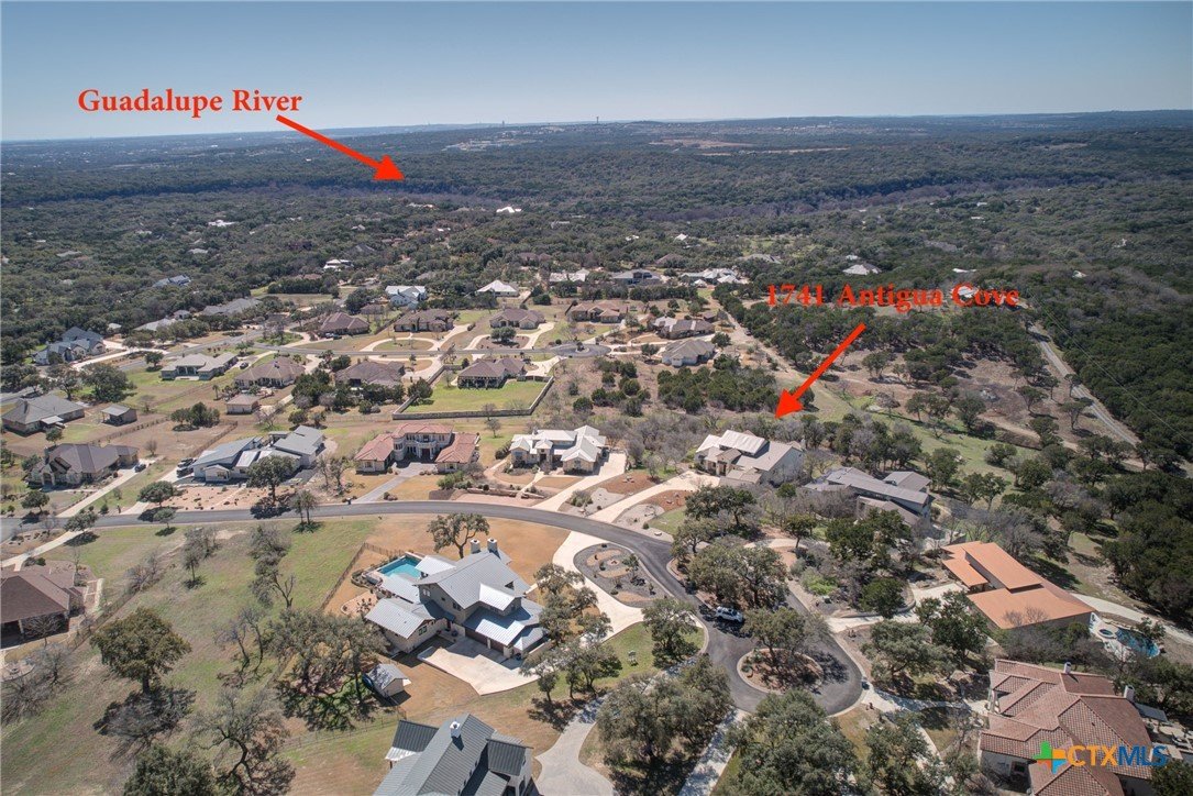 Welcome to 1741 Antigua Cove, a stunning custom home nestled in the highly sought-after River Place at Gruene, one of New Braunfels' most desirable neighborhoods. Just minutes from the charming town of Gruene, yet outside city limits to keep your taxes low, this property offers the perfect blend of convenience and tranquility. This immaculate one-story home is designed for modern living with every detail carefully crafted. Featuring four spacious bedrooms, each with its own en suite bathroom and walk-in closet, plus a dedicated office and expansive bonus room with custom barn door, there's plenty of space for all your needs. The chef's kitchen is a true standout, showcasing custom cabinetry, a double oven, gas cooking, and a pot filler-perfect for cooking and entertaining. A unique touch in the living room is the hidden TV, cleverly concealed behind a piece of artwork that slides away at the push of a button, eliminating the need for the TV to be the focus of the room. Every inch of this home is immaculate, from the oversized laundry room to the stunning lighting fixtures and gorgeous hardwood and tile floors. The thoughtful layout ensures maximum privacy for the bedrooms while still fostering a warm, inviting atmosphere throughout the home. Set on 1.48 acres in a quiet cul-de-sac, this home offers breathtaking, panoramic views off of an expansive 800 sf covered outside living area with fireplace and outdoor kitchen. As a resident of River Place at Gruene, you'll have access to a private Guadalupe River park, providing a perfect place to relax and enjoy the natural beauty of the area without having to fight the crowds.This home has it all-luxury, privacy, and unparalleled charm. Come see it for yourself!