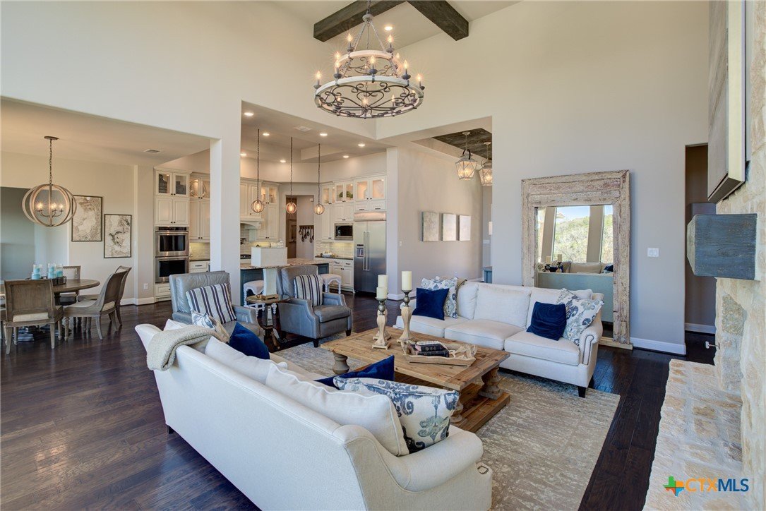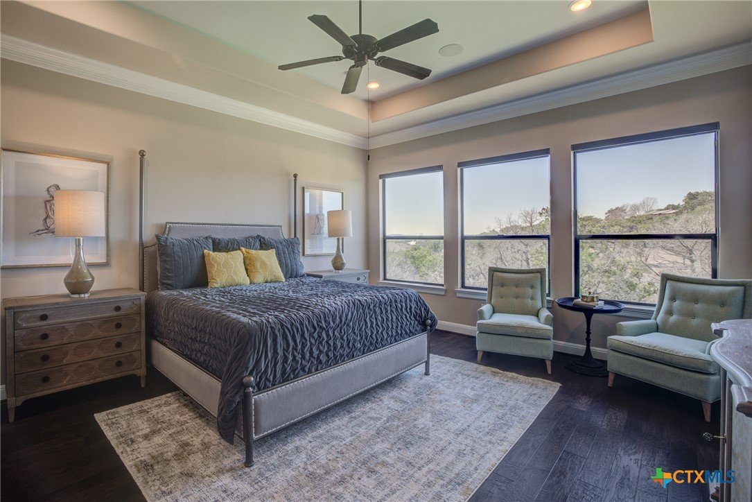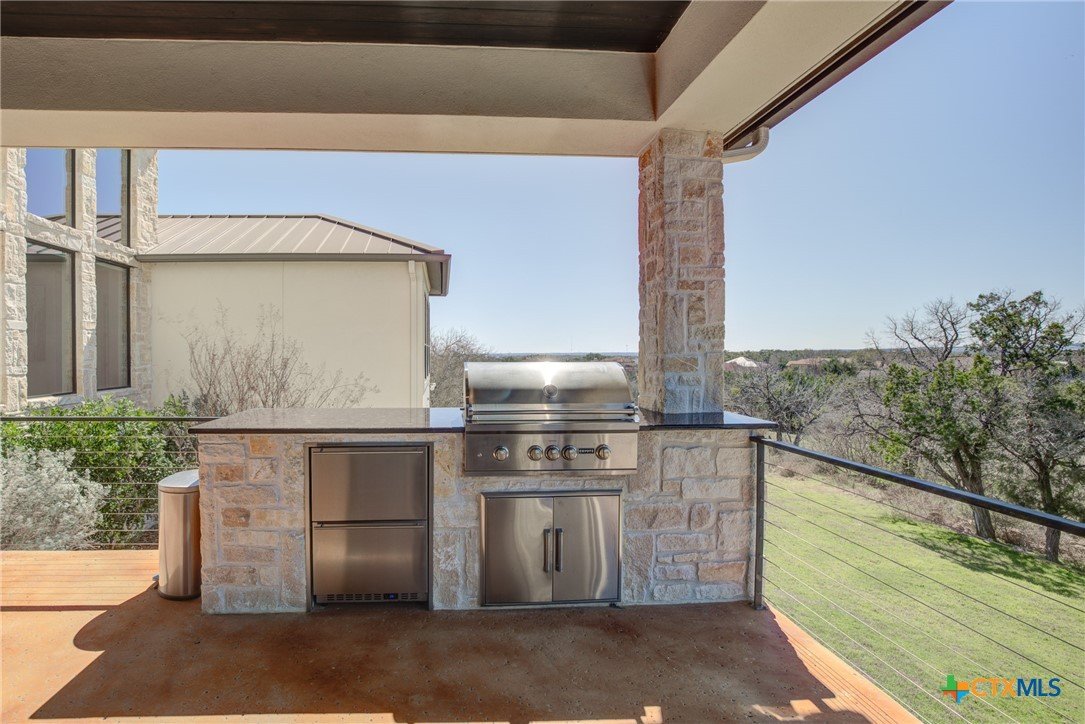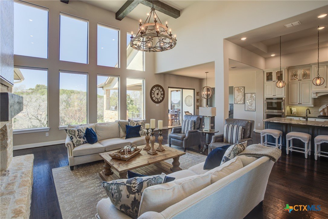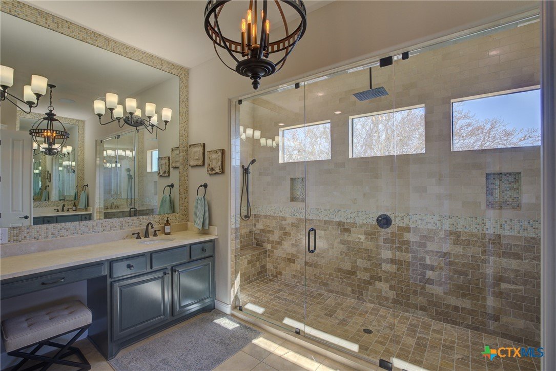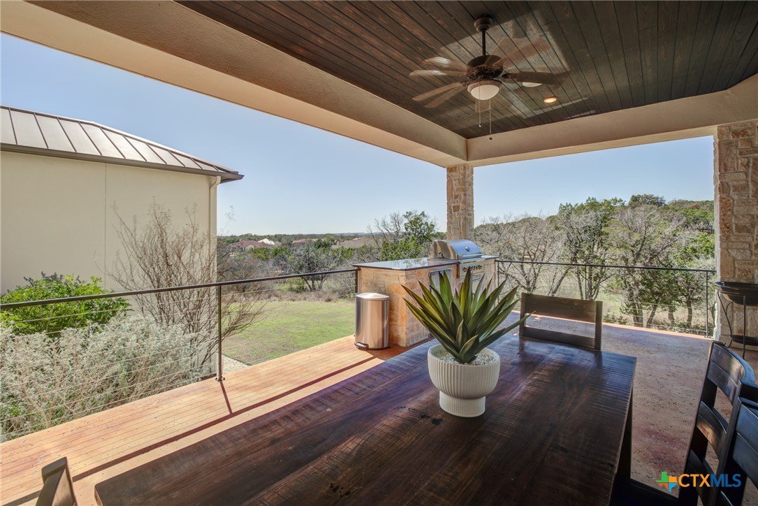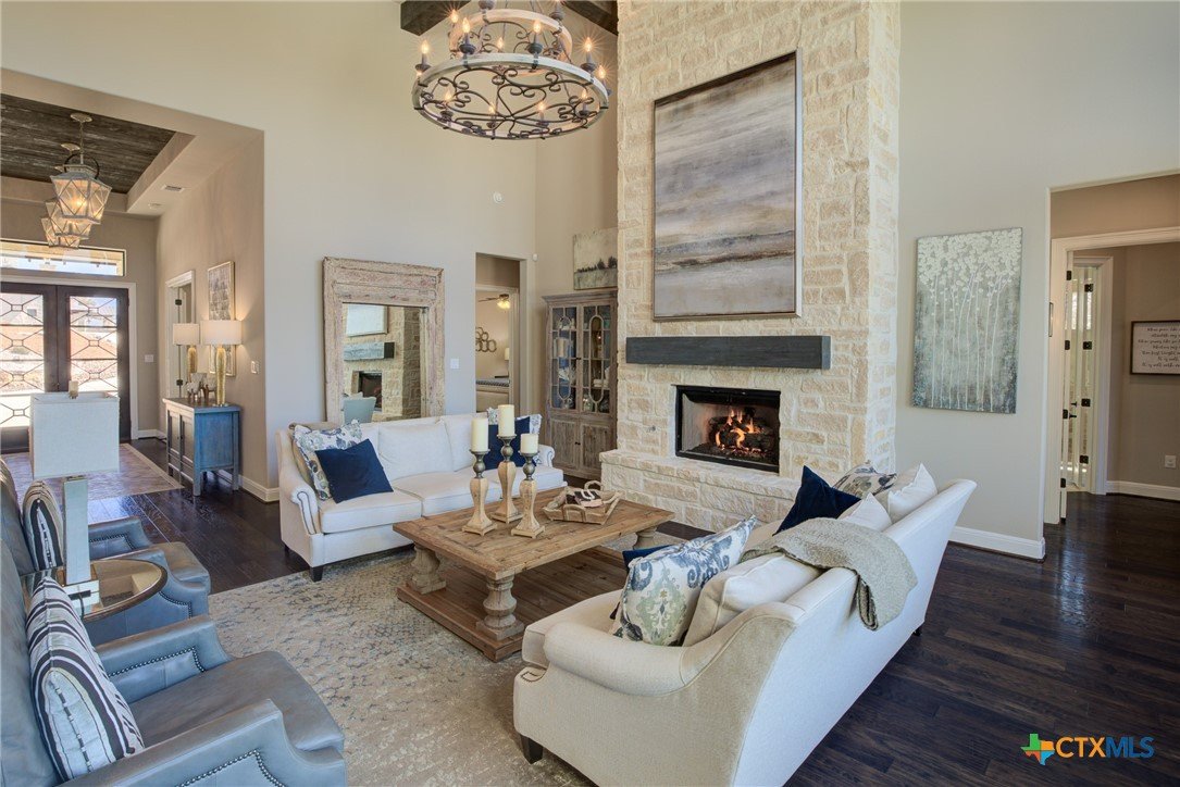 Welcome to 1741 Antigua Cove, a stunning custom home nestled in the highly sought-after River Place at Gruene, one of New Braunfels' most desirable neighborhoods. Just minutes from the charming town of Gruene, yet outside city limits to keep your taxes low, this property offers the perfect blend of convenience and tranquility. This immaculate one-story home is designed for modern living with every detail carefully crafted. Featuring four spacious bedrooms, each with its own en suite bathroom and walk-in closet, plus a dedicated office and expansive bonus room with custom barn door, there's plenty of space for all your needs. The chef's kitchen is a true standout, showcasing custom cabinetry, a double oven, gas cooking, and a pot filler-perfect for cooking and entertaining. A unique touch in the living room is the hidden TV, cleverly concealed behind a piece of artwork that slides away at the push of a button, eliminating the need for the TV to be the focus of the room. Every inch of this home is immaculate, from the oversized laundry room to the stunning lighting fixtures and gorgeous hardwood and tile floors. The thoughtful layout ensures maximum privacy for the bedrooms while still fostering a warm, inviting atmosphere throughout the home. Set on 1.48 acres in a quiet cul-de-sac, this home offers breathtaking, panoramic views off of an expansive 800 sf covered outside living area with fireplace and outdoor kitchen. As a resident of River Place at Gruene, you'll have access to a private Guadalupe River park, providing a perfect place to relax and enjoy the natural beauty of the area without having to fight the crowds.This home has it all-luxury, privacy, and unparalleled charm. Come see it for yourself!