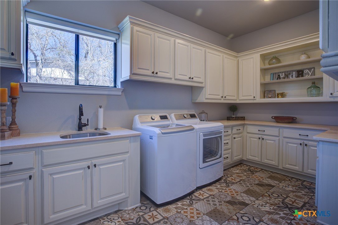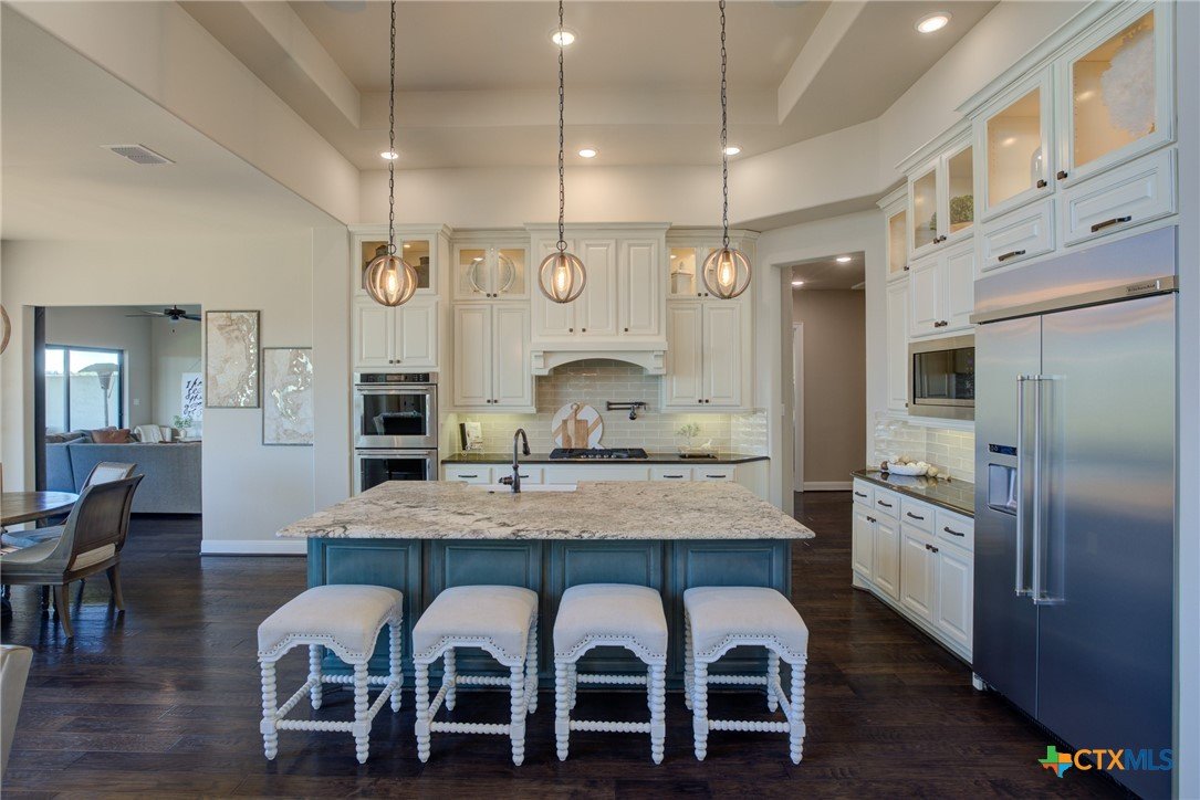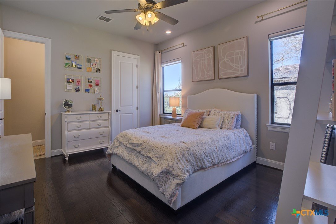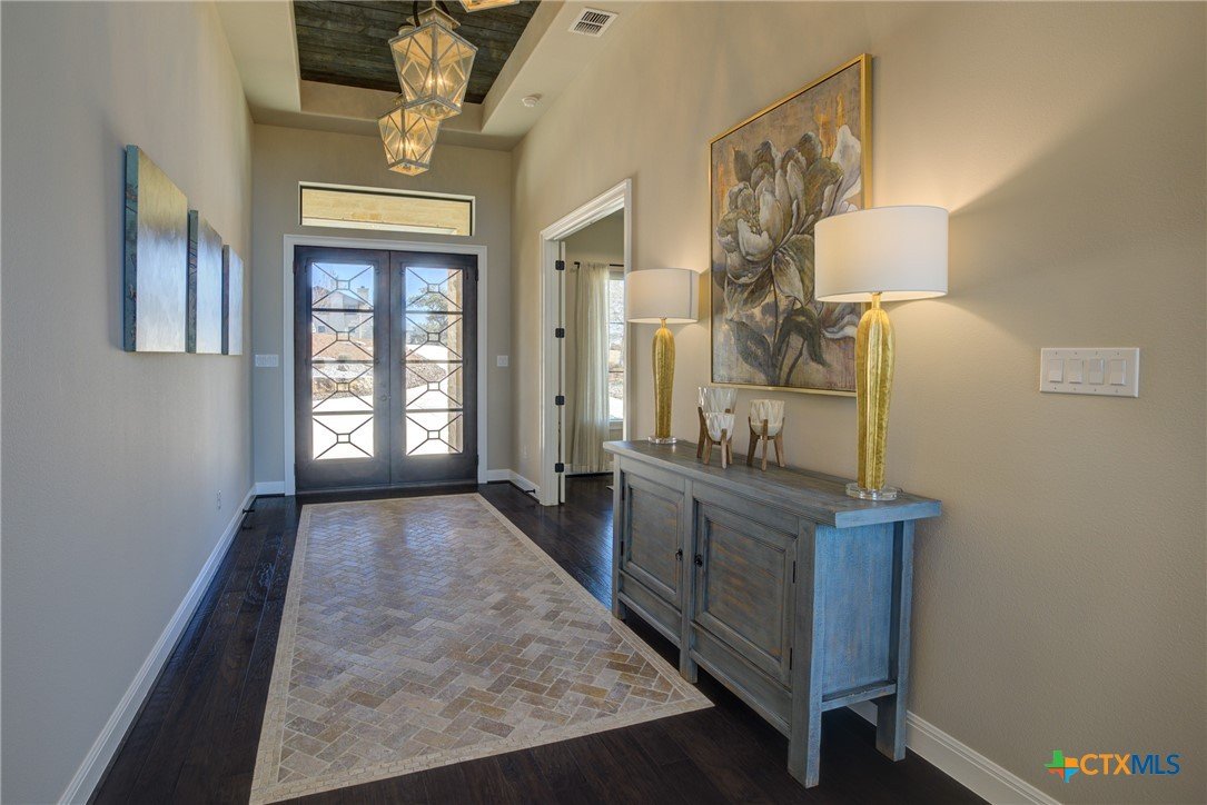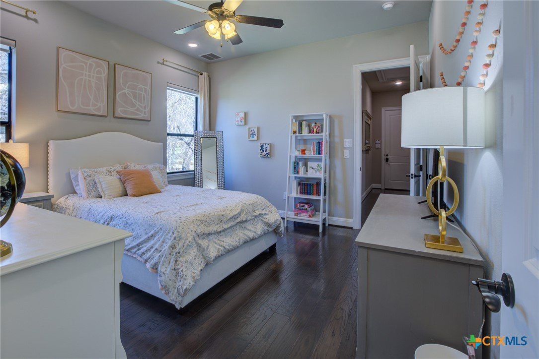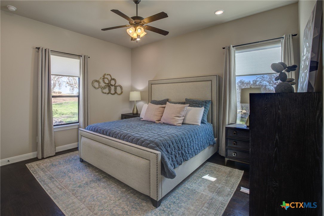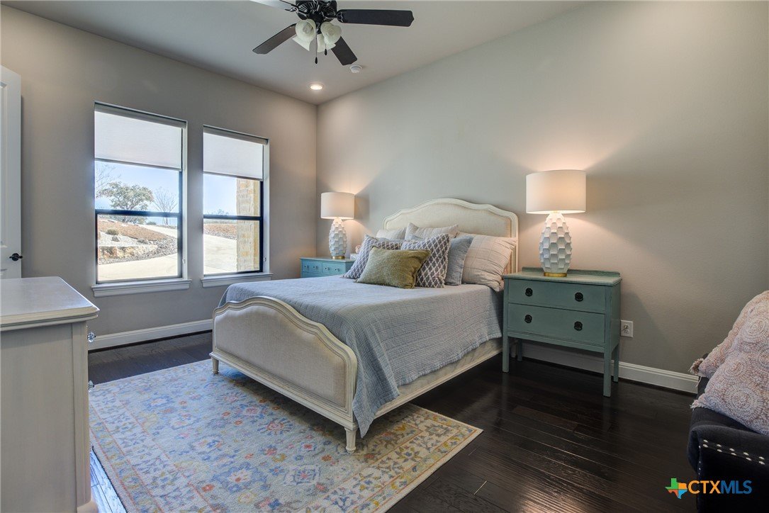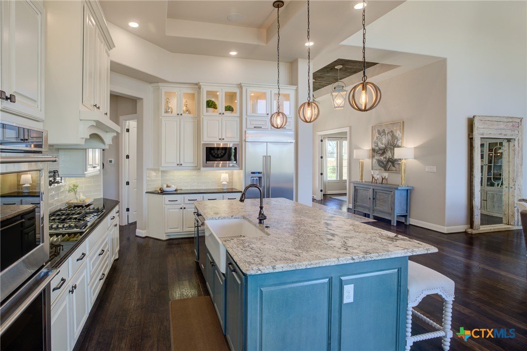 Welcome to 1741 Antigua Cove, a stunning custom home nestled in the highly sought-after River Place at Gruene, one of New Braunfels' most desirable neighborhoods. Just minutes from the charming town of Gruene, yet outside city limits to keep your taxes low, this property offers the perfect blend of convenience and tranquility. This immaculate one-story home is designed for modern living with every detail carefully crafted. Featuring four spacious bedrooms, each with its own en suite bathroom and walk-in closet, plus a dedicated office and expansive bonus room with custom barn door, there's plenty of space for all your needs. The chef's kitchen is a true standout, showcasing custom cabinetry, a double oven, gas cooking, and a pot filler-perfect for cooking and entertaining. A unique touch in the living room is the hidden TV, cleverly concealed behind a piece of artwork that slides away at the push of a button, eliminating the need for the TV to be the focus of the room. Every inch of this home is immaculate, from the oversized laundry room to the stunning lighting fixtures and gorgeous hardwood and tile floors. The thoughtful layout ensures maximum privacy for the bedrooms while still fostering a warm, inviting atmosphere throughout the home. Set on 1.48 acres in a quiet cul-de-sac, this home offers breathtaking, panoramic views off of an expansive 800 sf covered outside living area with fireplace and outdoor kitchen. As a resident of River Place at Gruene, you'll have access to a private Guadalupe River park, providing a perfect place to relax and enjoy the natural beauty of the area without having to fight the crowds.This home has it all-luxury, privacy, and unparalleled charm. Come see it for yourself!