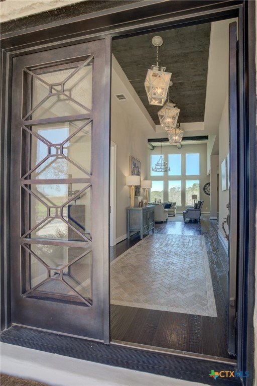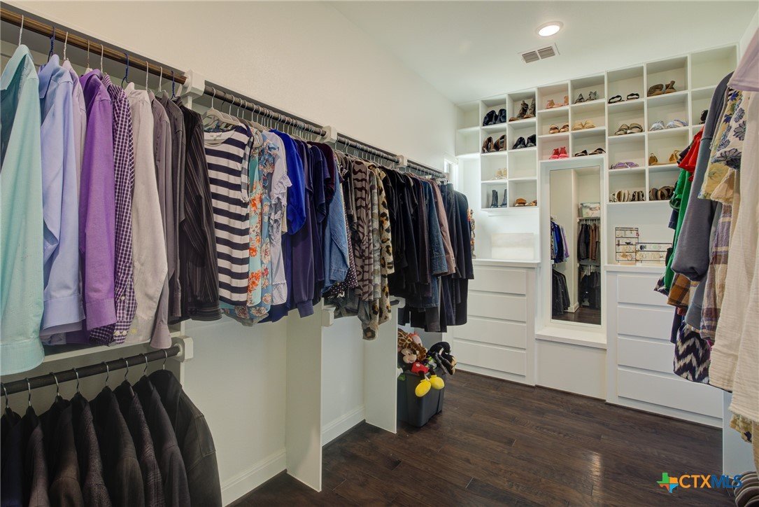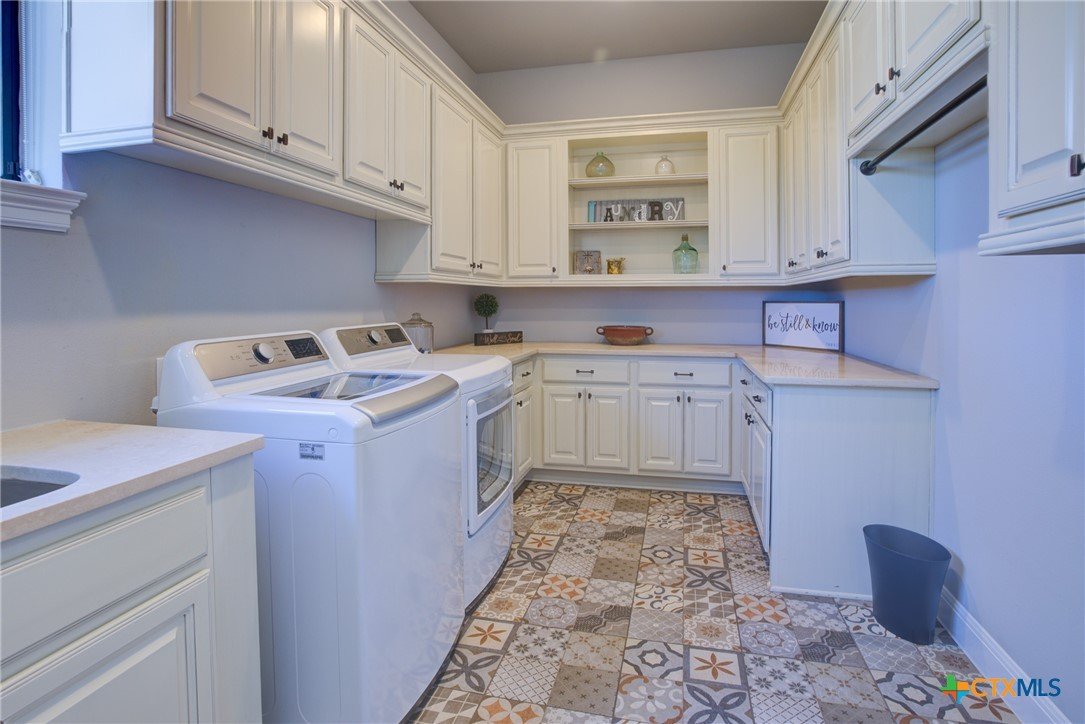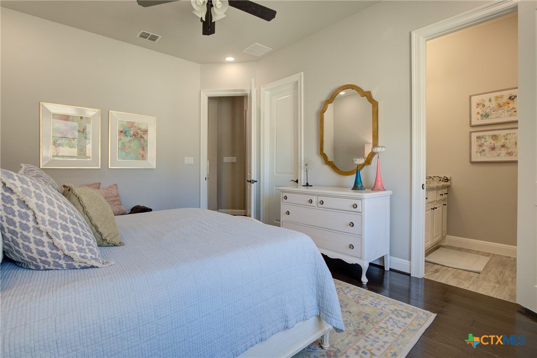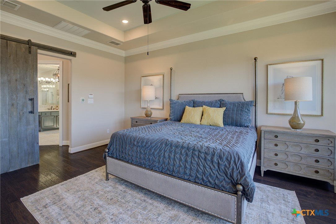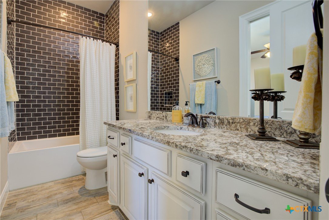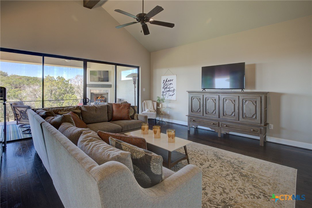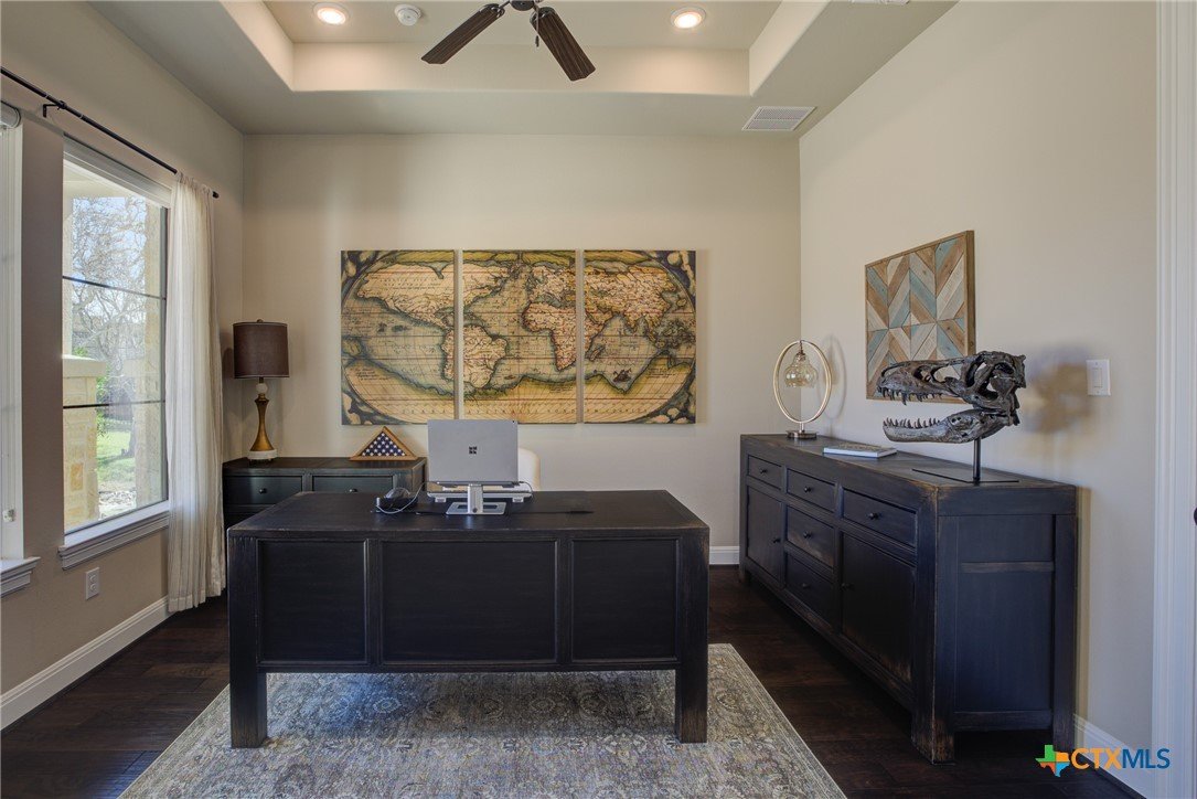 Welcome to 1741 Antigua Cove, a stunning custom home nestled in the highly sought-after River Place at Gruene, one of New Braunfels' most desirable neighborhoods. Just minutes from the charming town of Gruene, yet outside city limits to keep your taxes low, this property offers the perfect blend of convenience and tranquility. This immaculate one-story home is designed for modern living with every detail carefully crafted. Featuring four spacious bedrooms, each with its own en suite bathroom and walk-in closet, plus a dedicated office and expansive bonus room with custom barn door, there's plenty of space for all your needs. The chef's kitchen is a true standout, showcasing custom cabinetry, a double oven, gas cooking, and a pot filler-perfect for cooking and entertaining. A unique touch in the living room is the hidden TV, cleverly concealed behind a piece of artwork that slides away at the push of a button, eliminating the need for the TV to be the focus of the room. Every inch of this home is immaculate, from the oversized laundry room to the stunning lighting fixtures and gorgeous hardwood and tile floors. The thoughtful layout ensures maximum privacy for the bedrooms while still fostering a warm, inviting atmosphere throughout the home. Set on 1.48 acres in a quiet cul-de-sac, this home offers breathtaking, panoramic views off of an expansive 800 sf covered outside living area with fireplace and outdoor kitchen. As a resident of River Place at Gruene, you'll have access to a private Guadalupe River park, providing a perfect place to relax and enjoy the natural beauty of the area without having to fight the crowds.This home has it all-luxury, privacy, and unparalleled charm. Come see it for yourself!