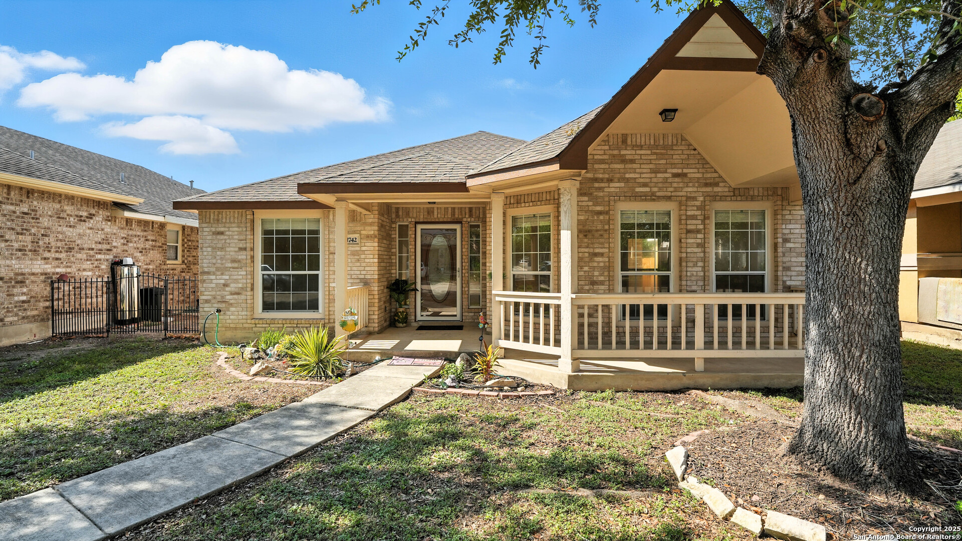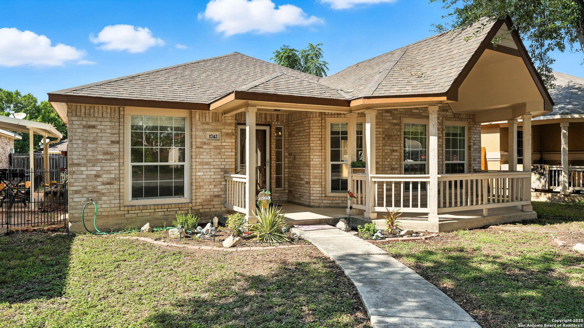 Come explore this charming New Braunfels home, ideally located just minutes from Kraft Park with its inviting playground and picnic areas! This property offers fantastic curb appeal with beautifully manicured flower beds and a spacious covered front porch, perfect for relaxing and enjoying the neighborhood. Step inside to a generous foyer that leads to a semi enclosed room, ideal for a cozy living space or home office. The dining area flows seamlessly into the well appointed kitchen, featuring a breakfast bar for entertaining, ample cabinet and countertop space, and a convenient pantry. The primary bedroom boasts an ensuite bath complete with a large vanity and a shower and tub. At the rear of the home, you'll find the garage with easy street access from both the front and back. Don't miss your chance to see this delightful property, schedule your private showing today!