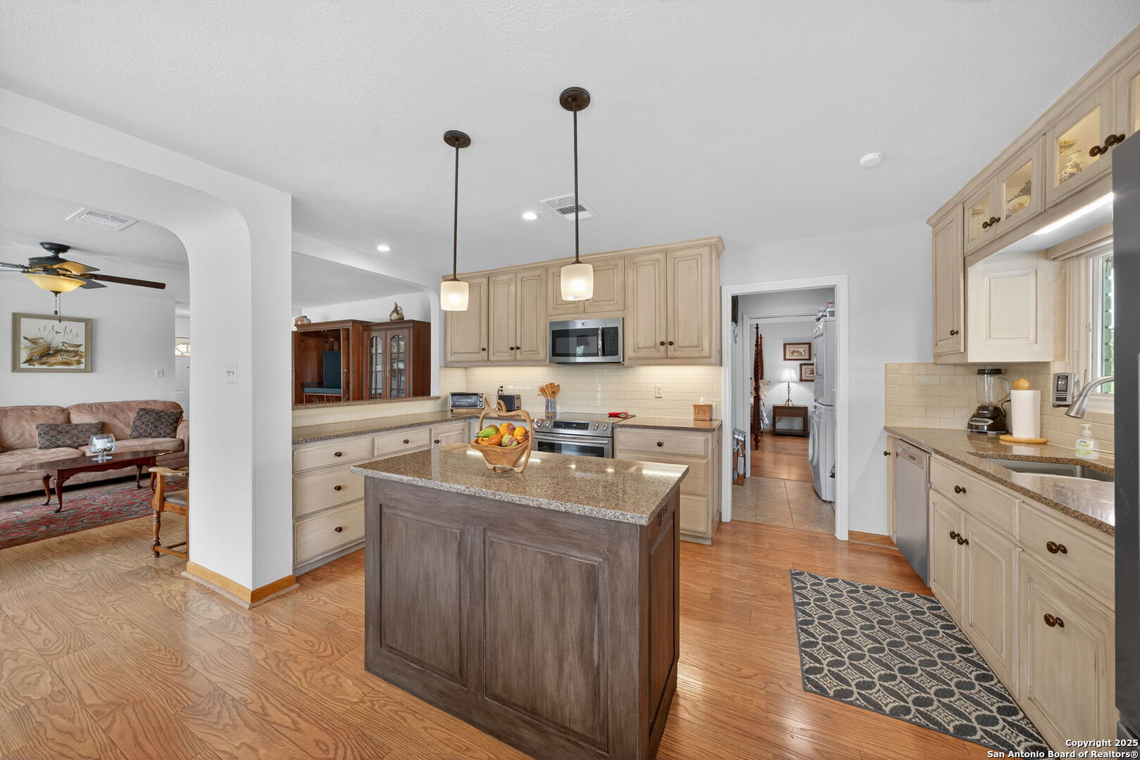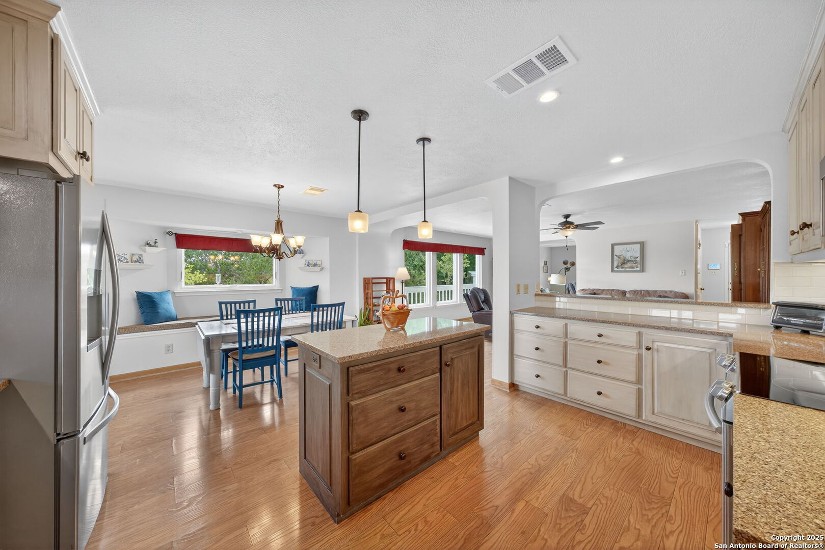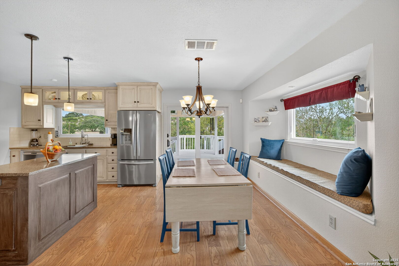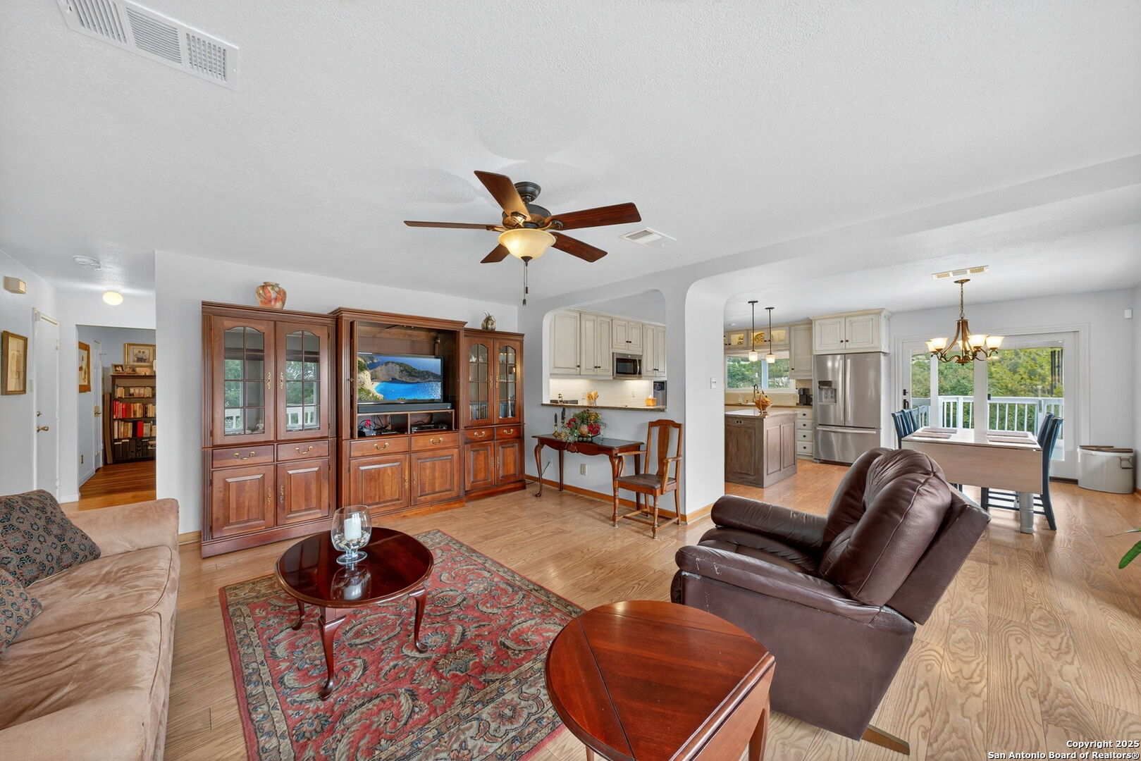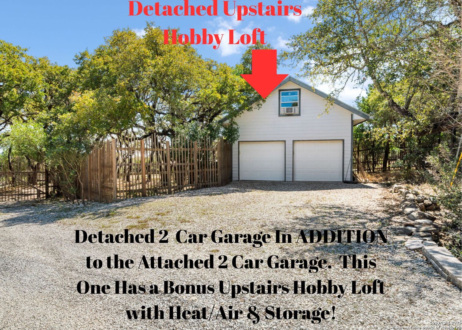 Nestled at the end of a cul-de-sac in Lakehills, this beautifully updated home offers the perfect blend of privacy, functionality, and Hill Country scenery. Sitting on two acres, this property is designed for both relaxation and productivity, featuring a unique floor plan with two primary bedroom suites and two additional spaces ideal for offices or flex rooms. Enjoy stunning views from the expansive deck off the kitchen, or unwind in the hot tub while taking in the serene surroundings all only a 5 minute drive to the elementary school. The property is rich with features, including a koi pond, a deer tight fence and a walk out "basement" for extra storage. The metal roof with solar panels, along with new windows and French doors, enhances energy efficiency and modern comfort. Car enthusiasts or hobbyists will love the attached two-car garage plus a detached two-car garage, which includes a heated and cooled bonus room above-perfect for a crafting studio, or game room. Inside, you'll find updated flooring, an updated kitchen, and a beautifully upgraded primary bathroom. Whether you're looking for a peaceful retreat or a functional home with versatile spaces, this Lakehills gem has it all! Don't miss this opportunity to own a slice of Hill Country paradise just minutes from Medina Lake. The neighborhood also features a neighborhood pool, playground and boat launch.