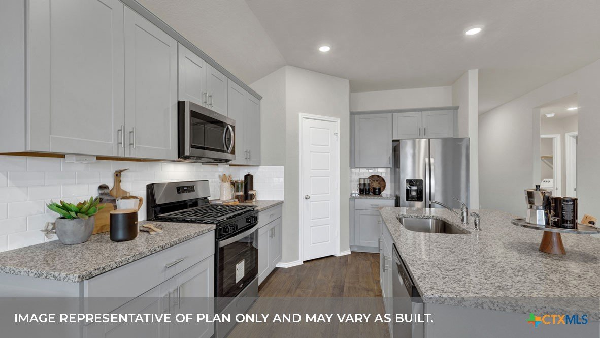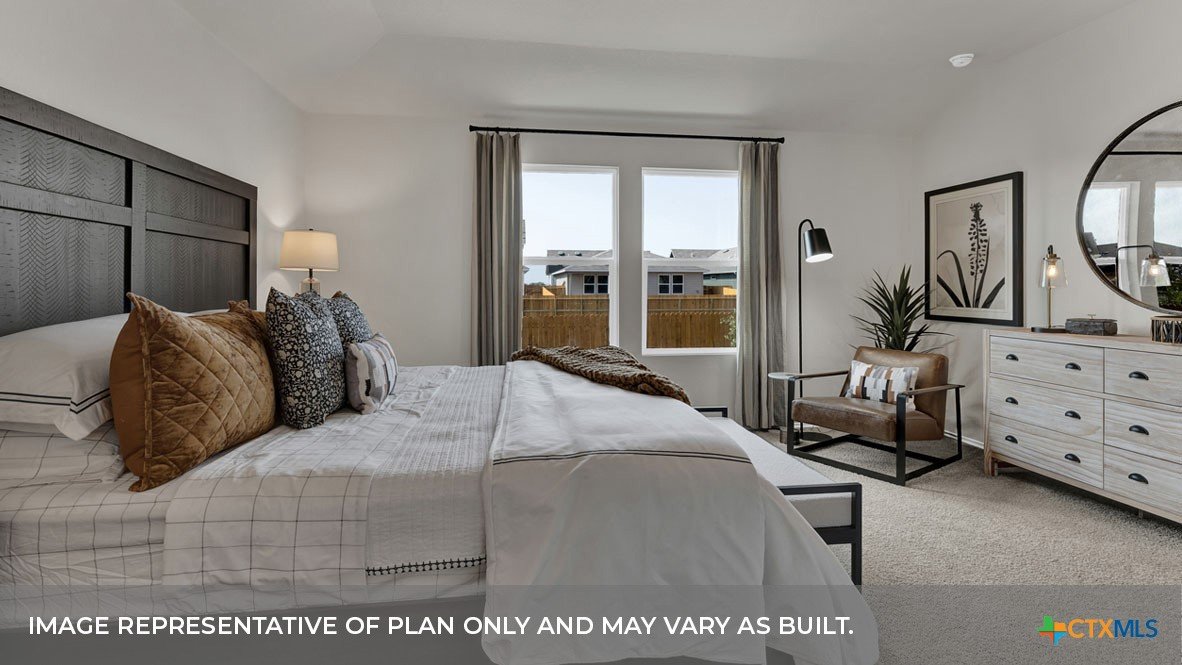 MOVE IN READY. CORNER LOT!! Check out our Harris floorplan, our largest one-story plan available at Saengerhalle Meadows in New Braunfels, TX. Perfect for roommates or larger families, this 4-bedroom, 2.5-bathroom, 2 car garage home offers 1,816 square feet of comfortable living space. Our homes in Saengerhalle Meadows feature farmhouse exteriors and the Harris plan is available in multiple exterior colors. At the front of the home, off the foyer, you have two secondary bedrooms and a full bathroom, which includes a shower/tub combination. Moving through the foyer, down a small hall, you will find the half bathroom, utility room and another secondary bedroom. All secondary bedrooms feature a closet with shelving. Whether you use these rooms as an office, child’s room or guest room, there is plenty of space for work, sleep, and play. Making your way through the house, you’ll walk into the heart of the home, the living area. Built as an open concept, move easily between the kitchen, dining, and family room. The L-shaped kitchen includes granite countertops, a large island with an undermount sink, a corner pantry closet, stainless-steel appliances and 36’’ upper cabinets. The primary bedroom is located off the family room. This spacious bedroom will be your oasis at the end of a long day. Enjoy the private bathroom, which features a 5’ walk in shower, double vanity, separate door for the toilet and an oversized walk-in closet. The Harris includes vinyl flooring throughout the common areas of the home, and carpet in the bedrooms. All our new homes feature a covered back patio, full sod, an irrigation system in the front and back yard, and a 6’ privacy fence around the back yard. This home includes our America’s Smart Home base package, which includes the Amazon Echo Pop, Front Doorbell, Front Door Deadbolt Lock, Home Hub, Thermostat, and Deako® Smart Switches.