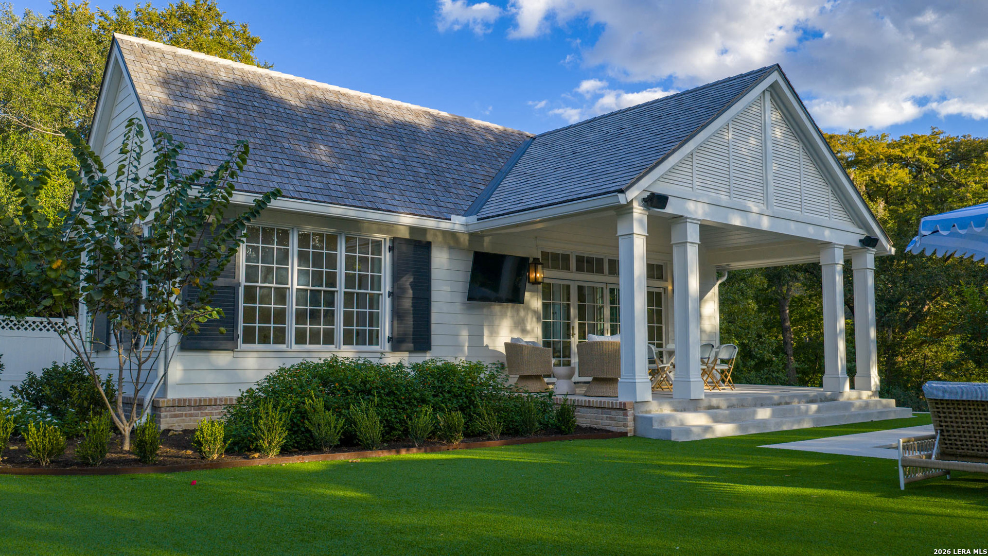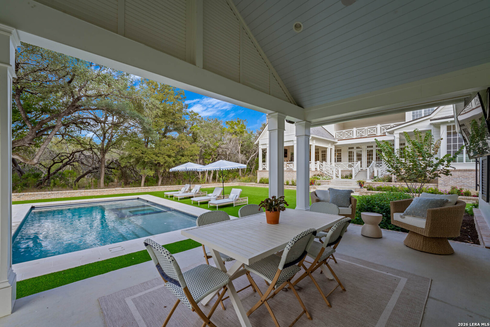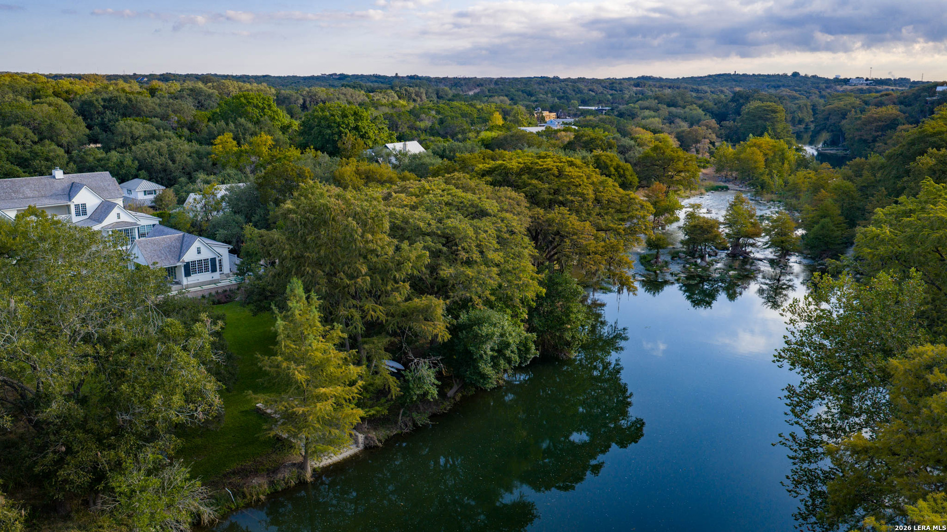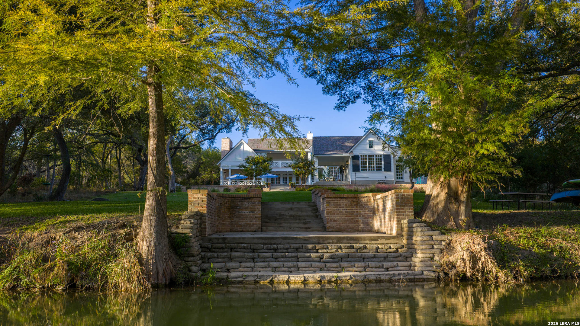 Nestled within the private, gated community of Riada, 1755 Riada Drive sits on 1.48 meticulously landscaped acres with a grand entrance and 100 feet of private Guadalupe River frontage. This rare estate is a blend of timeless elegance and modern luxury. Spanning over 6,550 sq ft, this extraordinary property includes a total of 6 bedrooms, 7.5 bathrooms, a detached casita, and a private office suite above the garage-perfect for guests or remote work. Inside, you're greeted by hardwood floors, custom millwork, and luxury finishes throughout. The heart of the home is a chef's dream kitchen featuring marble countertops, white oak cabinetry, banquette seating, a Lacanche Sully French range, and top-of-the-line appliances, all complemented by unlacquered brass fixtures that will naturally develop a beautiful patina overtime, adding character and warmth to the home's refined finish. The main floor features a spacious primary suite with a luxurious bathroom, as well as 3 additional guest bedrooms, each with its own private bathroom. Upstairs, enjoy a bunkroom, media room, full bar, and top-of-the-line Uneekor golf simulator for entertainment and relaxation. The detached casita offers comfortable and private living with a bedroom, bathroom, kitchenette, and living room, all equipped with high-end Bosch appliances-ideal for guests or extended stays. Step outside to your turf-lined backyard oasis, complete with a heated pool and spa, automatic pool cover, and custom landscaping. The steps down from the pool lead to a lush St. Augustine pathway just steps away from the pristine Guadalupe River, where you'll find a private river patio and direct river access. At the front of the property, you'll be greeted with raised garden beds and a garden shed, adding charm and functionality. The landscape is supported by a full irrigation system with a river pump, while the home operates on a private water well, water softener system, tankless water heaters, an aerobic septic system, and NBU Electricity. Whether entertaining or enjoying peaceful riverfront views, 1755 Riada Drive offers the ultimate in Hill Country luxury-just minutes from the charm of Gruene, downtown New Braunfels, and the area's top attractions.