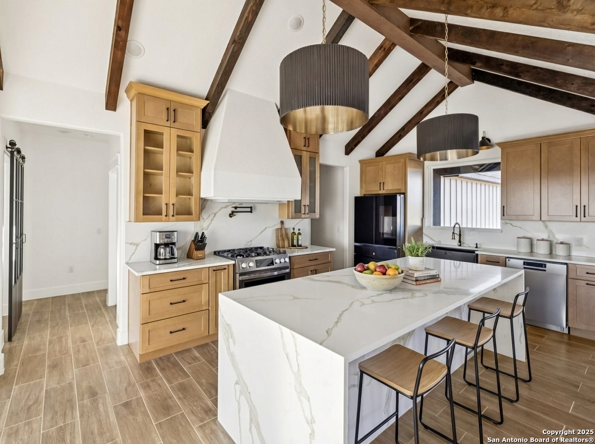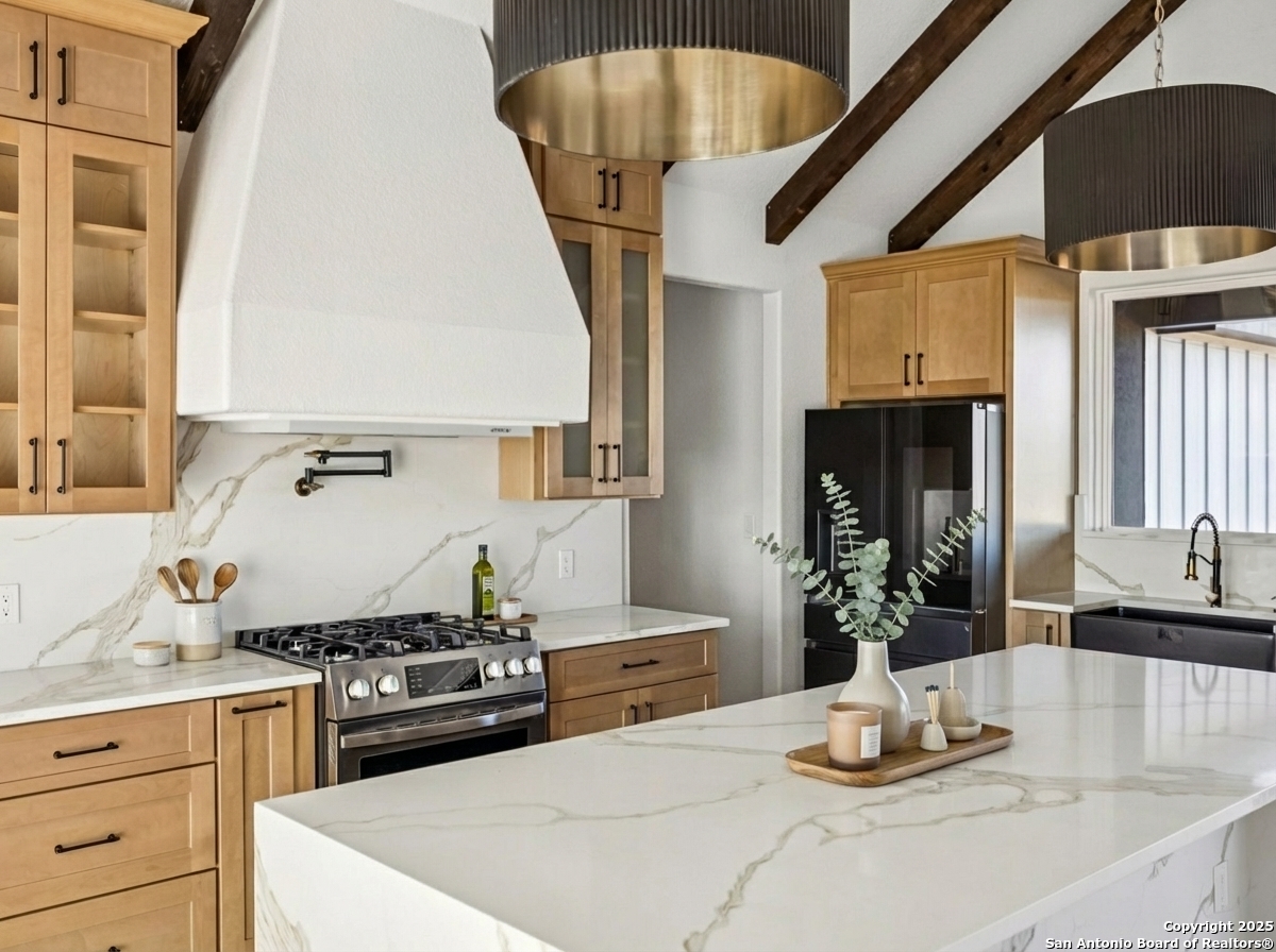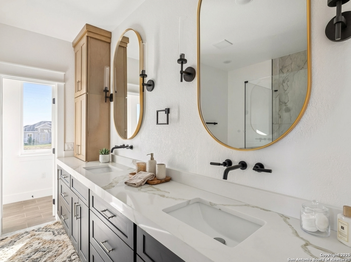 Step into a living room designed to impress, where soaring ceilings, refined architectural details, and a warm propane fireplace create an atmosphere of effortless sophistication. The space flows seamlessly into a chefinspired kitchen, beautifully appointed with new quartz countertops, sleek custom cabinetry, stainless steel appliances, and a generous walkin pantry-an elegant blend of style and function worthy of the most discerning entertainer. The dining area continues this sense of refinement, offering an inviting setting for intimate dinners or grand gatherings, all framed by the home's modern, elevated design. The primary suite is a sanctuary of luxury, featuring a serene ambiance, a spacious walkin closet, and a spalevel bathroom adorned with exquisite tilework, LED mirrors, and contemporary finishes that evoke a boutique hotel experience, while a second full master suite enhances the home's exclusivity, providing flexibility for multigenerational living or distinguished guest accommodations. The additional bedrooms are equally impressive, including a beautifully designed Jack and Jill layout with custom storage, stylish wood and black accents, and thoughtful details that elevate everyday living. Outdoors, the backyard offers a private retreat complete with a covered patio and a fully equipped outdoor kitchen-perfect for al fresco dining, weekend barbecues, or hosting under the stars-complemented by landscaping supported by a full sprinkler system and ample space for relaxation or entertaining, making this setting both peaceful and polished as it seamlessly extends the home's luxurious interior.