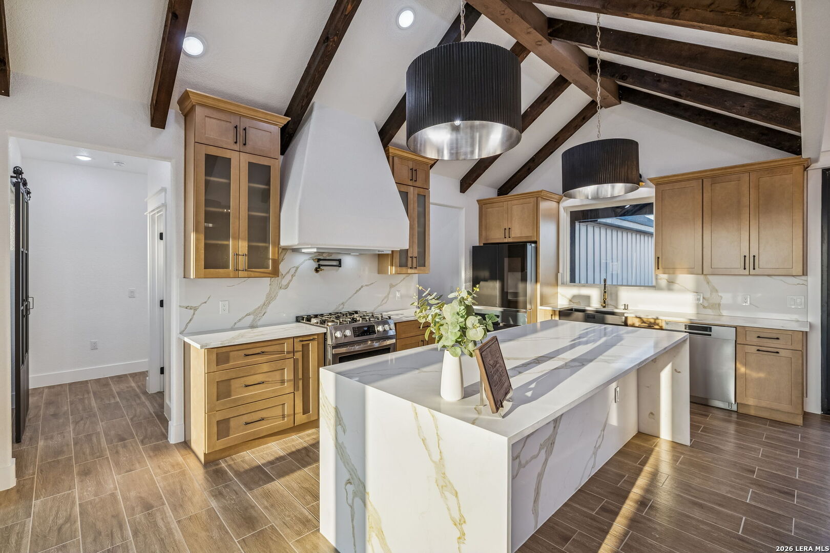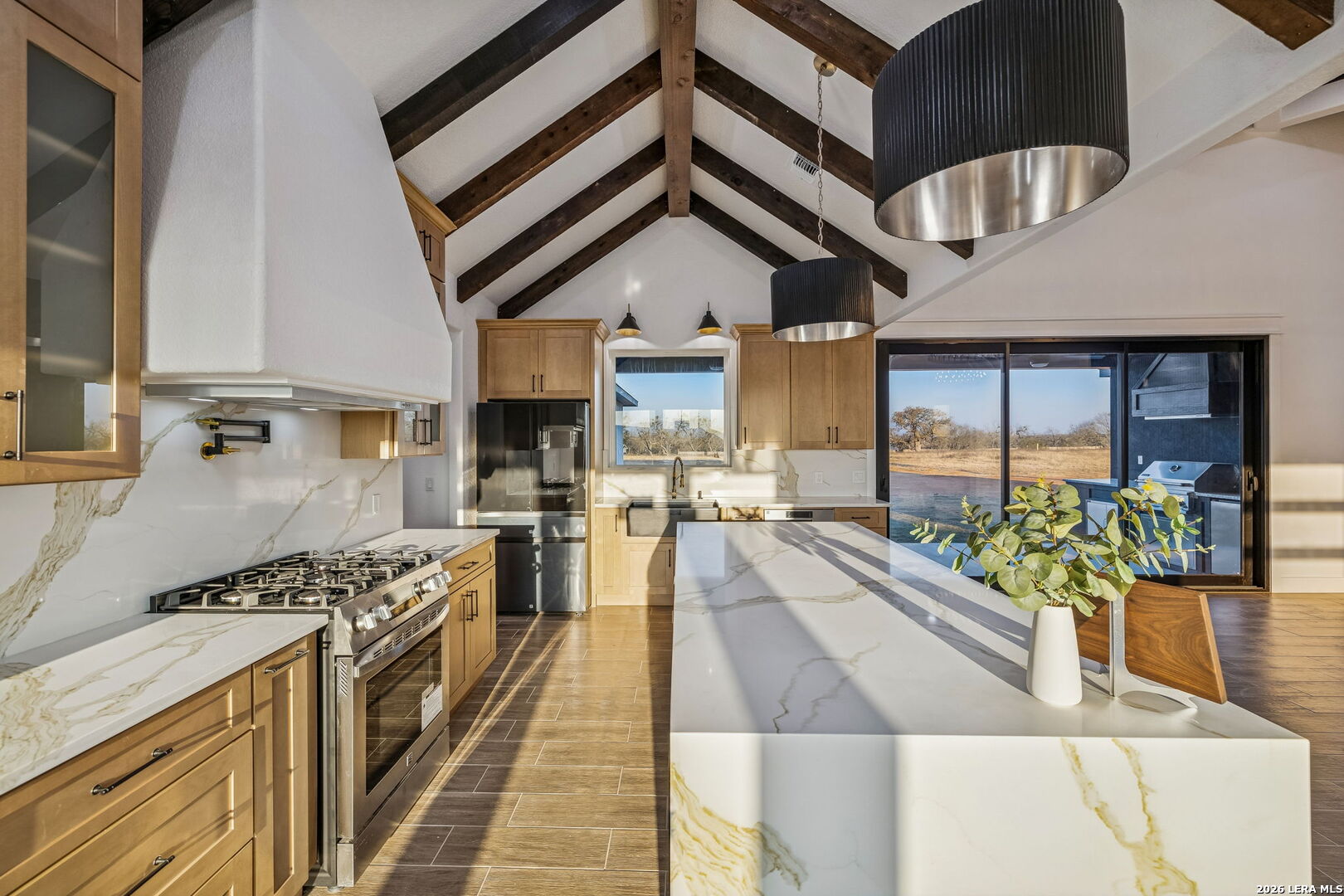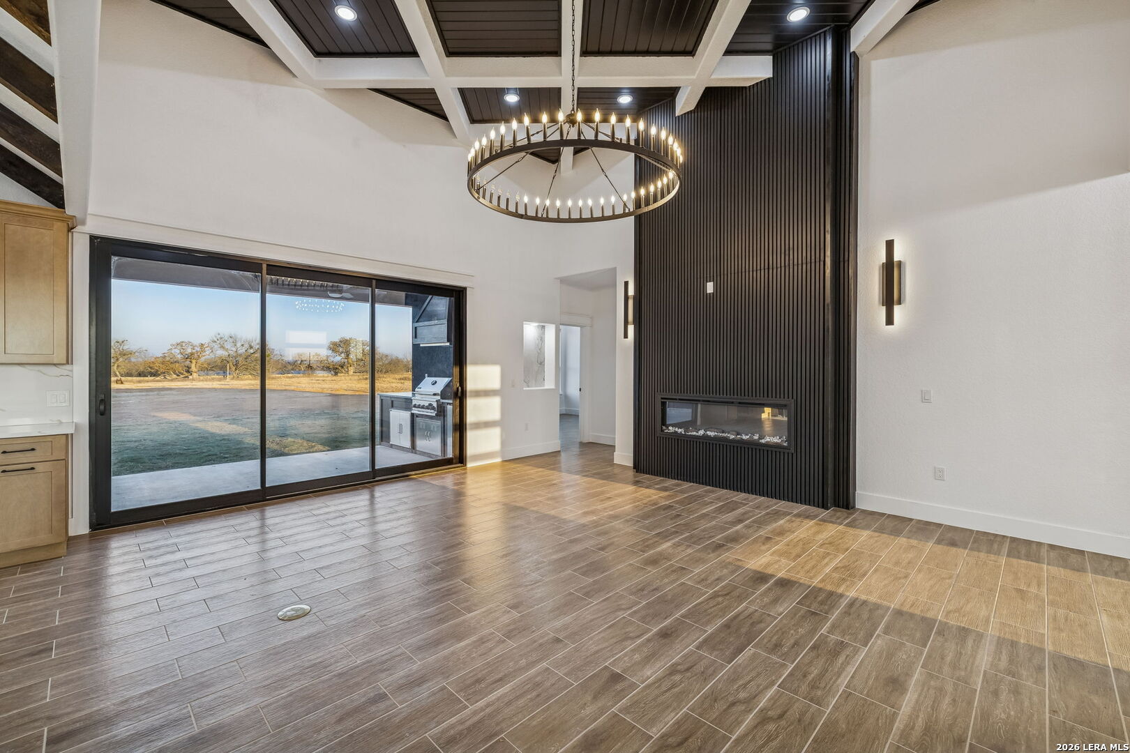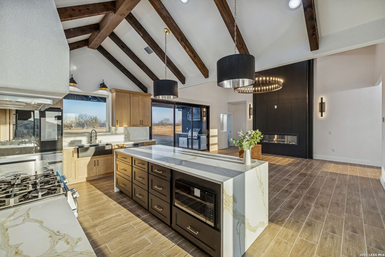 **OPEN HOUSE - SATURDAY, Feb. 7th 11:00 AM - 1:00PM** SELLER IS OFFERING UP TO $15K IN CONCESSIONS!!! THIS IS THE ONE. SHOWPIECE. LUXURY. THOUGHTFUL. The living room is absolutely stunning, anchored by a dramatic 16foot threesided fireplace, soaring tray ceilings with warm wood accents, and expansive beams that flow effortlessly into the kitchen and master suite. Natural light pours through 12foot sliding glass doors that open on both sides, creating seamless indooroutdoor living. The chef's kitchen showcases custom white oak cabinetry, sleek quartz countertops, gold hardware, and premium appliances-including a refrigerator, gas range and stove, microwave, and dishwasher-paired with an inviting dining area and a dedicated office featuring bold black builtins. Every bedroom is equipped with generous walkin closets, complemented by spainspired bathrooms featuring floortoceiling tile, garden tubs, luxury lighting, and multiple makeup vanities. The master bathroom stands out as a true retreat, centered around a sleek black garden tub that brings sculptural elegance to the space. Refined, modern fixtures elevate the room even further, creating a serene, highend atmosphere designed for relaxation. Outside, the entertainer's dream continues with a private covered patio and full outdoor kitchen complete with a plumbed propane grill, refrigerator, and guest half bath, along with a water softener and a full sprinkler system for effortless lawn maintenance.