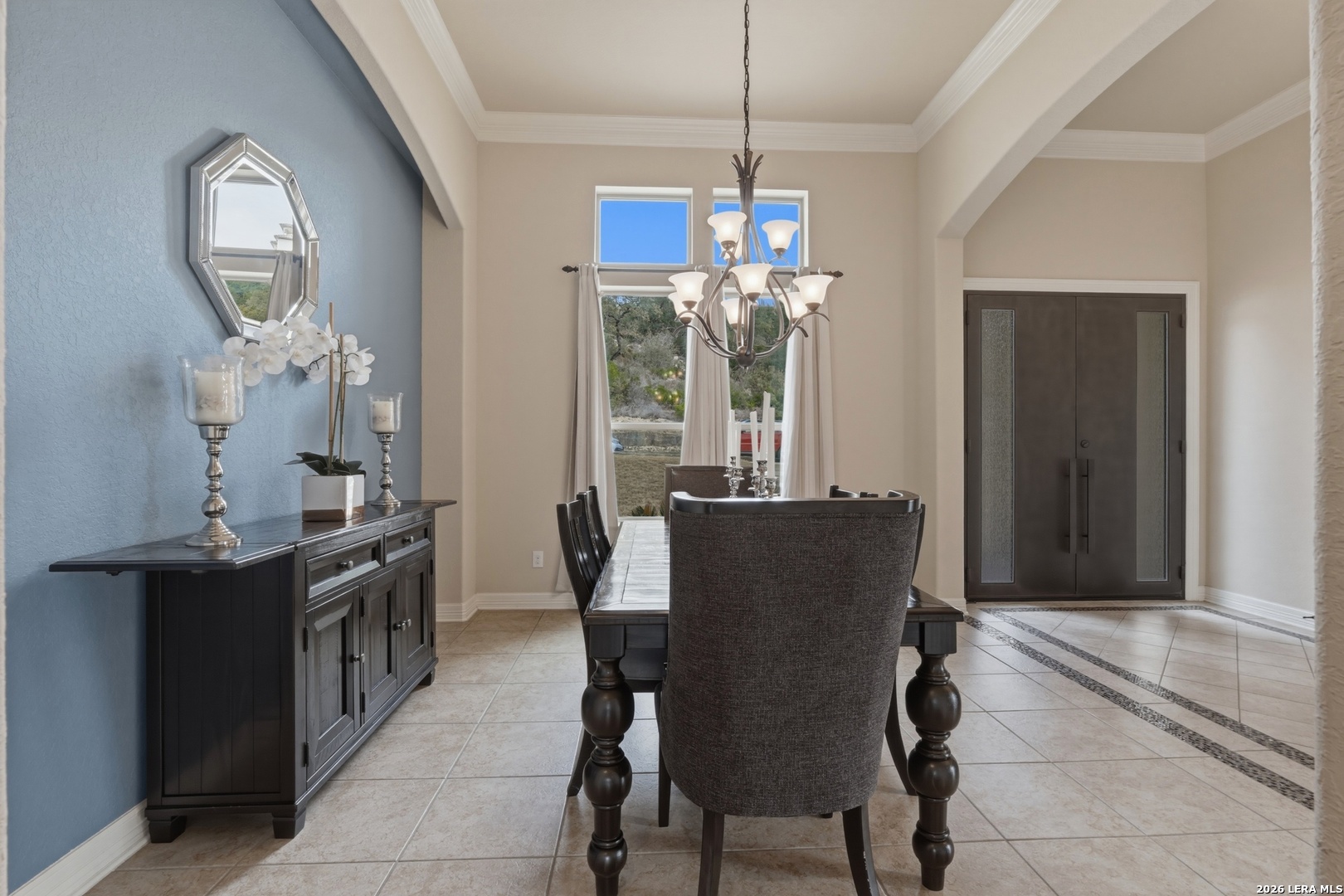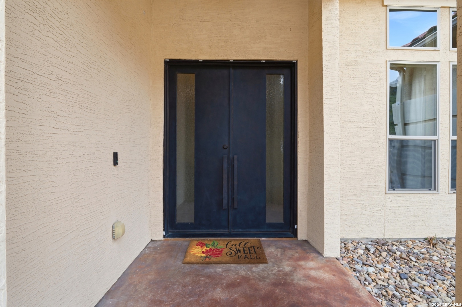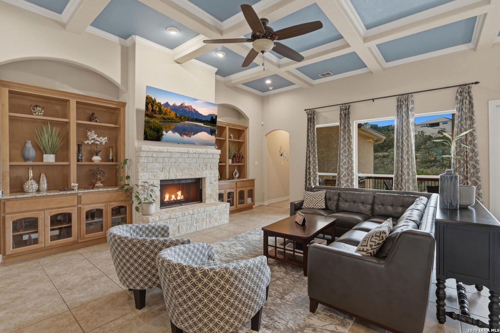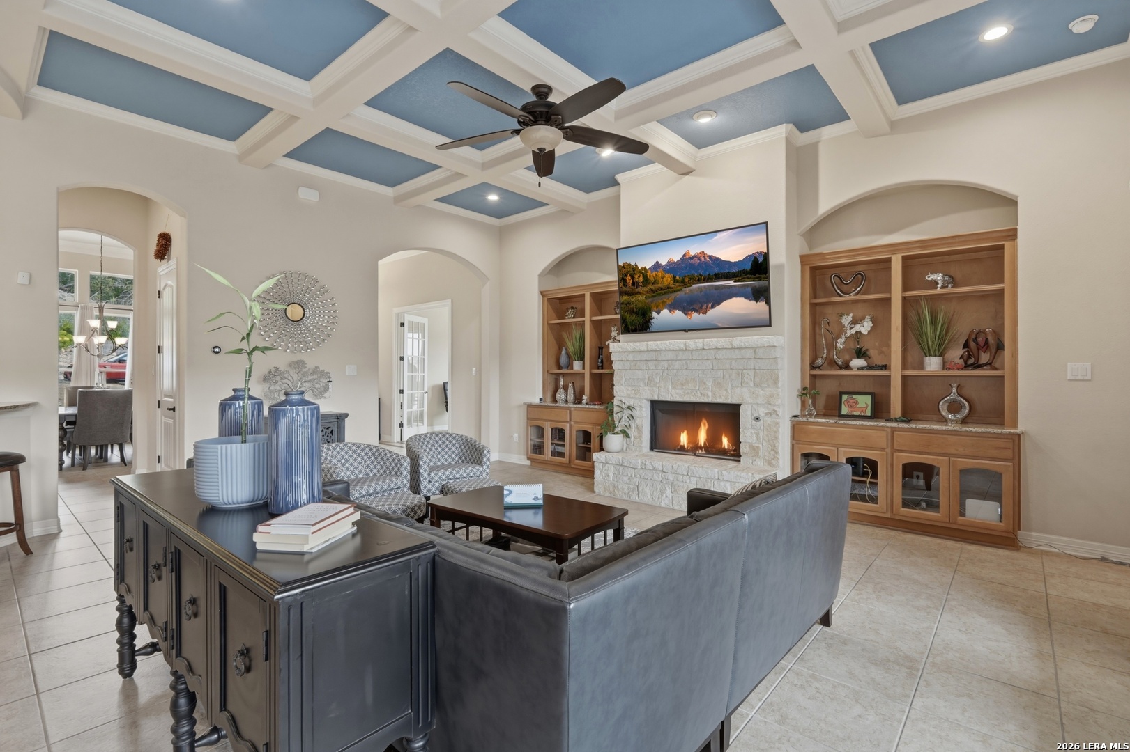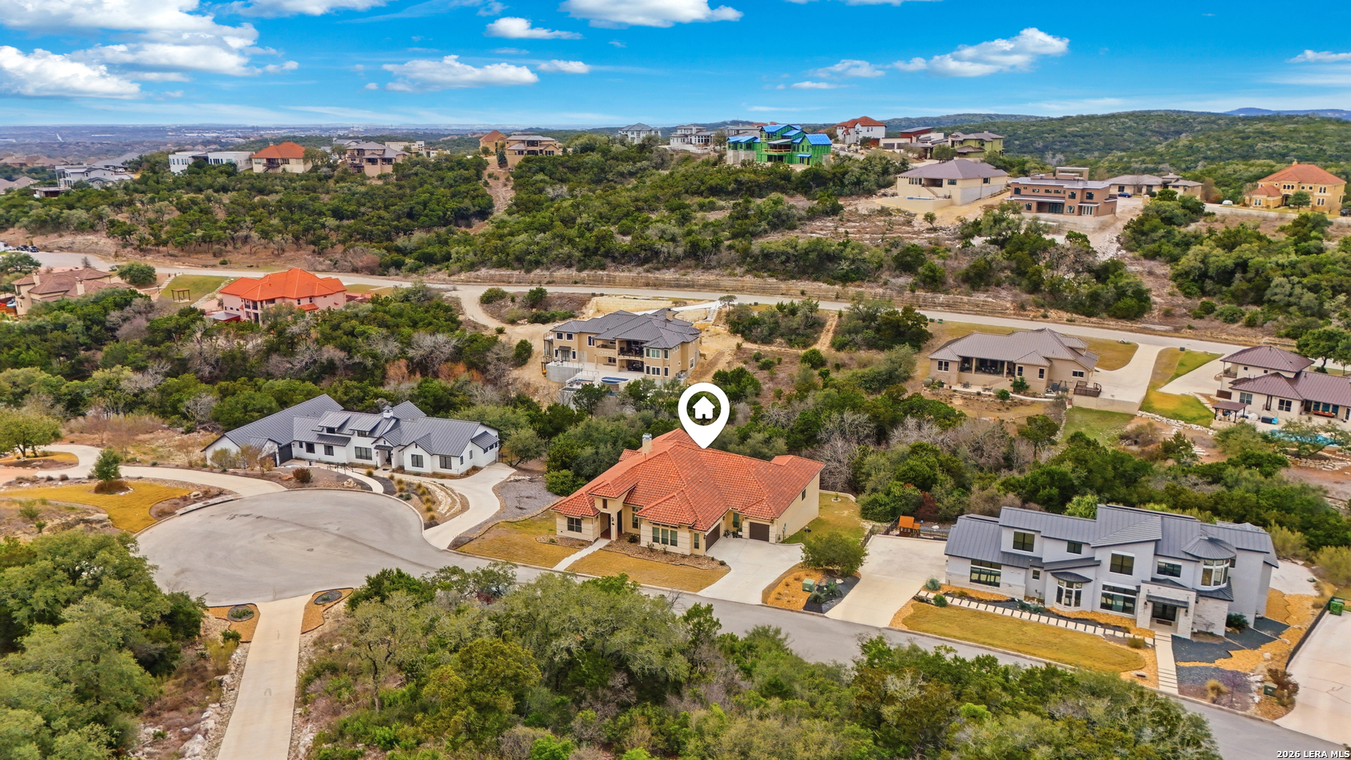 Situated within an exclusive gated community, this exceptional estate offers refined luxury on a beautifully positioned .62 acre homesite with scenic hillside views. Thoughtfully designed with privacy and sophistication in mind, this expansive residence features four bedrooms, all with walk in closets, privately split and appointed with its own ensuite bath. The primary features a vaulted wood beamed ceiling. The gorgeous primary bath has an elegant separate bath and oversized shower with dual shower heads. Impressive bronze metal doors open into the formal dining room, setting the tone for the home's elegant architectural details, including soaring coffered high ceilings, crown molding throughout, and custom art niches. High-end tile flooring flows seamlessly through the main living spaces, enhancing the home's elevated aesthetic. The open-concept design centers around a stunning rock fireplace with gas starter, flanked by custom built-in cabinetry with glass doors. The chef's kitchen is beautifully appointed with granite countertops, breakfast bar, Bosch appliances, double ovens, a gas cooktop, and abundant cabinetry-ideal for both everyday living and upscale entertaining. Included is a spacious walk in pantry. Designed for comfort and versatility, the home offers a private study with double French doors, a spacious second living area, and a fully equipped media room complete with projector, screen, and theater seating-all included. Located next to the media room and second living area is a dry bar with counter and glass cabinets to hold all your favorite drinks and snacks. Outdoor living is equally impressive with a covered patio showcasing hillside views and a well-appointed outdoor kitchen with sink and gas cooking, perfect for entertaining year-round. Also included is a full sprinkler, two HVAC's, two water heaters, and a water softener. The utility room features a deep sink and there is a mud room with bench to catch your belongings after a long day. This home also has a lifetime tile roof and lower patio for additional entertaining space. Located within Northside ISD and just minutes from golfing, premier luxury shopping, fine dining, and upscale entertainment, this residence seamlessly blends elegance, functionality, and lifestyle.