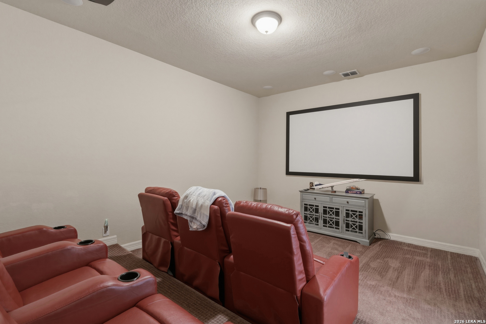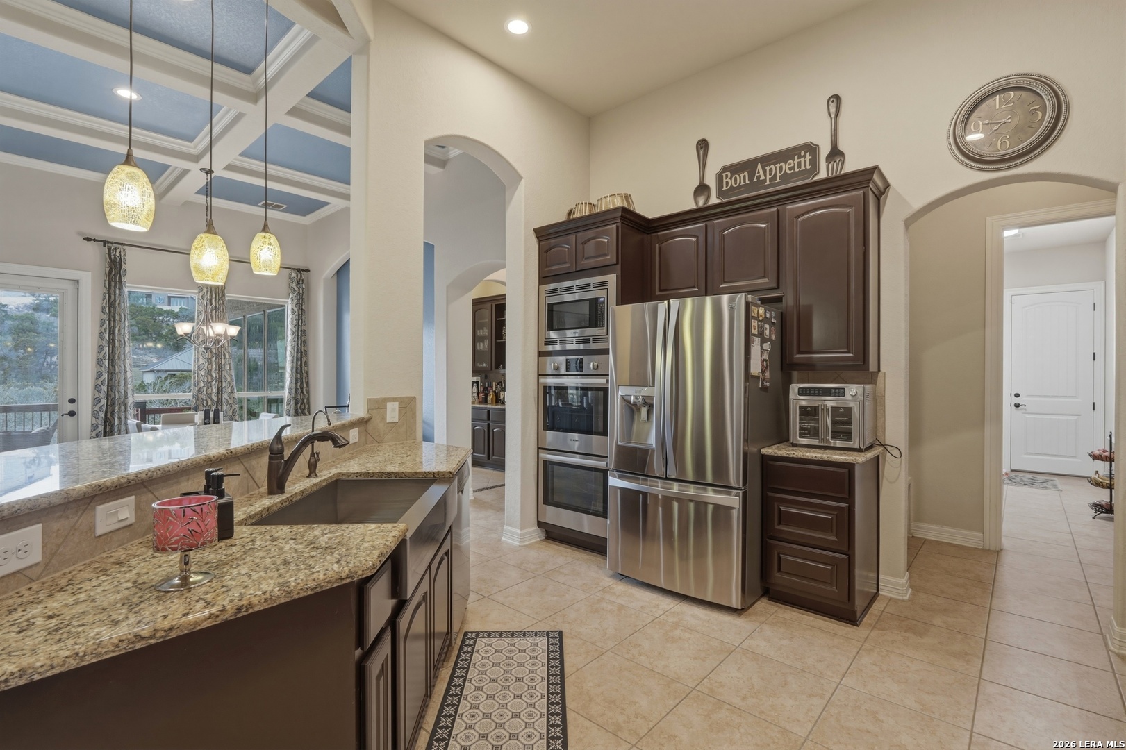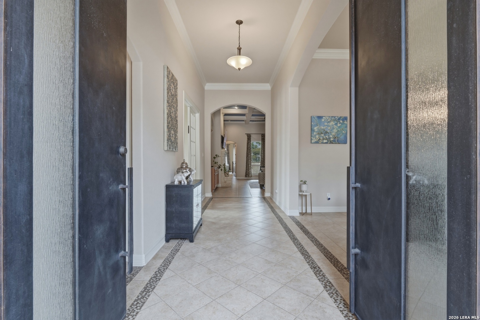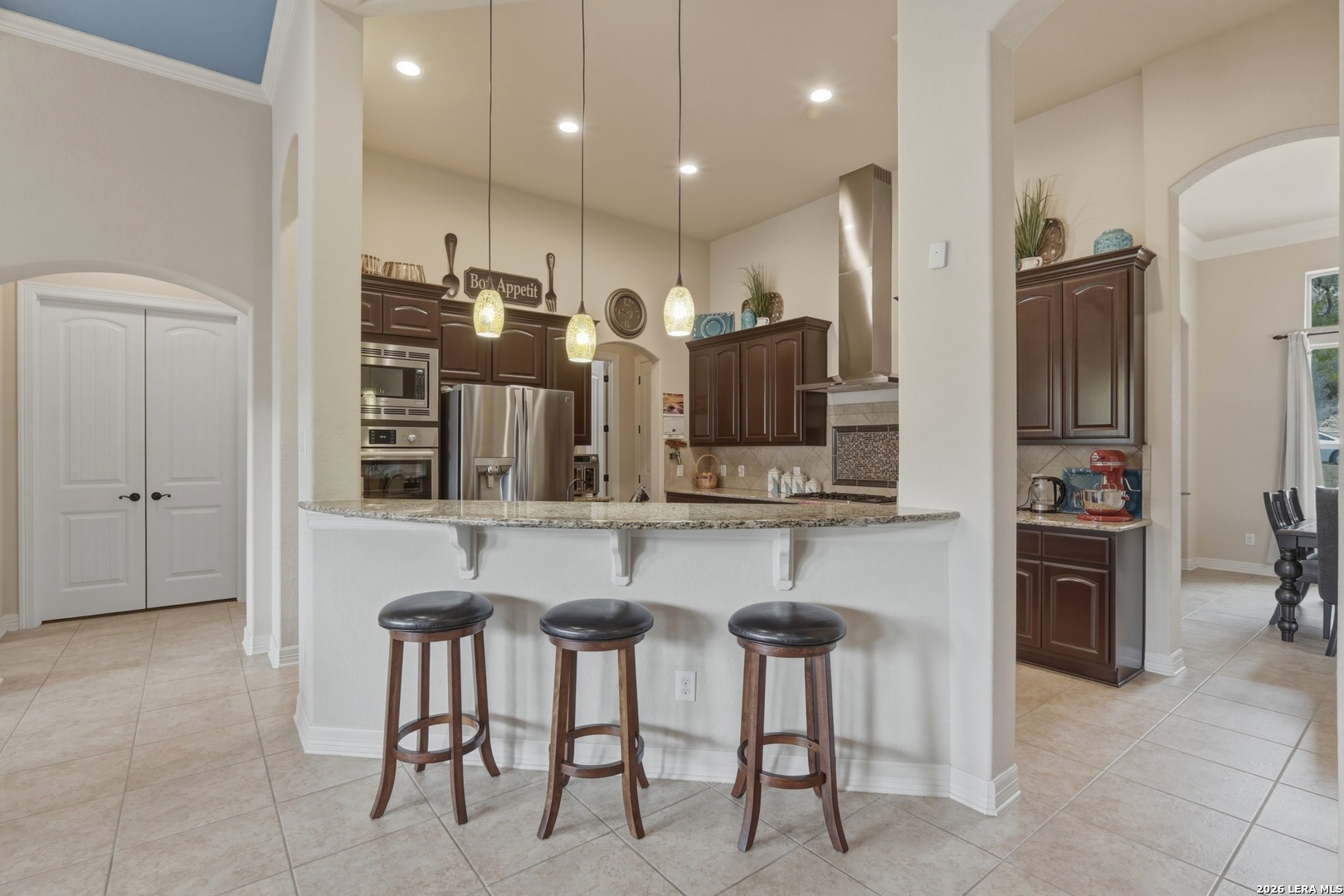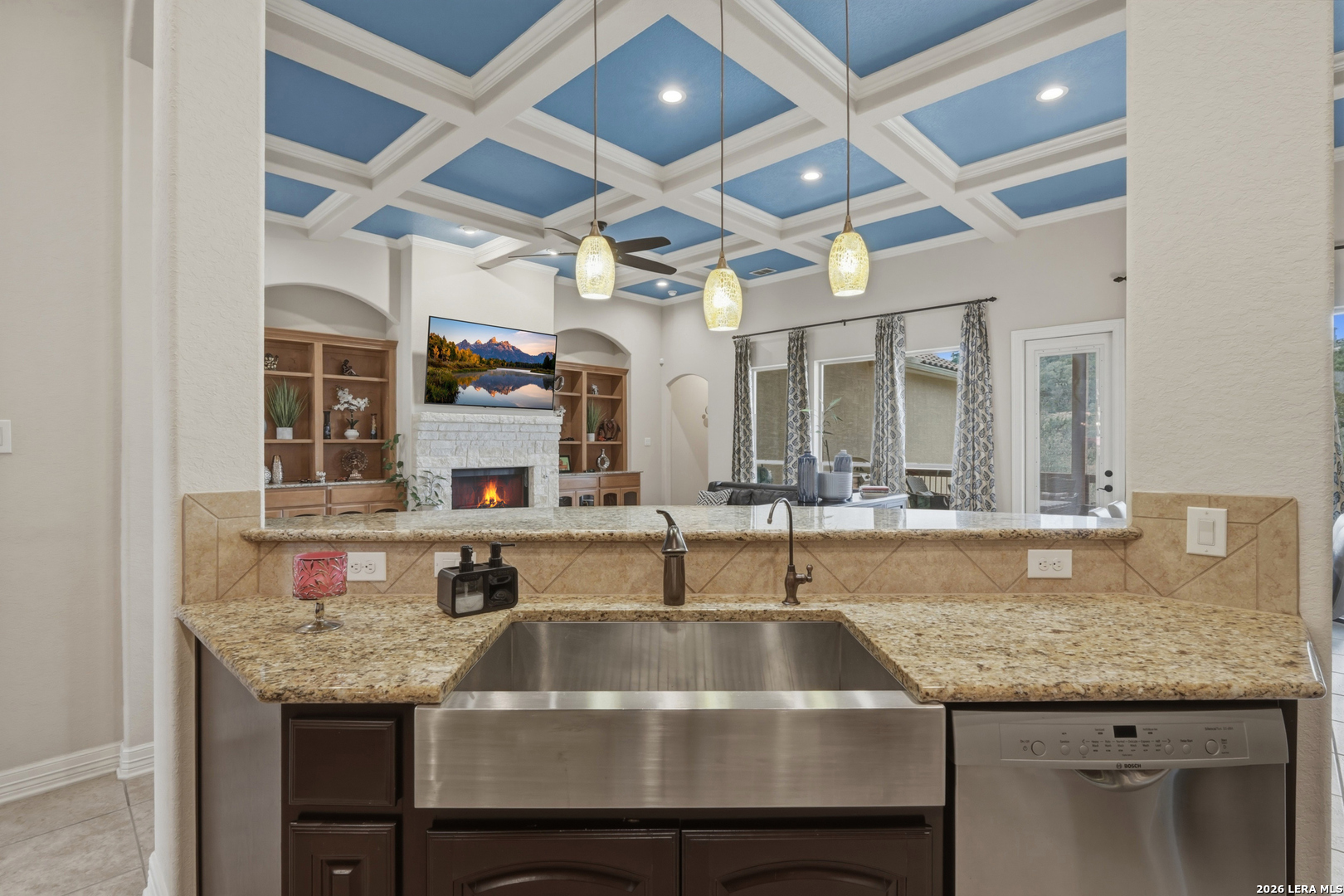 Situated within an exclusive gated community, this exceptional estate offers refined luxury on a beautifully positioned .62 acre homesite with scenic hillside views. Thoughtfully designed with privacy and sophistication in mind, this expansive residence features four bedrooms, all with walk in closets, privately split and appointed with its own ensuite bath. The primary features a vaulted wood beamed ceiling. The gorgeous primary bath has an elegant separate bath and oversized shower with dual shower heads. Impressive bronze metal doors open into the formal dining room, setting the tone for the home's elegant architectural details, including soaring coffered high ceilings, crown molding throughout, and custom art niches. High-end tile flooring flows seamlessly through the main living spaces, enhancing the home's elevated aesthetic. The open-concept design centers around a stunning rock fireplace with gas starter, flanked by custom built-in cabinetry with glass doors. The chef's kitchen is beautifully appointed with granite countertops, breakfast bar, Bosch appliances, double ovens, a gas cooktop, and abundant cabinetry-ideal for both everyday living and upscale entertaining. Included is a spacious walk in pantry. Designed for comfort and versatility, the home offers a private study with double French doors, a spacious second living area, and a fully equipped media room complete with projector, screen, and theater seating-all included. Located next to the media room and second living area is a dry bar with counter and glass cabinets to hold all your favorite drinks and snacks. Outdoor living is equally impressive with a covered patio showcasing hillside views and a well-appointed outdoor kitchen with sink and gas cooking, perfect for entertaining year-round. Also included is a full sprinkler, two HVAC's, two water heaters, and a water softener. The utility room features a deep sink and there is a mud room with bench to catch your belongings after a long day. This home also has a lifetime tile roof and lower patio for additional entertaining space. Located within Northside ISD and just minutes from golfing, premier luxury shopping, fine dining, and upscale entertainment, this residence seamlessly blends elegance, functionality, and lifestyle.