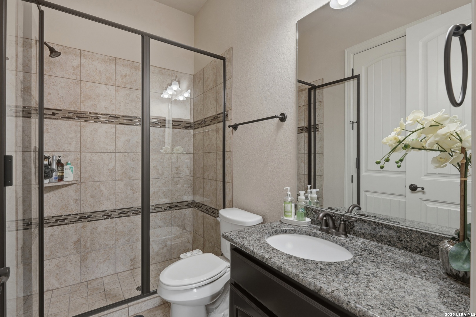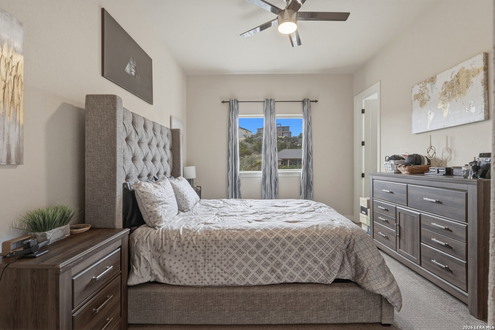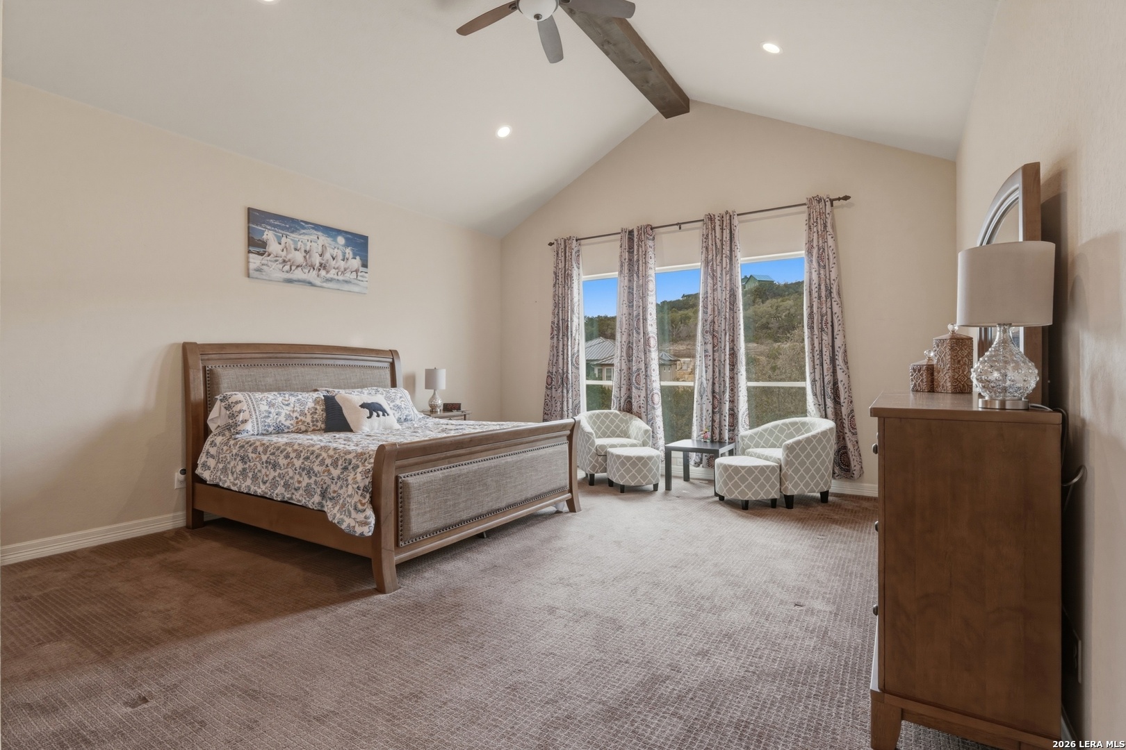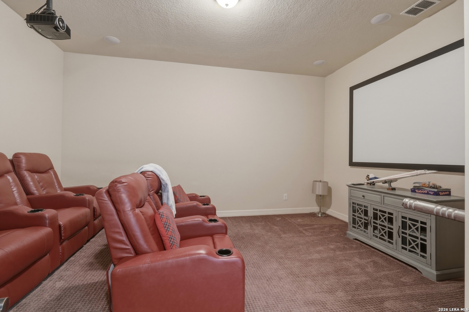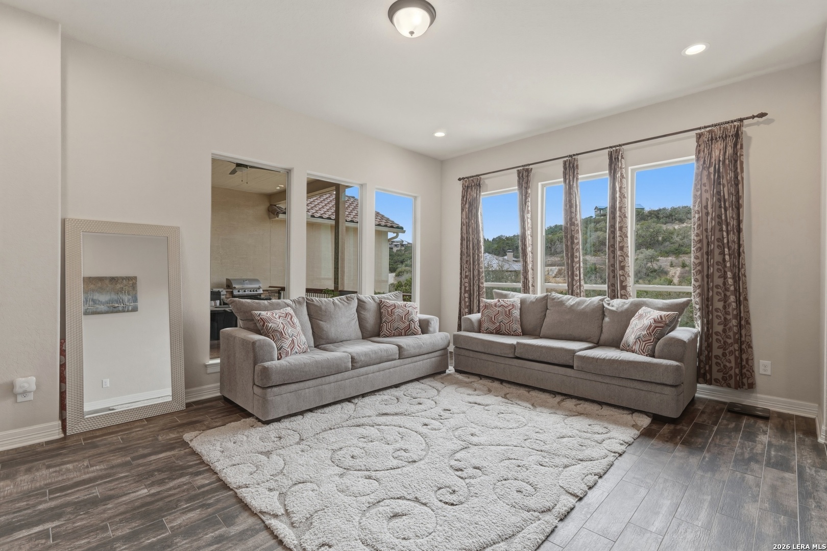 Situated within an exclusive gated community, this exceptional estate offers refined luxury on a beautifully positioned .62 acre homesite with scenic hillside views. Thoughtfully designed with privacy and sophistication in mind, this expansive residence features four bedrooms, all with walk in closets, privately split and appointed with its own ensuite bath. The primary features a vaulted wood beamed ceiling. The gorgeous primary bath has an elegant separate bath and oversized shower with dual shower heads. Impressive bronze metal doors open into the formal dining room, setting the tone for the home's elegant architectural details, including soaring coffered high ceilings, crown molding throughout, and custom art niches. High-end tile flooring flows seamlessly through the main living spaces, enhancing the home's elevated aesthetic. The open-concept design centers around a stunning rock fireplace with gas starter, flanked by custom built-in cabinetry with glass doors. The chef's kitchen is beautifully appointed with granite countertops, breakfast bar, Bosch appliances, double ovens, a gas cooktop, and abundant cabinetry-ideal for both everyday living and upscale entertaining. Included is a spacious walk in pantry. Designed for comfort and versatility, the home offers a private study with double French doors, a spacious second living area, and a fully equipped media room complete with projector, screen, and theater seating-all included. Located next to the media room and second living area is a dry bar with counter and glass cabinets to hold all your favorite drinks and snacks. Outdoor living is equally impressive with a covered patio showcasing hillside views and a well-appointed outdoor kitchen with sink and gas cooking, perfect for entertaining year-round. Also included is a full sprinkler, two HVAC's, two water heaters, and a water softener. The utility room features a deep sink and there is a mud room with bench to catch your belongings after a long day. This home also has a lifetime tile roof and lower patio for additional entertaining space. Located within Northside ISD and just minutes from golfing, premier luxury shopping, fine dining, and upscale entertainment, this residence seamlessly blends elegance, functionality, and lifestyle.