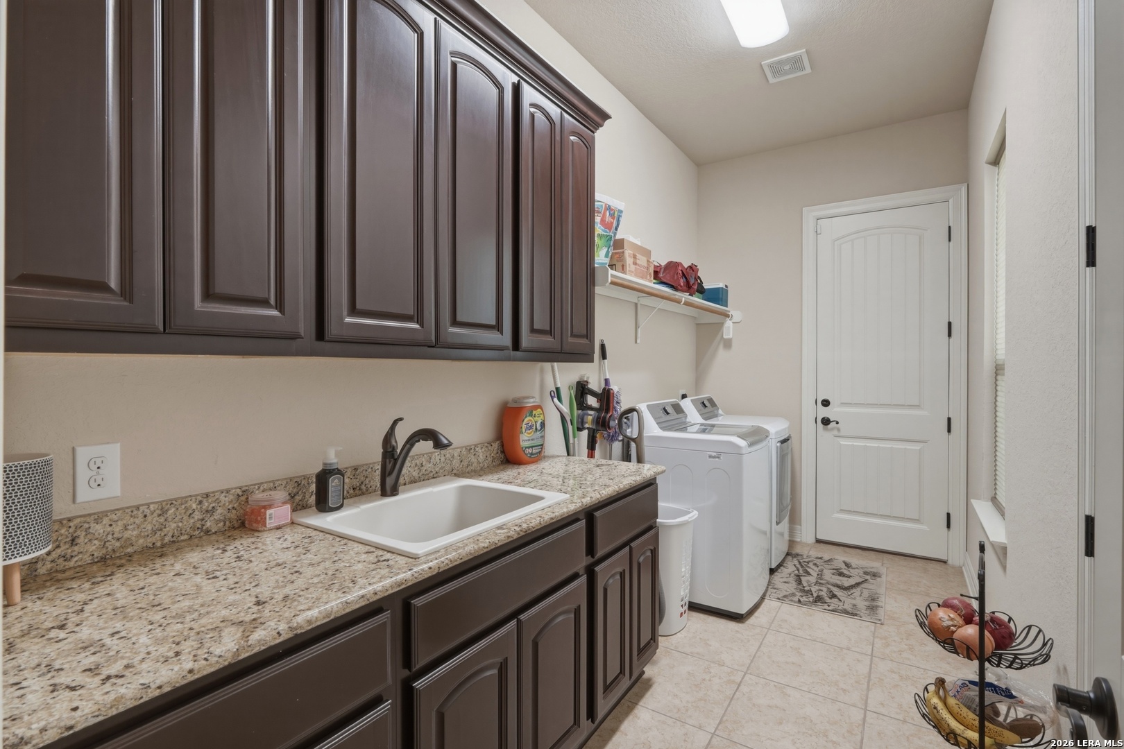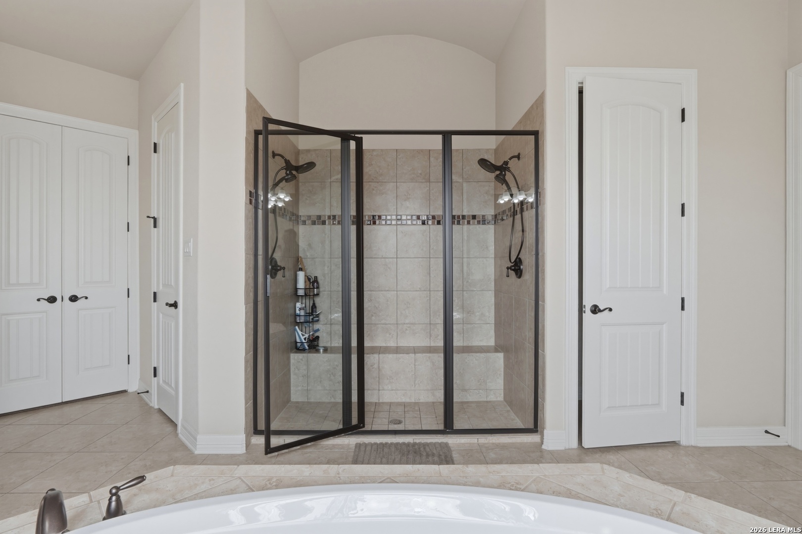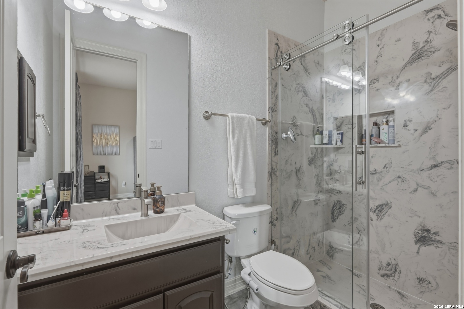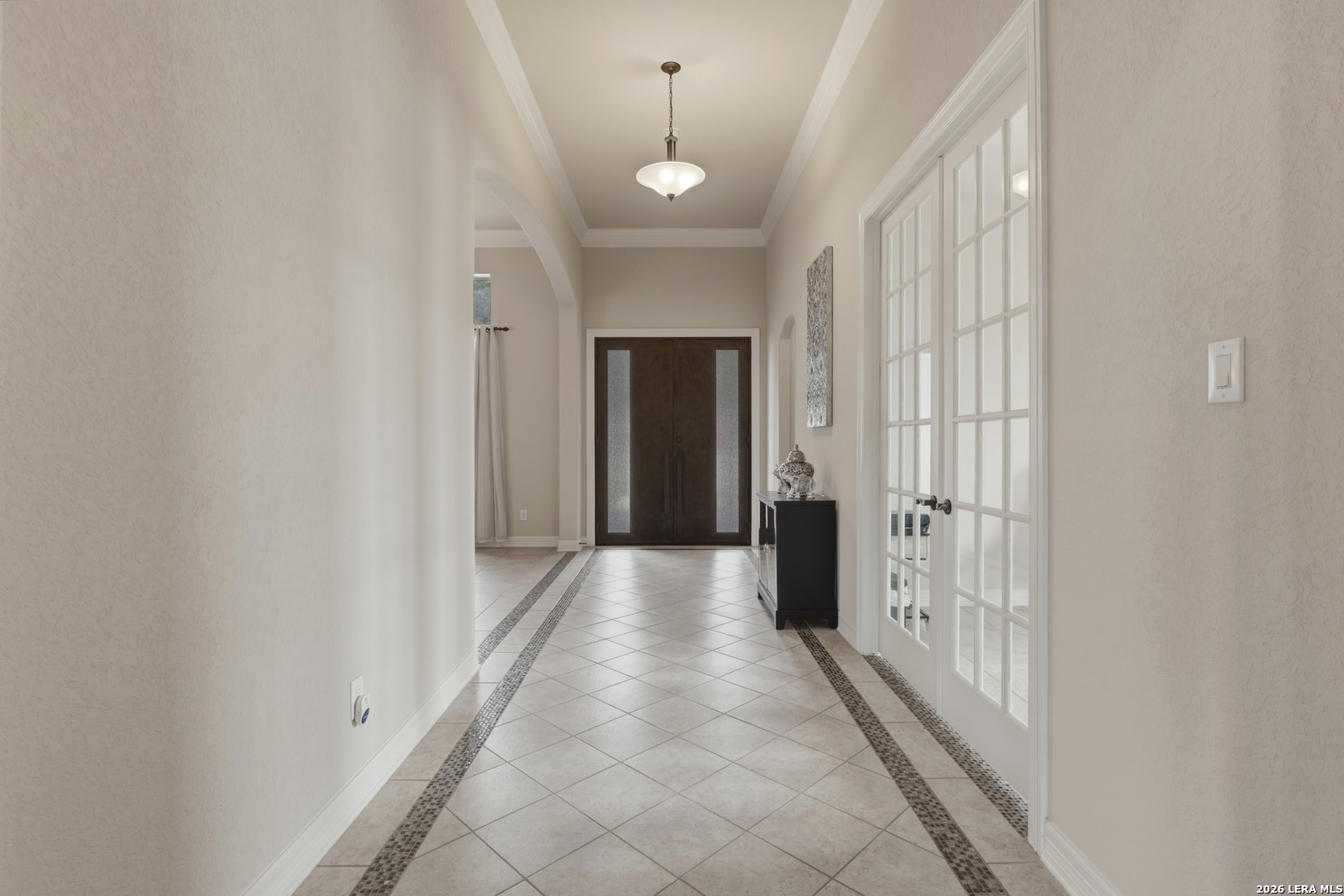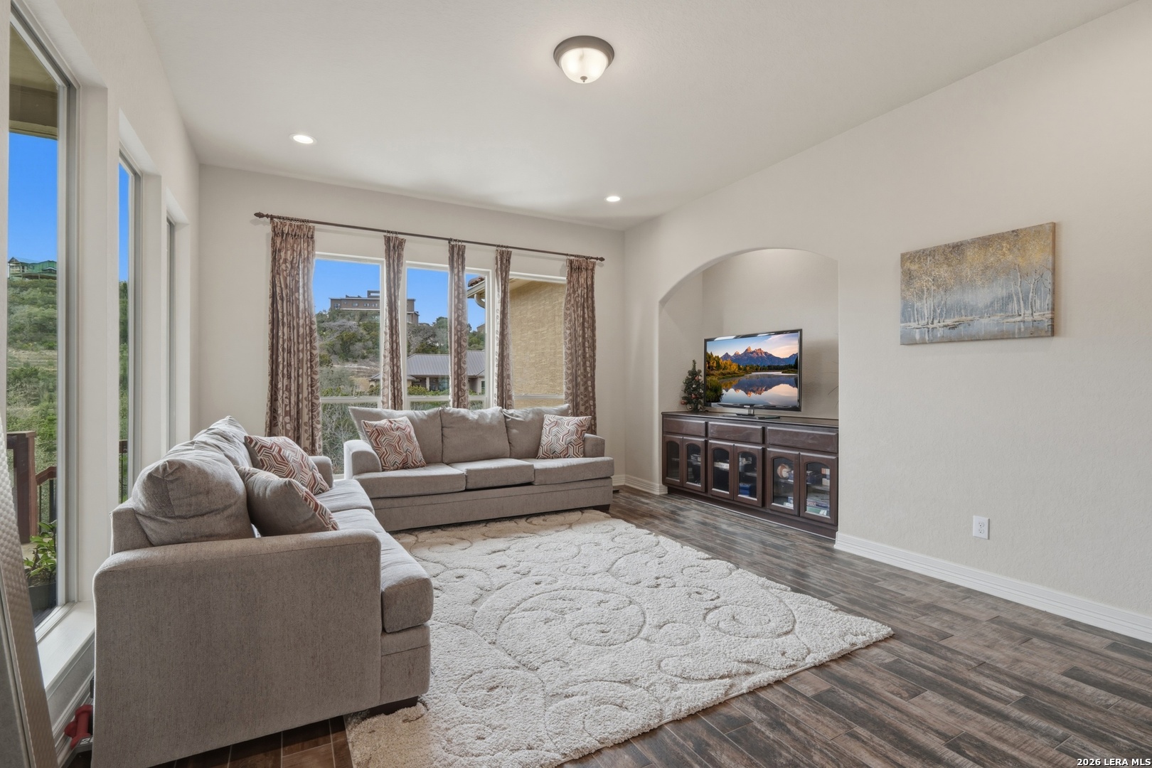 Situated within an exclusive gated community, this exceptional estate offers refined luxury on a beautifully positioned .62 acre homesite with scenic hillside views. Thoughtfully designed with privacy and sophistication in mind, this expansive residence features four bedrooms, all with walk in closets, privately split and appointed with its own ensuite bath. The primary features a vaulted wood beamed ceiling. The gorgeous primary bath has an elegant separate bath and oversized shower with dual shower heads. Impressive bronze metal doors open into the formal dining room, setting the tone for the home's elegant architectural details, including soaring coffered high ceilings, crown molding throughout, and custom art niches. High-end tile flooring flows seamlessly through the main living spaces, enhancing the home's elevated aesthetic. The open-concept design centers around a stunning rock fireplace with gas starter, flanked by custom built-in cabinetry with glass doors. The chef's kitchen is beautifully appointed with granite countertops, breakfast bar, Bosch appliances, double ovens, a gas cooktop, and abundant cabinetry-ideal for both everyday living and upscale entertaining. Included is a spacious walk in pantry. Designed for comfort and versatility, the home offers a private study with double French doors, a spacious second living area, and a fully equipped media room complete with projector, screen, and theater seating-all included. Located next to the media room and second living area is a dry bar with counter and glass cabinets to hold all your favorite drinks and snacks. Outdoor living is equally impressive with a covered patio showcasing hillside views and a well-appointed outdoor kitchen with sink and gas cooking, perfect for entertaining year-round. Also included is a full sprinkler, two HVAC's, two water heaters, and a water softener. The utility room features a deep sink and there is a mud room with bench to catch your belongings after a long day. This home also has a lifetime tile roof and lower patio for additional entertaining space. Located within Northside ISD and just minutes from golfing, premier luxury shopping, fine dining, and upscale entertainment, this residence seamlessly blends elegance, functionality, and lifestyle.