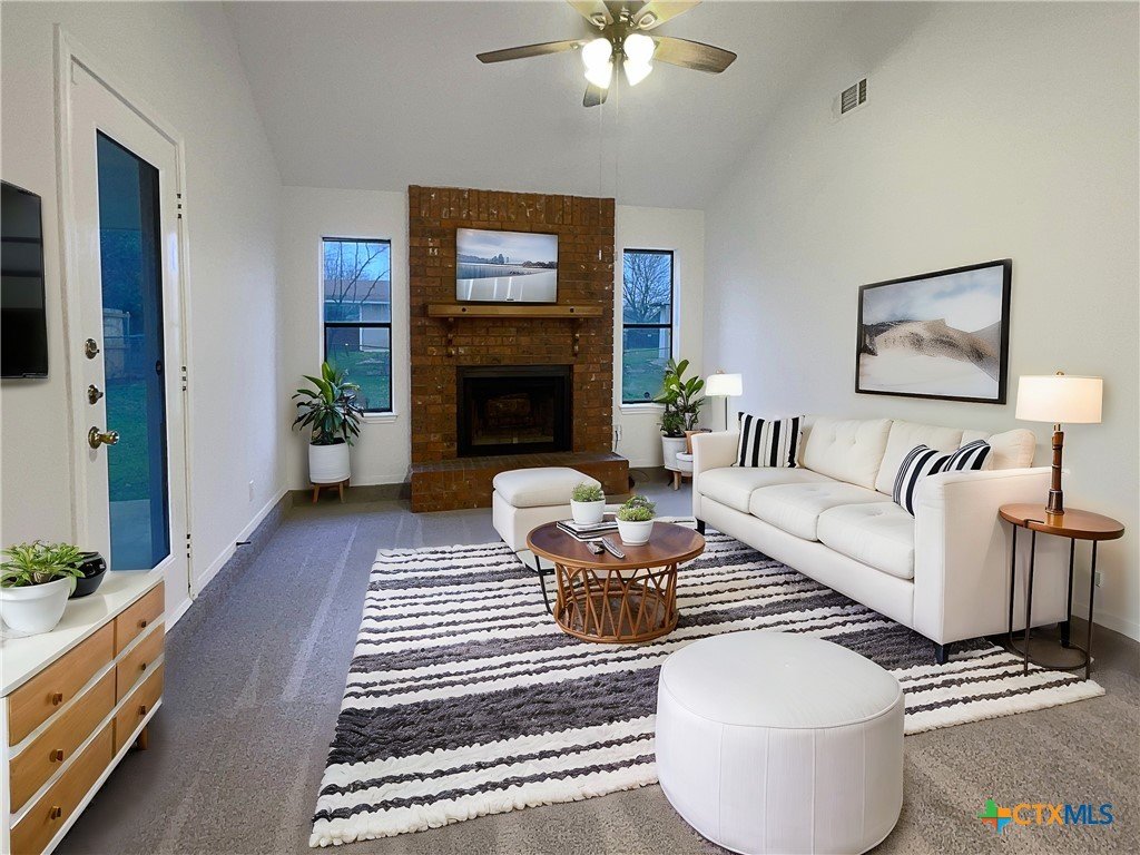 Welcome to this charming home with a cozy fireplace, a natural color palette, and a primary bathroom with good under sink storage. The fenced backyard boasts a covered sitting area, perfect for enjoying the outdoors. Interior features include fresh paint, partial flooring replacement, and new appliances. Don't miss your chance to own this lovely property!