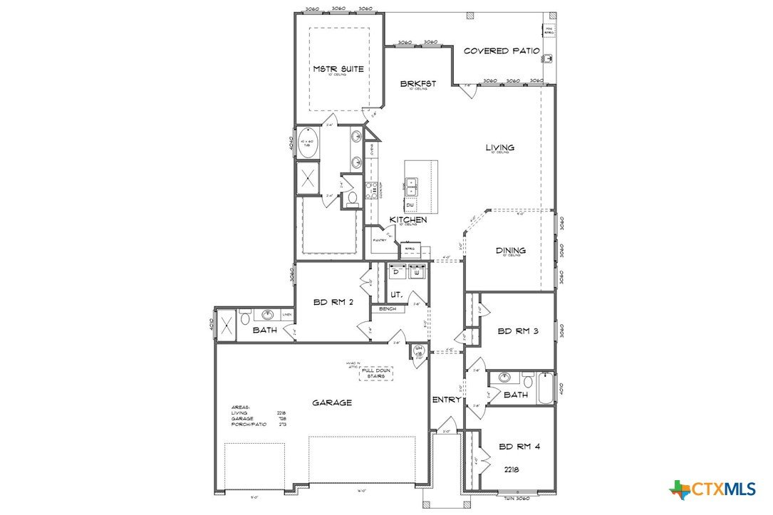 This stunning King Signature Homes custom design offers approximately 2,218 square feet of open, functional living space that perfectly blends style and comfort. The thoughtfully crafted layout features four spacious bedrooms and three full bathrooms, ideal for families, guests, or a home office setup. Upon entering, you are greeted by an inviting open-concept floor plan with a large living area that flows seamlessly into the dining and breakfast spaces. The kitchen serves as the centerpiece of the home, complete with a large center island, walk-in pantry, and premium finishes throughout. The primary suite is privately situated at the rear of the home and features tray ceilings, a luxurious en-suite bath with dual vanities, a garden tub, a walk-in shower, and an oversized walk-in closet. Bedroom two includes its own dedicated full bath, creating the perfect guest or multigenerational arrangement. Additional highlights include a spacious utility room with a built-in mud bench, ample storage, and an oversized garage with attic access. Outdoor living is enhanced by a covered back patio designed for relaxing evenings or entertaining guests. Located in the desirable Harker Heights community of The Village at Nolan Heights, this property offers the convenience of nearby schools, shopping, dining, and entertainment, paired with the quality and craftsmanship that define every King Signature Homes build.