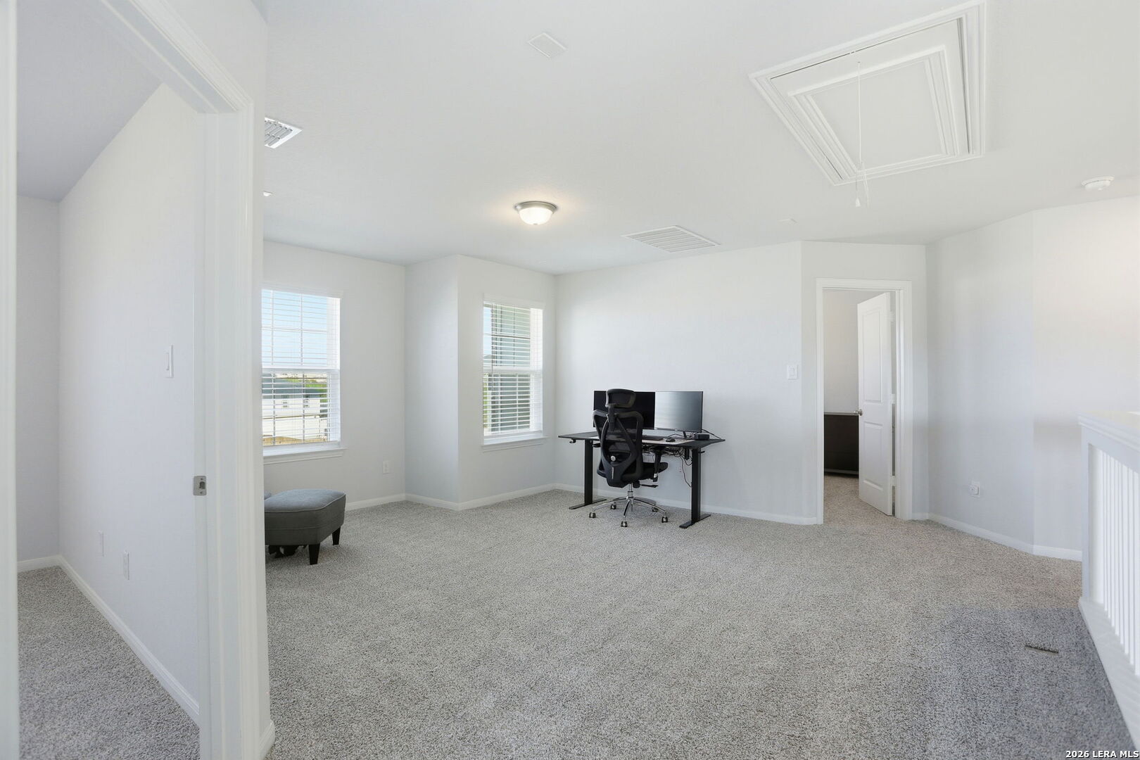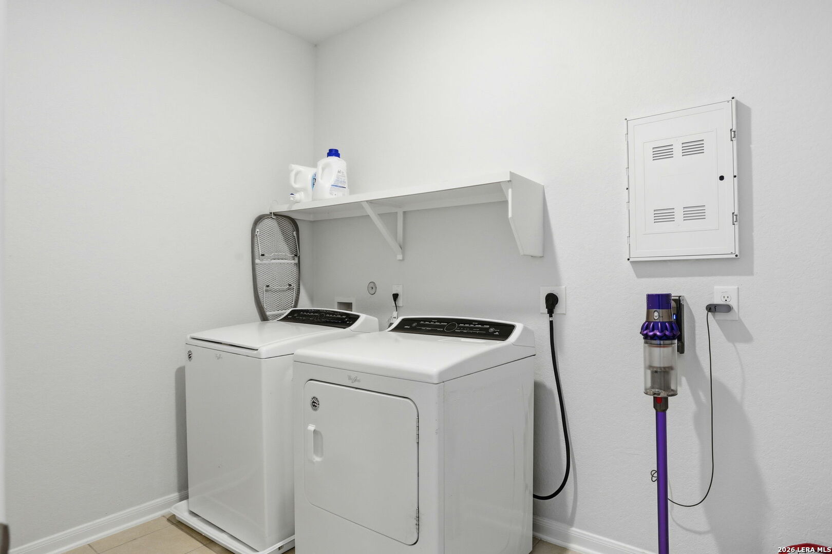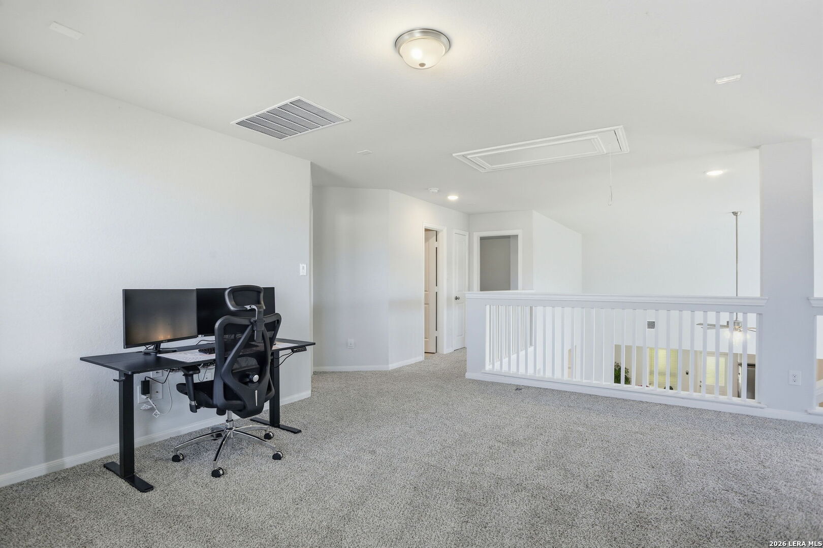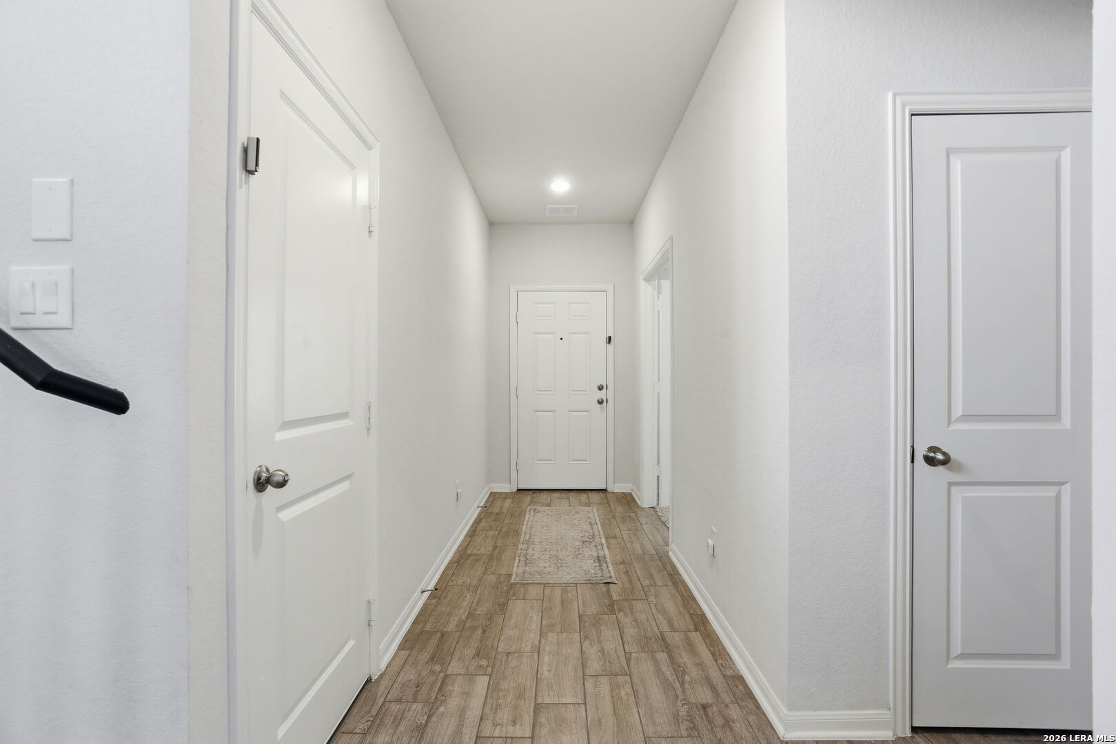 Featuring a bright and open floorplan, 181 Josh Lane offers thoughtfully designed living spaces filled with natural light from stunning high-set windows that maintain privacy while illuminating the home. Eco-friendly tinted windows help reduce heat during the Texas summers, while an auxiliary air ventilation system cycles fresh air without running the full AC, improving overall air quality and efficiency. Upgraded wood-look tile flooring throughout the main level keeps the interior cool and stylish, and glass French doors add elegance to the dedicated office, creating a bright space ideal for working from home or a fitness area. The spacious primary suite and laundry room are conveniently located on the first floor, providing separation from the additional living spaces upstairs, while an upgraded banister enhances the open-concept design and allows light to flow between levels. Step outside to enjoy a spacious backyard designed with native, drought-resistant landscaping that is both beautiful and dog friendly. The oversized back patio includes a built-in west-facing sunshade, creating a comfortable space for outdoor relaxation or entertaining year-round. An oversized 21/2-car garage offers generous room for vehicles while still allowing additional storage or workspace. Located in a friendly and active community in San Antonio, the home is part of Medina Valley Independent School District, with a brand-new high school scheduled to open for the 2026-2027 school year along with a middle and elementary school within walking distance. Residents enjoy excellent neighborhood amenities including a dog park, basketball and pickleball courts, a playground, and a swimming pool. The location also provides convenient access to Joint Base San Antonio, Port San Antonio, and Chapman Annex, and is just minutes from H-E-B for everyday shopping.