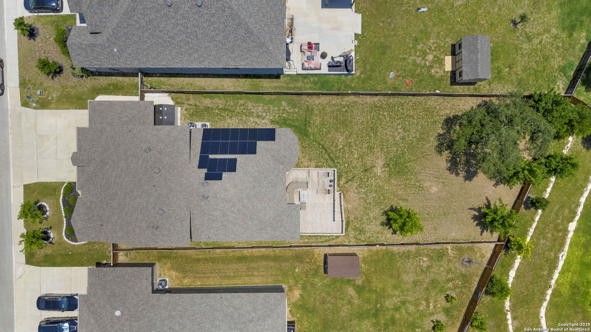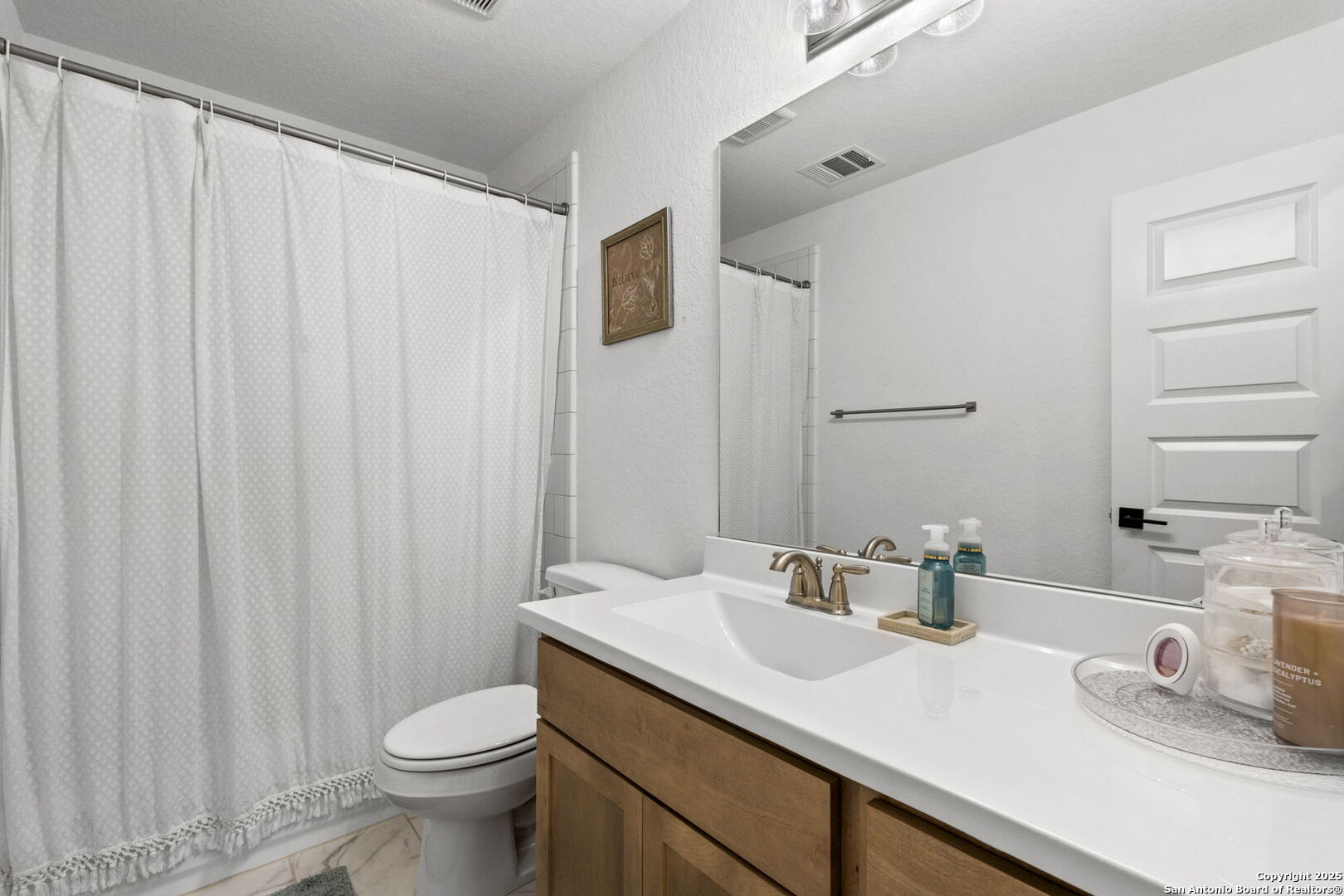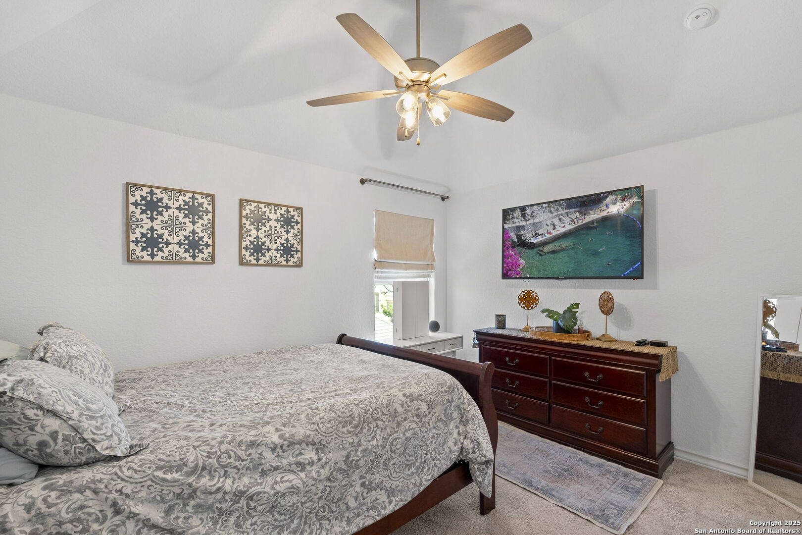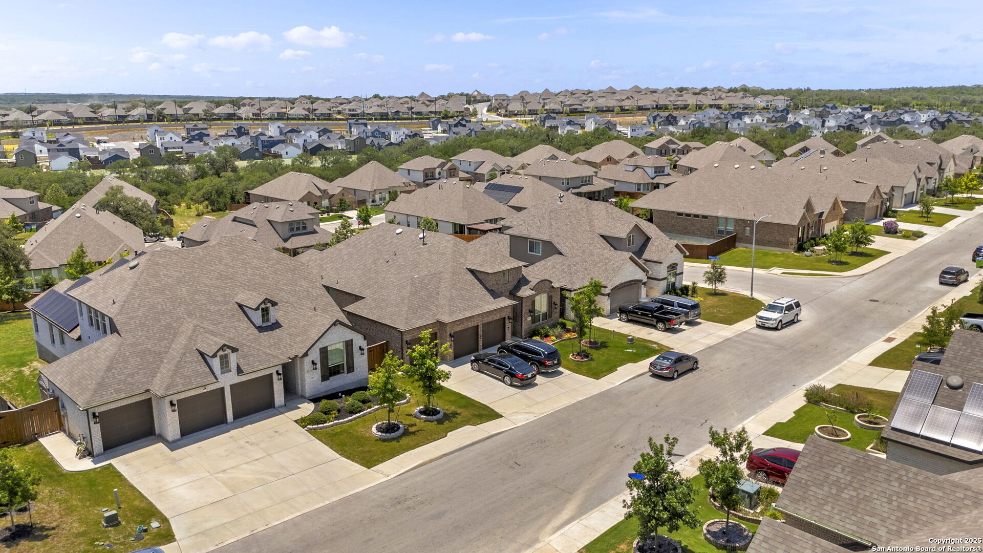 Luxury, comfort, and thoughtful design converge in this beautifully enhanced 1.5-story HIGHLAND home on one of the LARGEST lots in Fronterra at Westpointe. Featuring a 4-sided brick exterior, 3-car garage, and fully paid-off solar system, this home sits on a spacious 1/3-acre lot and offers incredible indoor-outdoor living. Step inside to soaring 12-foot ceilings, wood-look tile floors, and an inviting open layout anchored by a stunning fireplace. The dedicated office with French doors is perfect for remote work, while the chef's kitchen impresses with white upper cabinets, warm tan base cabinetry, quartz countertops, stainless steel appliances, a gas cooktop, and a massive island ideal for entertaining. The primary suite is a true retreat with tall windows, a spa-like bath featuring an oversized shower and soaking tub, and a custom walk-in closet. Downstairs includes 4 bedrooms and 3 full baths with an office! While upstairs features a private guest suite and game room accessed via a wrought-iron staircase-perfect for multigenerational living. Additional upgrades include a water softener, tankless water heater, built-in garage cabinetry, dual A/C units, and an automatic sprinkler system. Enjoy evenings on the large covered patio or take advantage of HOA amenities like a pool, playground, and clubhouse. Ideally located near Loop 1604, top-rated schools, and premier shopping and dining-this home blends elegance and convenience in one exceptional package. ASSUMABLE LOAN AT 2.87 INTEREST RATE!! You can contact the lender to see if you qualify!