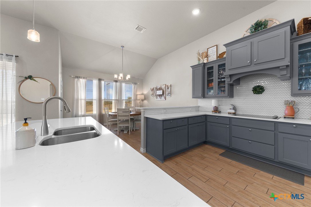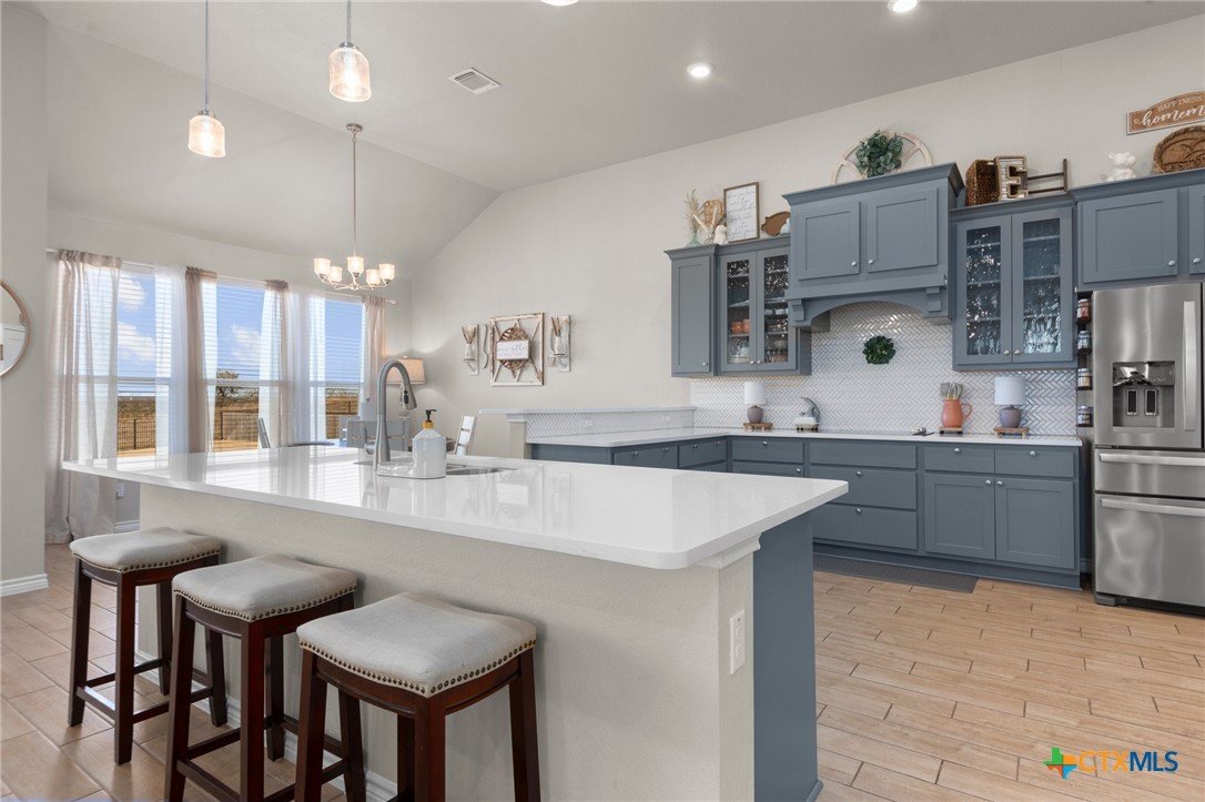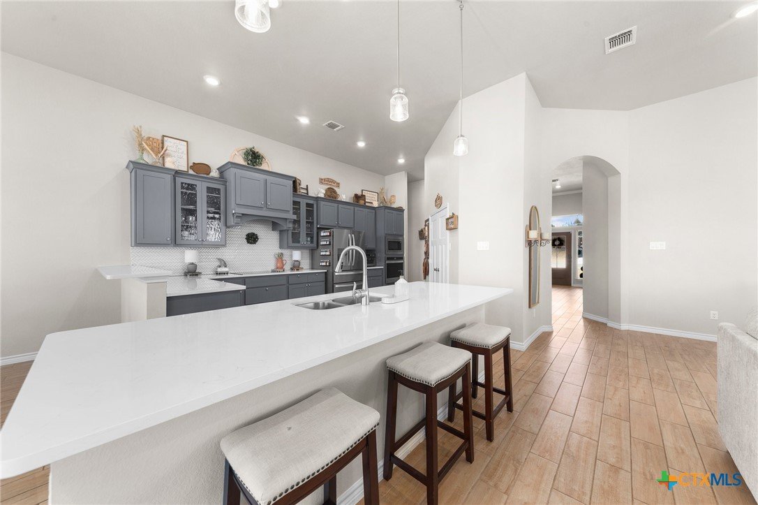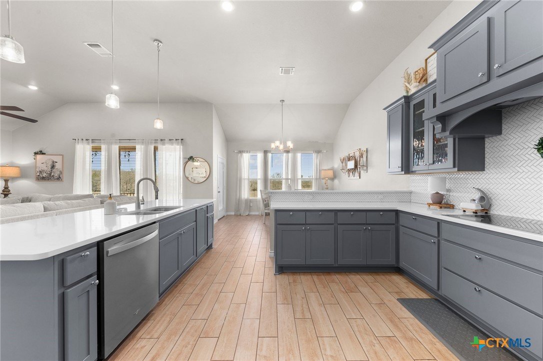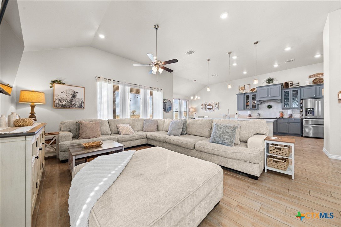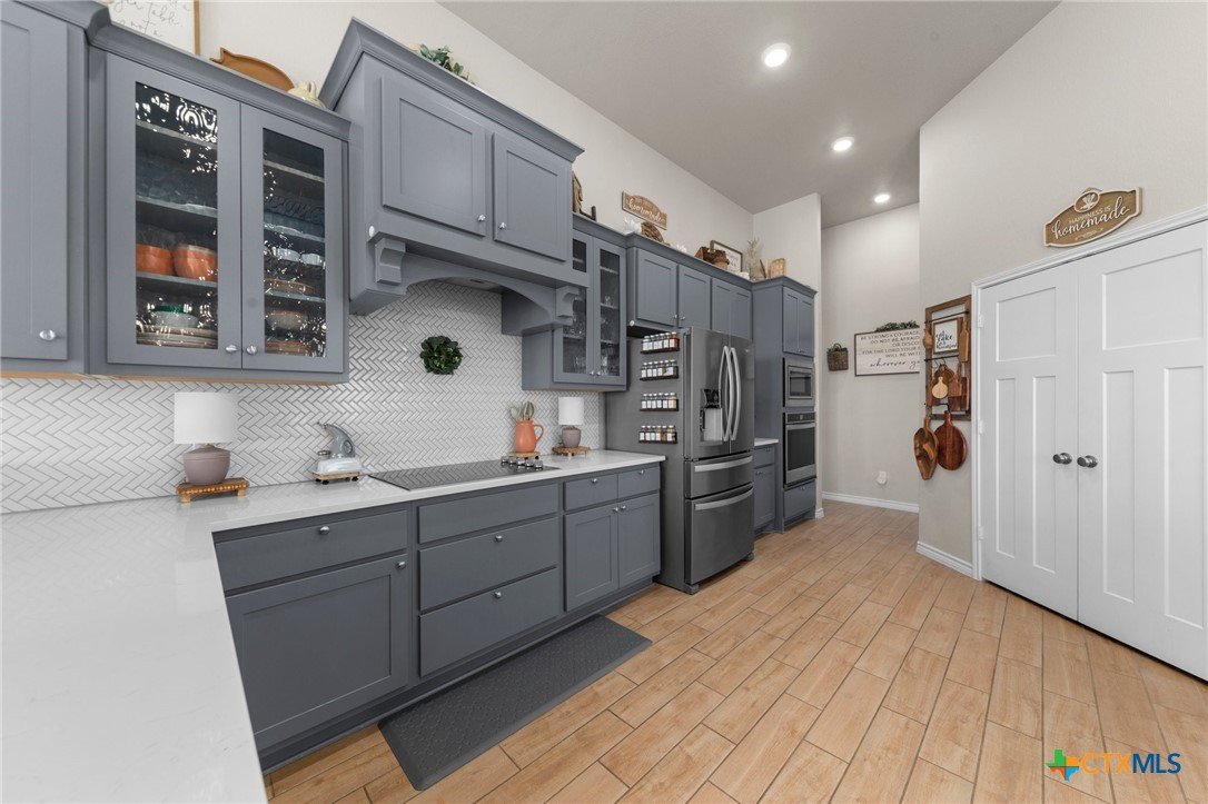 No direct backyard neighbors & recently replaced impact resistant roof and gutters ensure low maintenance for years to come. Golf-Cart friendly municipality & only minutes from the Course. As you enter this exceptional home, you're greeted by a stunning open-concept design, where the living, kitchen, and dining spaces seamlessly blend together for easy entertaining. The kitchen is a showstopper; featuring a built-in oven/microwave combination, glass cook top, modern cabinetry, quartz countertops, and a chic herringbone backsplash. The expansive island with a breakfast bar is perfect for hosting gatherings, while stainless steel appliances and ample storage provide both beauty and practicality. In the main living space, the extra high ceilings and large windows allow natural light to flood the area, highlighting the gorgeous wood-look tile floors that extend throughout the main living areas. The spacious kitchen-dining area sits under elegant lighting, with panoramic views of your peaceful backyard. Step into the hypoxy-coated 3-car garage, designed to keep your vehicles and belongings in a pristine environment. The spacious yard is fully enclosed with a high-end wrought iron fence, offering both security and style. With scenic views of serene fields and no rear neighbors, you'll have the tranquility and privacy you've always dreamed of. With all these features and upgrades, this home offers exceptional value and luxury. Schedule your private tour today and see what makes this property truly special!