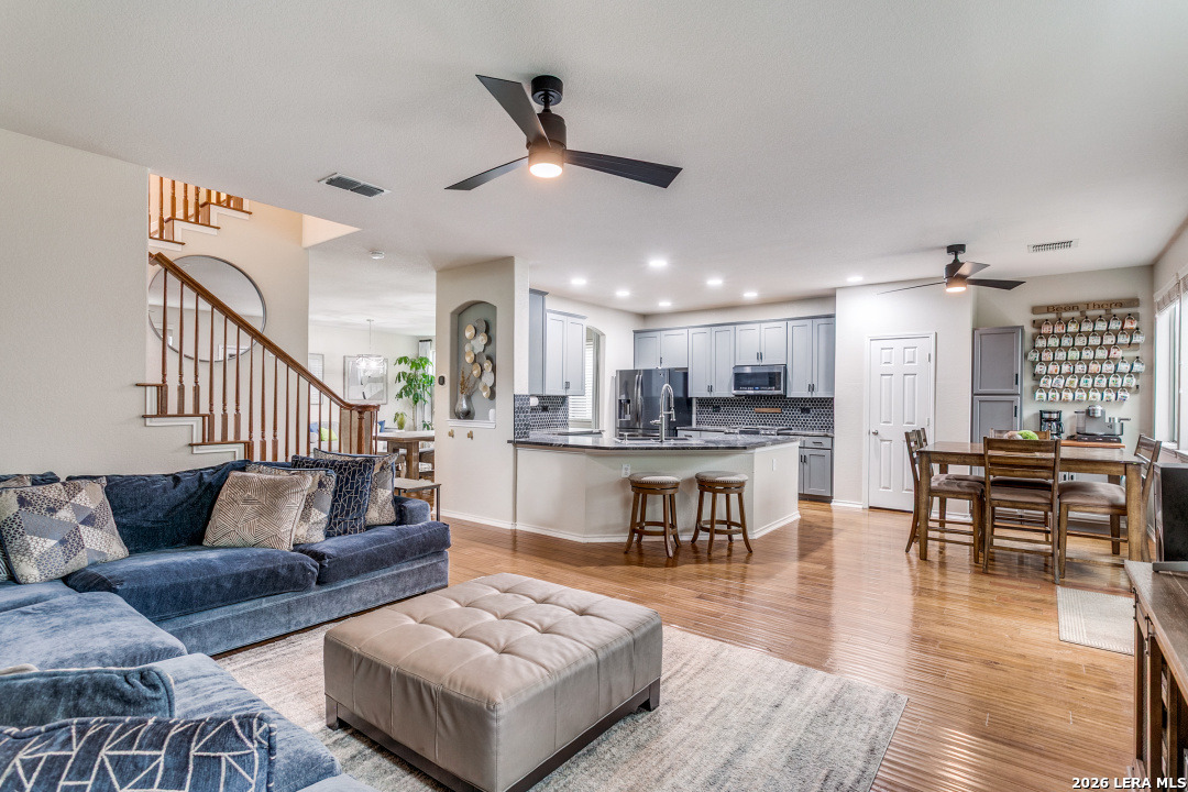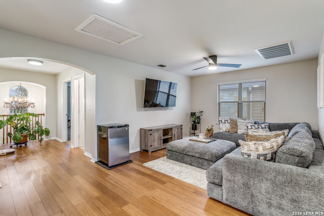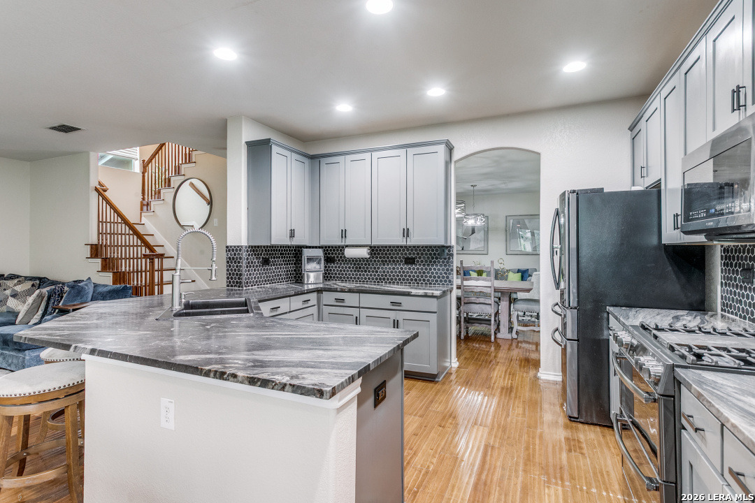 Experience refined Mediterranean living in the highly sought-after gated community of Presidio. This move-in-ready home blends timeless design with modern updates, highlighted by a one-of-a-kind, fully remodeled kitchen featuring sleek finishes, stainless steel appliances, and custom 42" cabinetry. Designed for both comfort and entertaining, the home offers beautiful hand-scraped wood floors, a spacious and versatile formal dining area, and an open layout that flows effortlessly. Upstairs, generously sized bedrooms open to a flexible loft/playroom, while the expansive primary suite includes a large walk-in closet for added convenience. Unique architectural details add character throughout, including a charming under-stair "Narnia" room, a private downstairs study that can easily serve as a fourth bedroom, and a well-equipped laundry room with a utility sink. Ideally located with quick access to Loop 1604, IH-10, and Highway 281, and zoned to highly rated Northside ISD schools, this home offers both luxury and practicality in one exceptional package.