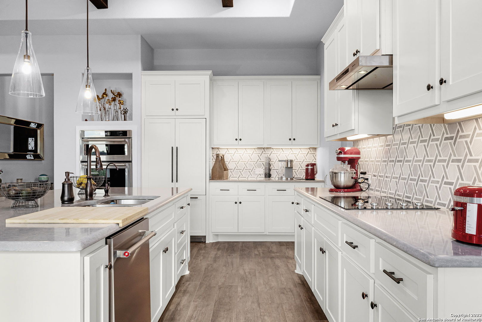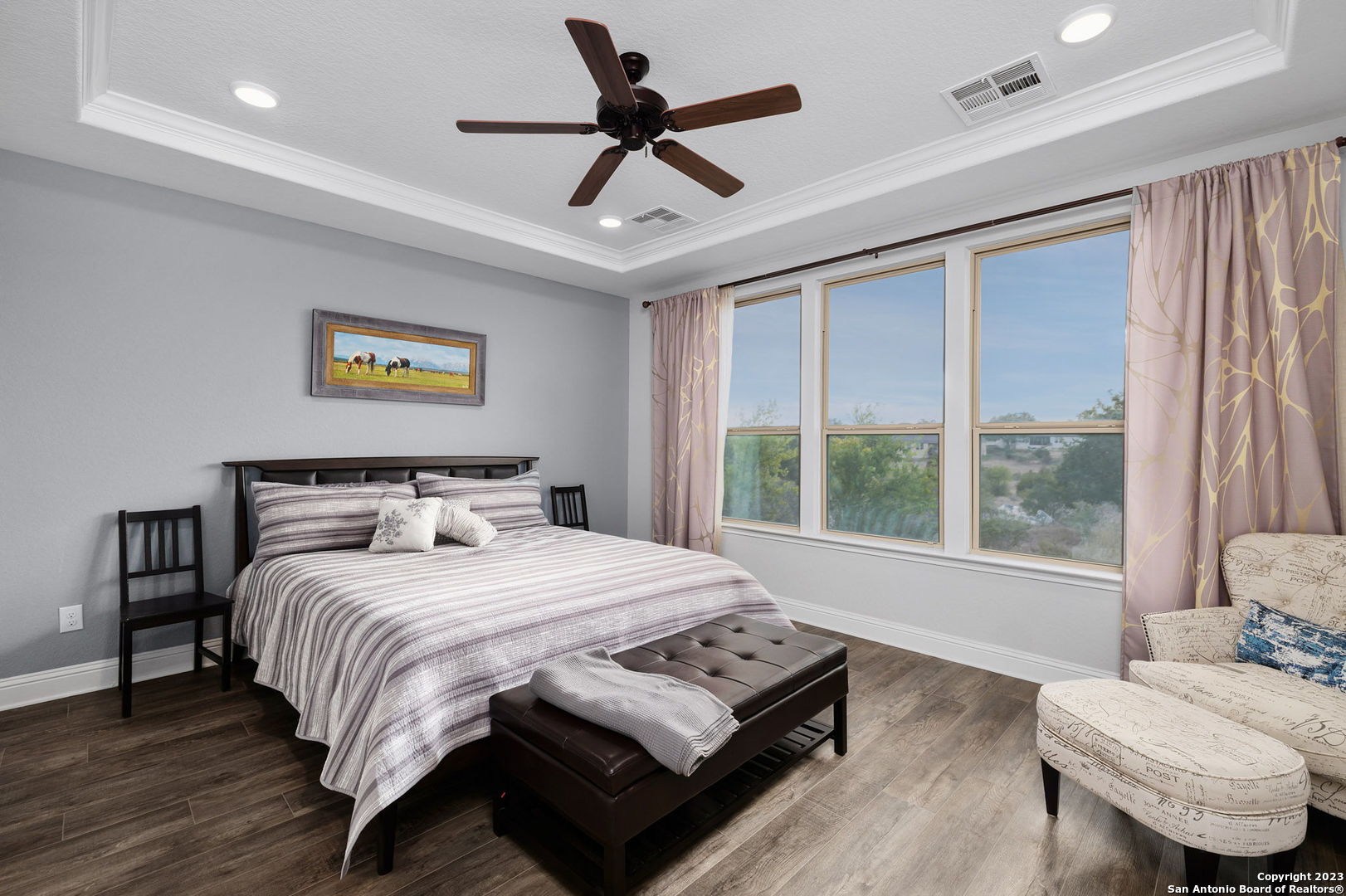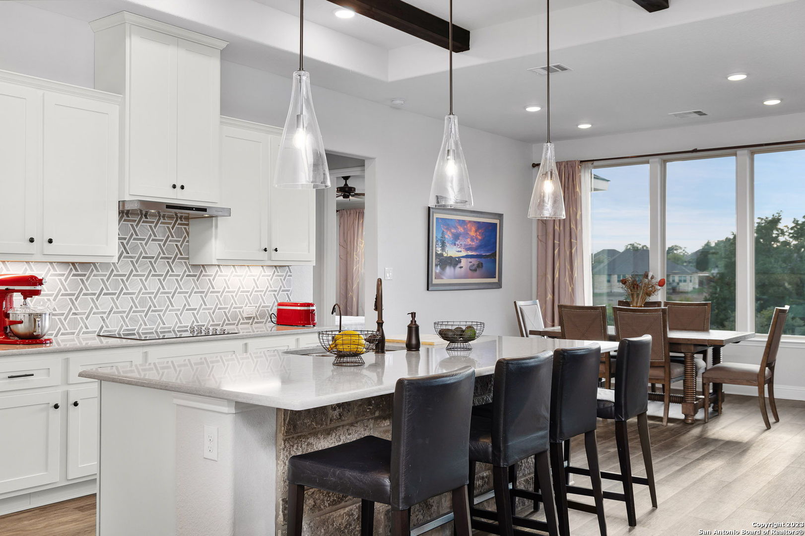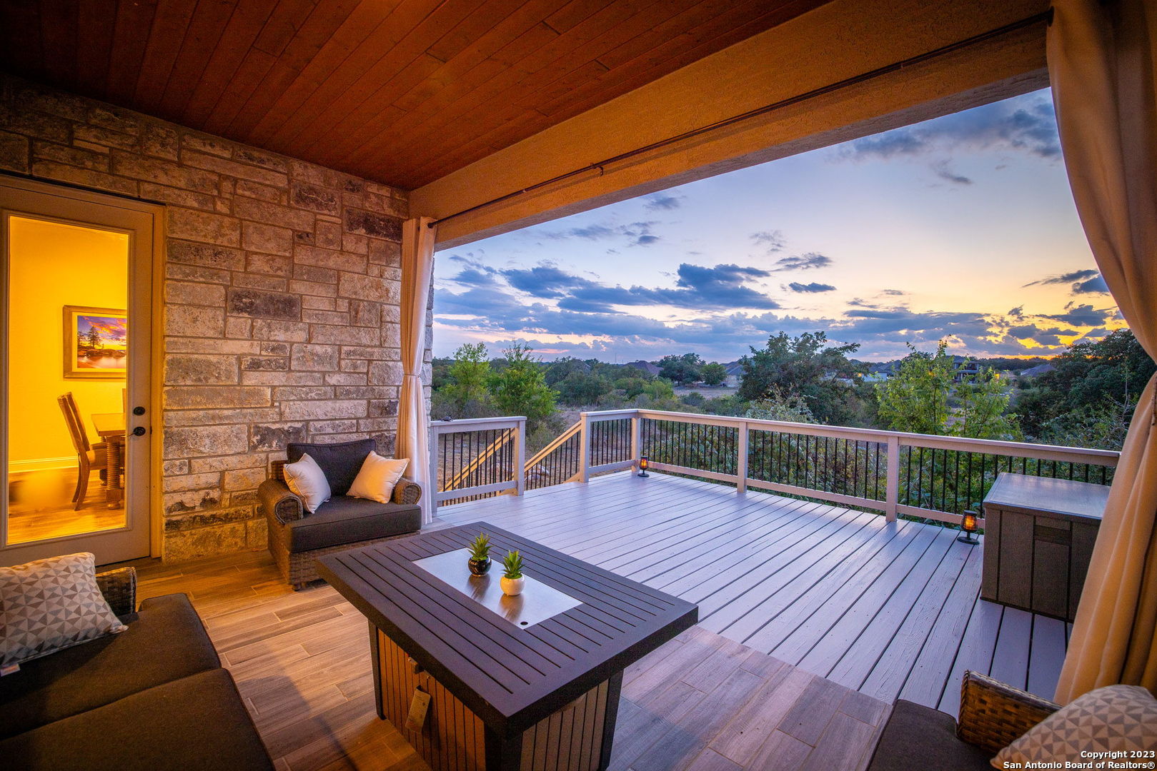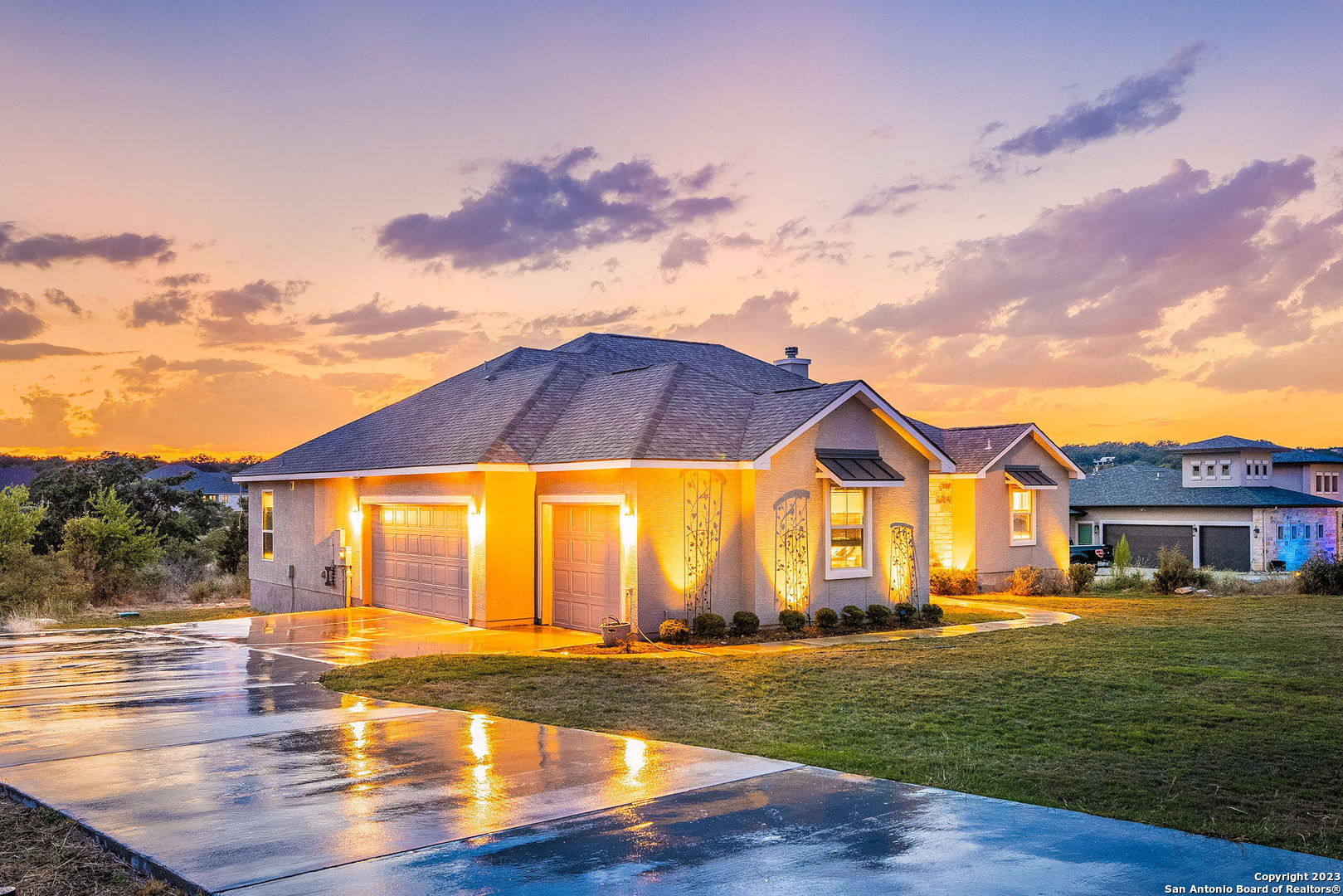 Welcome to this gorgeous custom home on acreage in the desirable, master-planned community of Vintage Oaks. This home is truly special in that it is located on a cul-de-sac street and features views of the Hill Country with currently no immediate rear neighbors. Inside, the primary suite is situated on one side of the house with an oversized closet that leads directly into the laundry room. The opposite side of the home features two secondary bedrooms connected by a Jack-and-Jill bathroom, plus a full guest suite with attached bathroom. The study off the entryway would also make a great formal dining room or bonus room. The kitchen is a dream with a built-in refrigerator plus induction cooking and it overlooks the family room with fireplace and stone hearth. And, the three-car garage has been tastefully upgraded with epoxy flooring, built in cabinets, workbench and peg boards for the ultimate garage organization. There are so many features included in this home making it a great value for the buyer who desires a transitional style one-story on the perfect lot close to the main clubhouse and lazy river.