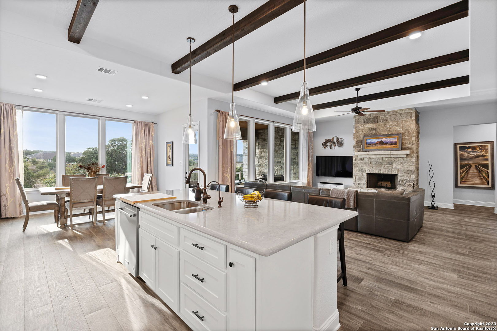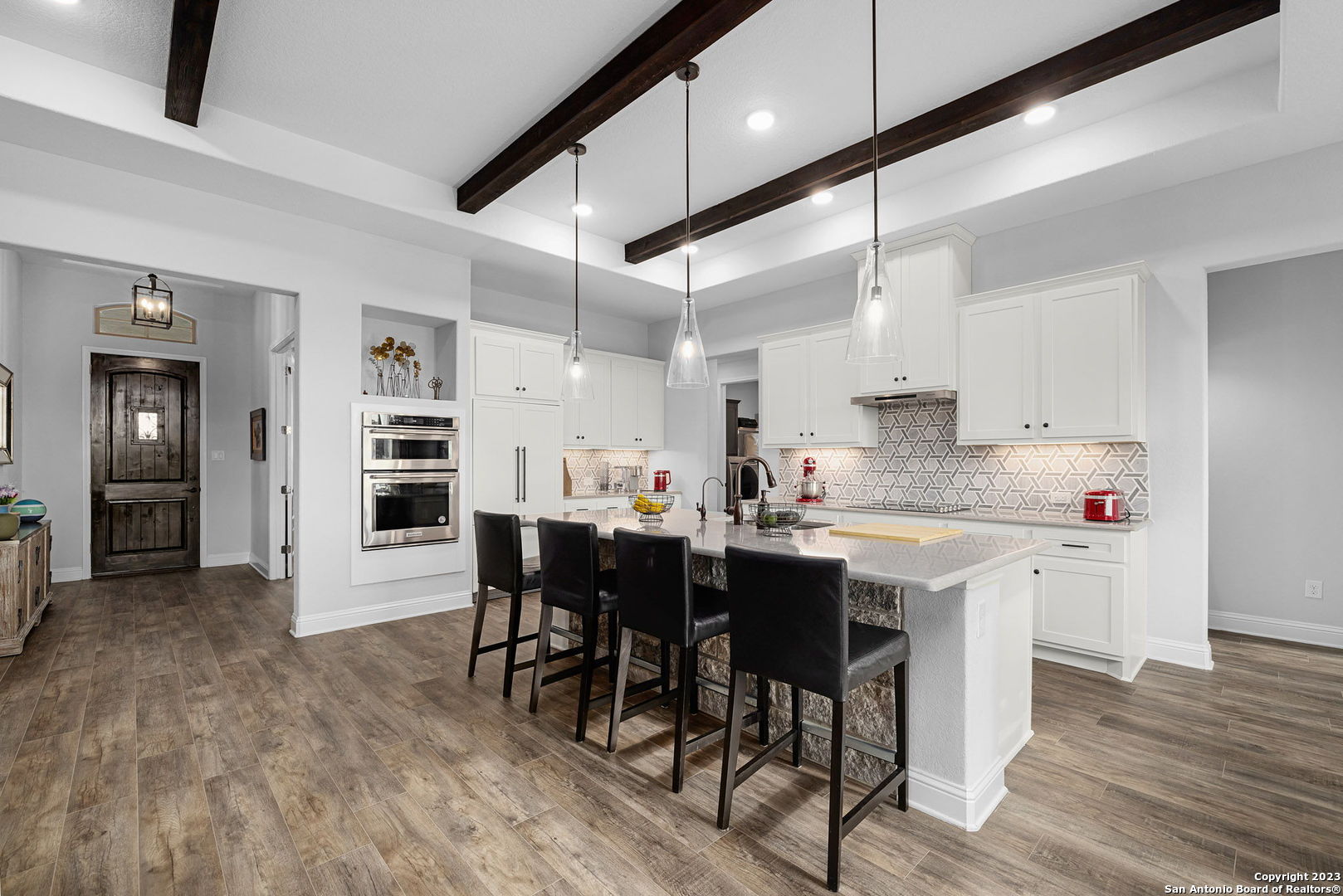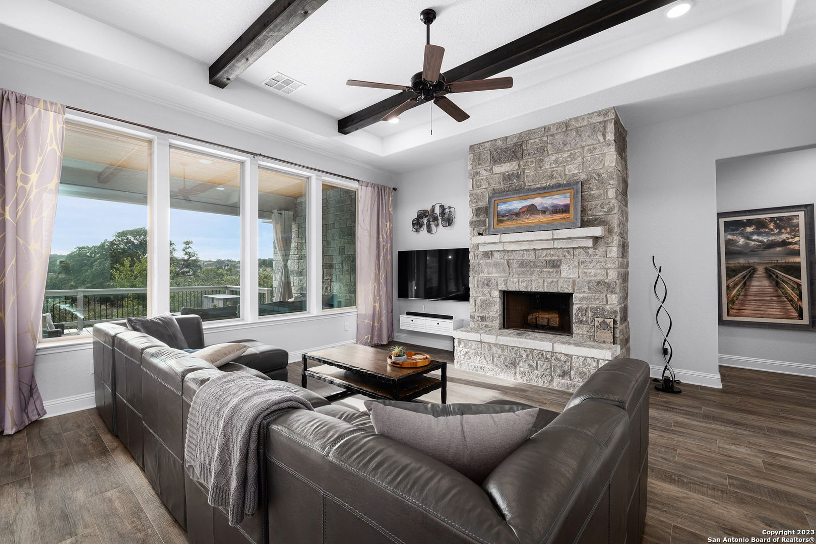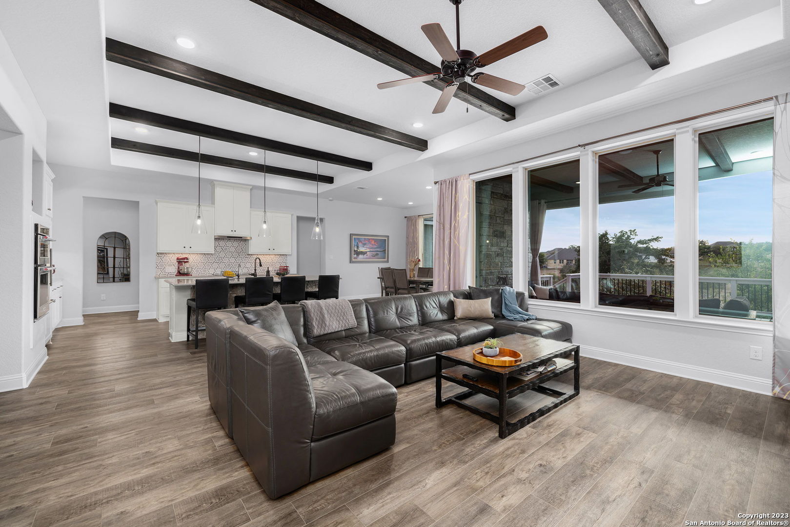 Welcome to this gorgeous custom home on acreage in the desirable, master-planned community of Vintage Oaks. This home is truly special in that it is located on a cul-de-sac street and features views of the Hill Country with currently no immediate rear neighbors. Inside, the primary suite is situated on one side of the house with an oversized closet that leads directly into the laundry room. The opposite side of the home features two secondary bedrooms connected by a Jack-and-Jill bathroom, plus a full guest suite with attached bathroom. The study off the entryway would also make a great formal dining room or bonus room. The kitchen is a dream with a built-in refrigerator plus induction cooking and it overlooks the family room with fireplace and stone hearth. And, the three-car garage has been tastefully upgraded with epoxy flooring, built in cabinets, workbench and peg boards for the ultimate garage organization. There are so many features included in this home making it a great value for the buyer who desires a transitional style one-story on the perfect lot close to the main clubhouse and lazy river.