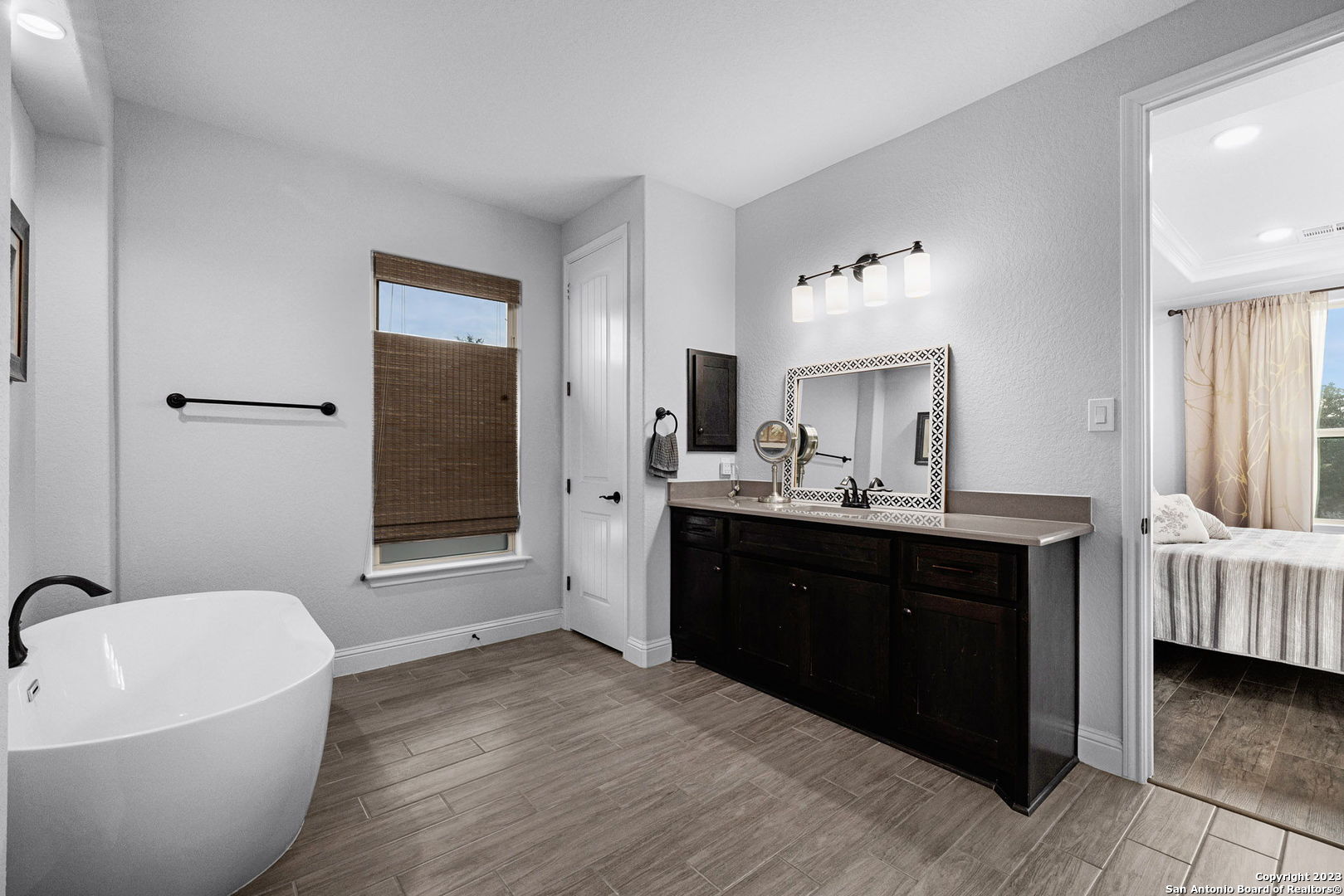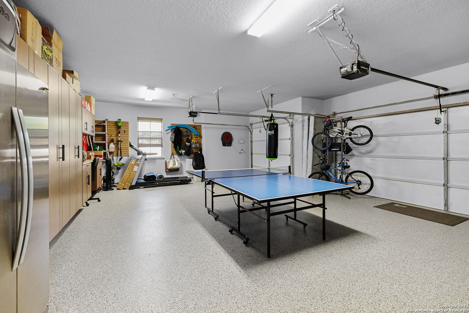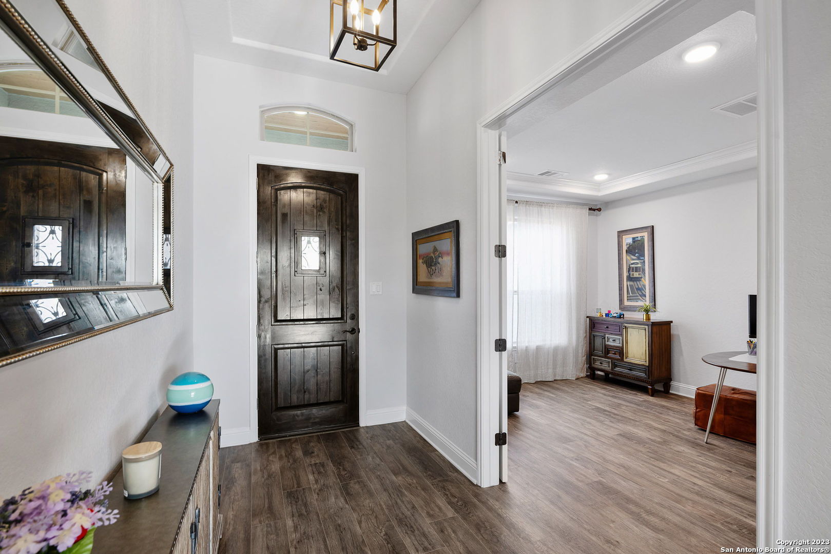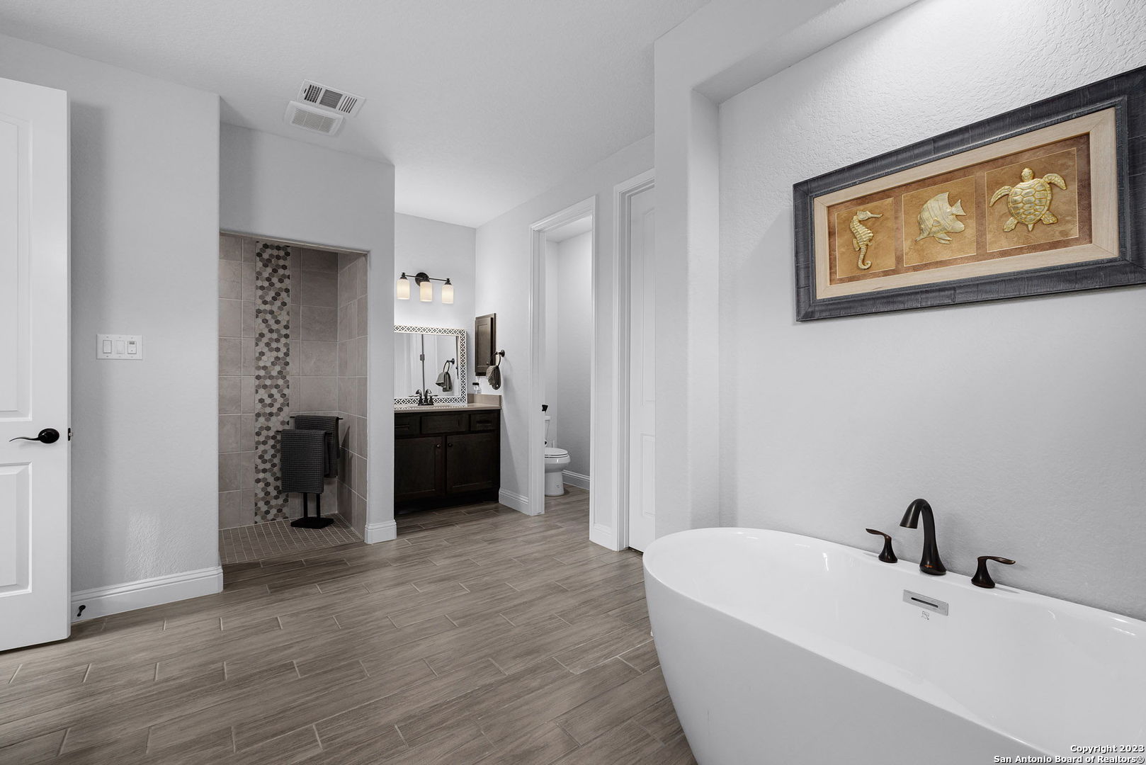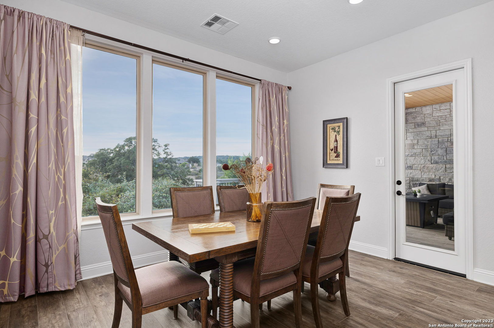 Welcome to this gorgeous custom home on acreage in the desirable, master-planned community of Vintage Oaks. This home is truly special in that it is located on a cul-de-sac street and features views of the Hill Country with currently no immediate rear neighbors. Inside, the primary suite is situated on one side of the house with an oversized closet that leads directly into the laundry room. The opposite side of the home features two secondary bedrooms connected by a Jack-and-Jill bathroom, plus a full guest suite with attached bathroom. The study off the entryway would also make a great formal dining room or bonus room. The kitchen is a dream with a built-in refrigerator plus induction cooking and it overlooks the family room with fireplace and stone hearth. And, the three-car garage has been tastefully upgraded with epoxy flooring, built in cabinets, workbench and peg boards for the ultimate garage organization. There are so many features included in this home making it a great value for the buyer who desires a transitional style one-story on the perfect lot close to the main clubhouse and lazy river.