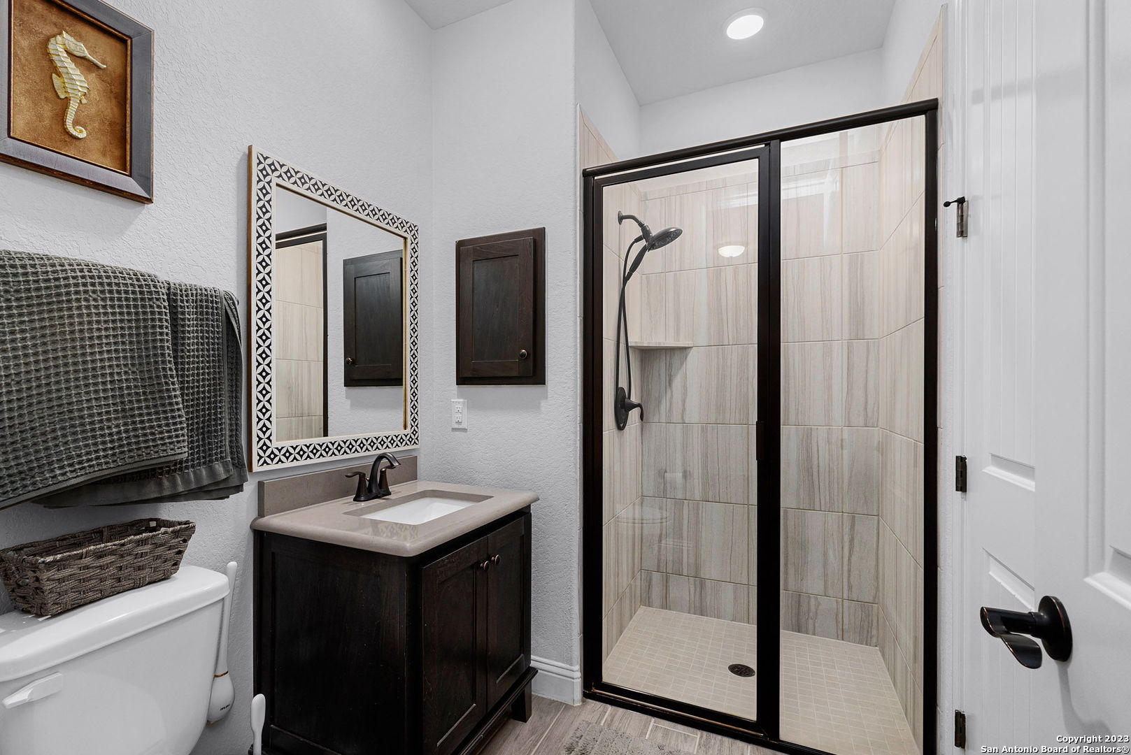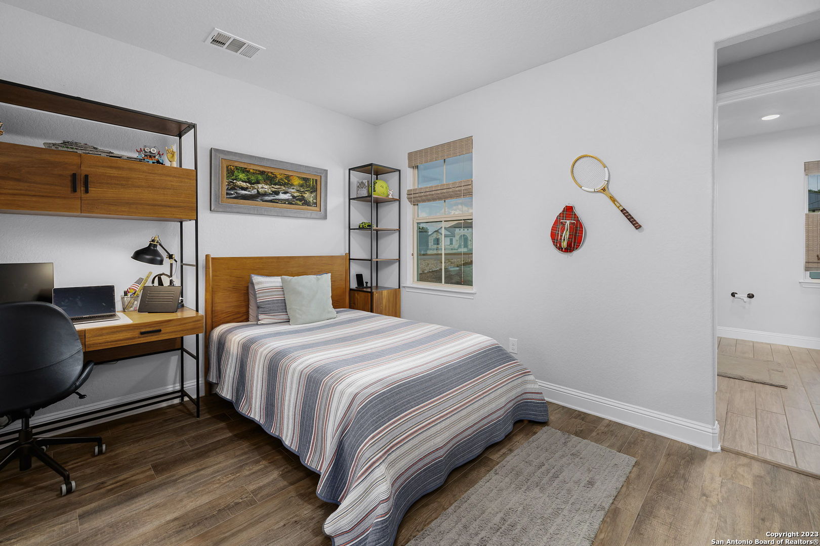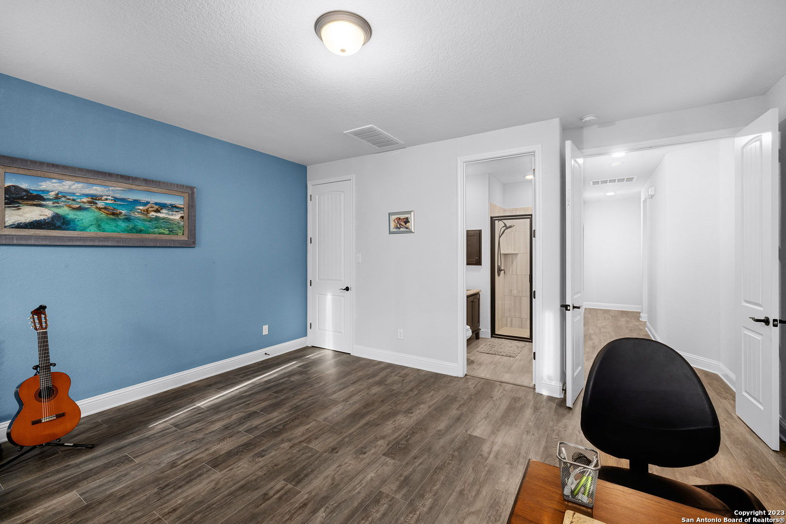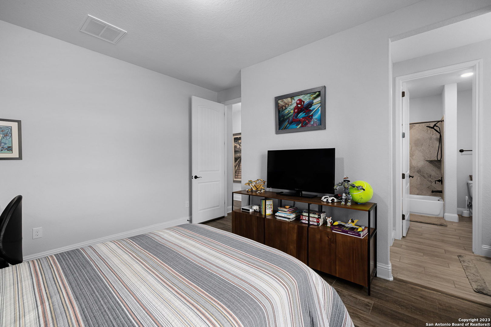 Welcome to this gorgeous custom home on acreage in the desirable, master-planned community of Vintage Oaks. This home is truly special in that it is located on a cul-de-sac street and features views of the Hill Country with currently no immediate rear neighbors. Inside, the primary suite is situated on one side of the house with an oversized closet that leads directly into the laundry room. The opposite side of the home features two secondary bedrooms connected by a Jack-and-Jill bathroom, plus a full guest suite with attached bathroom. The study off the entryway would also make a great formal dining room or bonus room. The kitchen is a dream with a built-in refrigerator plus induction cooking and it overlooks the family room with fireplace and stone hearth. And, the three-car garage has been tastefully upgraded with epoxy flooring, built in cabinets, workbench and peg boards for the ultimate garage organization. There are so many features included in this home making it a great value for the buyer who desires a transitional style one-story on the perfect lot close to the main clubhouse and lazy river.