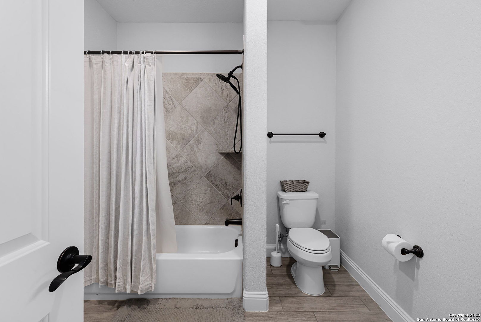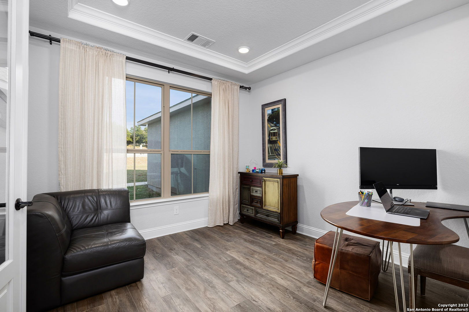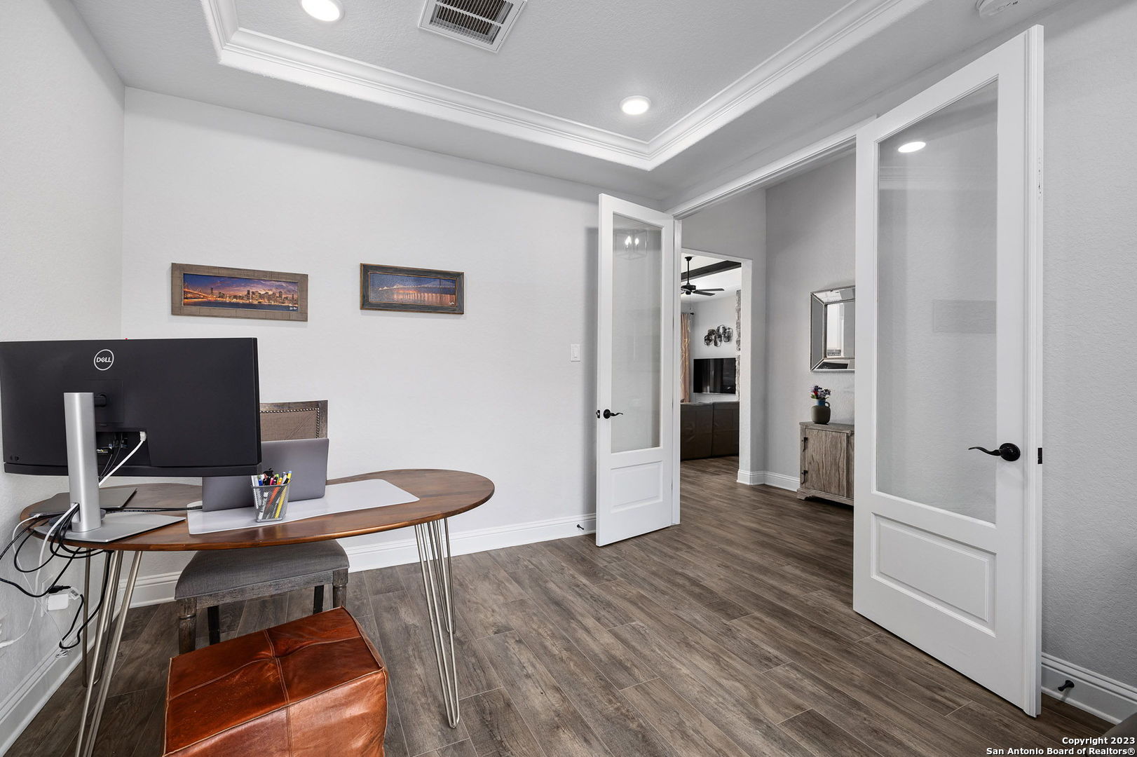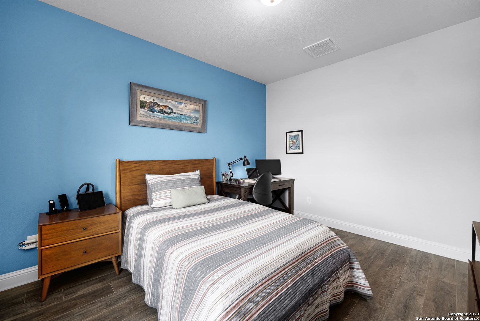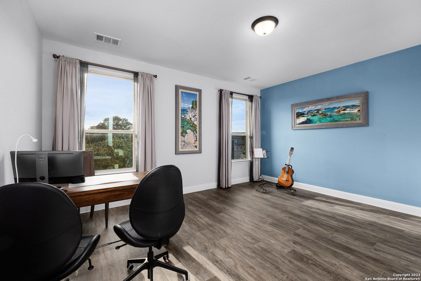 Welcome to this gorgeous custom home on acreage in the desirable, master-planned community of Vintage Oaks. This home is truly special in that it is located on a cul-de-sac street and features views of the Hill Country with currently no immediate rear neighbors. Inside, the primary suite is situated on one side of the house with an oversized closet that leads directly into the laundry room. The opposite side of the home features two secondary bedrooms connected by a Jack-and-Jill bathroom, plus a full guest suite with attached bathroom. The study off the entryway would also make a great formal dining room or bonus room. The kitchen is a dream with a built-in refrigerator plus induction cooking and it overlooks the family room with fireplace and stone hearth. And, the three-car garage has been tastefully upgraded with epoxy flooring, built in cabinets, workbench and peg boards for the ultimate garage organization. There are so many features included in this home making it a great value for the buyer who desires a transitional style one-story on the perfect lot close to the main clubhouse and lazy river.