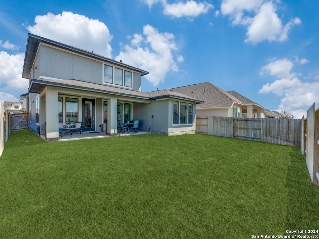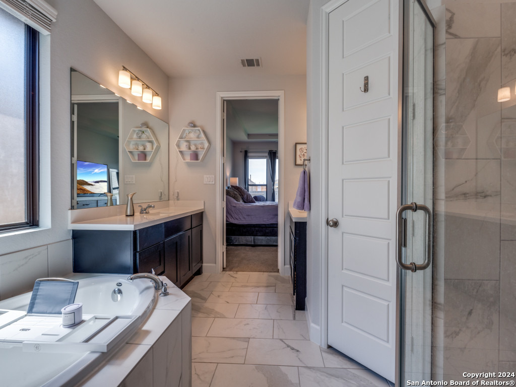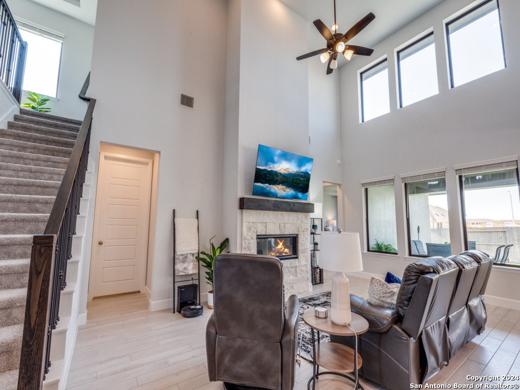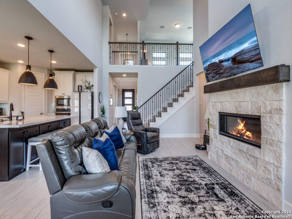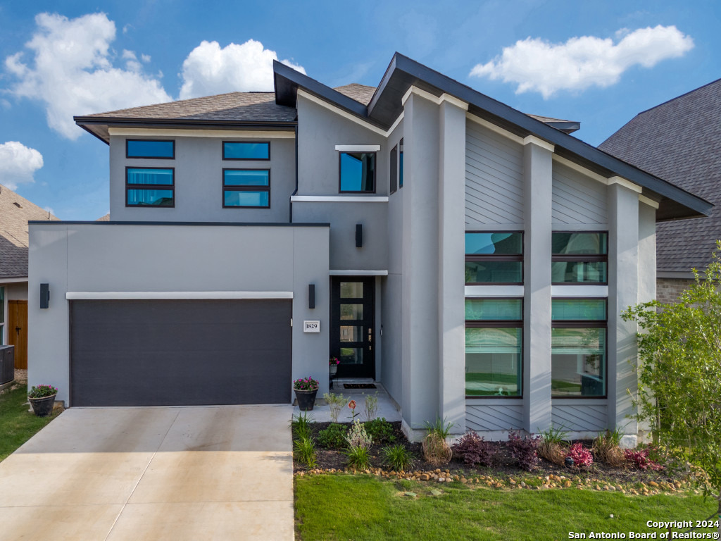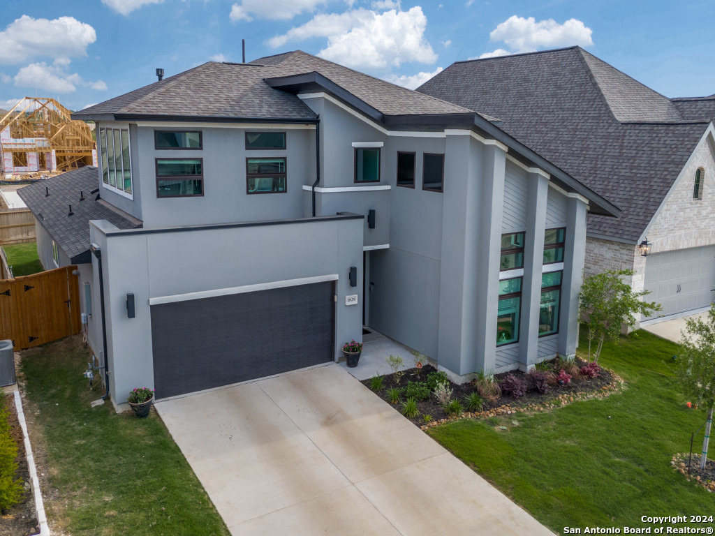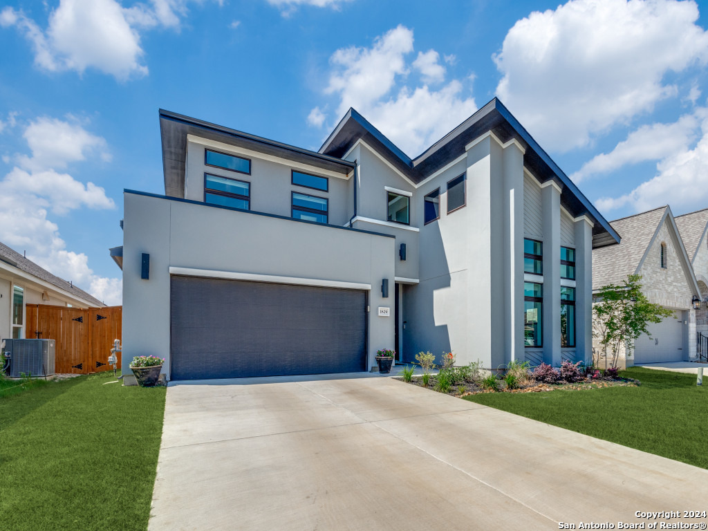 Builder warranty still in effect! This contemporary stucco MASTERPIECE in the desirable neighborhood of Veramendi is a stand out! With its unique exterior design and its modern-day decor, this home is sure to impress. Tall vaulted ceilings and light, bright wood-look tile brings a touch of sophistication to the main living areas. The spacious layout, with two bedrooms up and two bedrooms down, along with three full bathrooms, ensures that there is plenty of room. You'll love the dedicated office with its elegant glass doors, providing privacy without sacrificing natural light. The kitchen is modern and features a combination of light and dark colored cabinets, with a huge oversized island that has extra storage hidden inside. 5-burner gas stove and stainless appliances! The kitchen is open to the living and dining areas, ensuring that you never miss a moment with your guests. Luxury defines the primary suite. Features include a tray ceiling, French doors, dual vanities, garden tub, and an oversized walk-in shower. The centerpiece of the downstairs living area is a stone fireplace with a contemporary gas insert. Head upstairs to discover a huge loft area, ideal for a game room or additional living space. With an open layout overlooking the downstairs living area, you'll never feel disconnected from the heart of the home. The upstairs bedrooms are spacious and feature walk-in closets. When you are ready to unwind, step onto the Texas-sized patio in the back yard. With wood-look ceiling panels and recessed lighting, this space is perfect for grilling out or simply relaxing. Don't miss your chance to own this contemporary gem! Start imagining the possibilities!