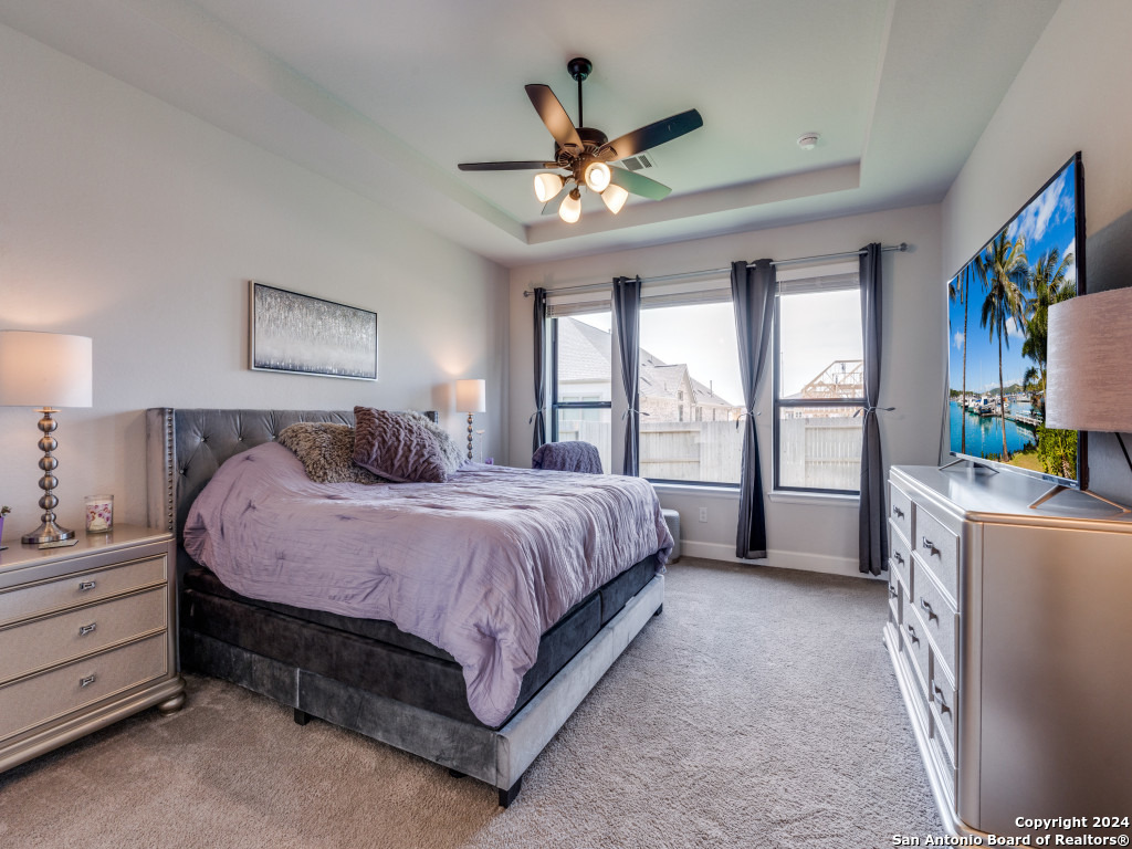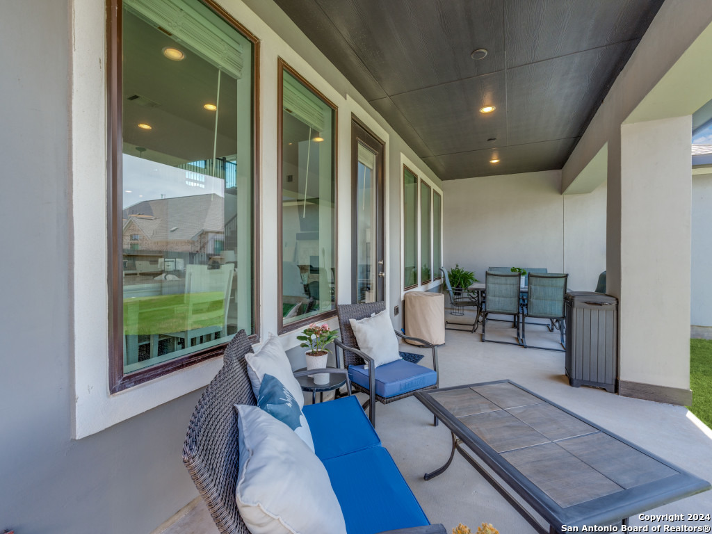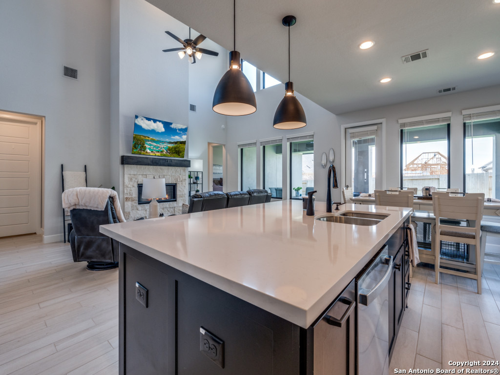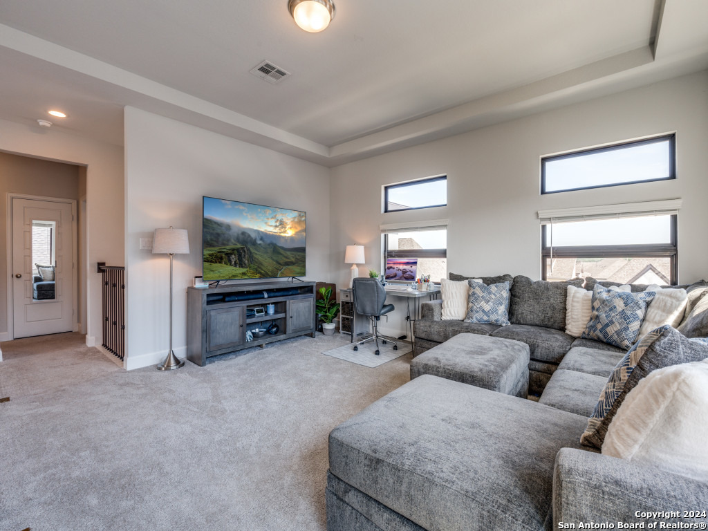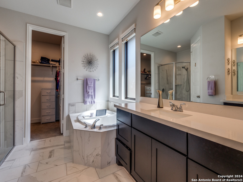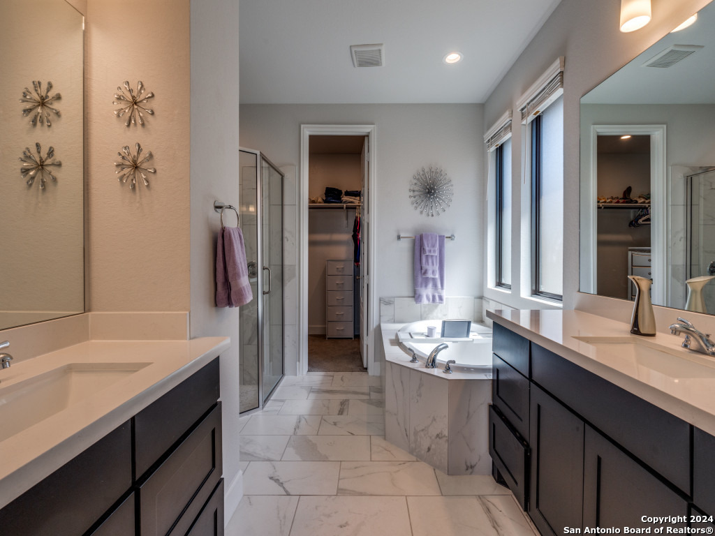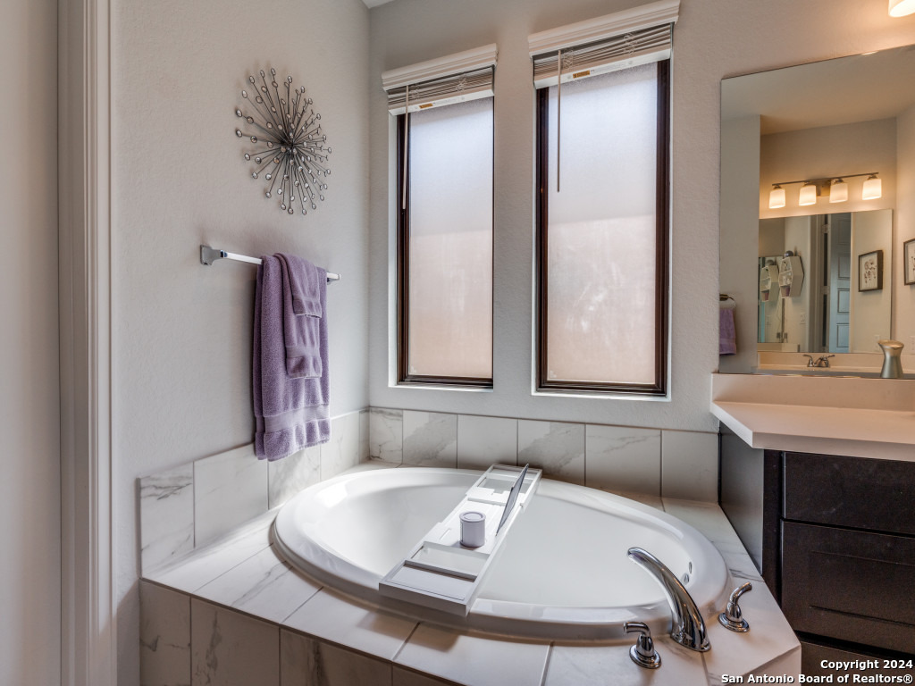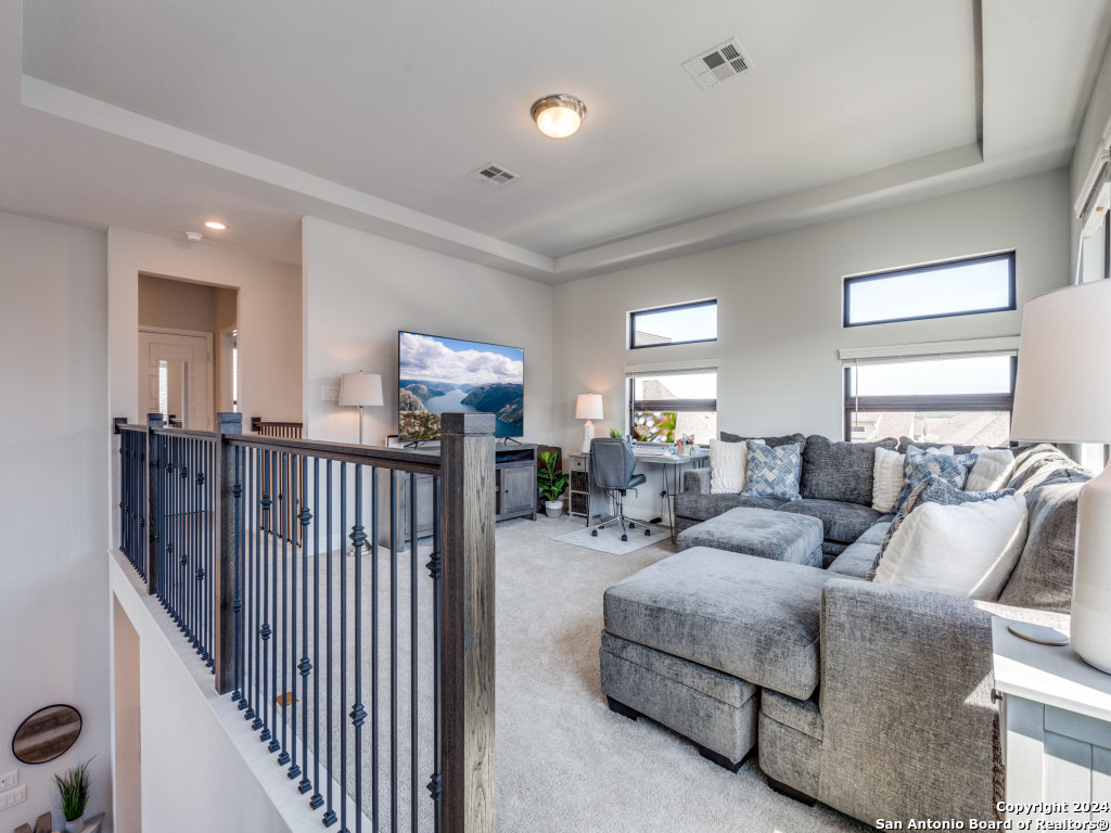 Builder warranty still in effect! This contemporary stucco MASTERPIECE in the desirable neighborhood of Veramendi is a stand out! With its unique exterior design and its modern-day decor, this home is sure to impress. Tall vaulted ceilings and light, bright wood-look tile brings a touch of sophistication to the main living areas. The spacious layout, with two bedrooms up and two bedrooms down, along with three full bathrooms, ensures that there is plenty of room. You'll love the dedicated office with its elegant glass doors, providing privacy without sacrificing natural light. The kitchen is modern and features a combination of light and dark colored cabinets, with a huge oversized island that has extra storage hidden inside. 5-burner gas stove and stainless appliances! The kitchen is open to the living and dining areas, ensuring that you never miss a moment with your guests. Luxury defines the primary suite. Features include a tray ceiling, French doors, dual vanities, garden tub, and an oversized walk-in shower. The centerpiece of the downstairs living area is a stone fireplace with a contemporary gas insert. Head upstairs to discover a huge loft area, ideal for a game room or additional living space. With an open layout overlooking the downstairs living area, you'll never feel disconnected from the heart of the home. The upstairs bedrooms are spacious and feature walk-in closets. When you are ready to unwind, step onto the Texas-sized patio in the back yard. With wood-look ceiling panels and recessed lighting, this space is perfect for grilling out or simply relaxing. Don't miss your chance to own this contemporary gem! Start imagining the possibilities!